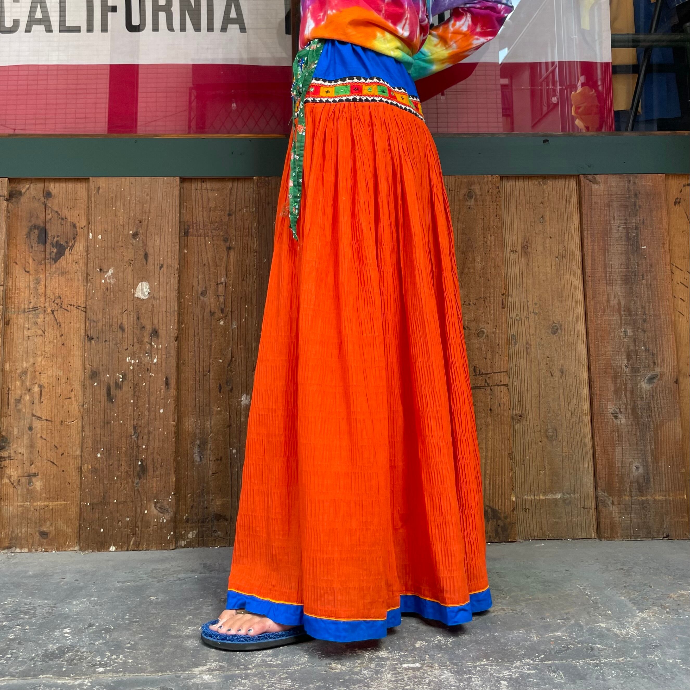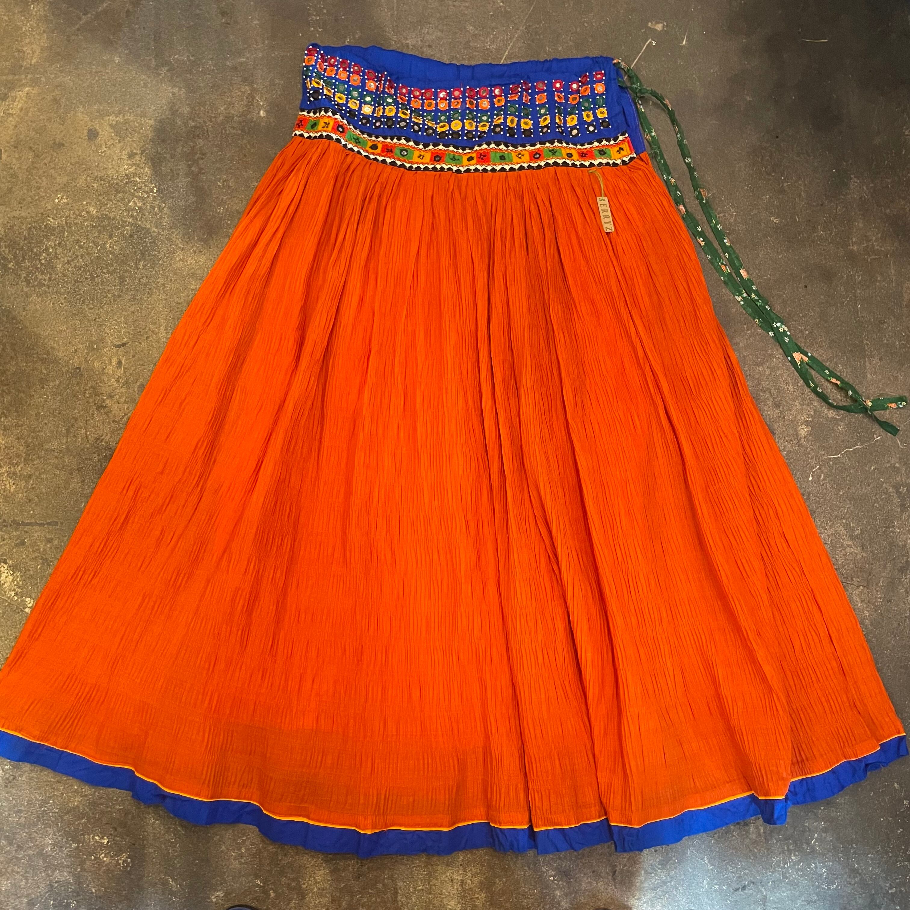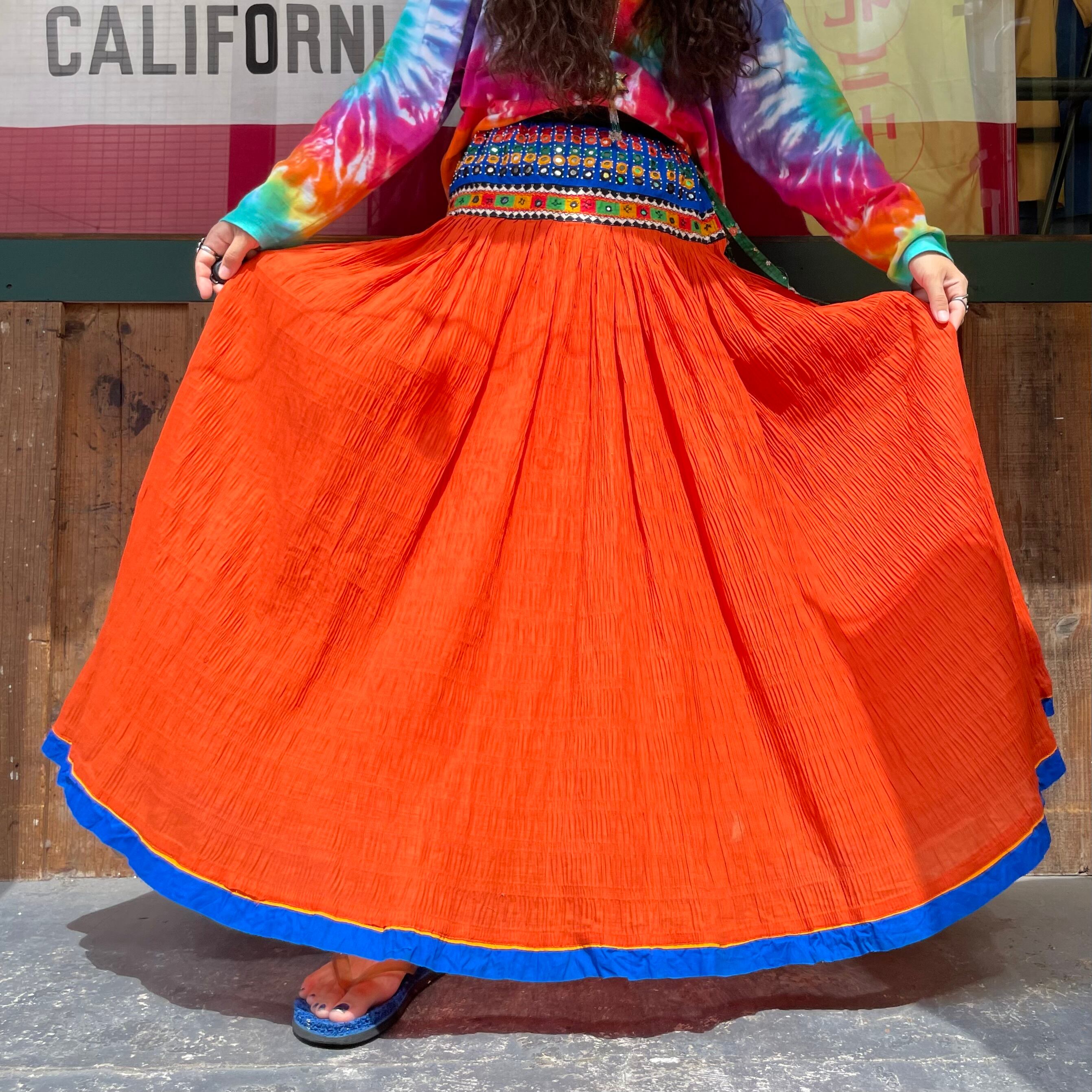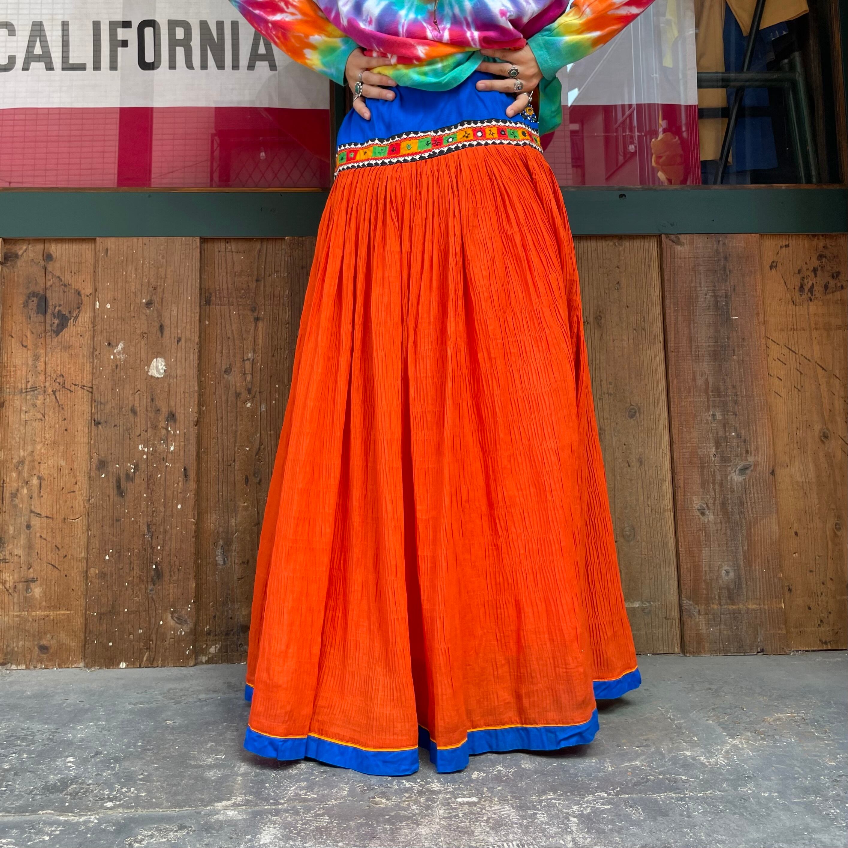 鮮やかなオレンジがかわいいロングスカートです。ウエストにはびっしり細かいミラーワークが施されておりきらきらしていて素敵ですね。