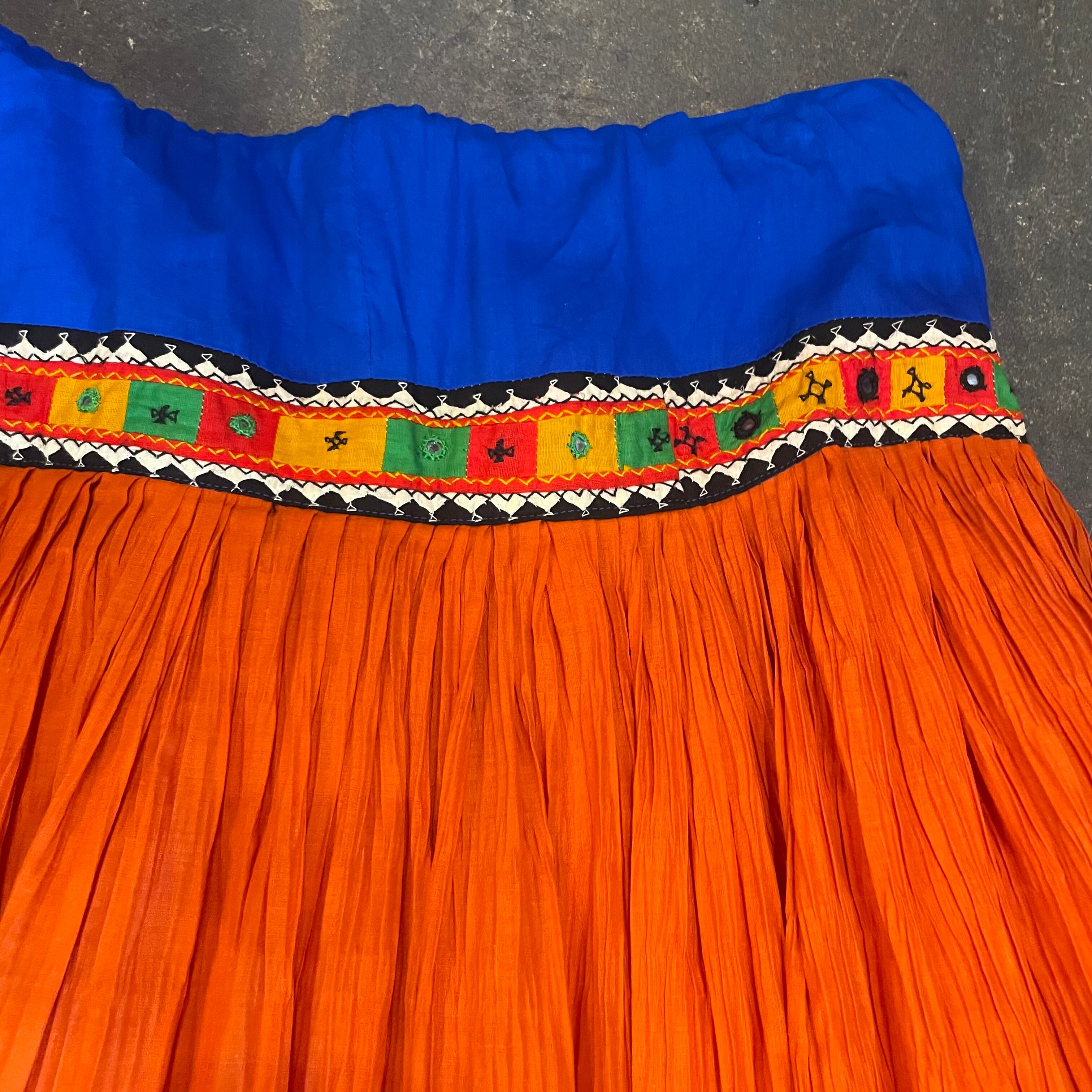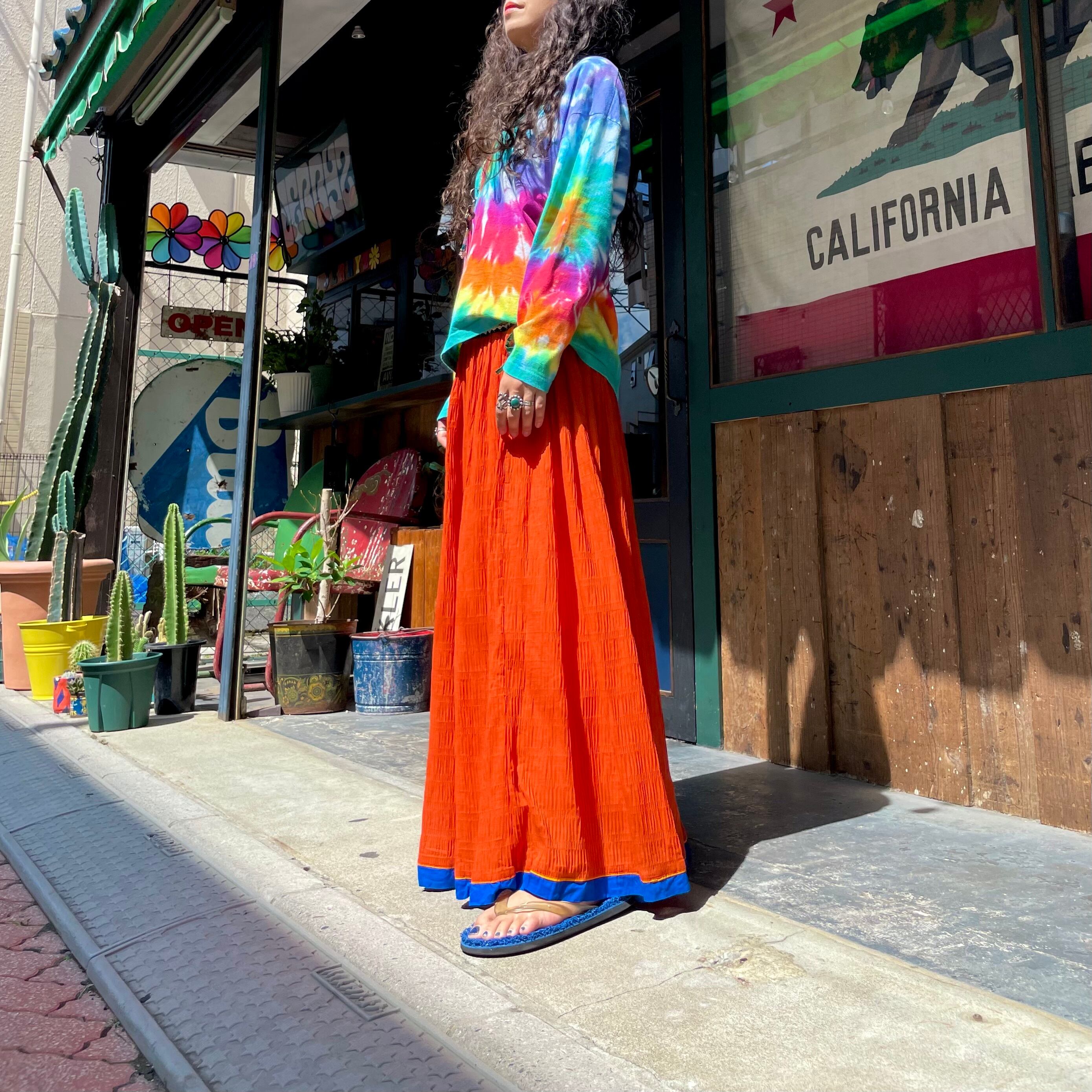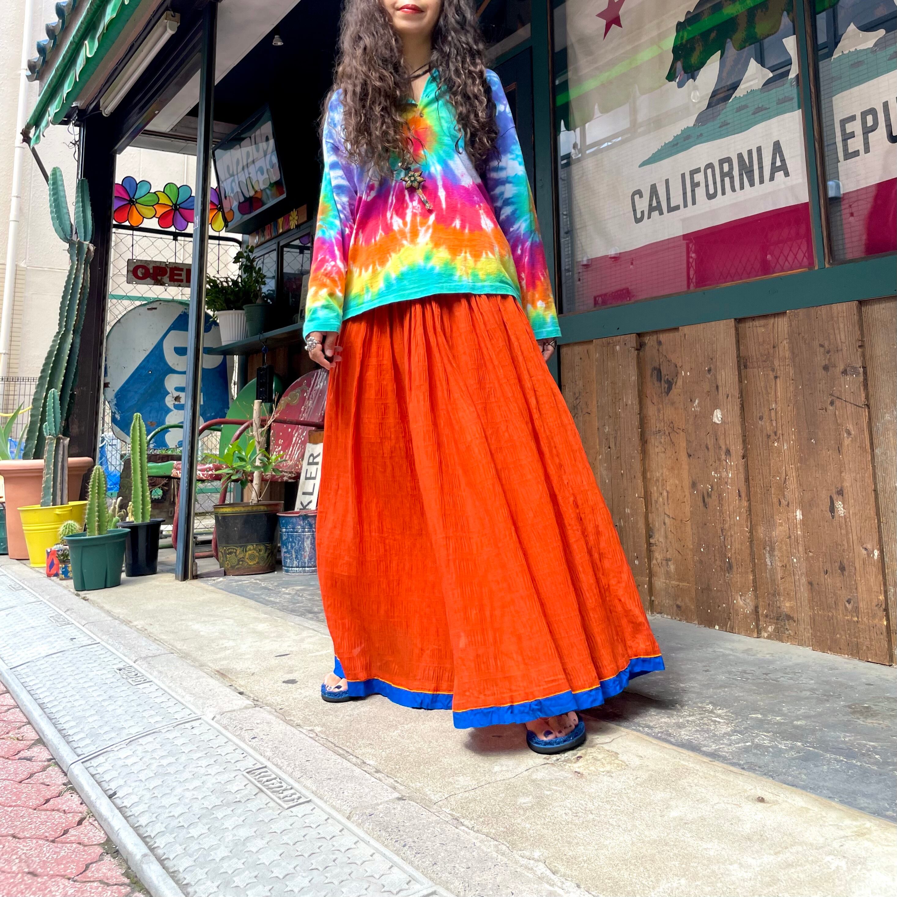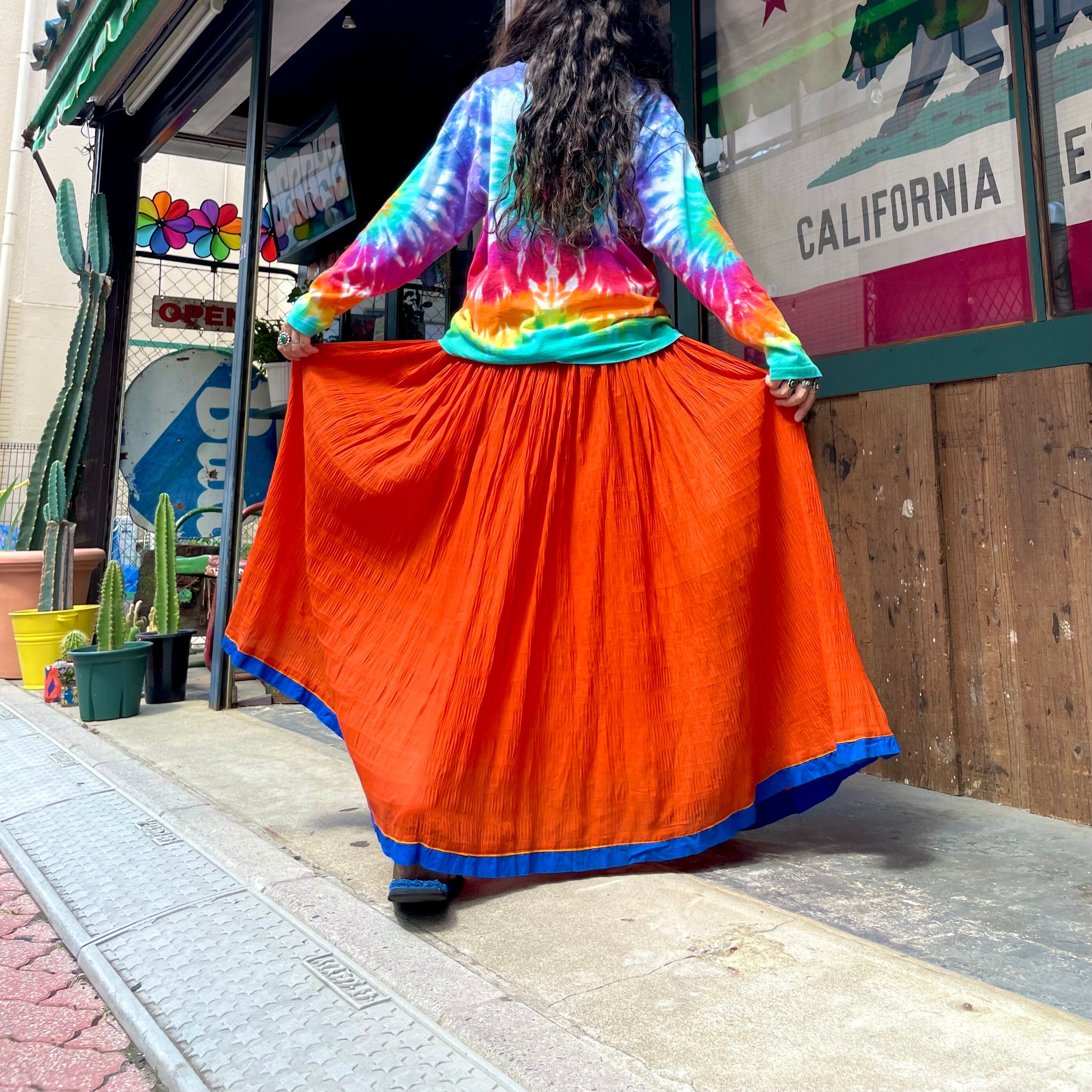 鮮やかなオレンジがかわいいロングスカートです。ウエストにはびっしり細かいミラーワークが施されておりきらきらしていて素敵ですね。
