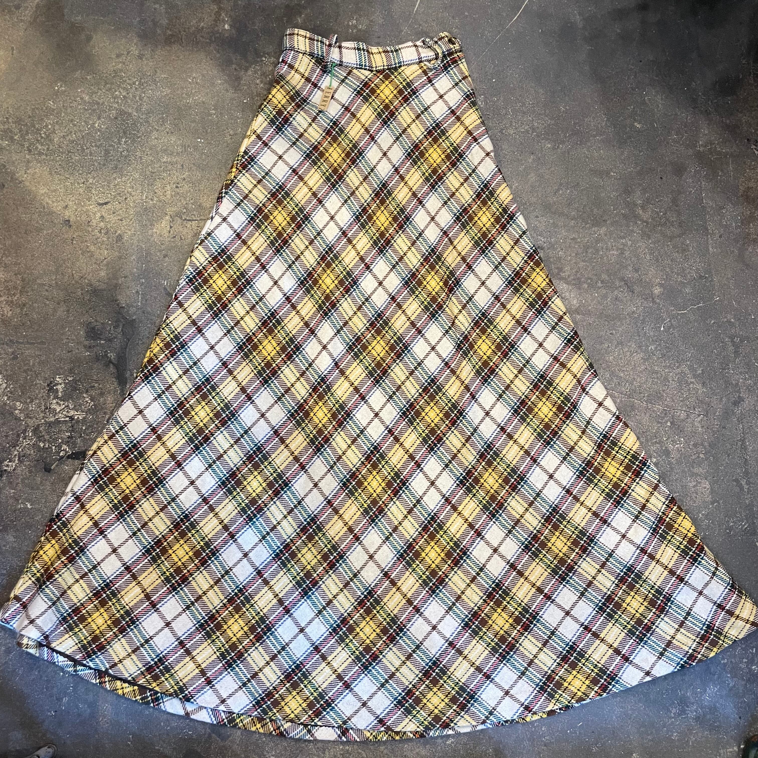黄色や茶色系のチェック柄がかわいい70年代頃のロングスカートです。