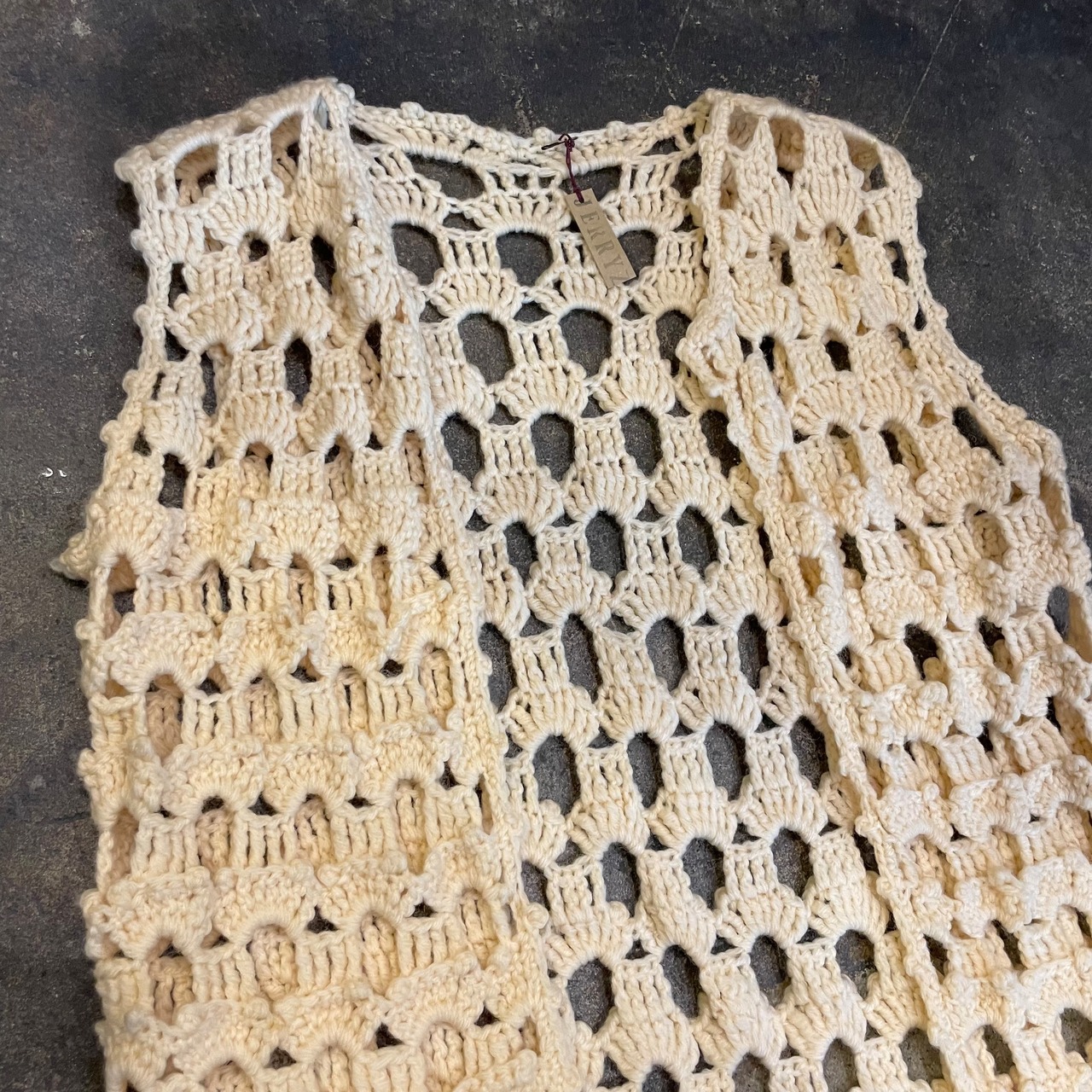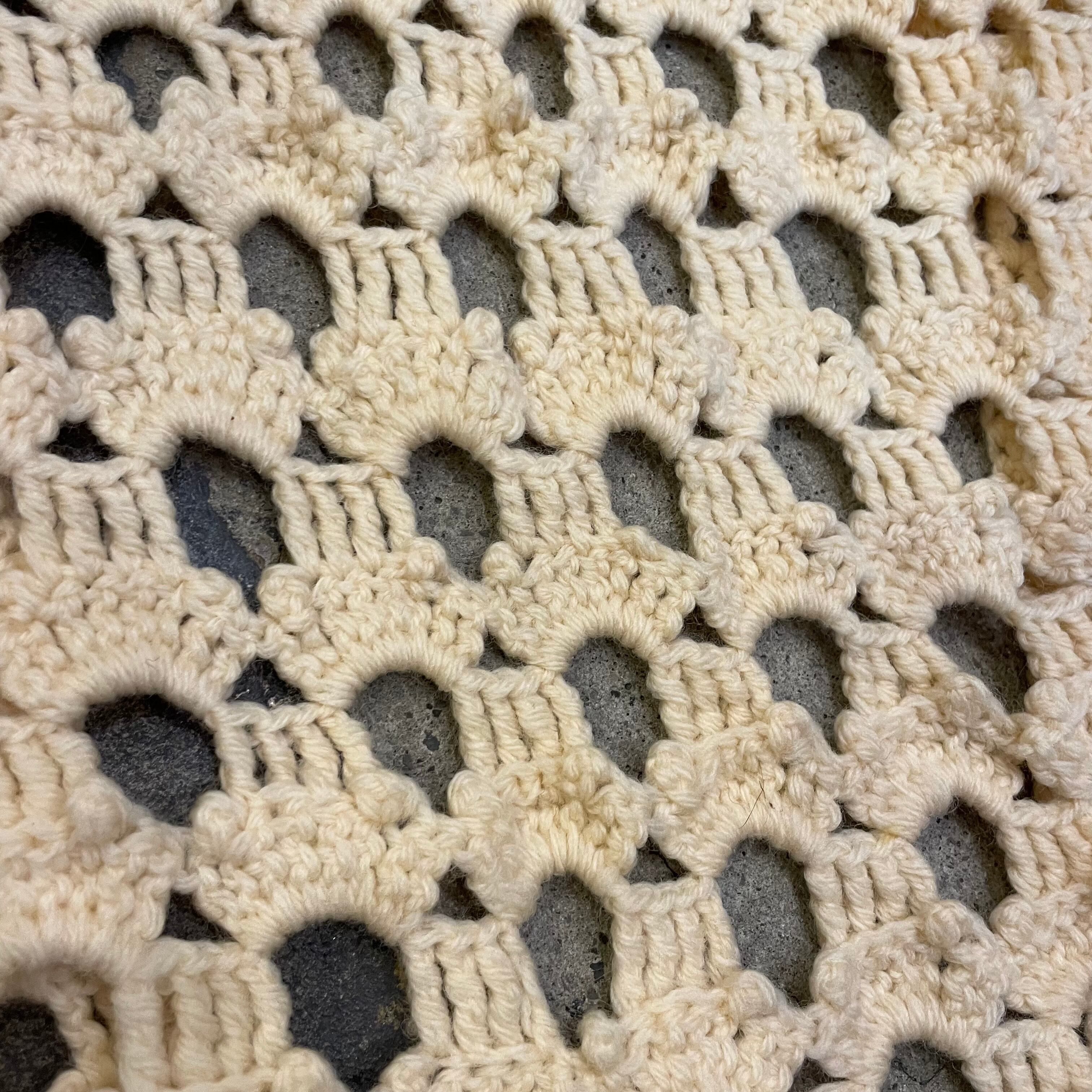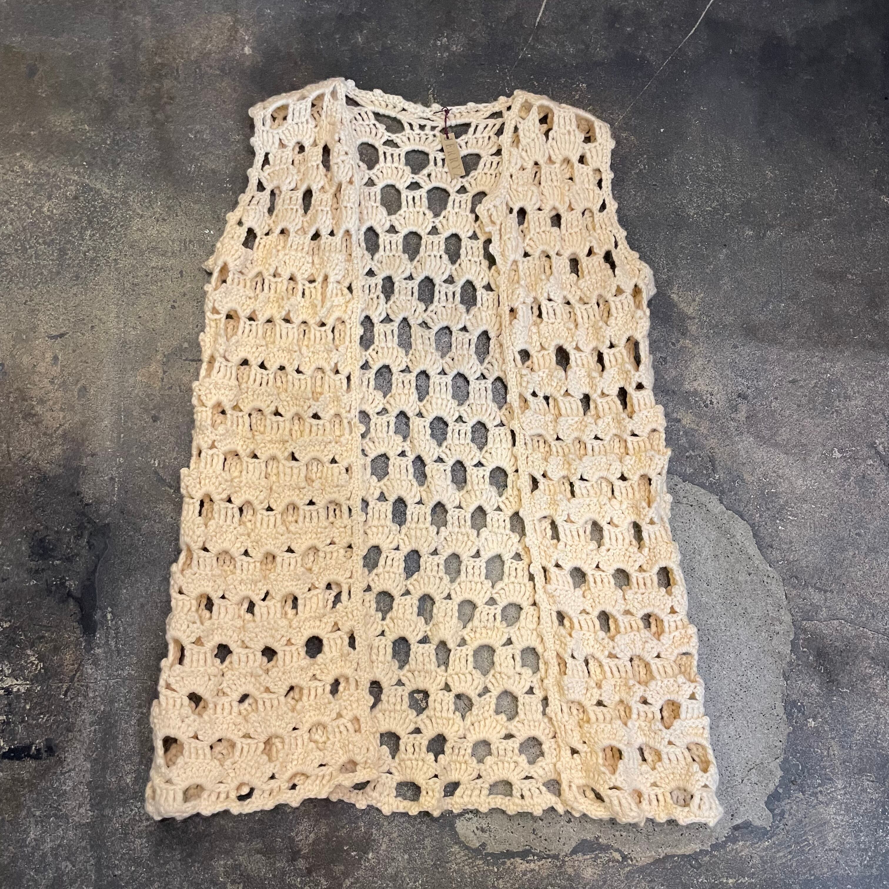 扇のような、建物の窓のような、立体感があってかわいい模様編みがかわいいベストです。