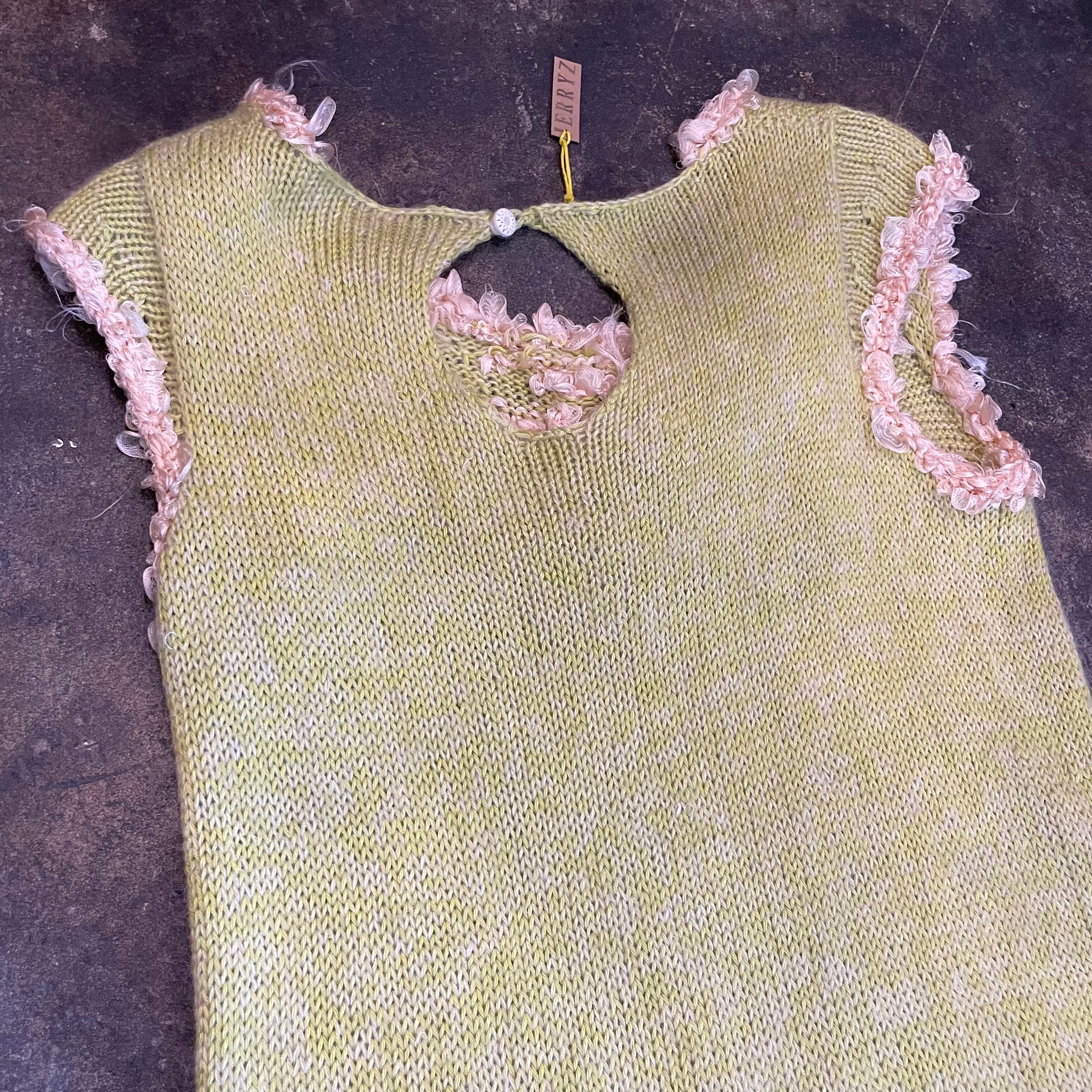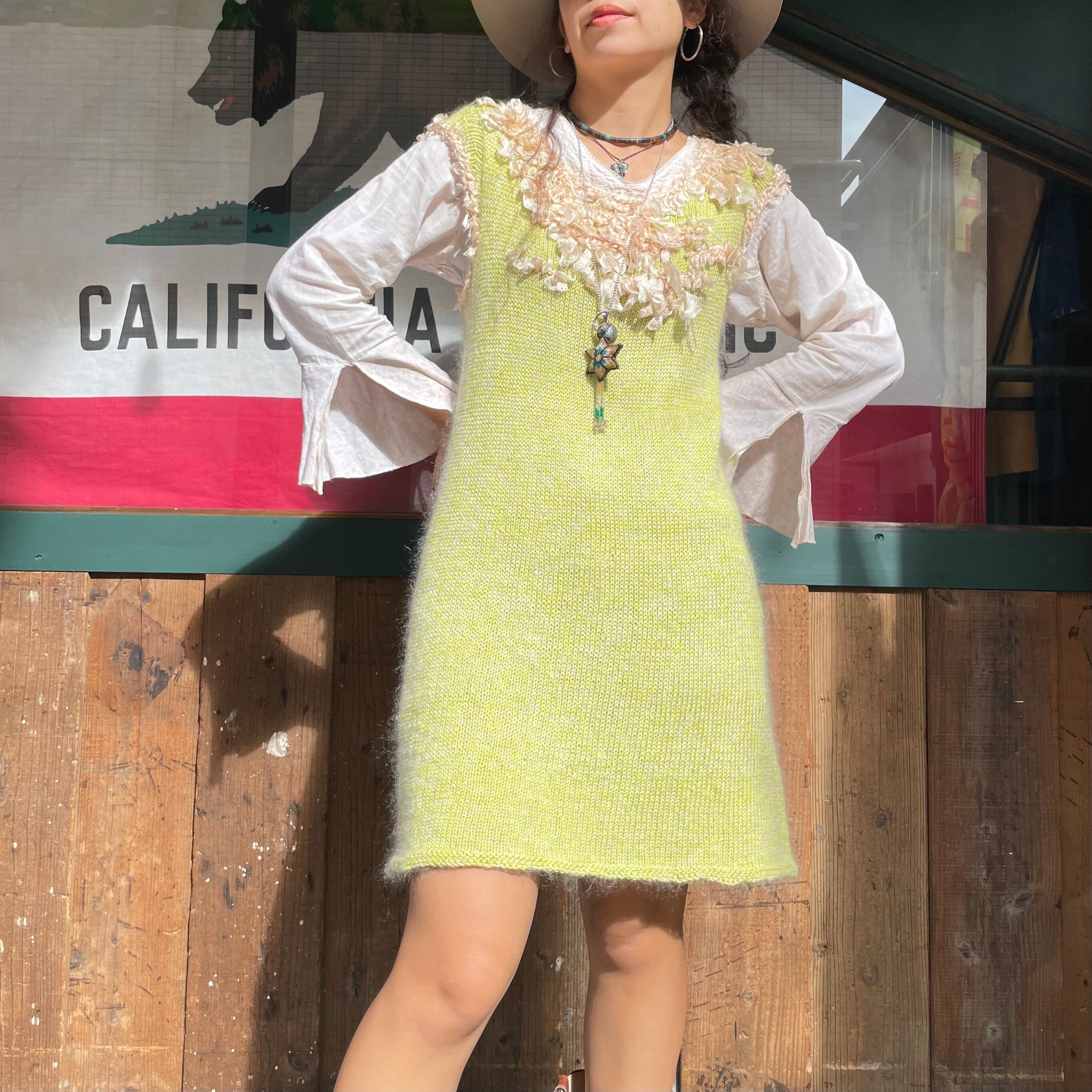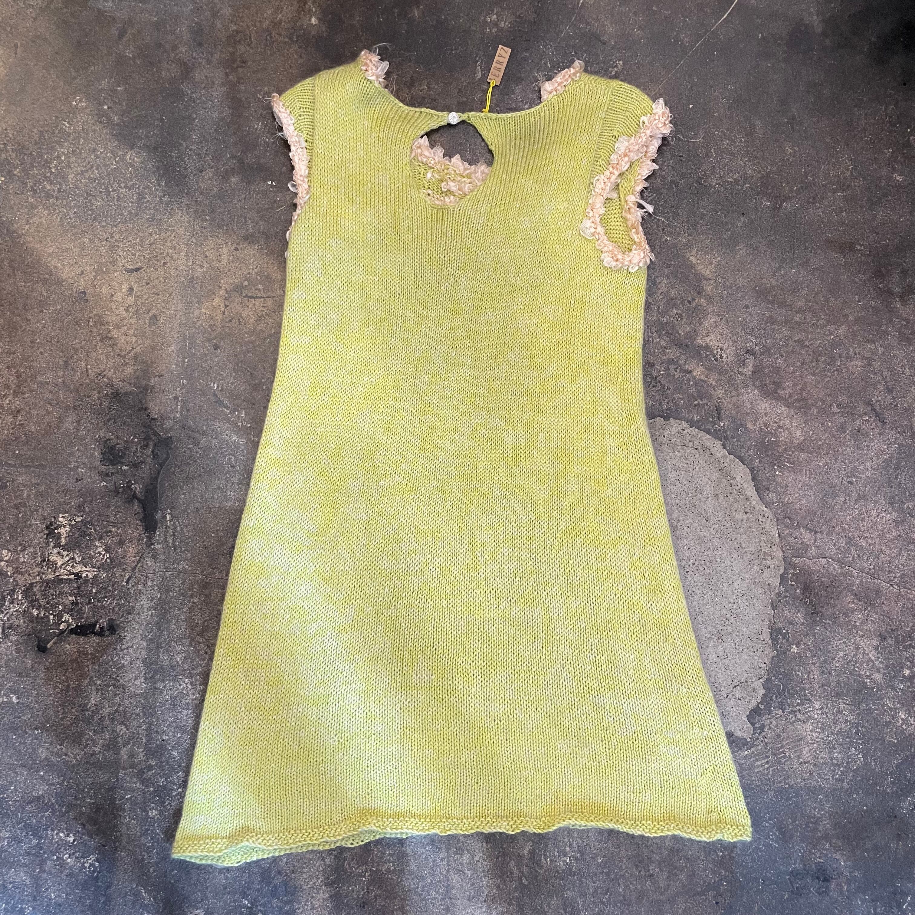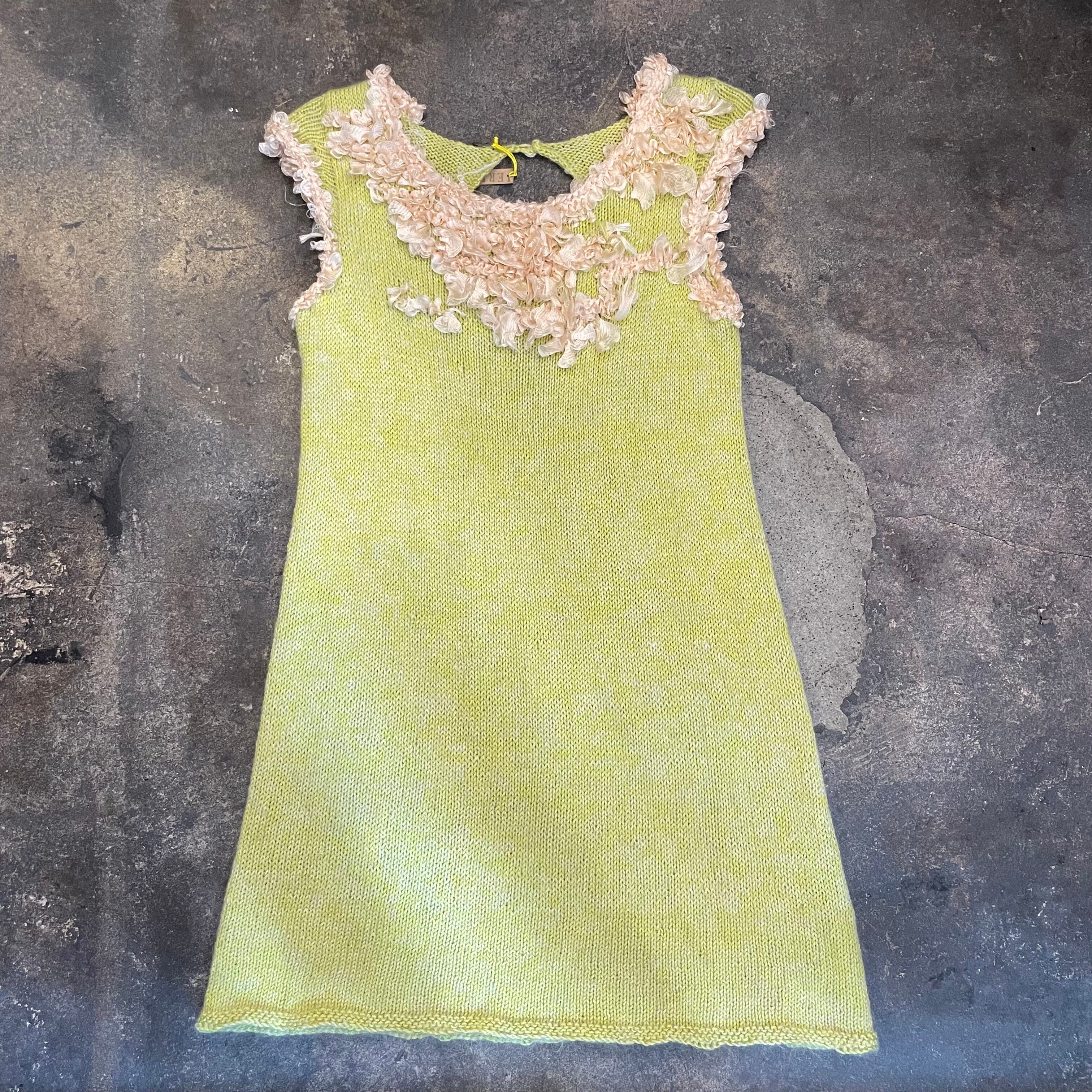 新緑のような爽やかな春のような優しい緑に、ピンクベージュのレースのようなリボンで装飾が施された手編みのニットワンピースです。