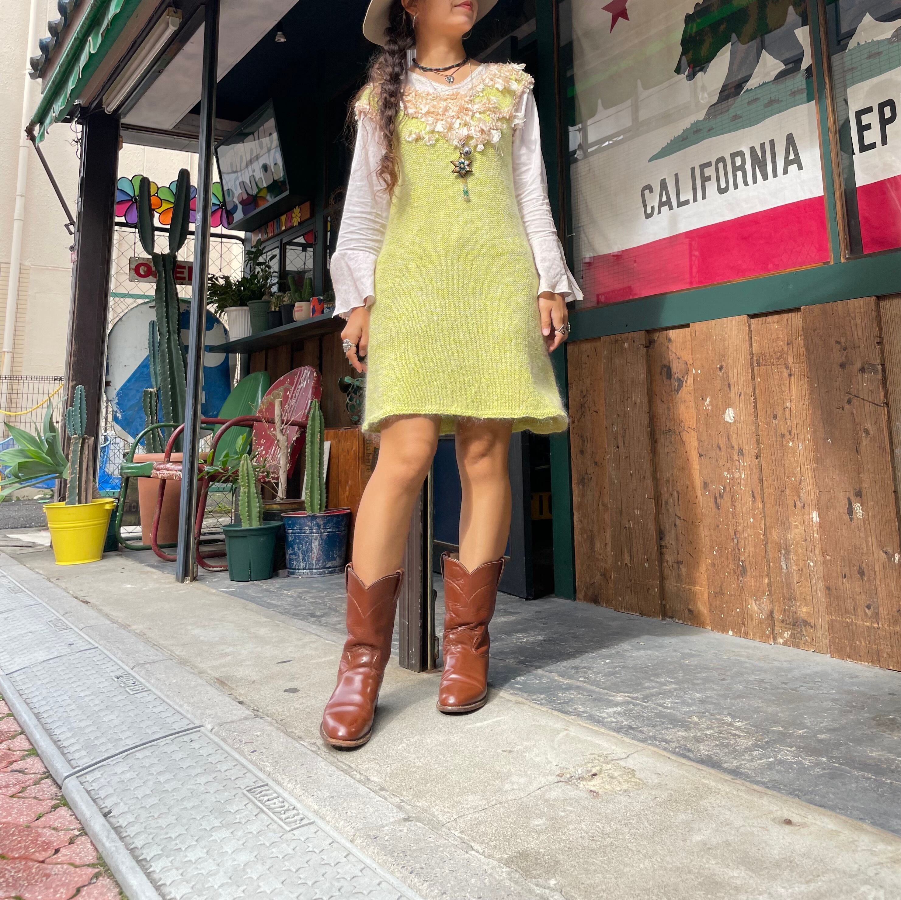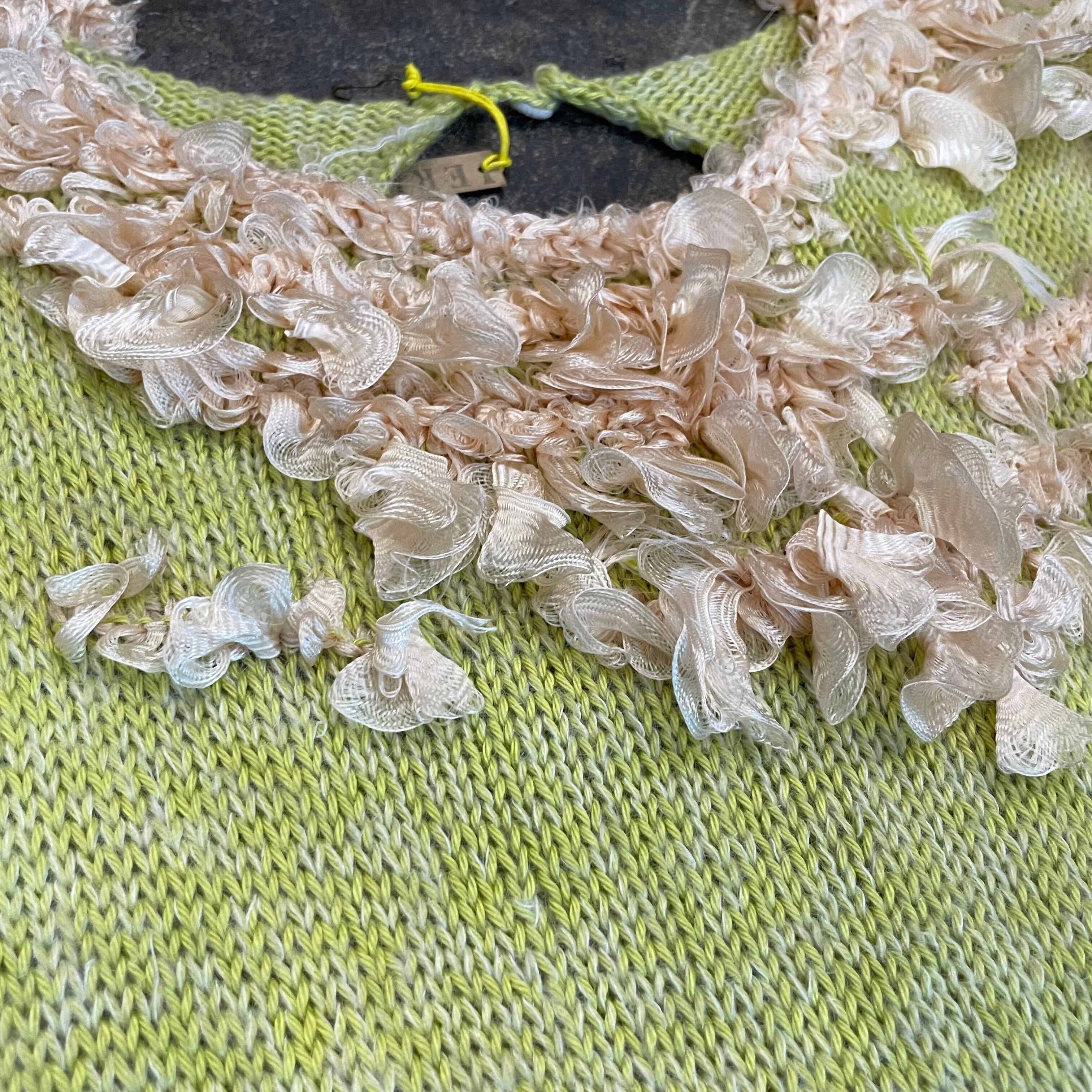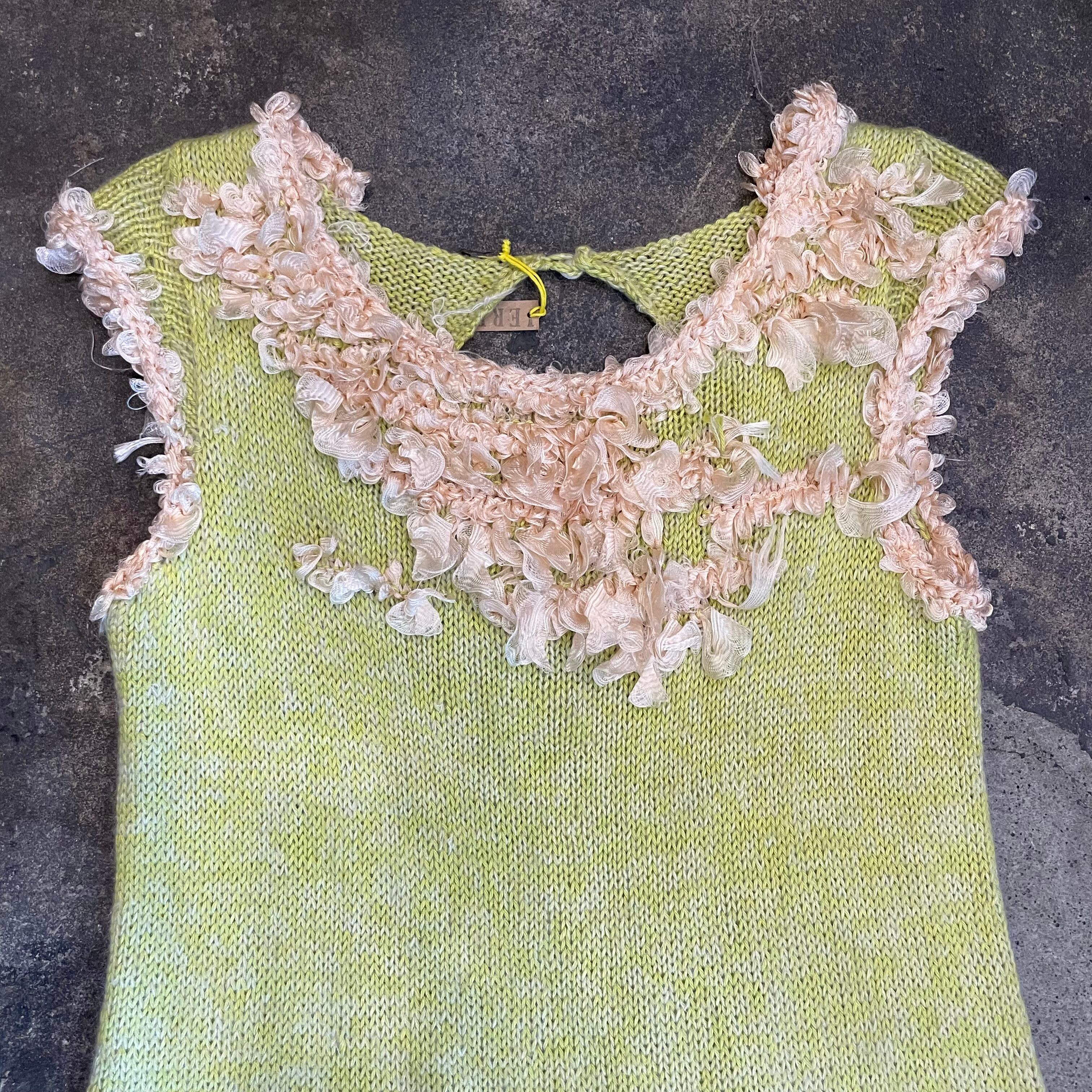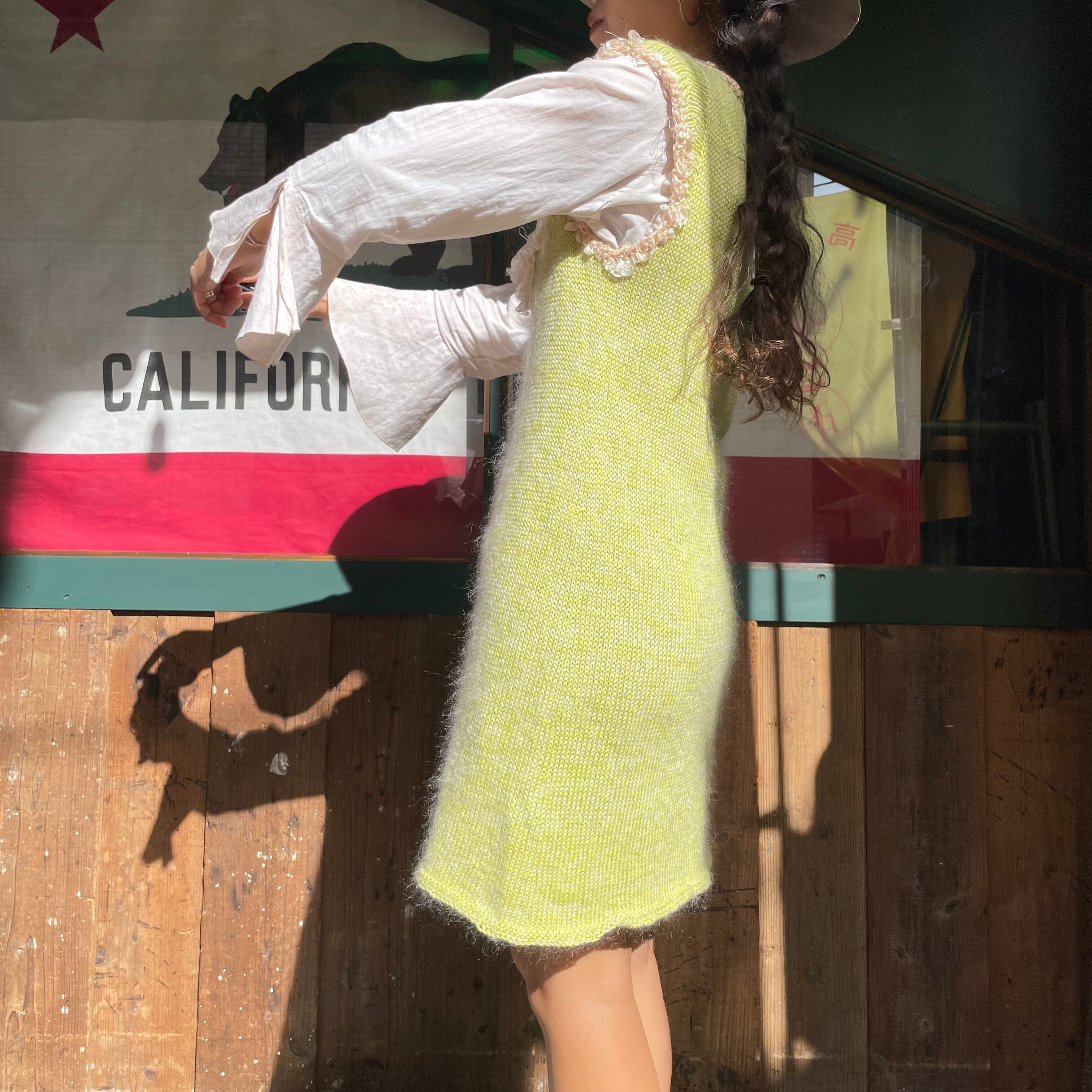 新緑のような爽やかな春のような優しい緑に、ピンクベージュのレースのようなリボンで装飾が施された手編みのニットワンピースです。