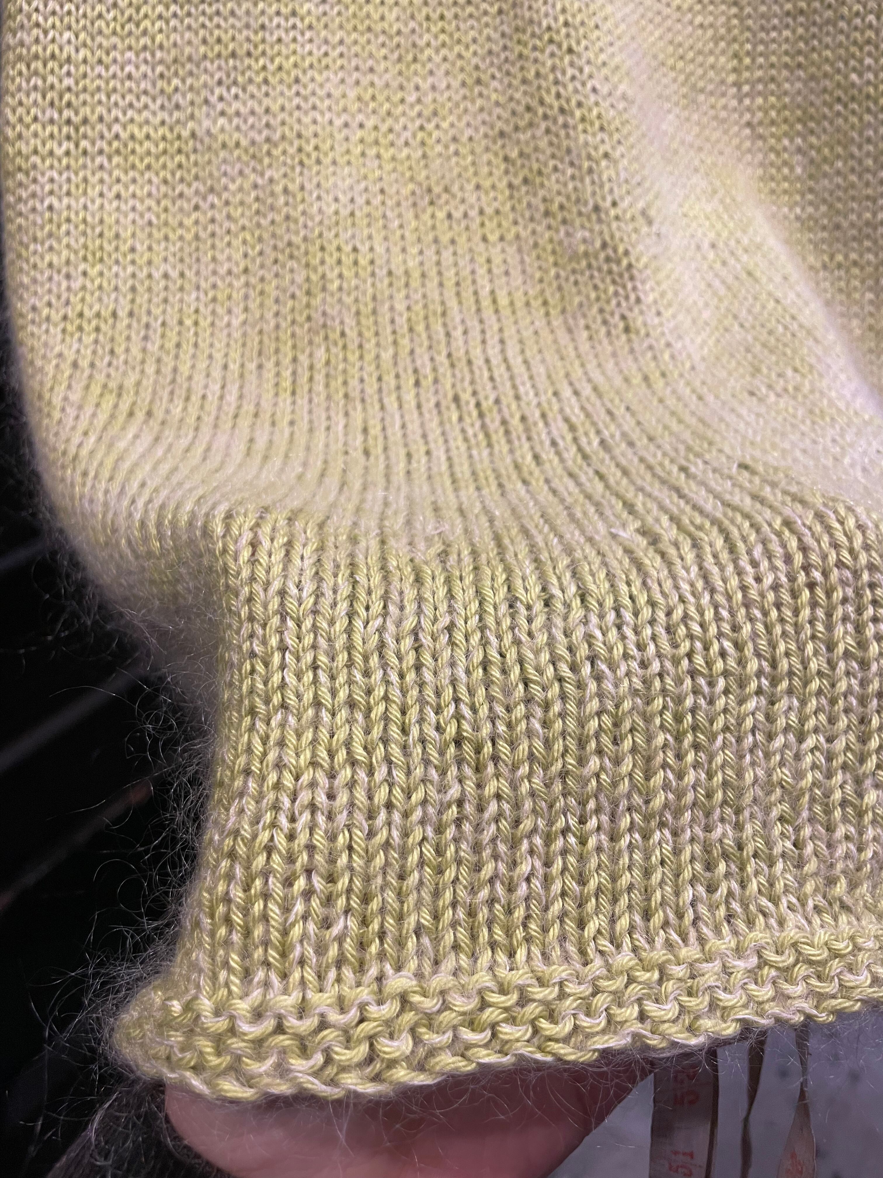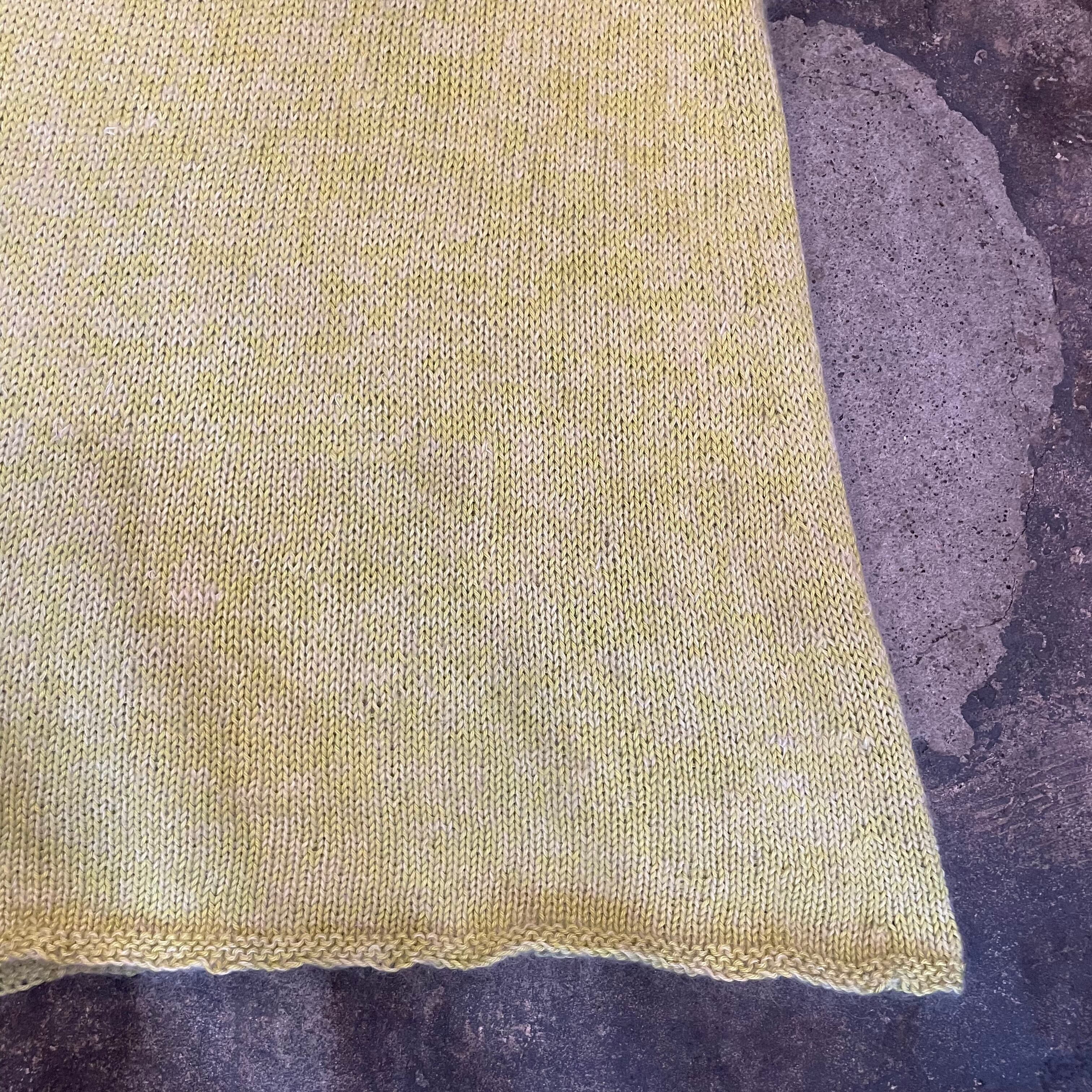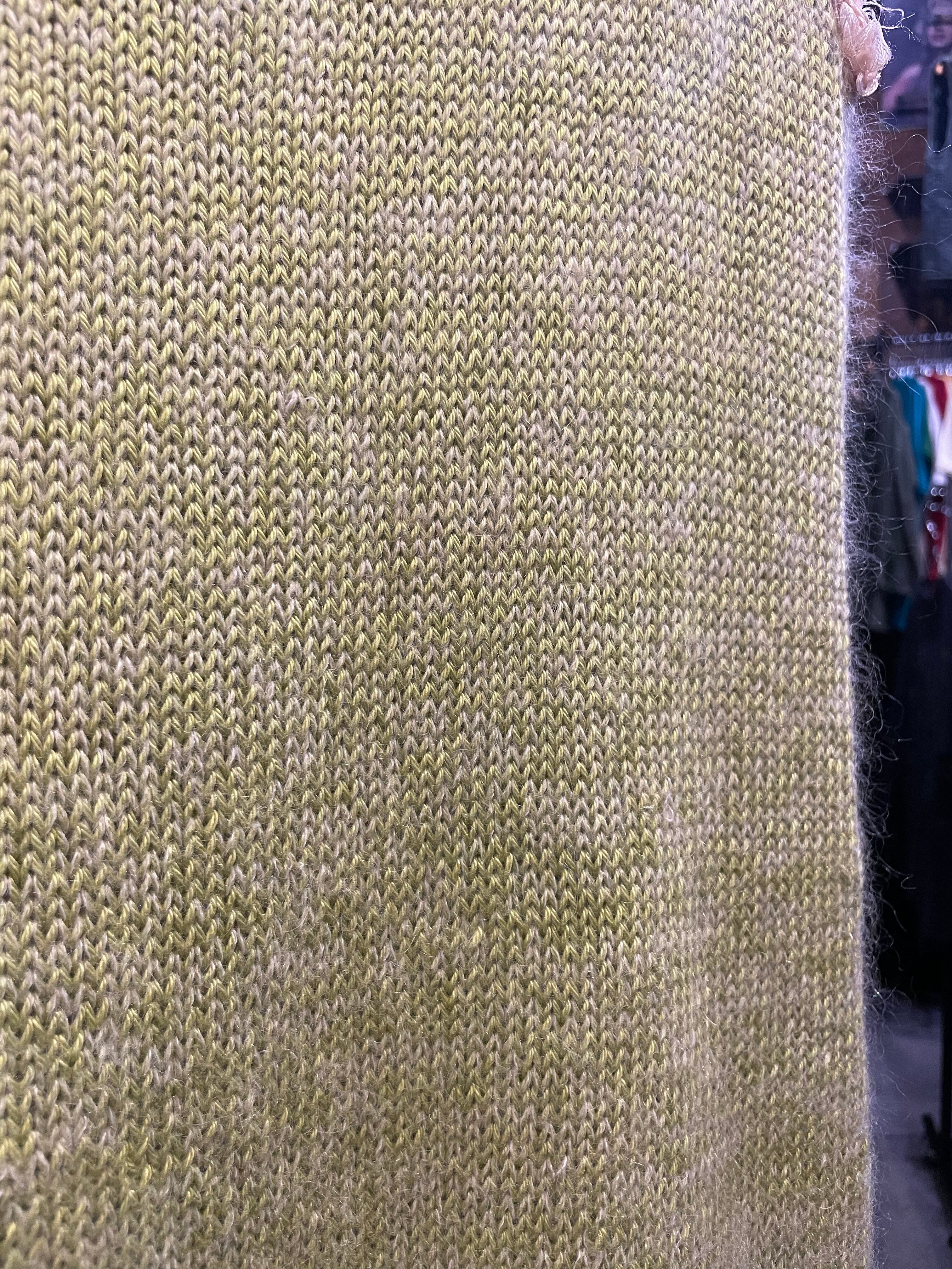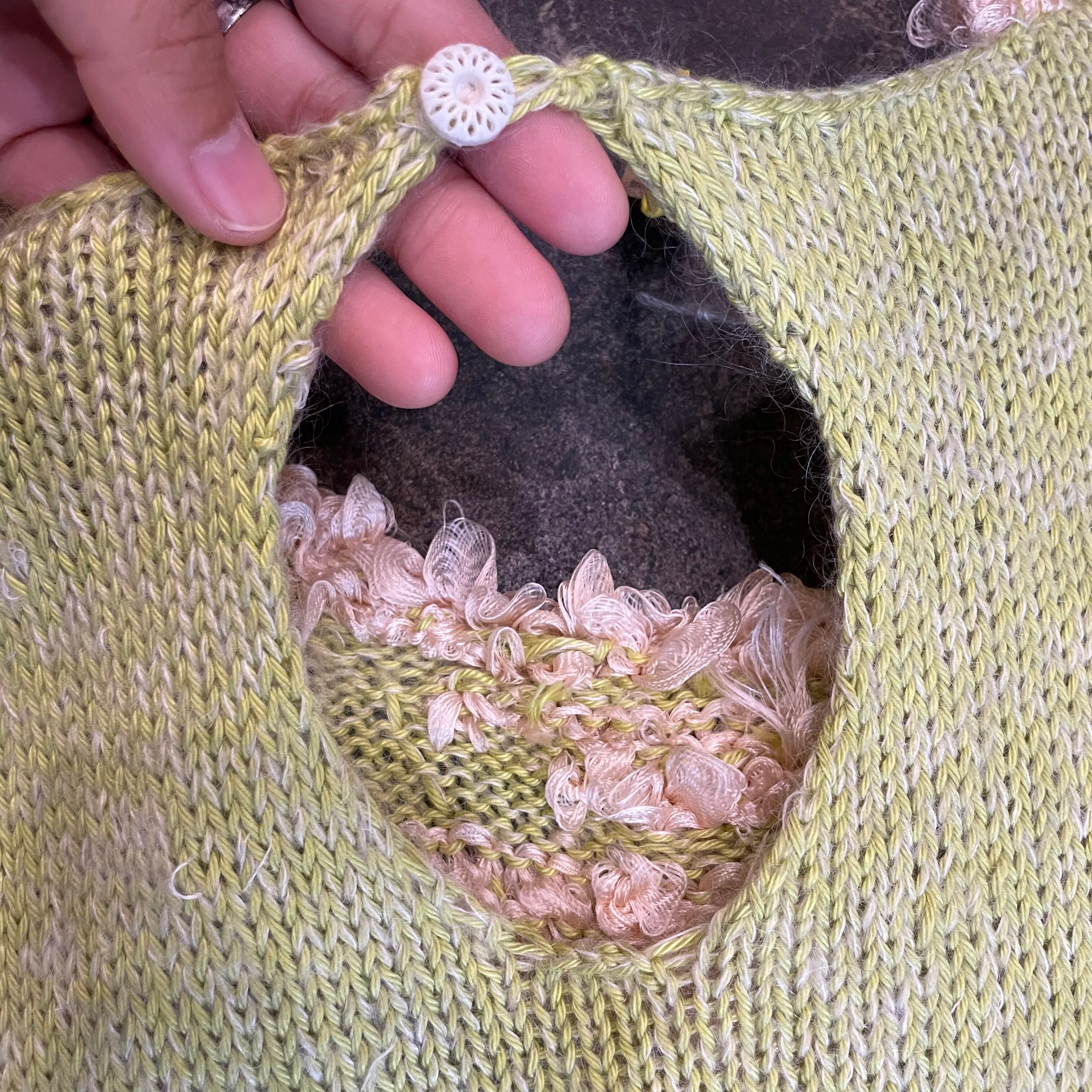 新緑のような爽やかな春のような優しい緑に、ピンクベージュのレースのようなリボンで装飾が施された手編みのニットワンピースです。
