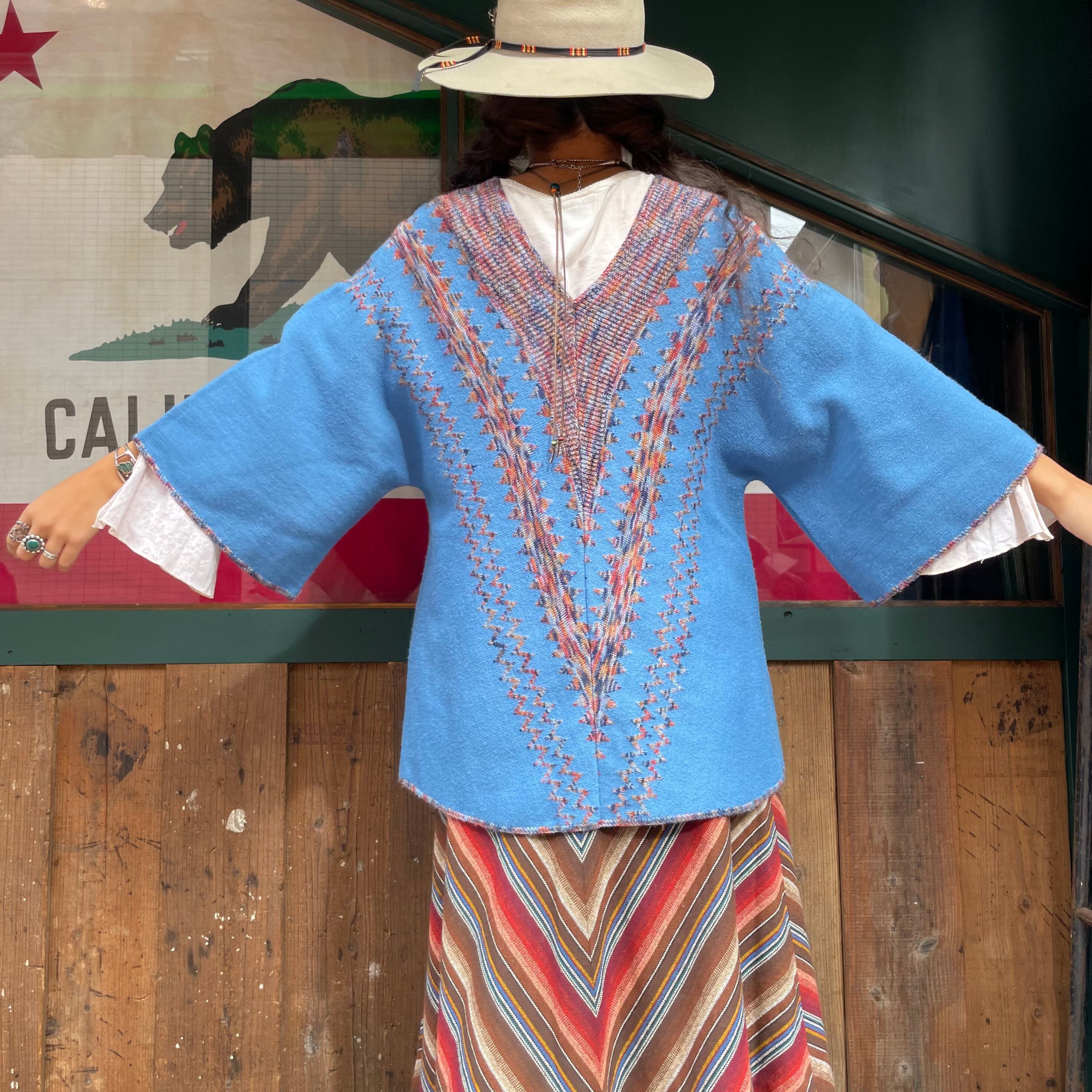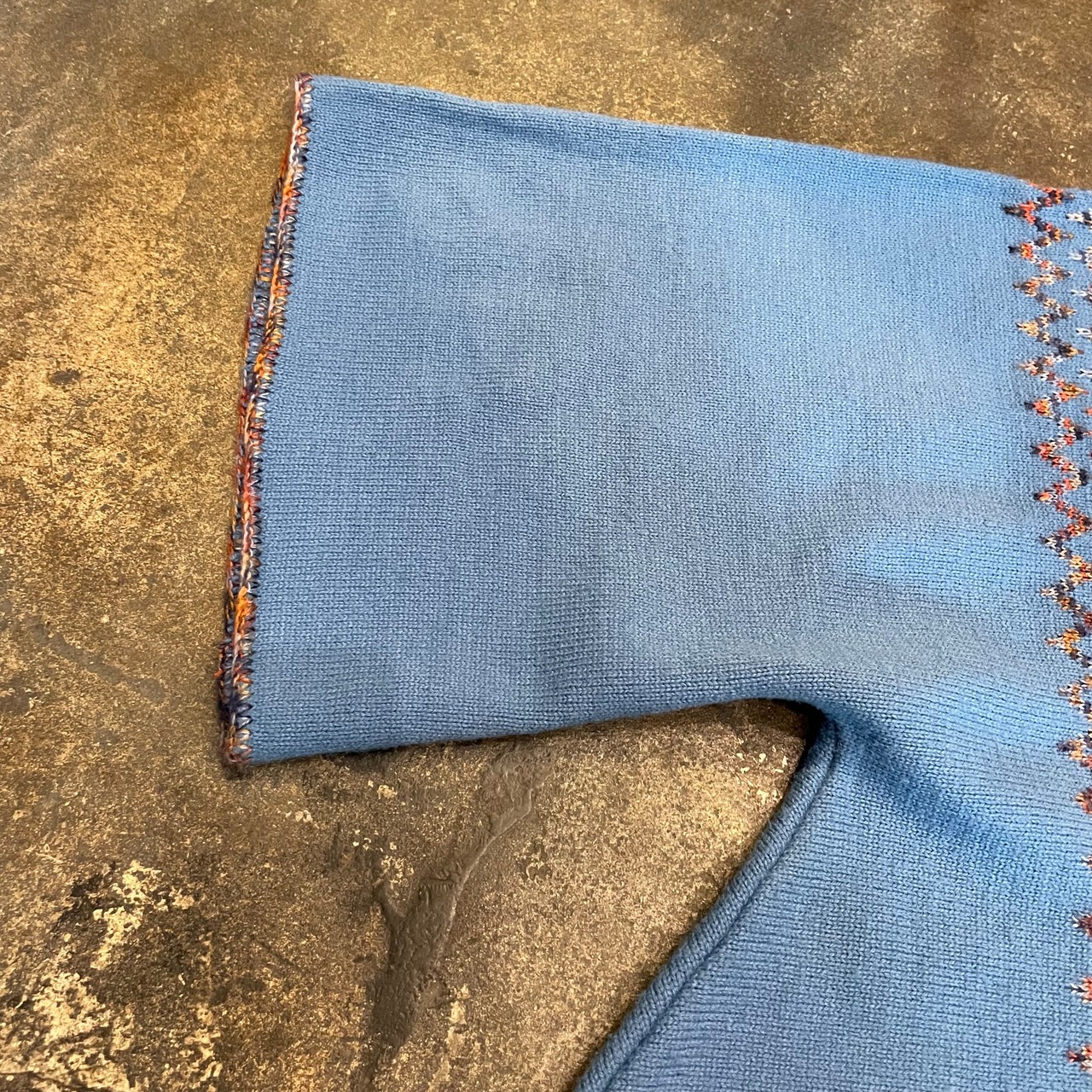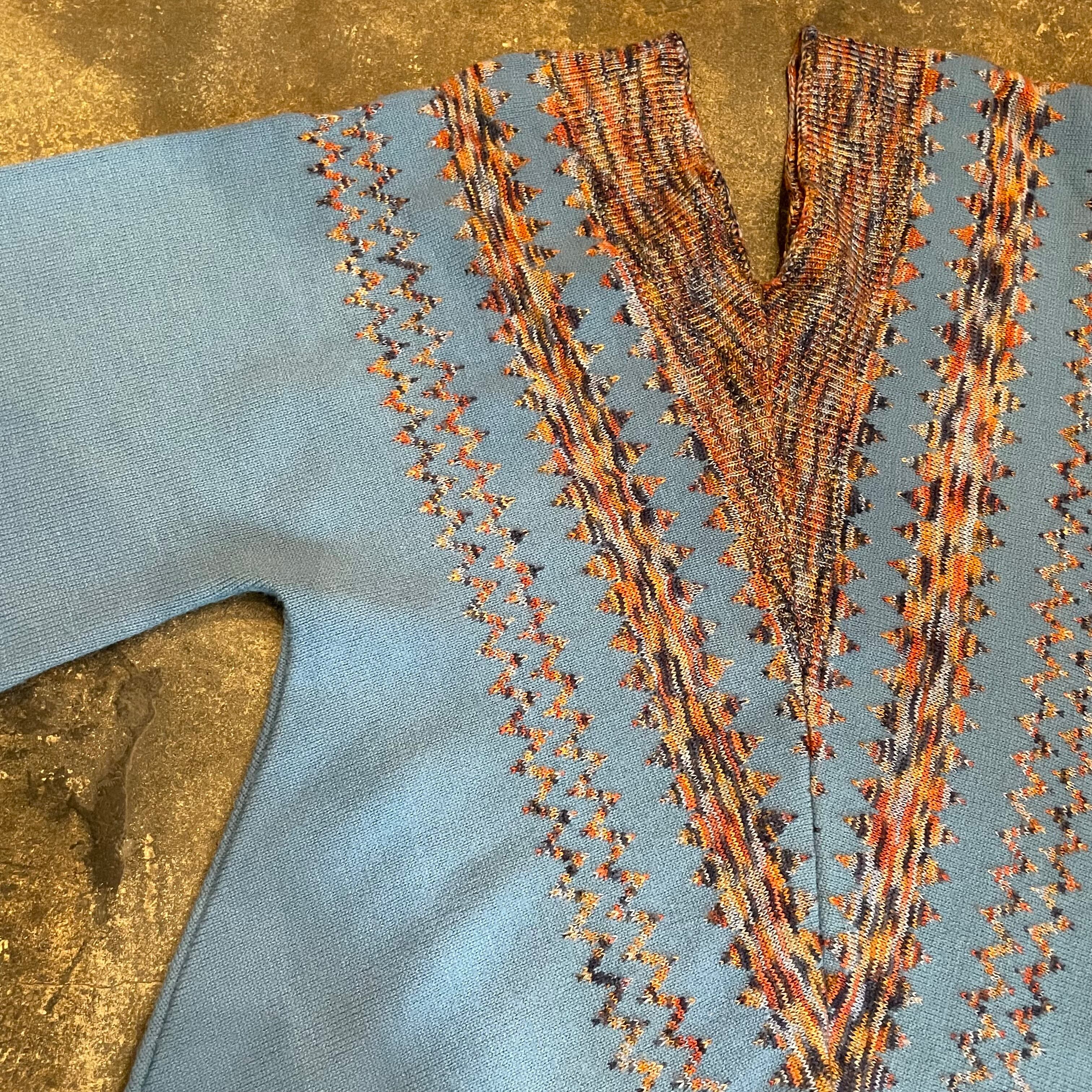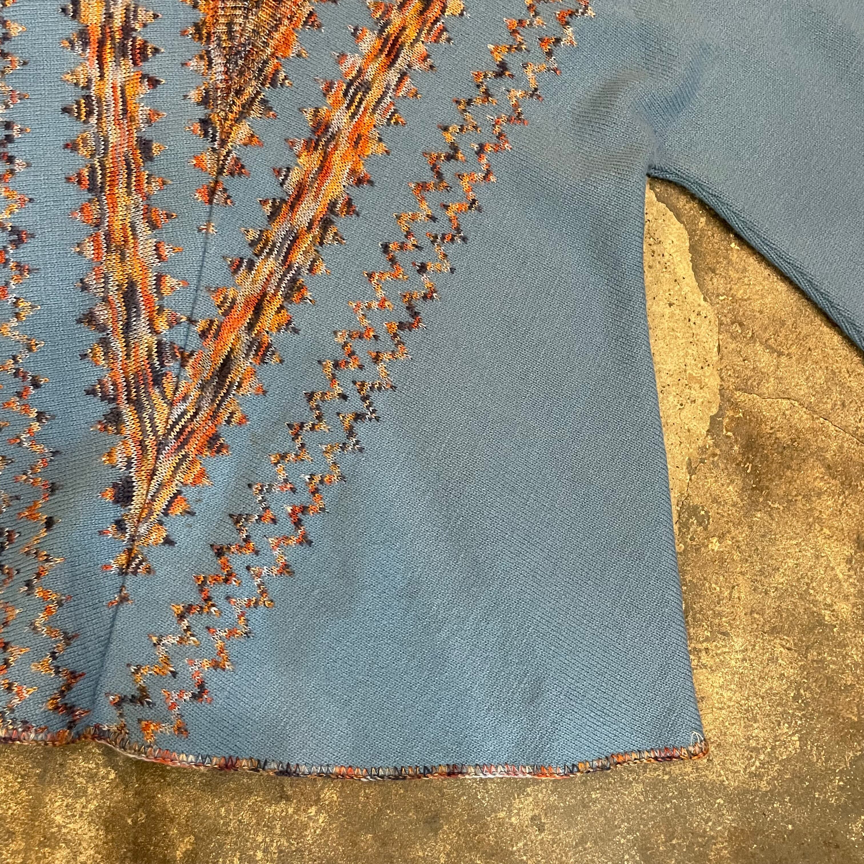 落ち着いた水色ベースにネイティブパターンのような編み模様がかわいいセーターです。
