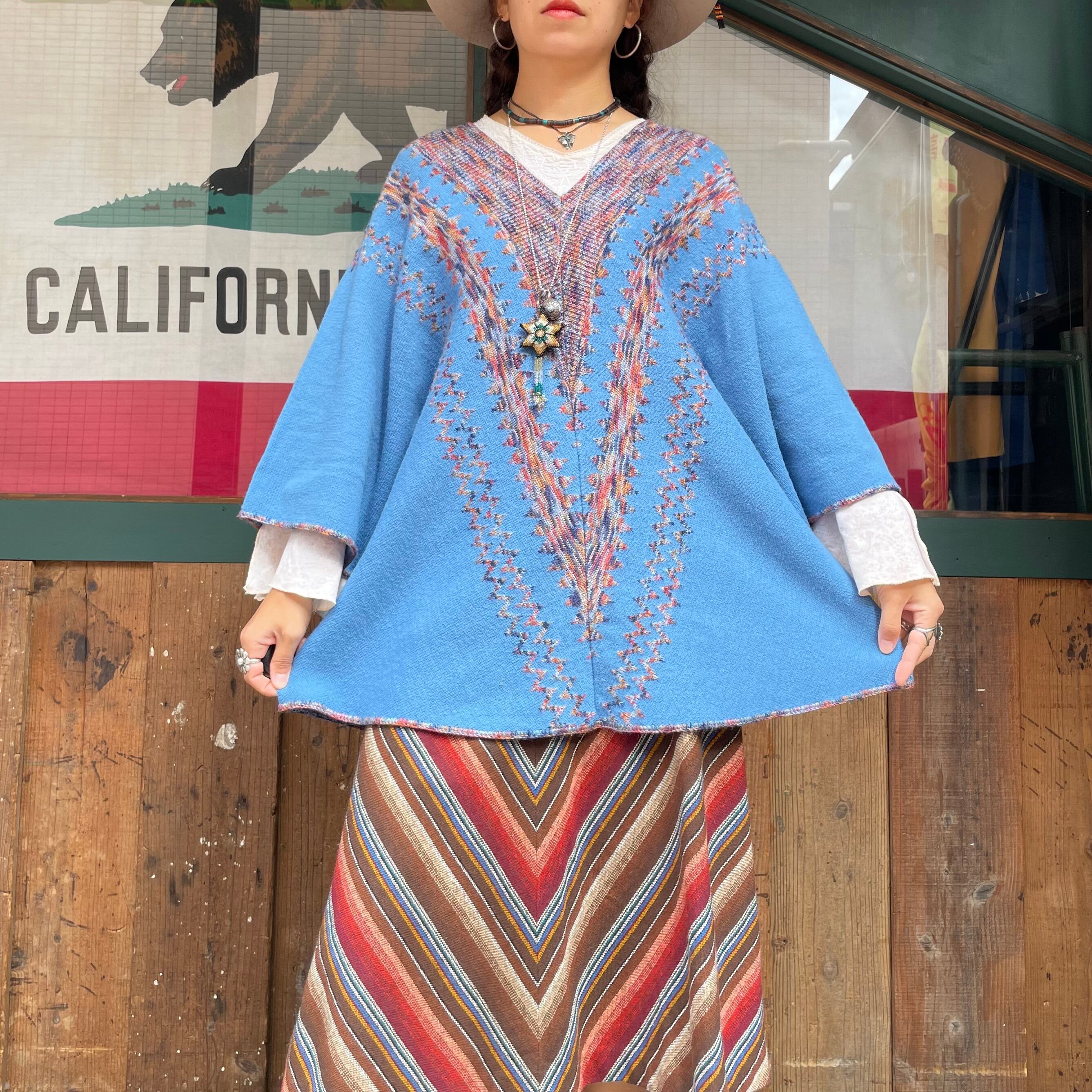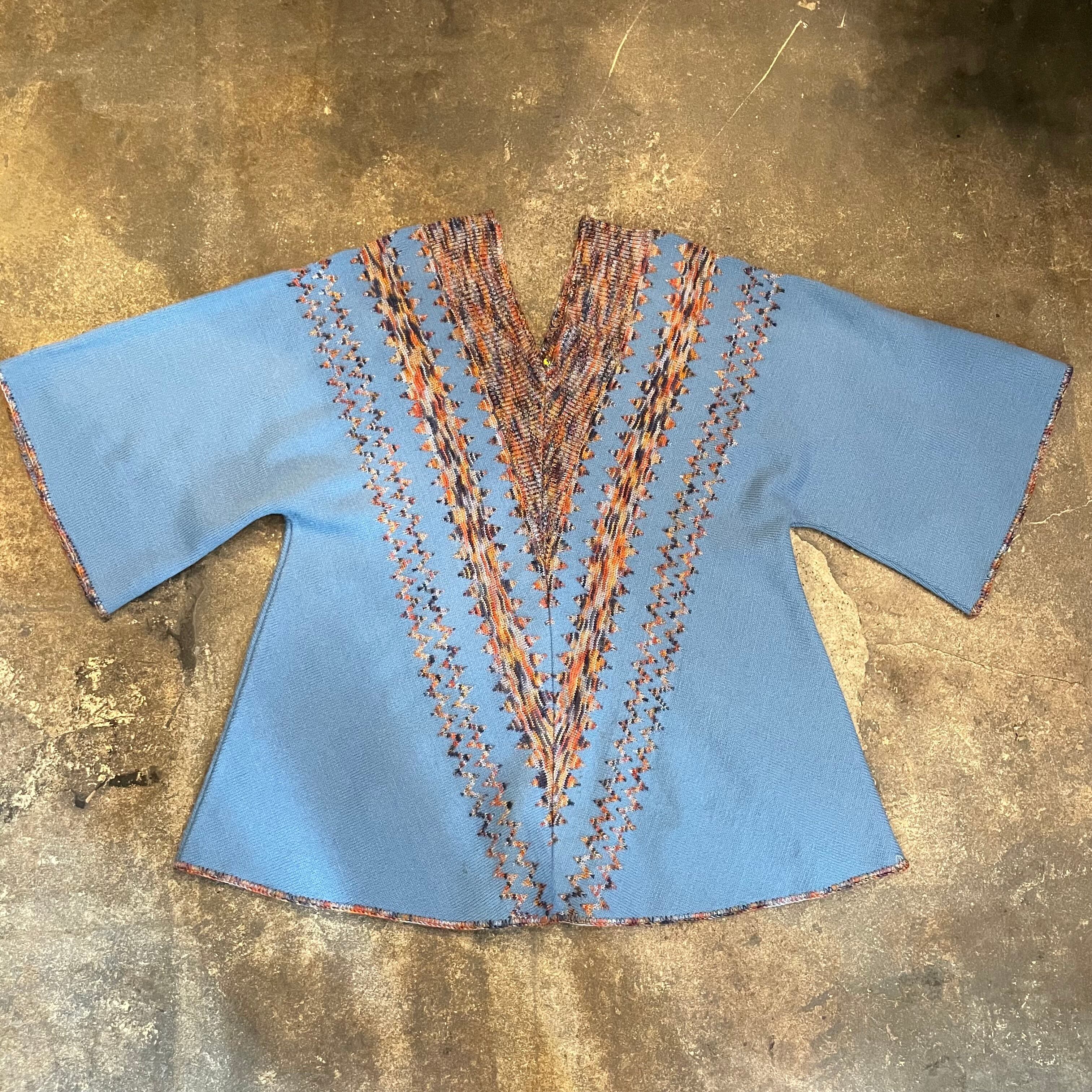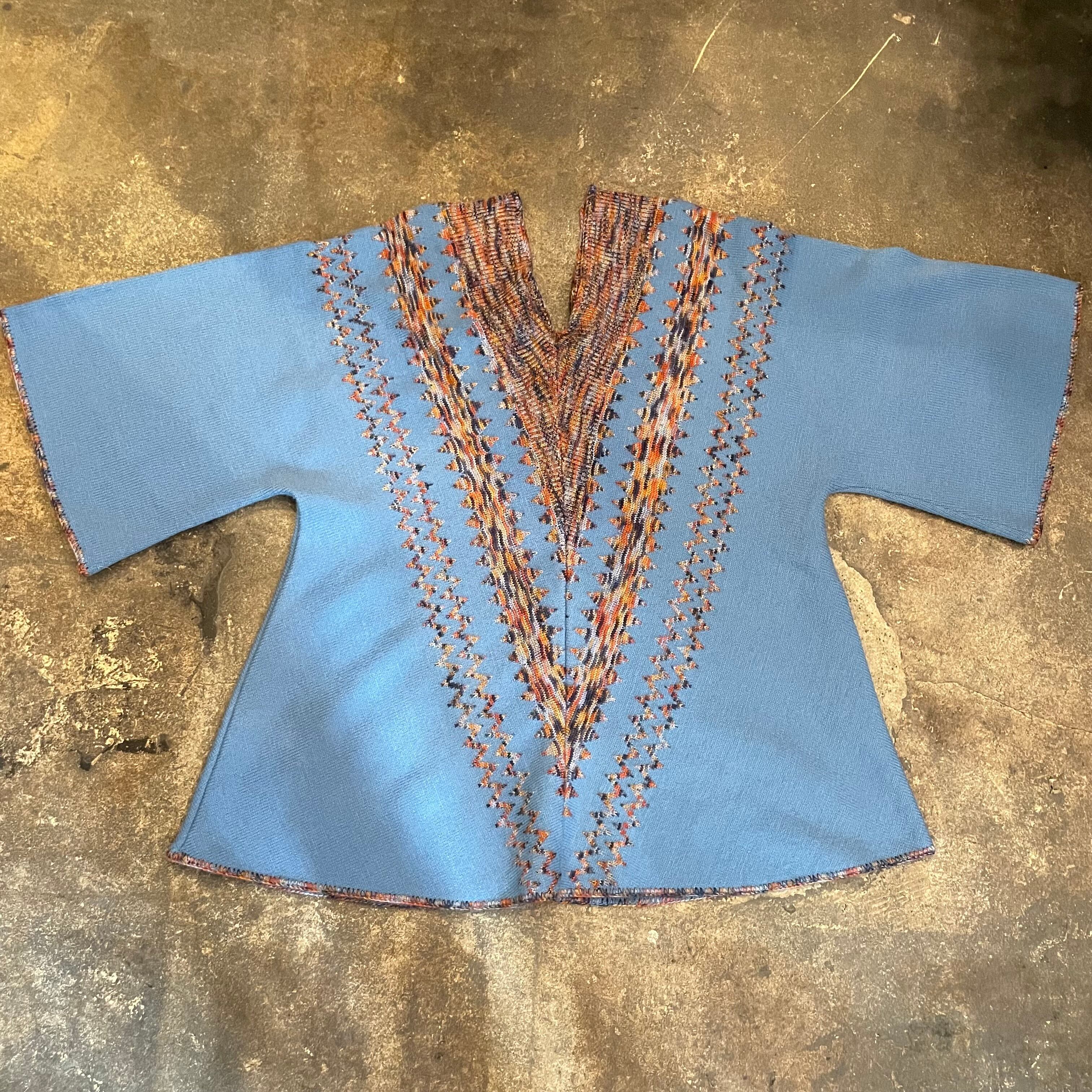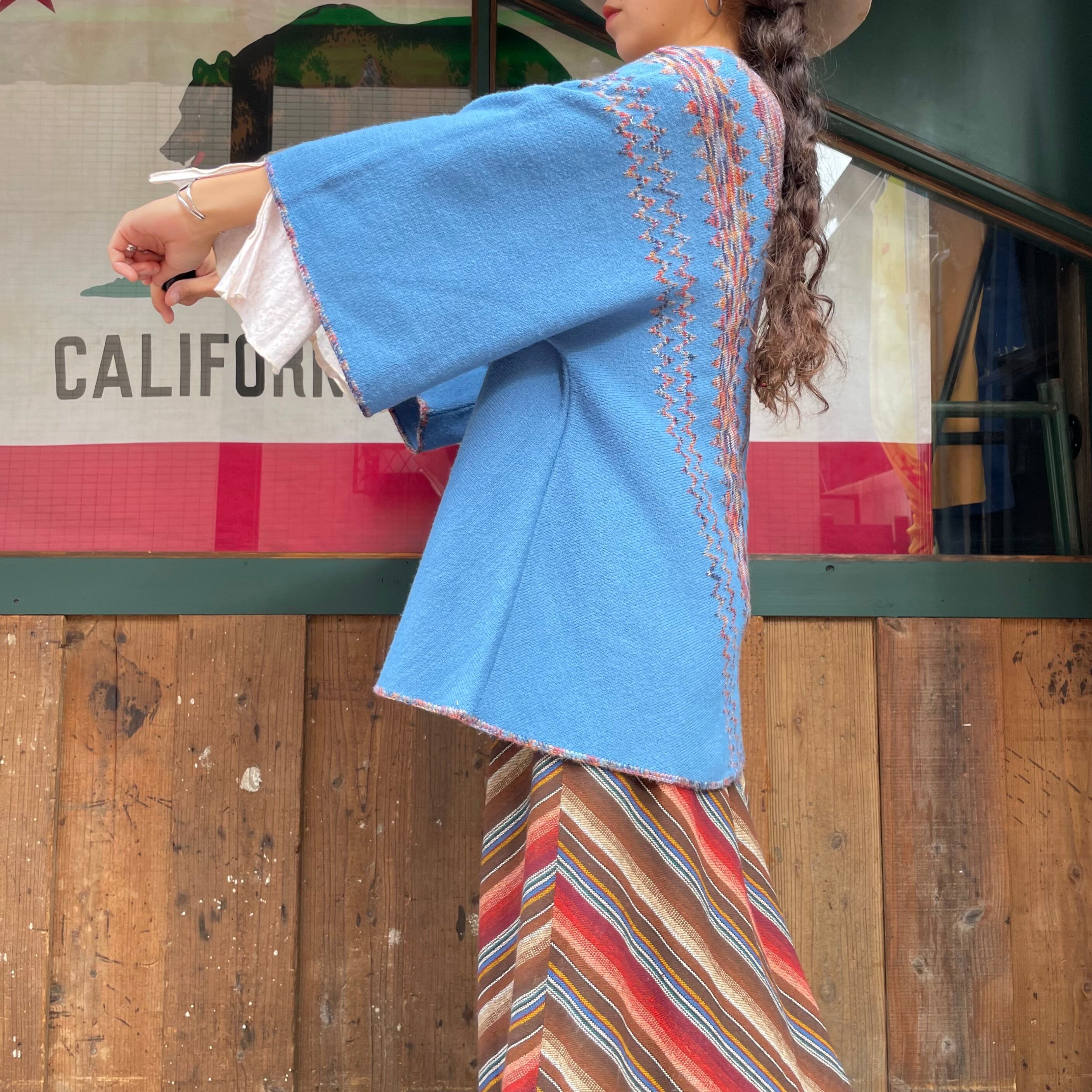 落ち着いた水色ベースにネイティブパターンのような編み模様がかわいいセーターです。