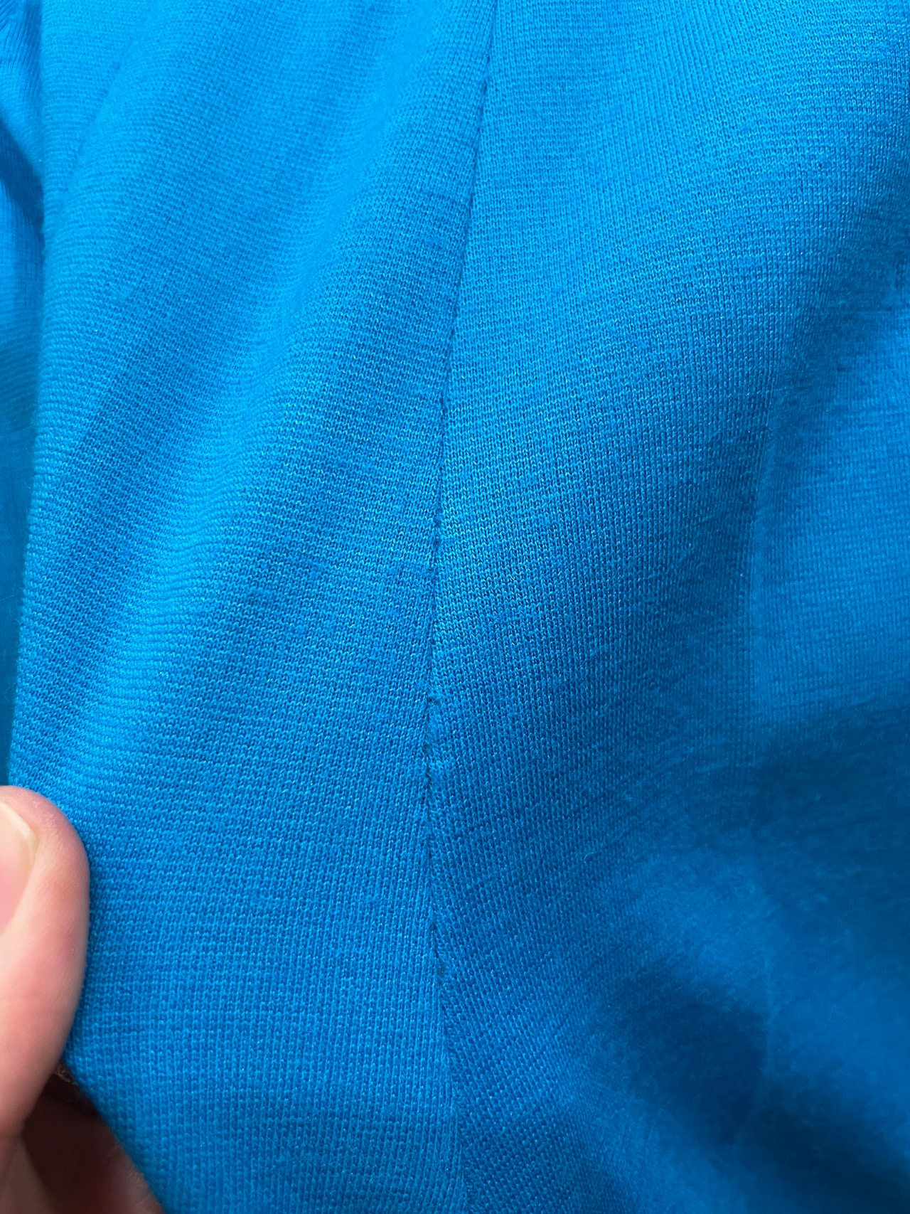 鮮やかなブルーがとてもきれいなフレアパンツです。色だけでなくシルエットも美しいですし、前の膝あたりまで裏地がついているなど丁寧な作りの一本です。