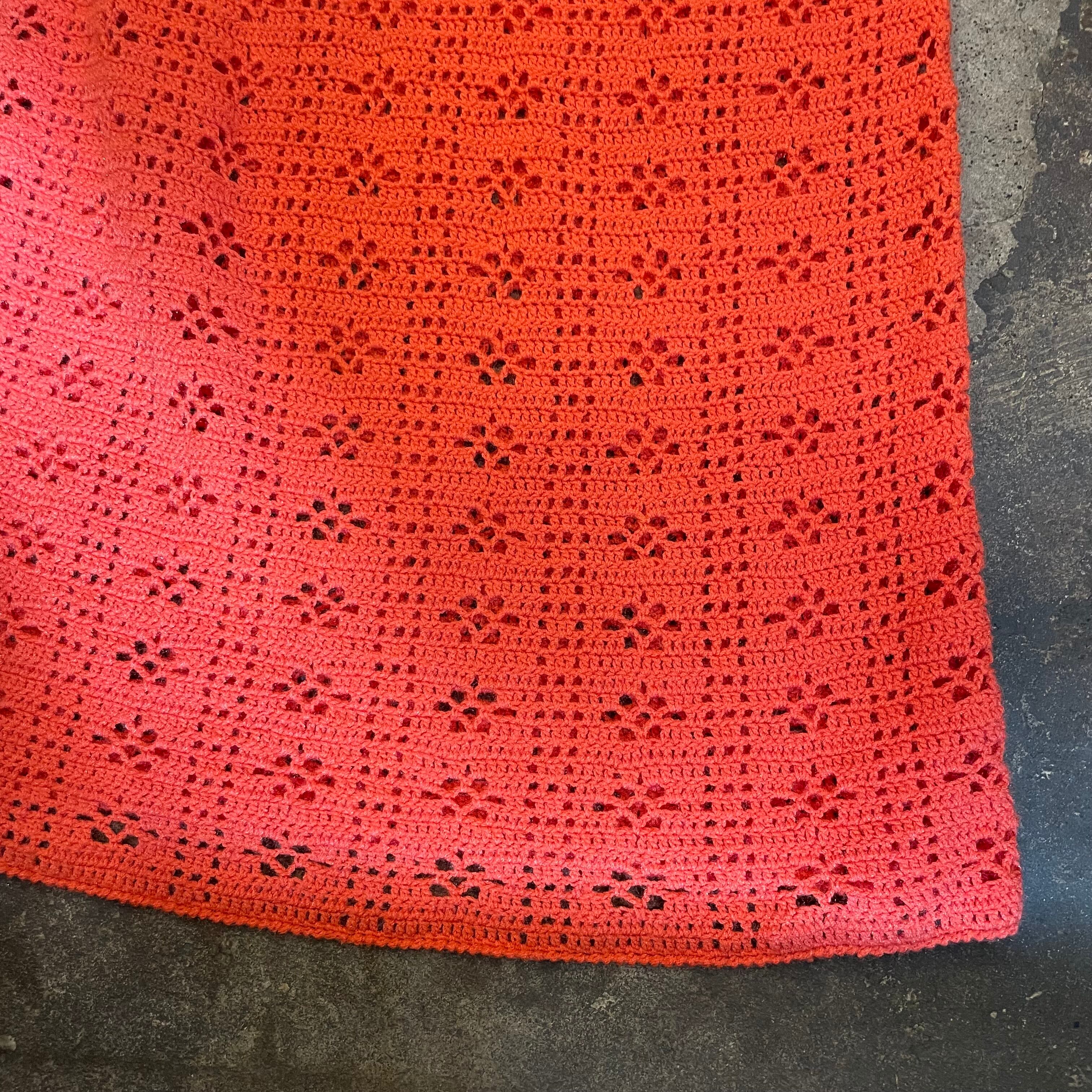 コーラルピンクで、ややキラッとする毛糸がかわいい、手編みのワンピースです。お花のような模様編みで細かく編まれていてレースのようで素敵ですね。
