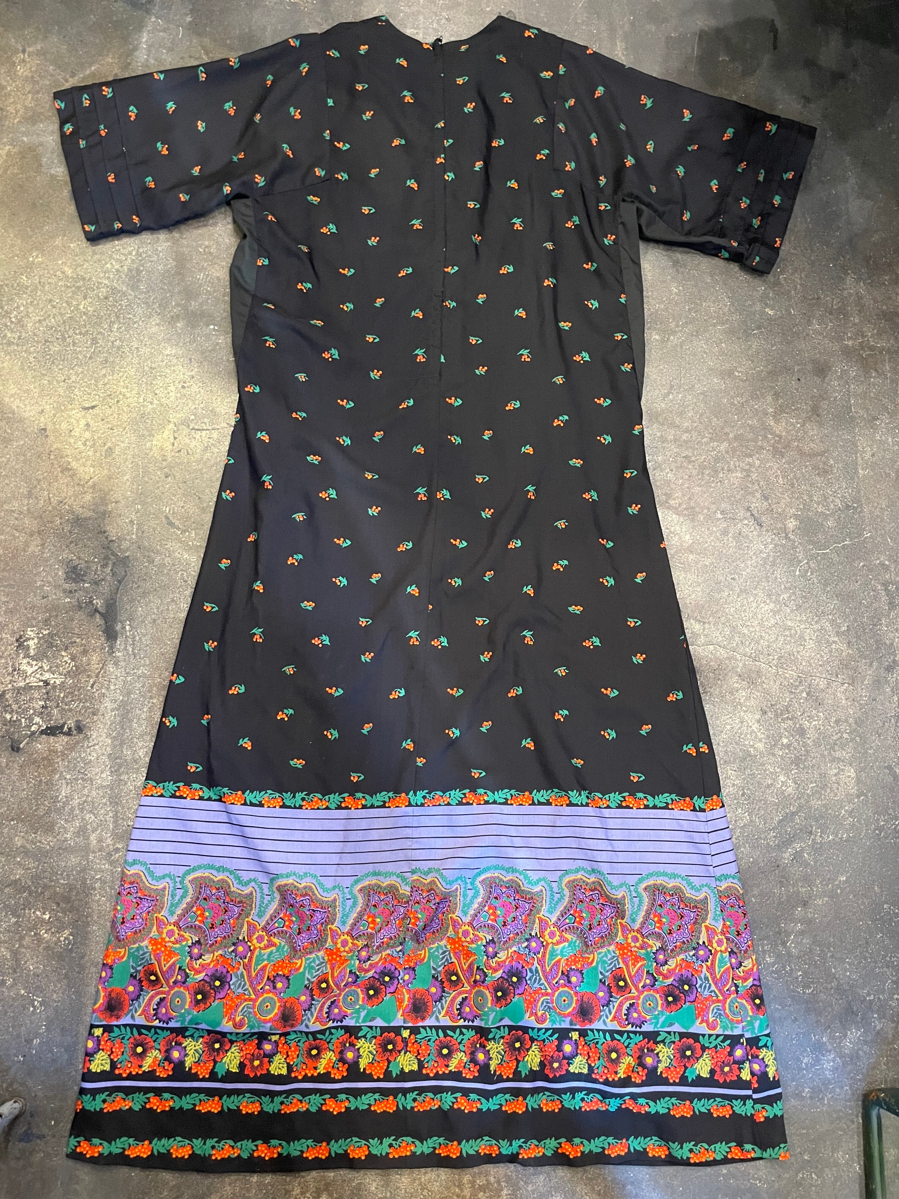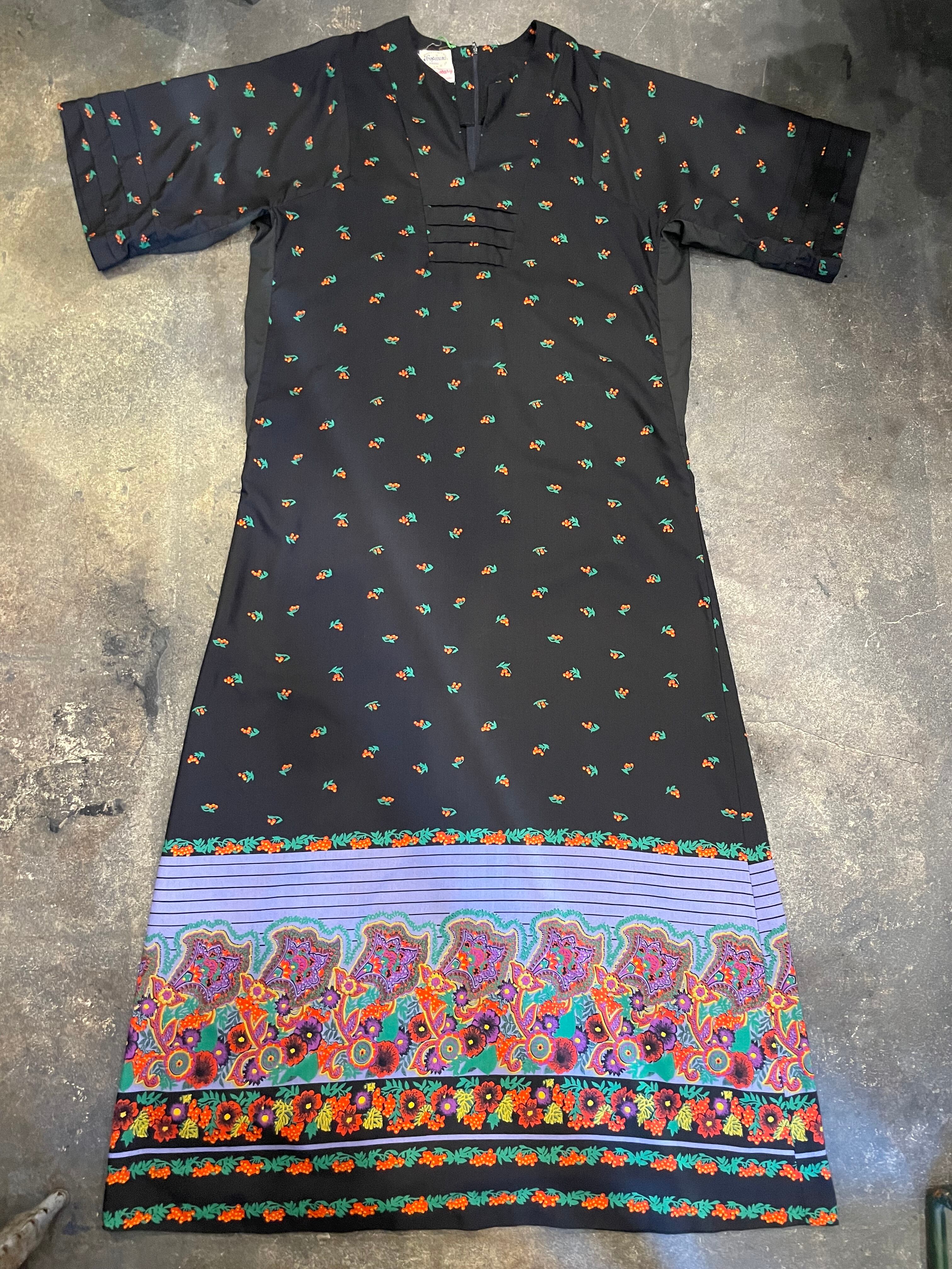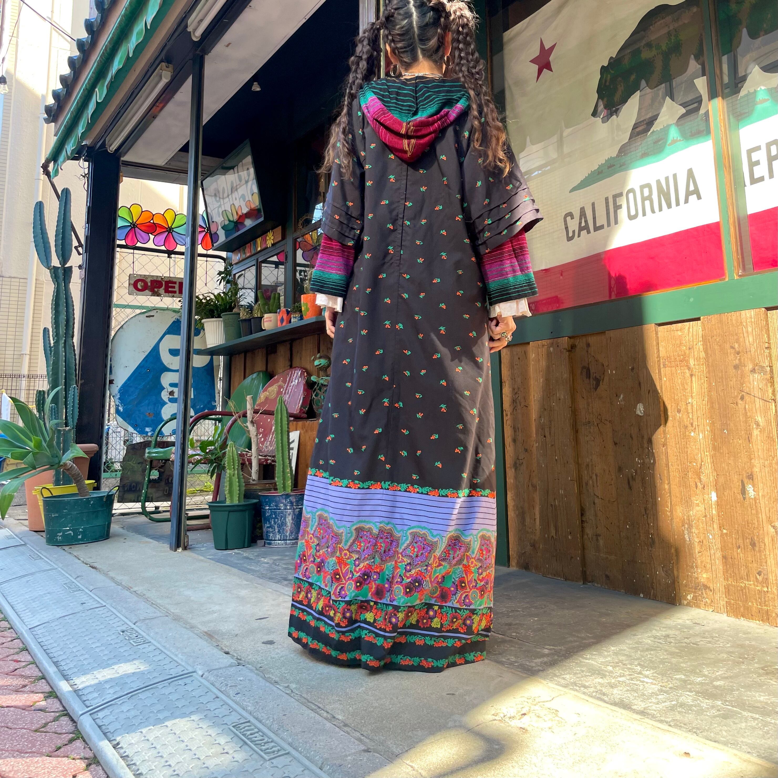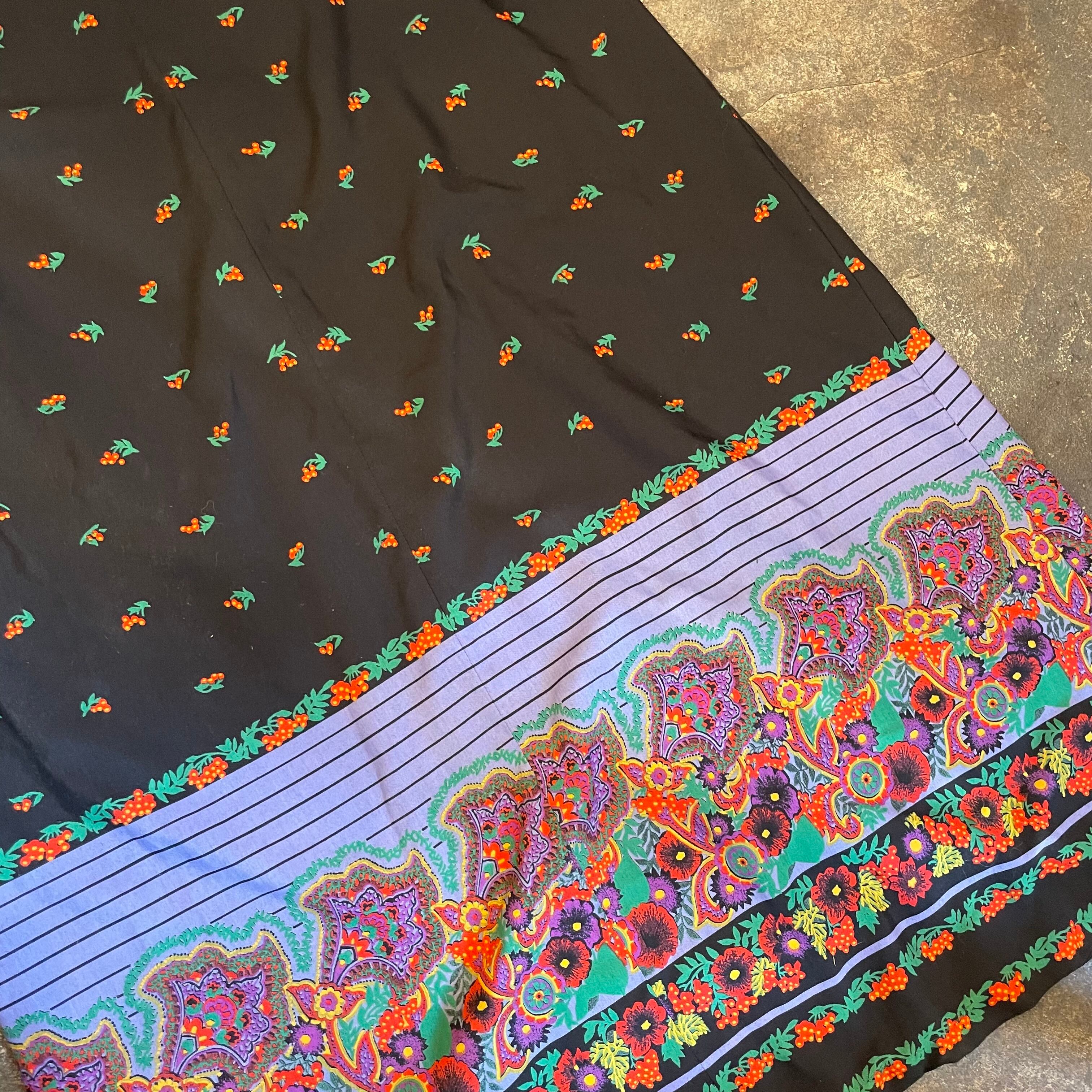黒ベースに実のような小さい柄、そして裾のペイズリーっぽい雰囲気の花柄?がかわいいロングワンピースです。