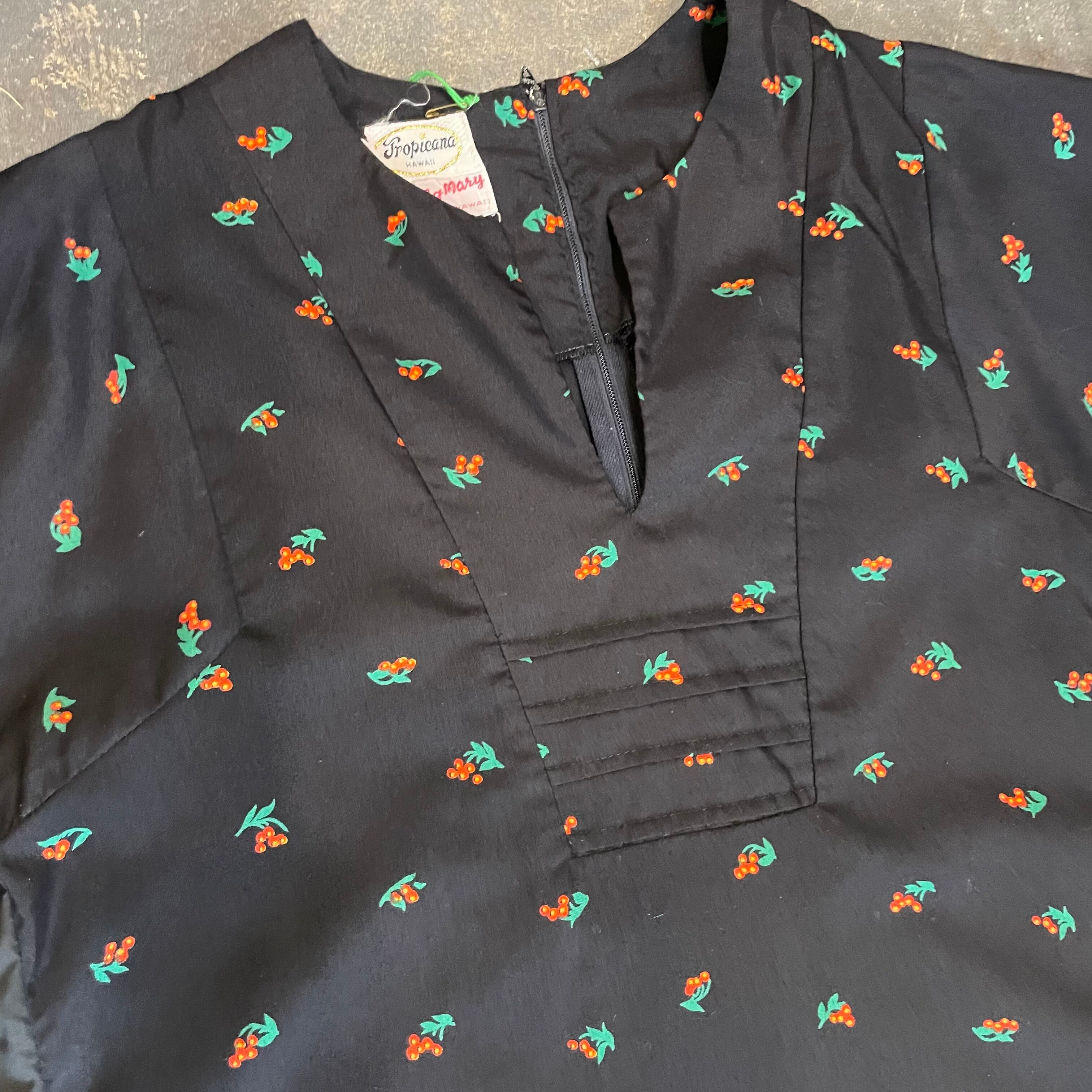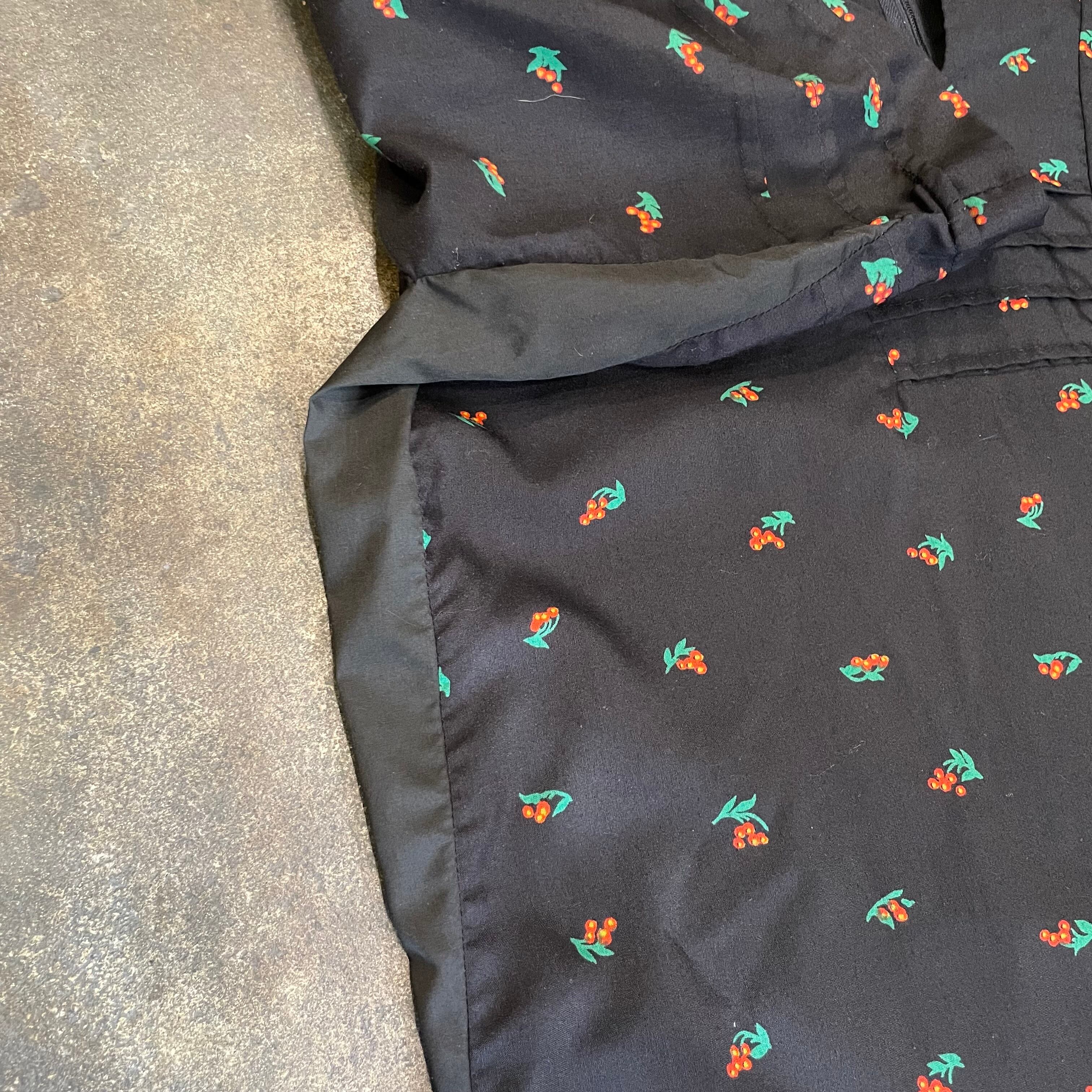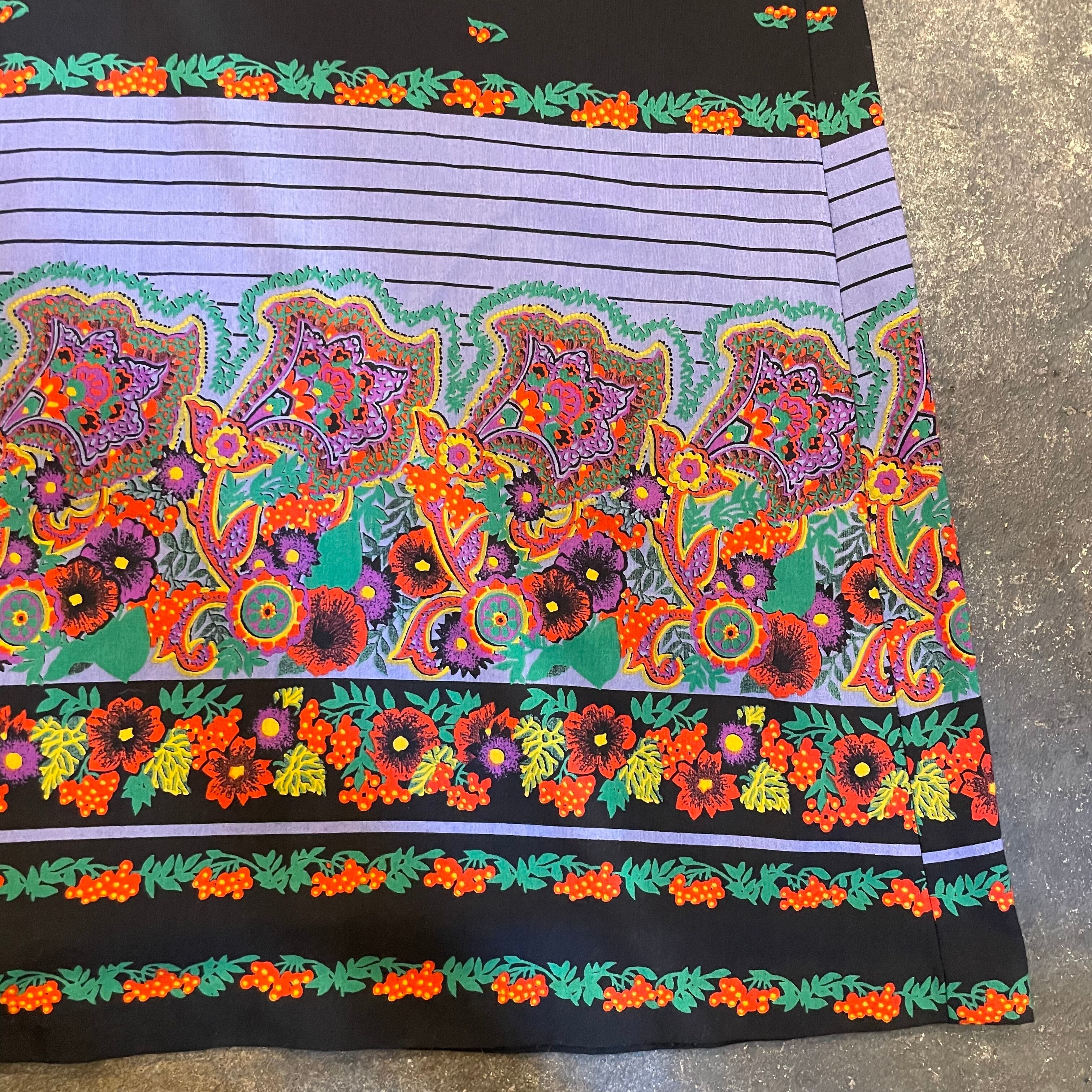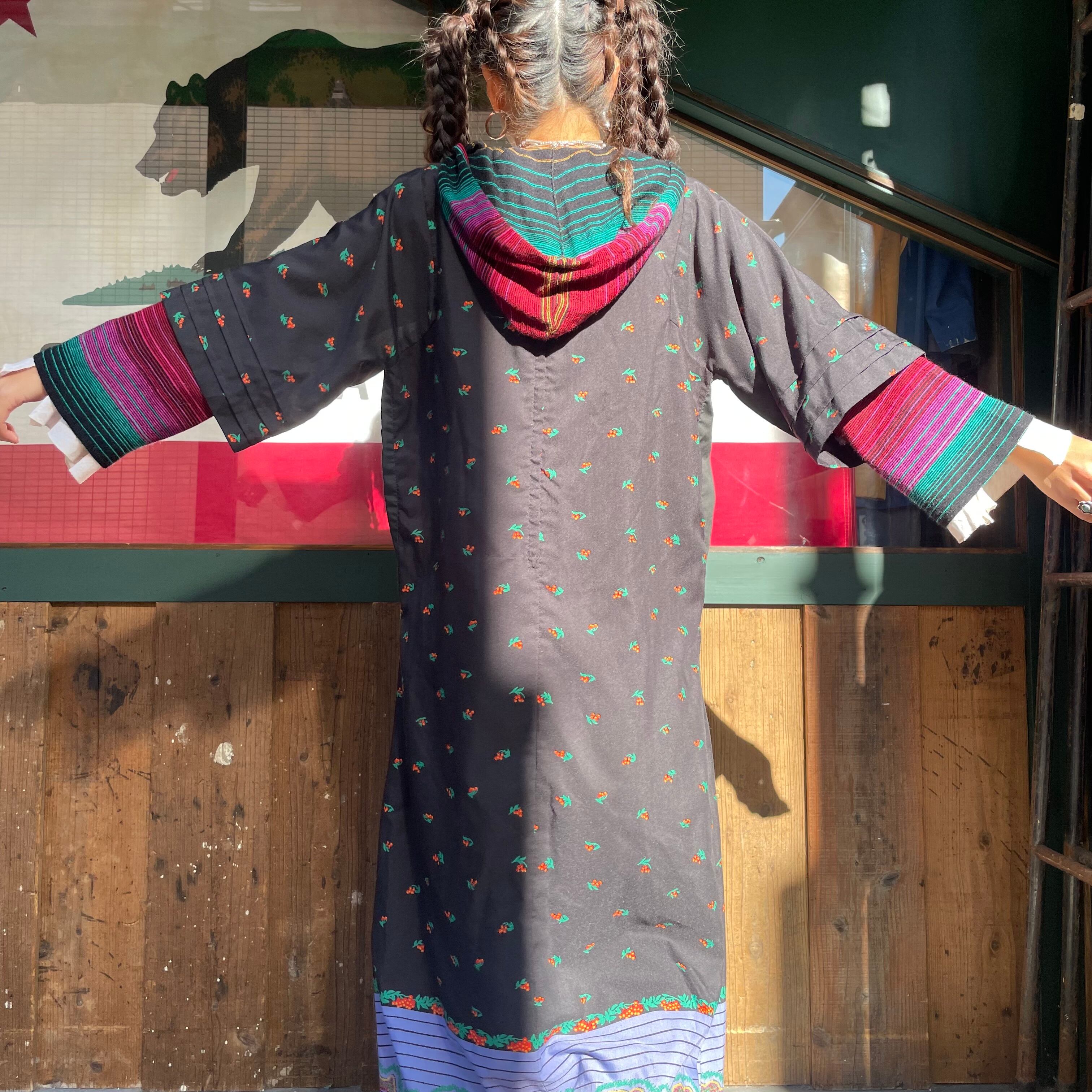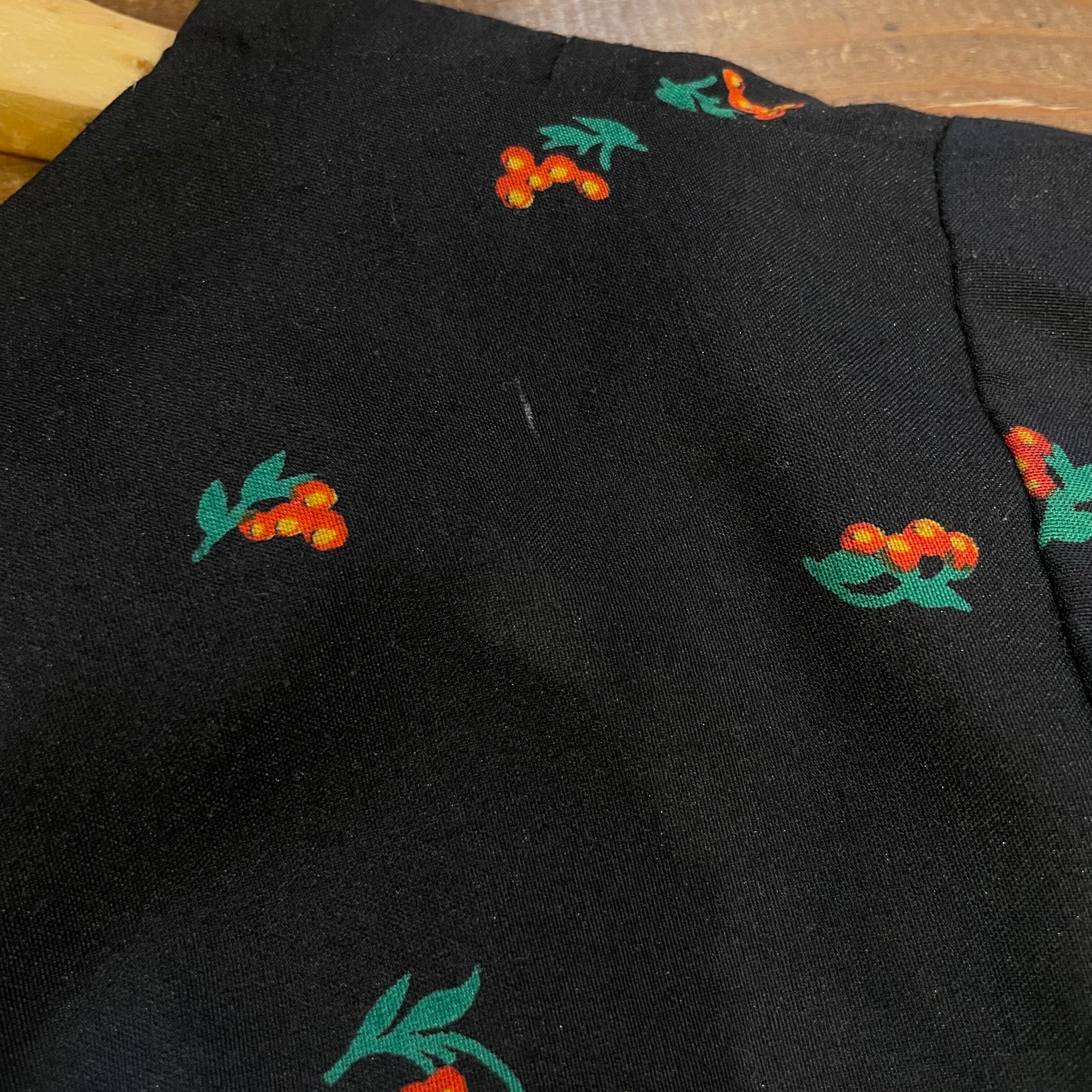 黒ベースに実のような小さい柄、そして裾のペイズリーっぽい雰囲気の花柄?がかわいいロングワンピースです。