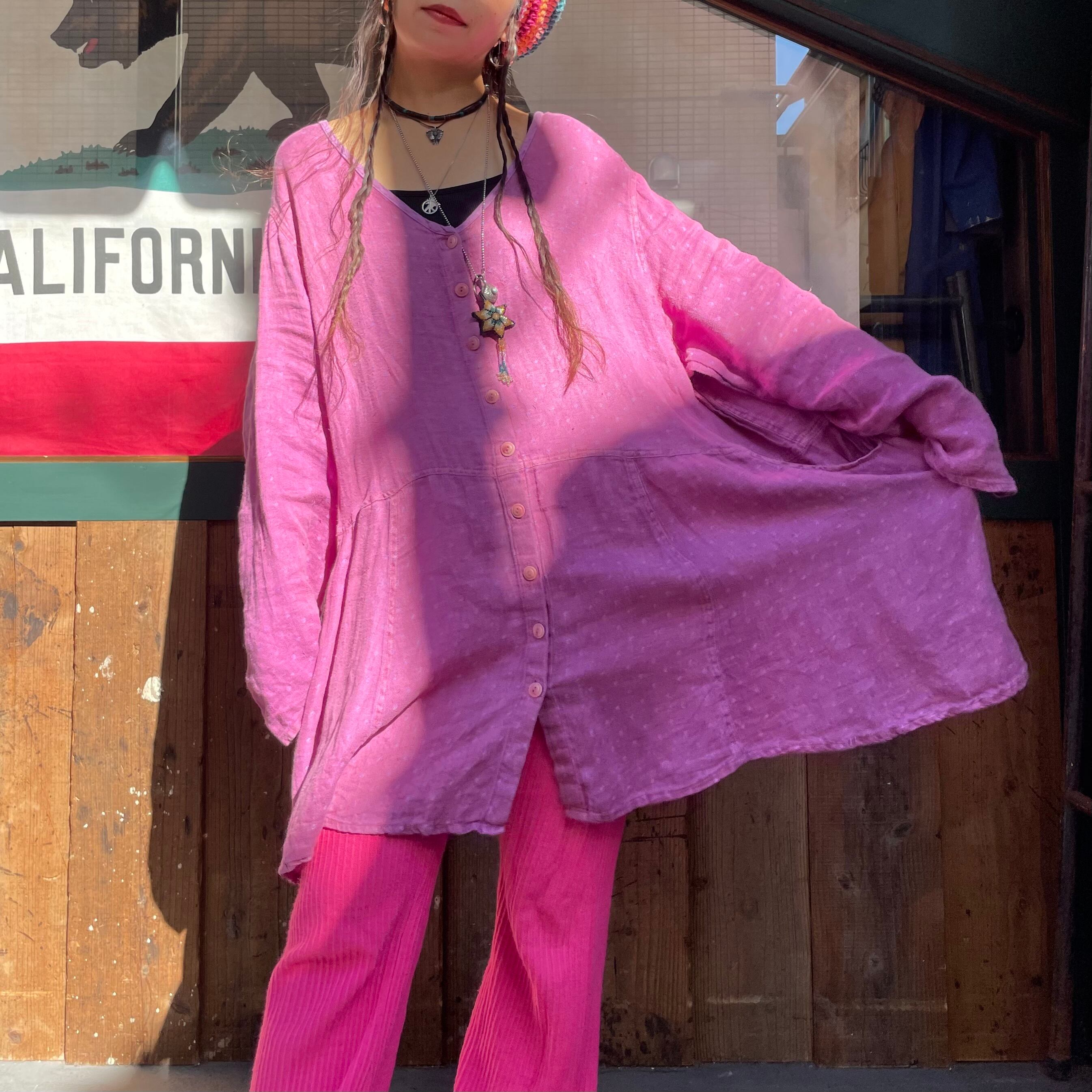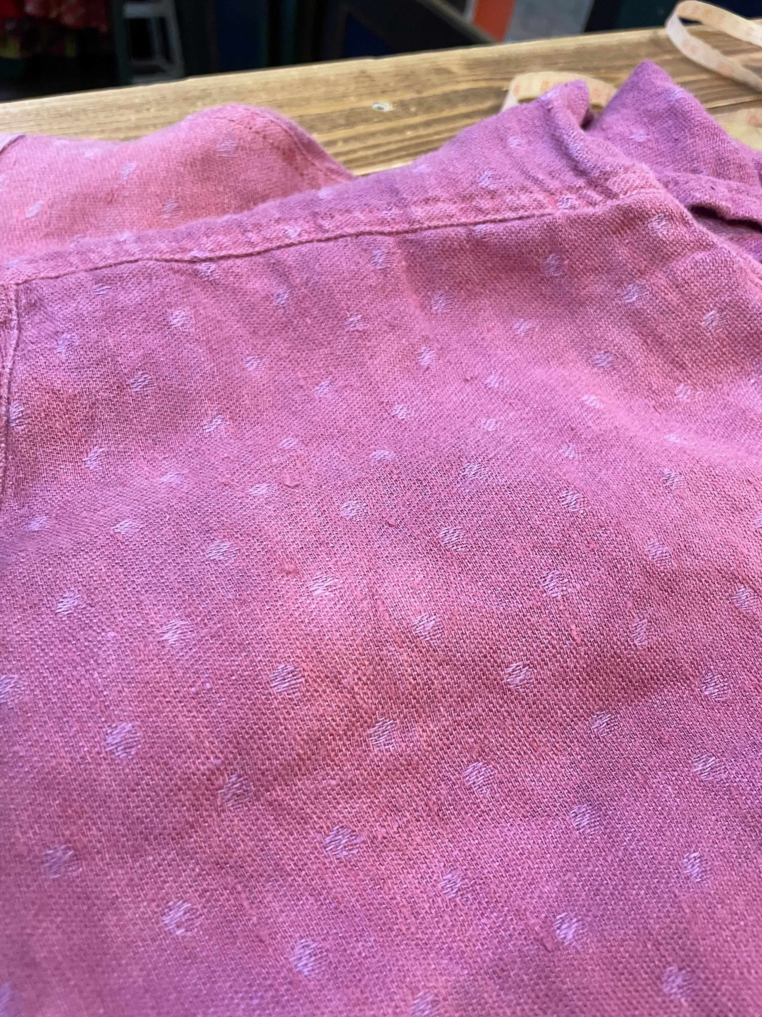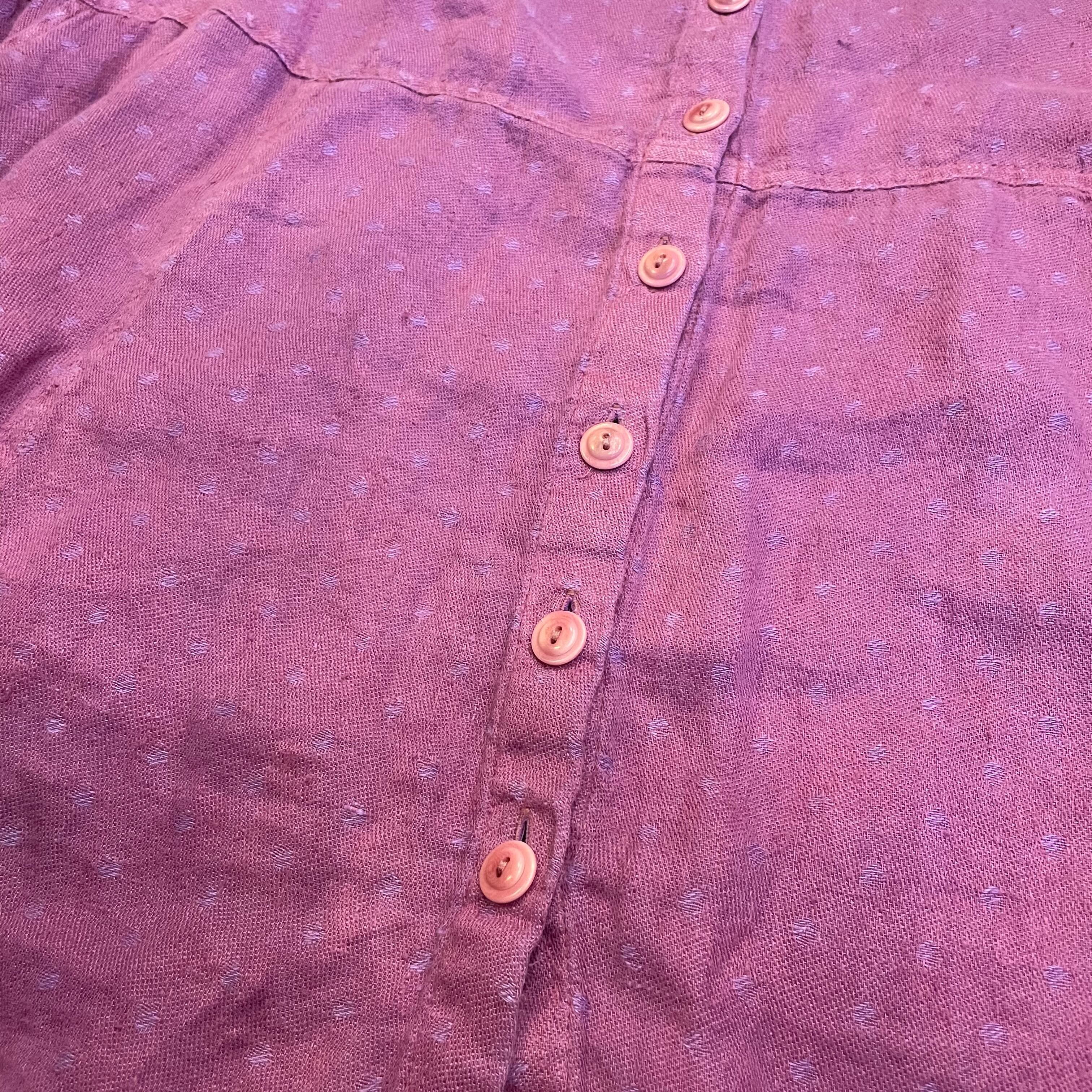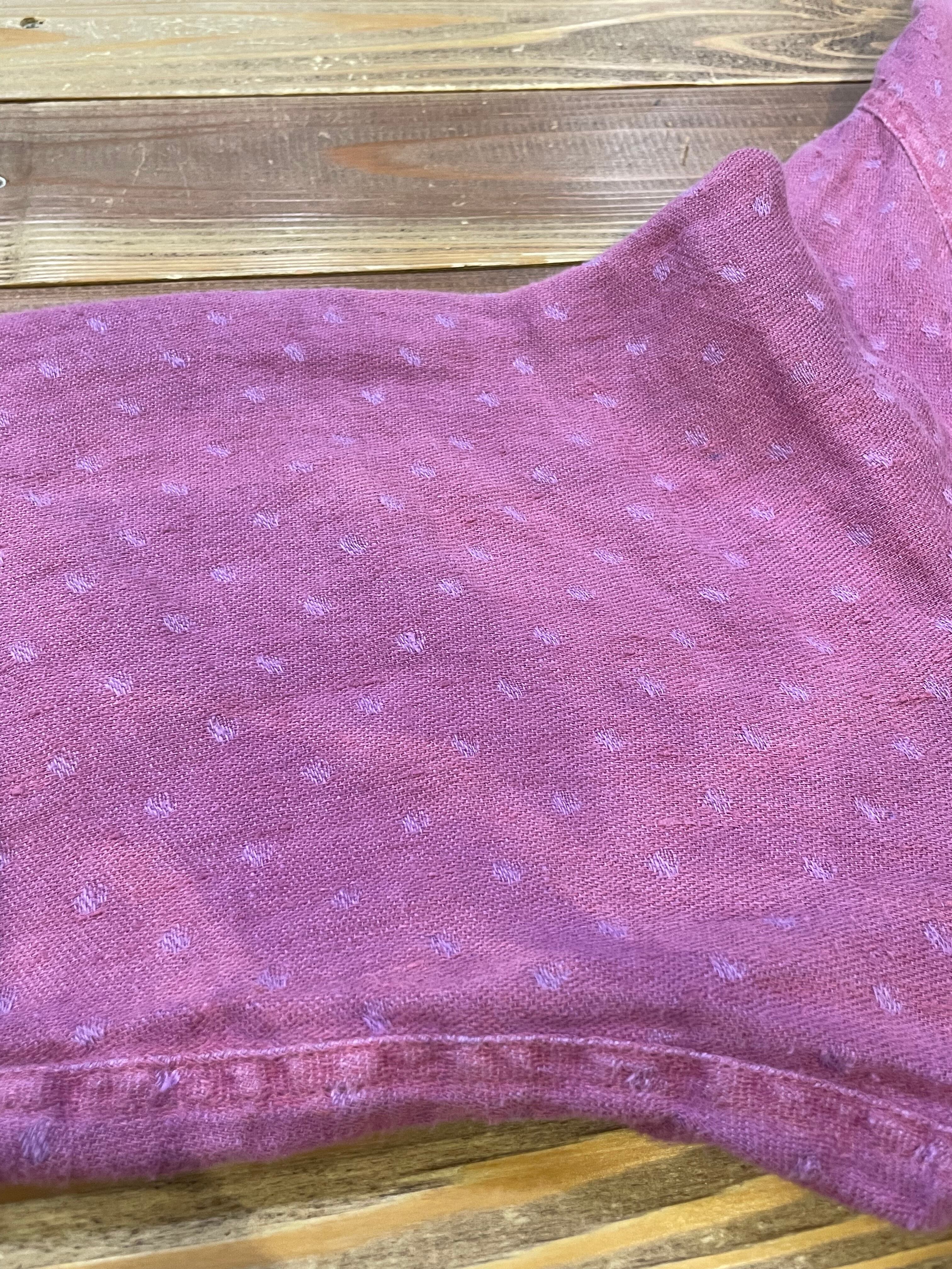 優しい紫色に織りでドットのようになっていてかわいい、リネン素材のワンピースです。リネンの優しい肌触りが気持ち良いですし、パサっと軽い感じですので真夏にも着ていただけそうな一枚です。