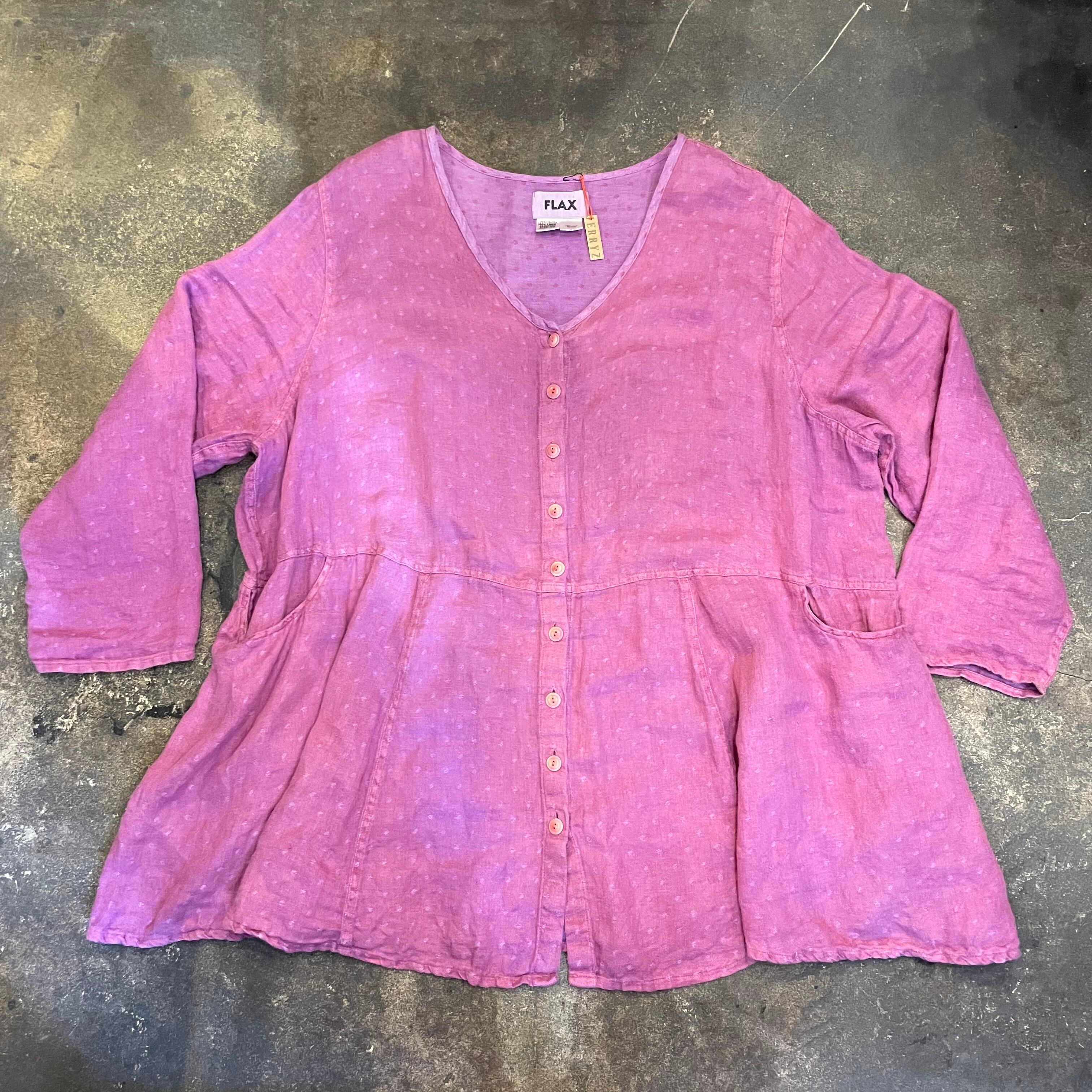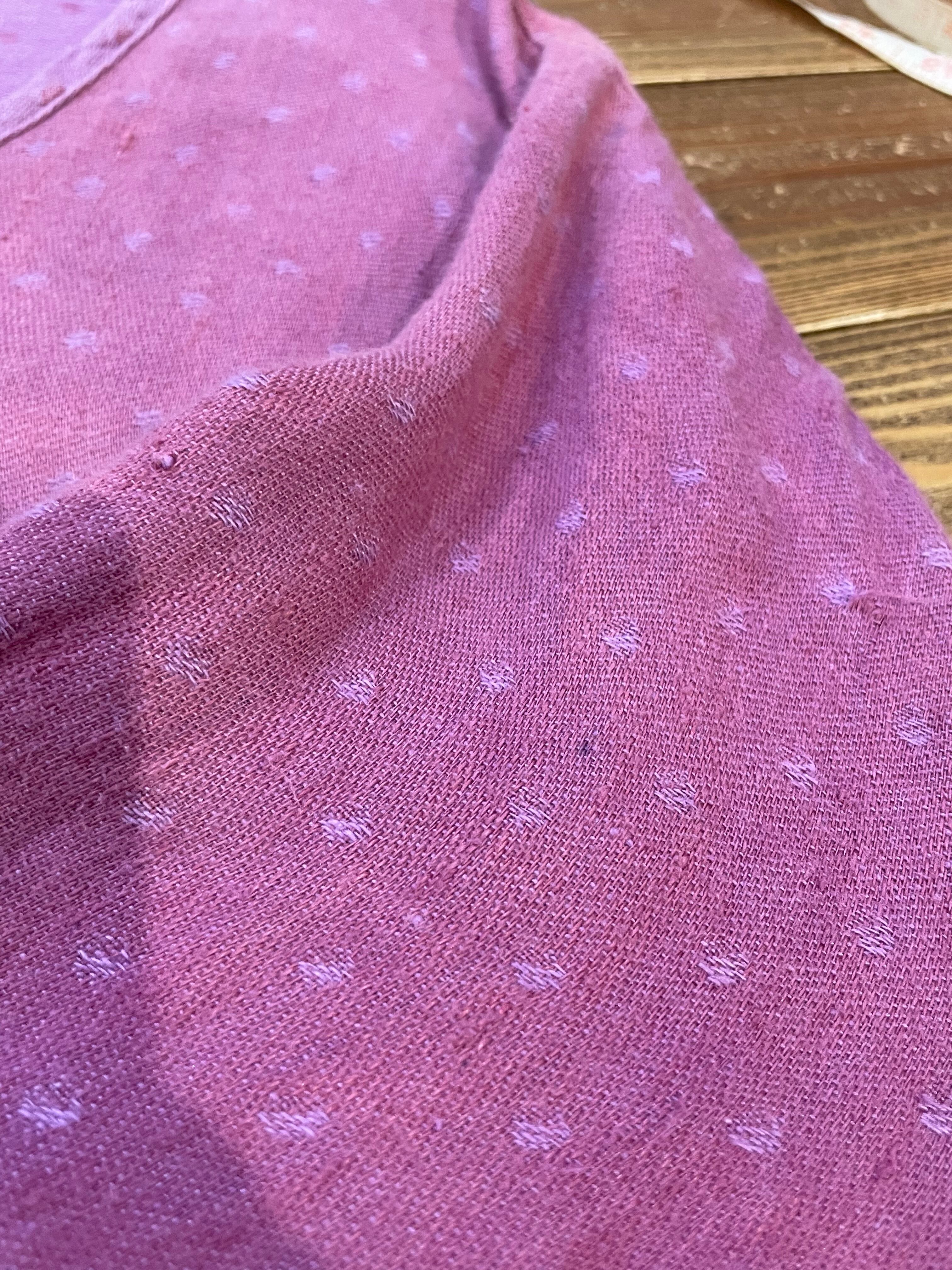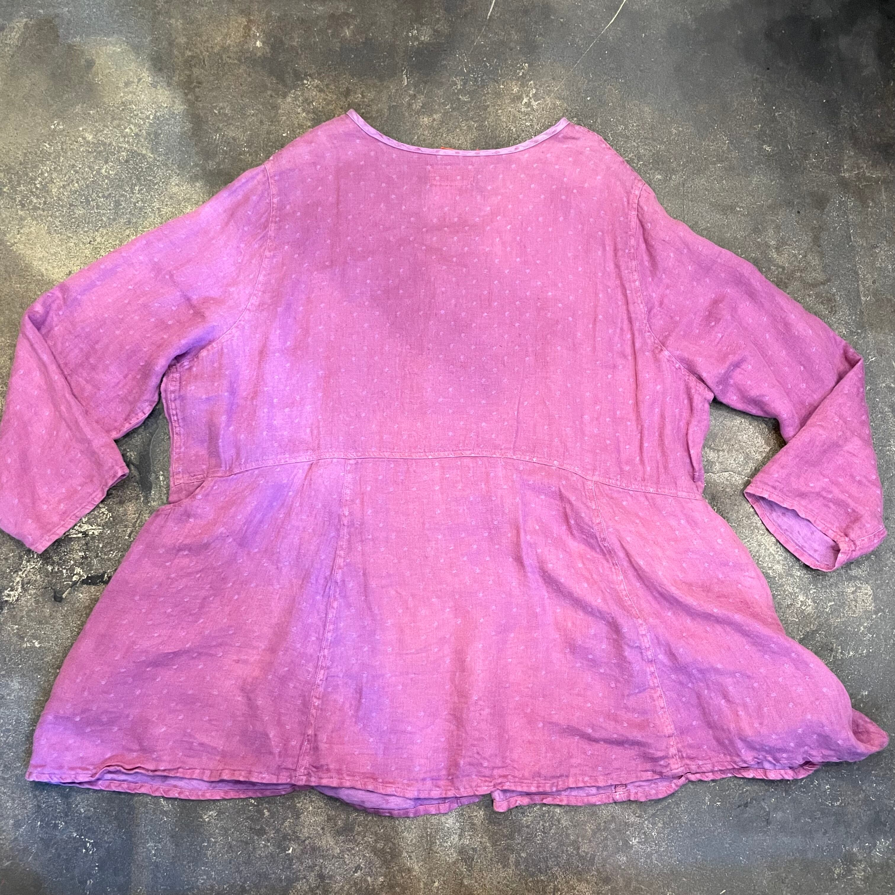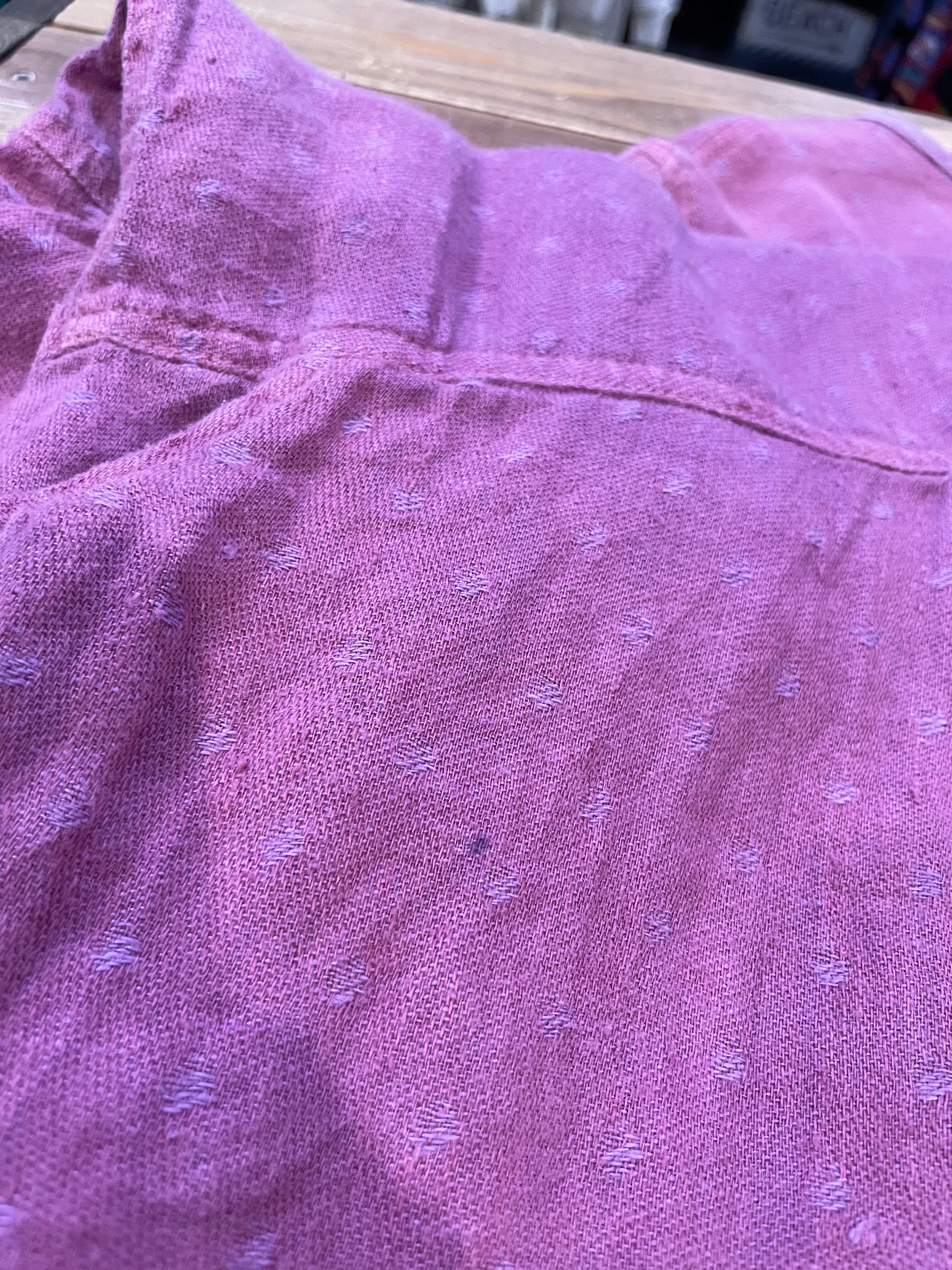 優しい紫色に織りでドットのようになっていてかわいい、リネン素材のワンピースです。リネンの優しい肌触りが気持ち良いですし、パサっと軽い感じですので真夏にも着ていただけそうな一枚です。