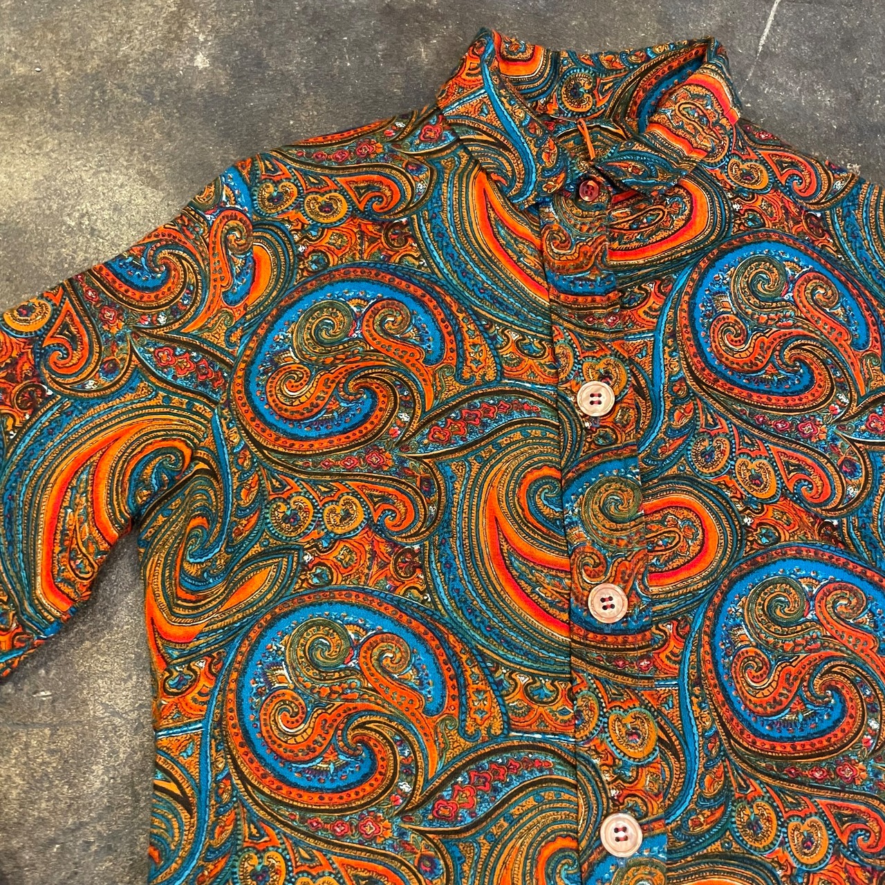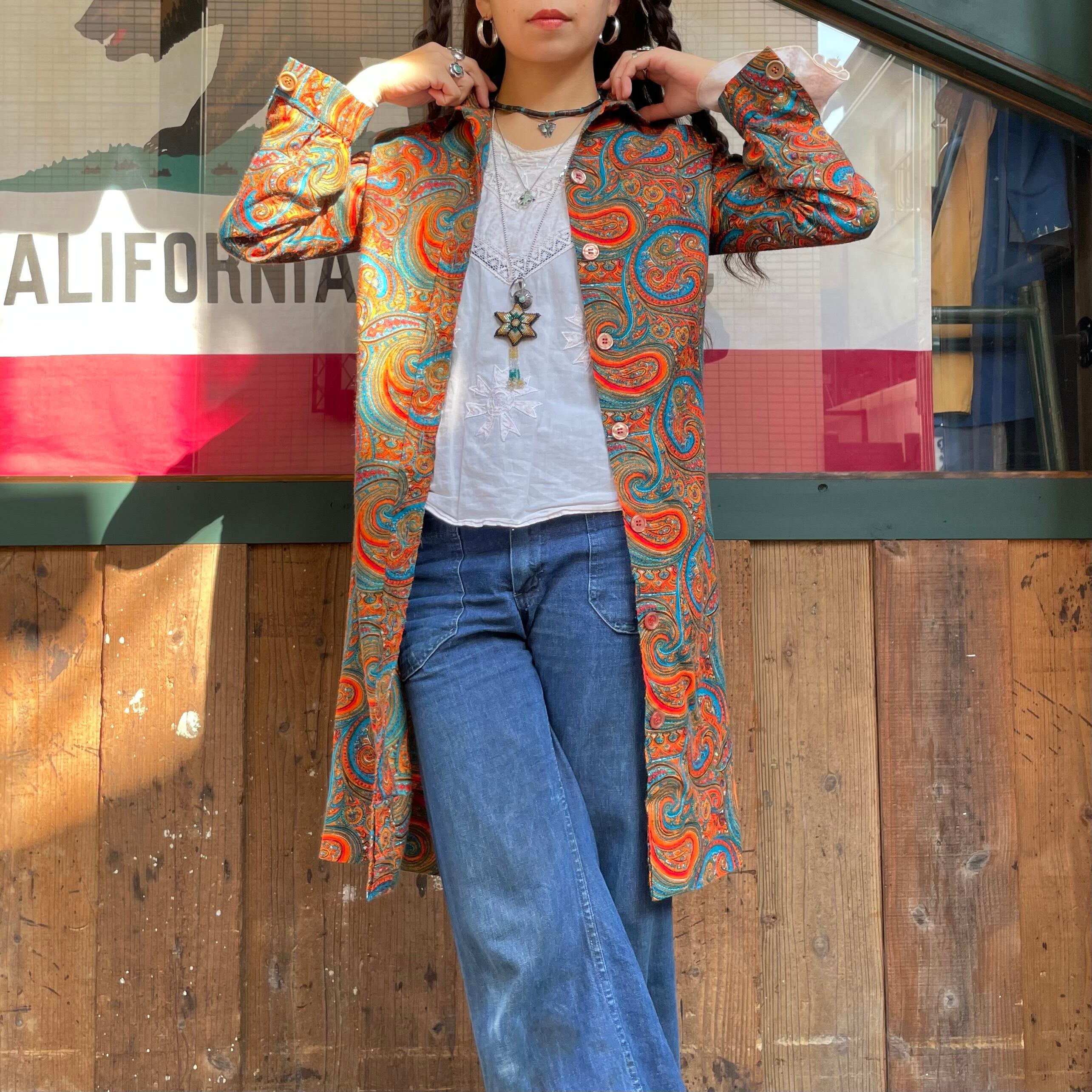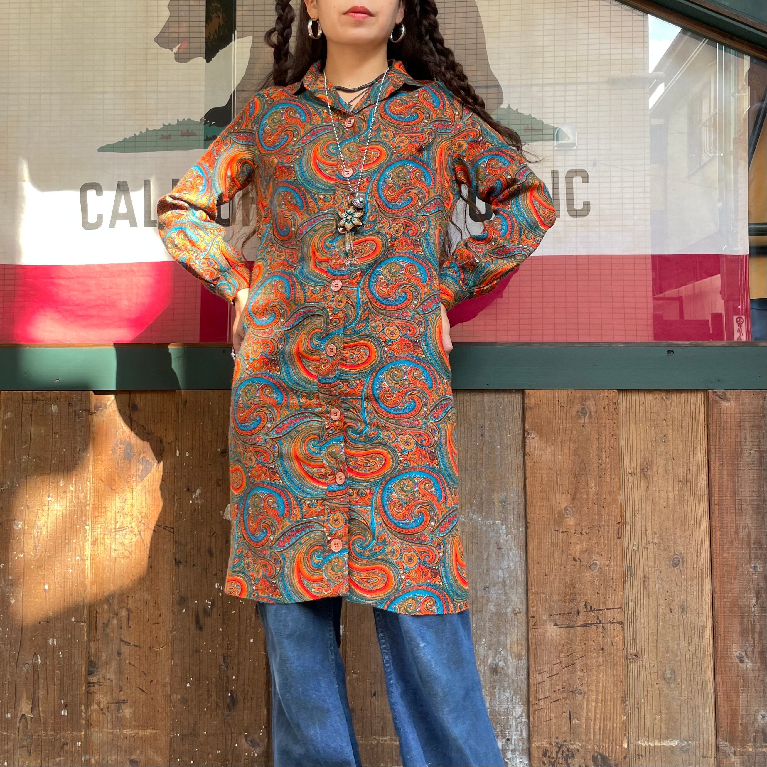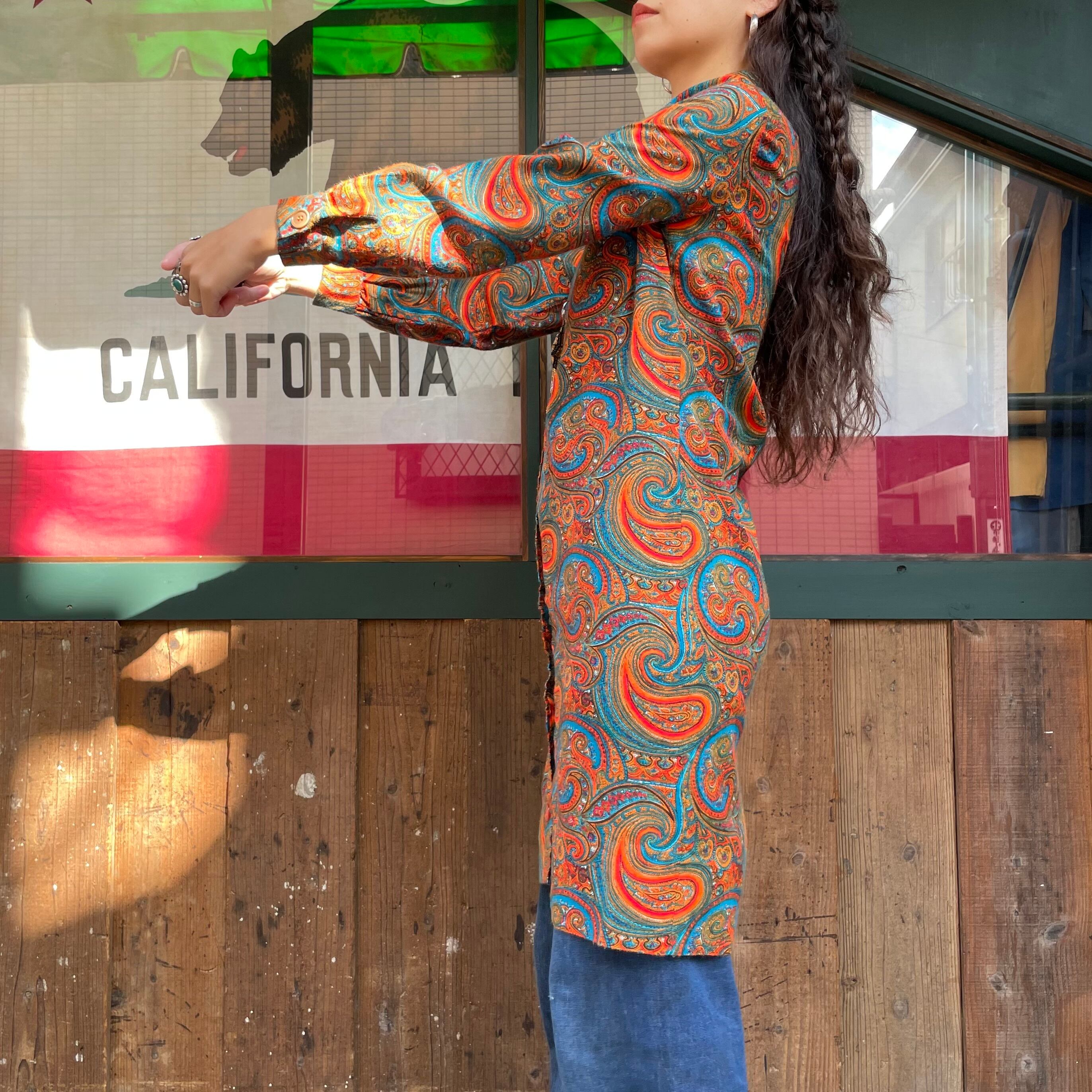 ターコイズブルーと太陽のようなオレンジの色味がとても素敵なペイズリー柄のワンピースです。