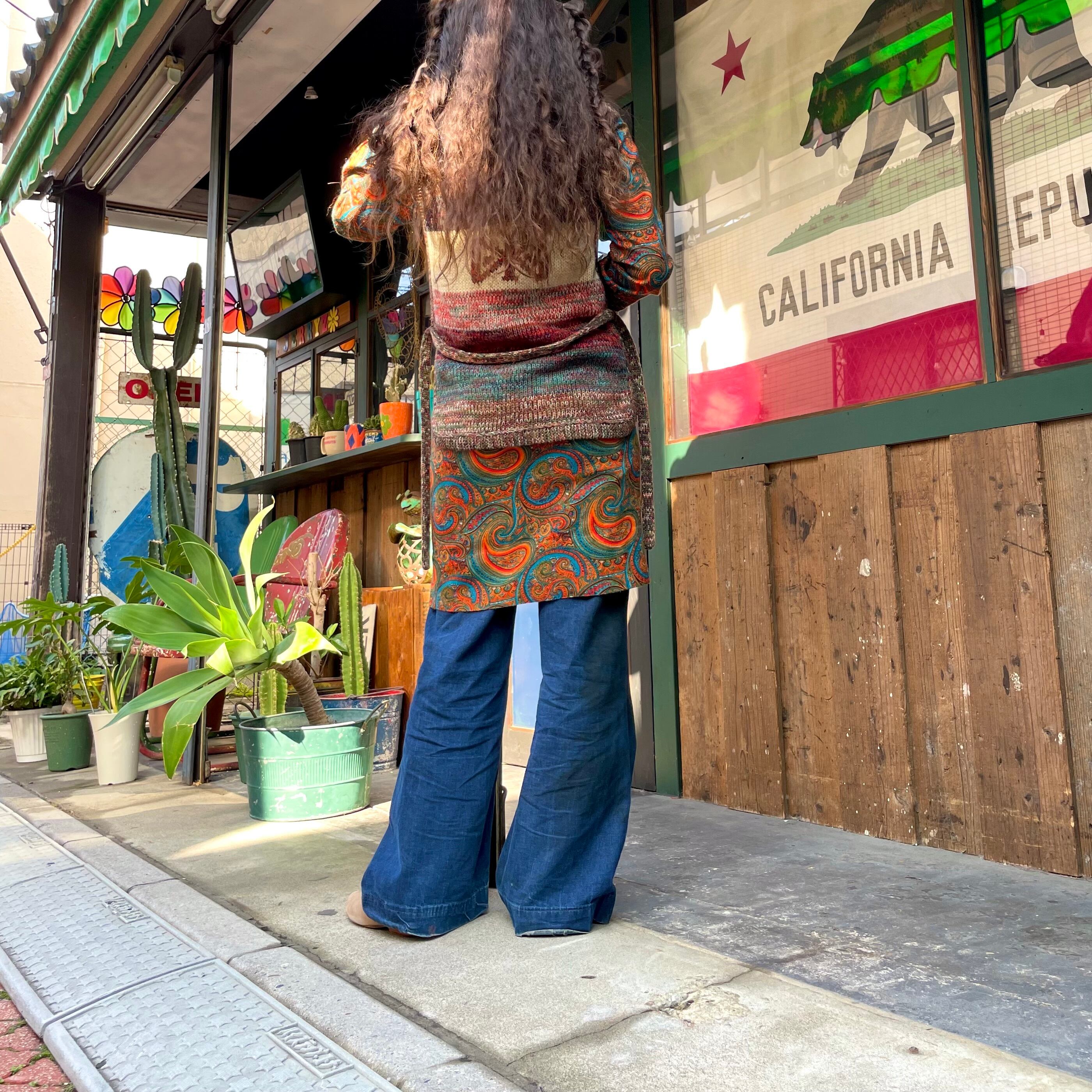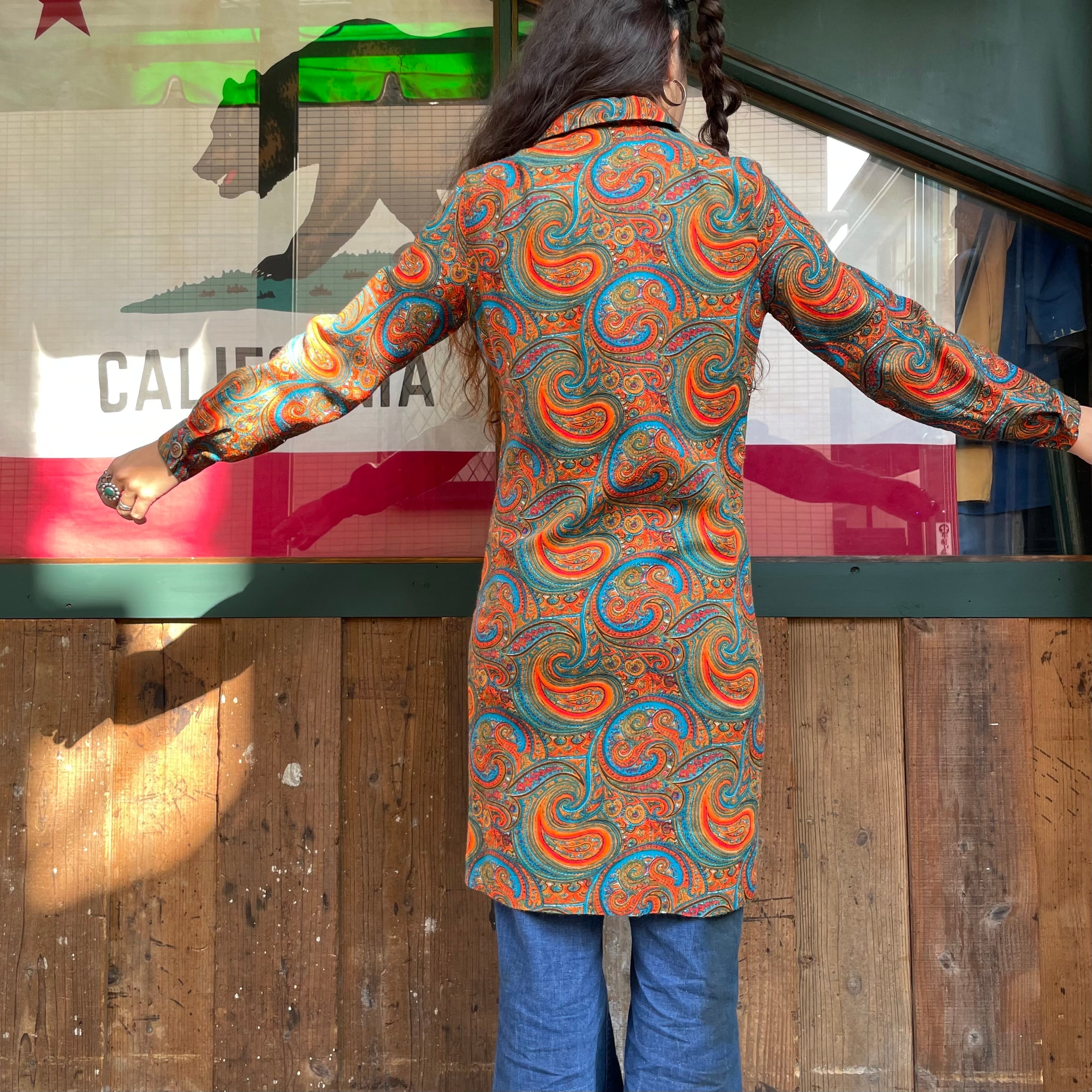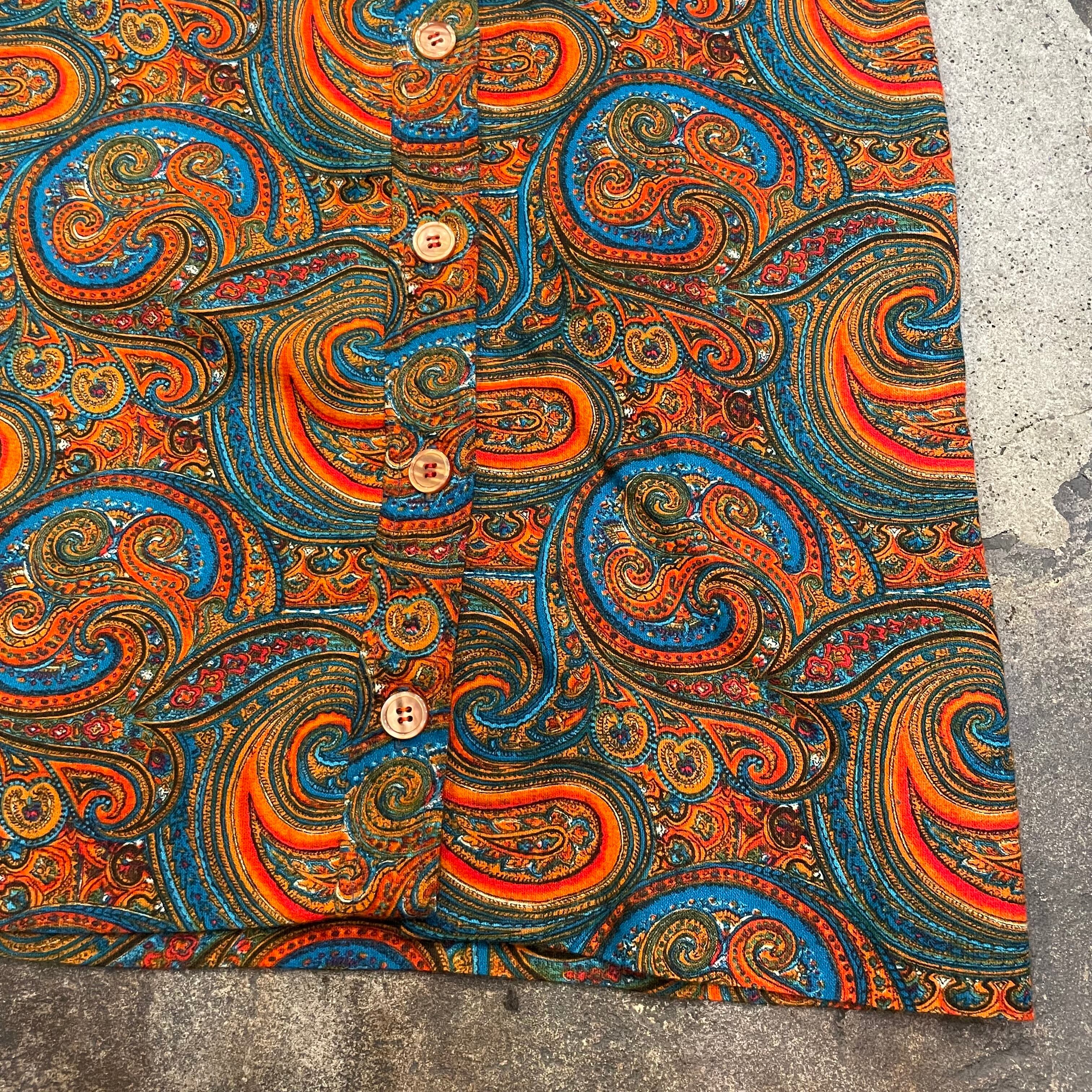 ターコイズブルーと太陽のようなオレンジの色味がとても素敵なペイズリー柄のワンピースです。