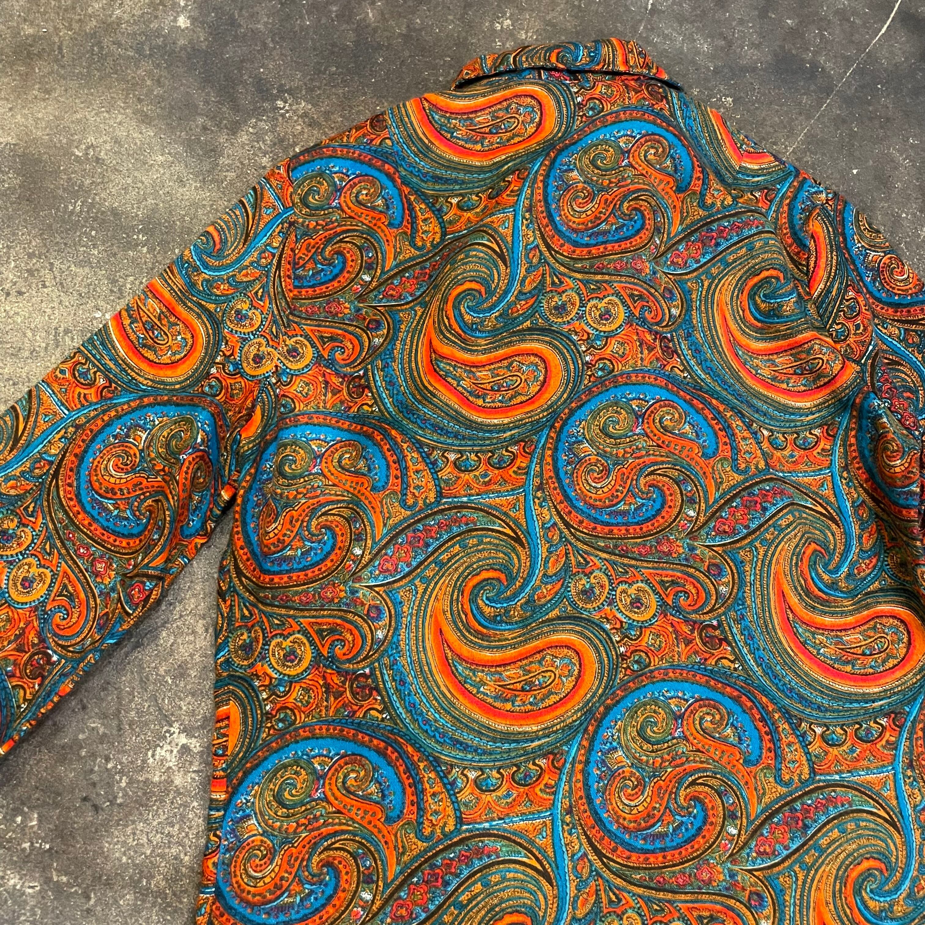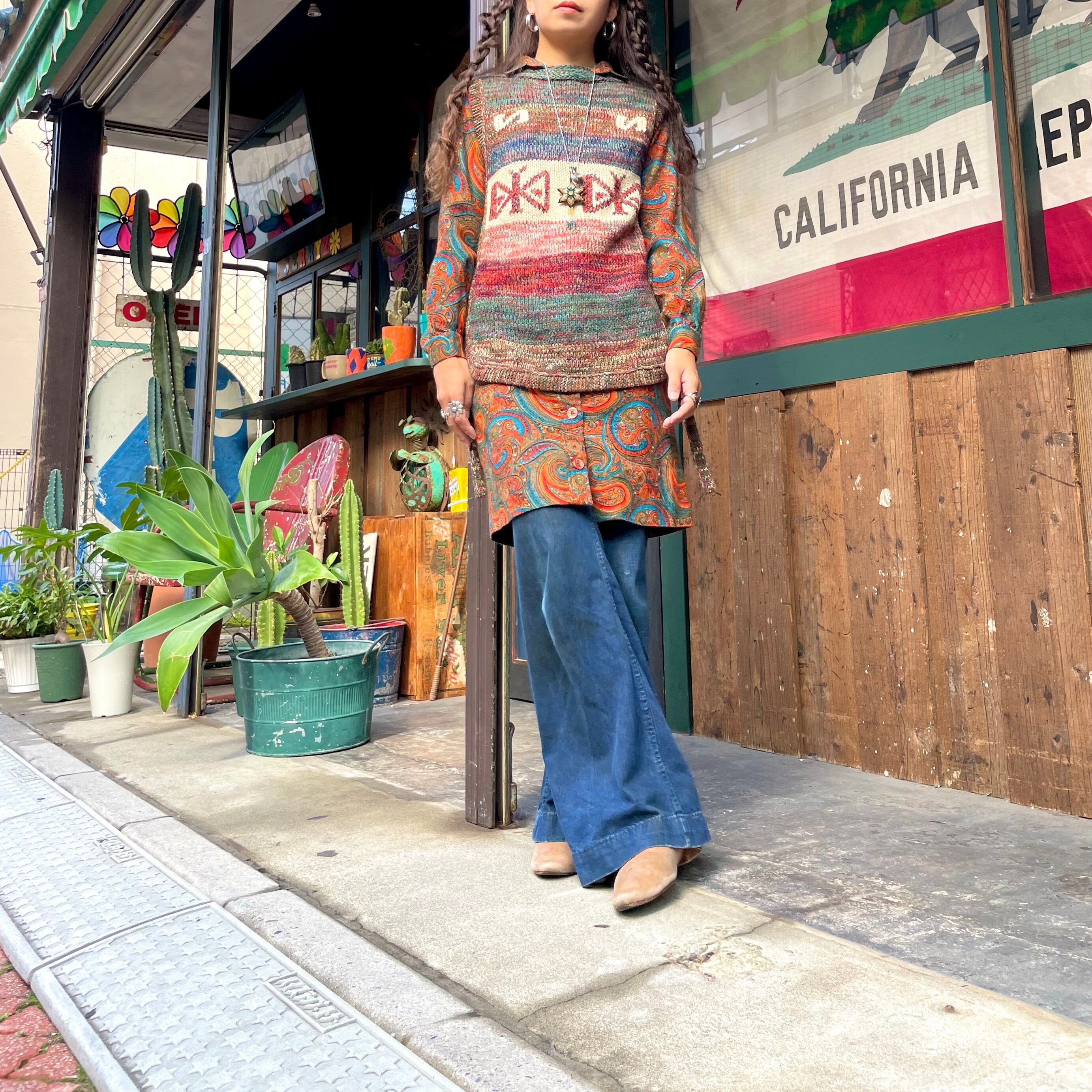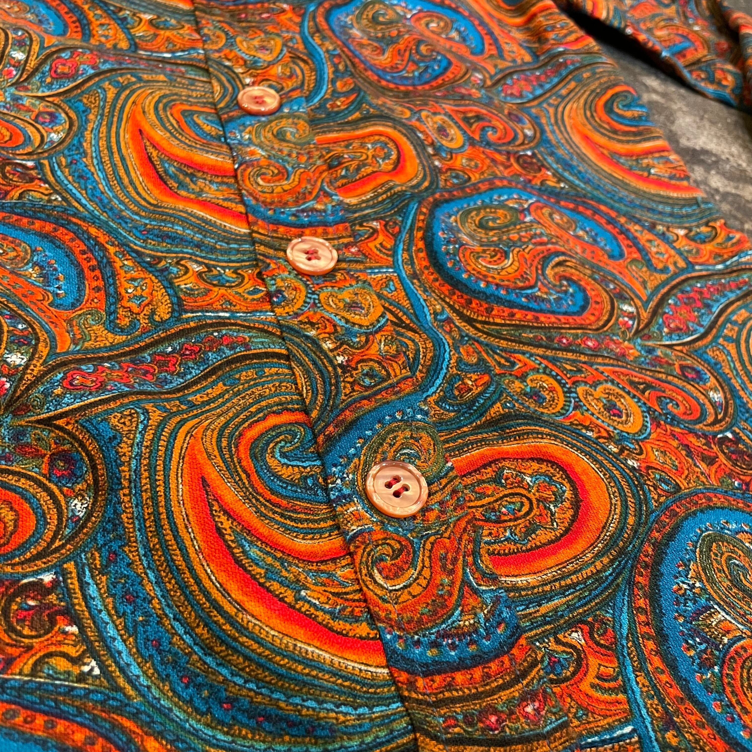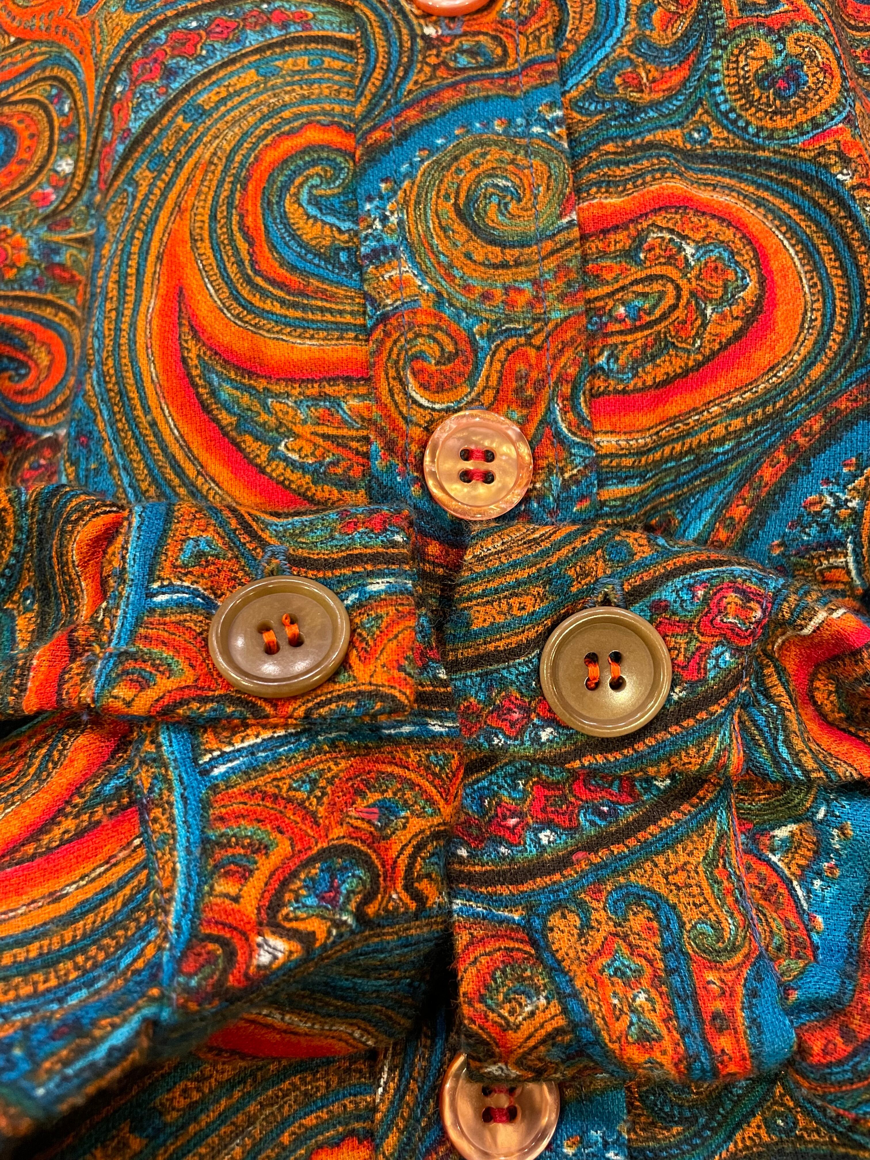ターコイズブルーと太陽のようなオレンジの色味がとても素敵なペイズリー柄のワンピースです。