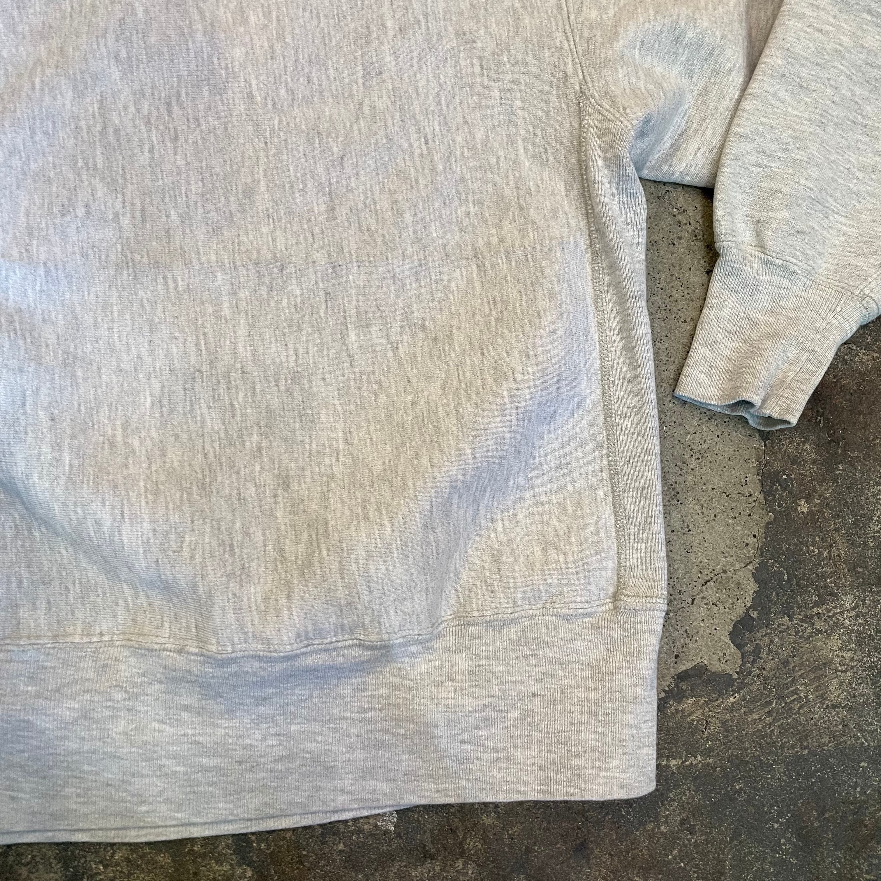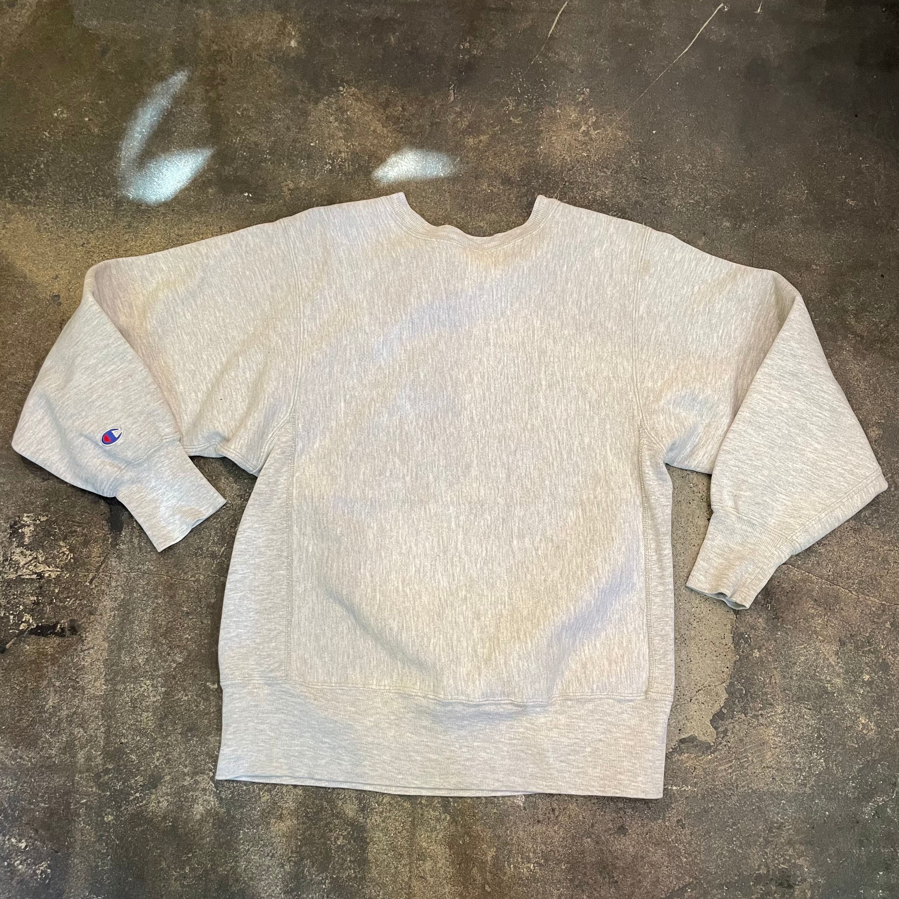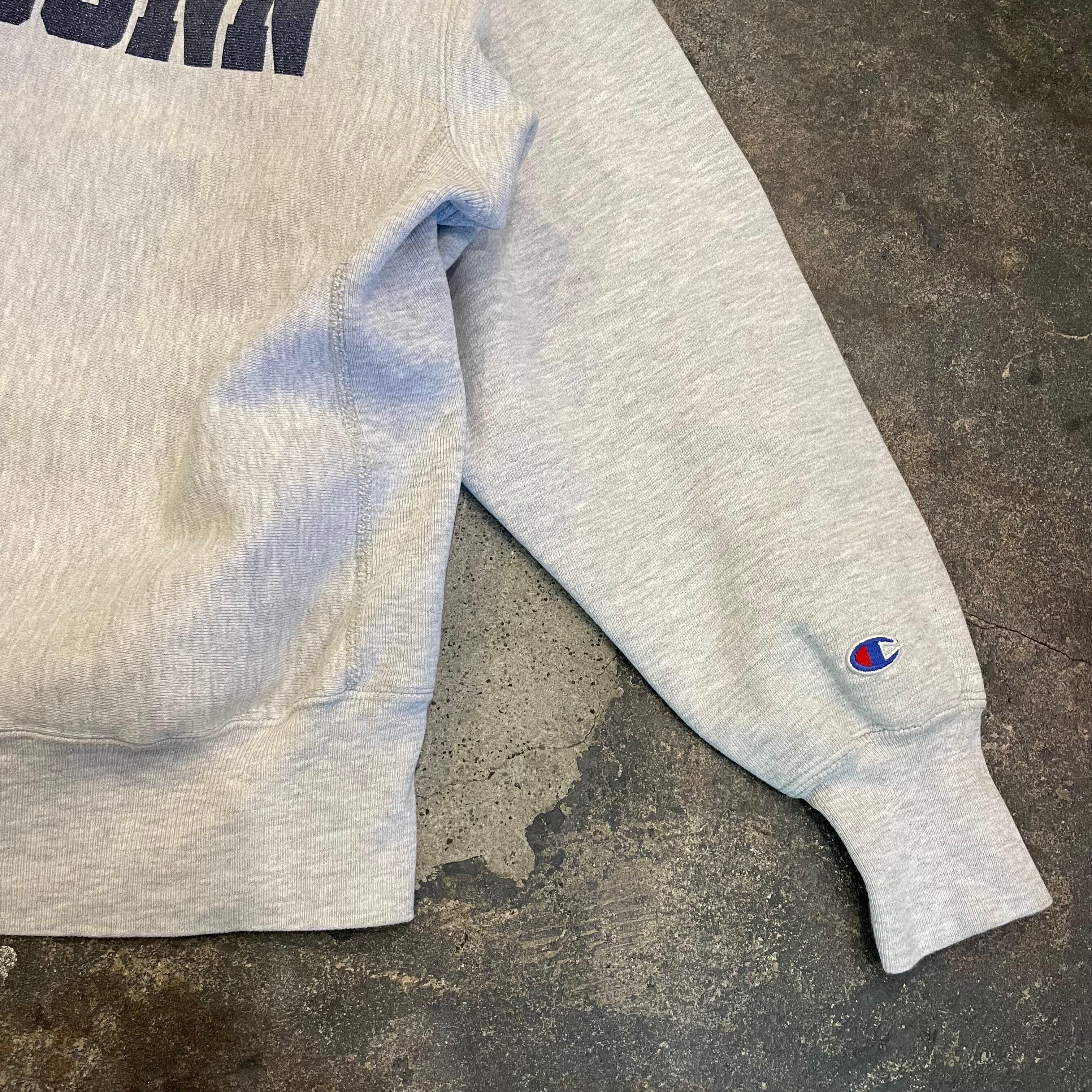 90年代USA製Championのリバースウィーブです。グレーボディにネイビーのプリントがシンプルで使いやすそうな一枚です。