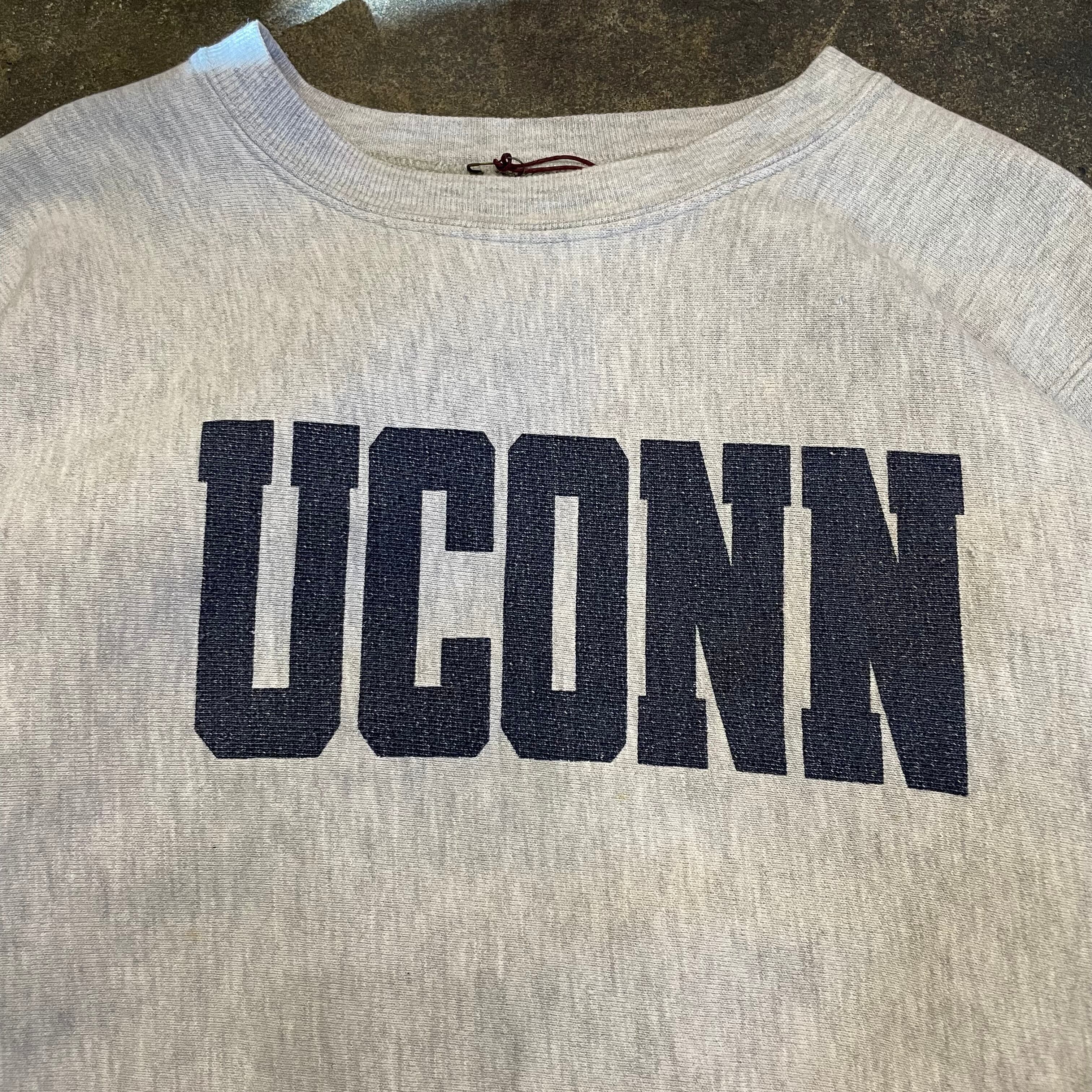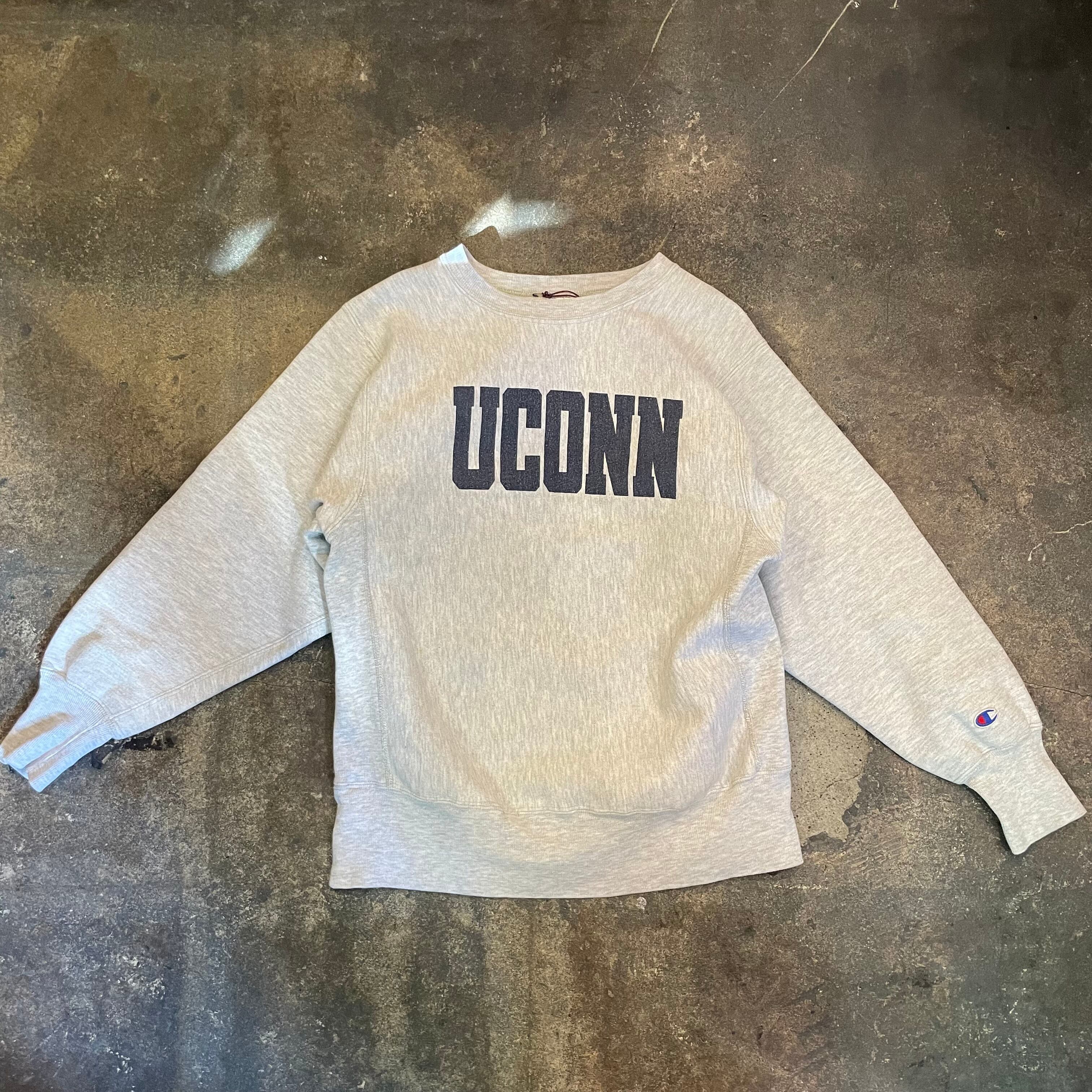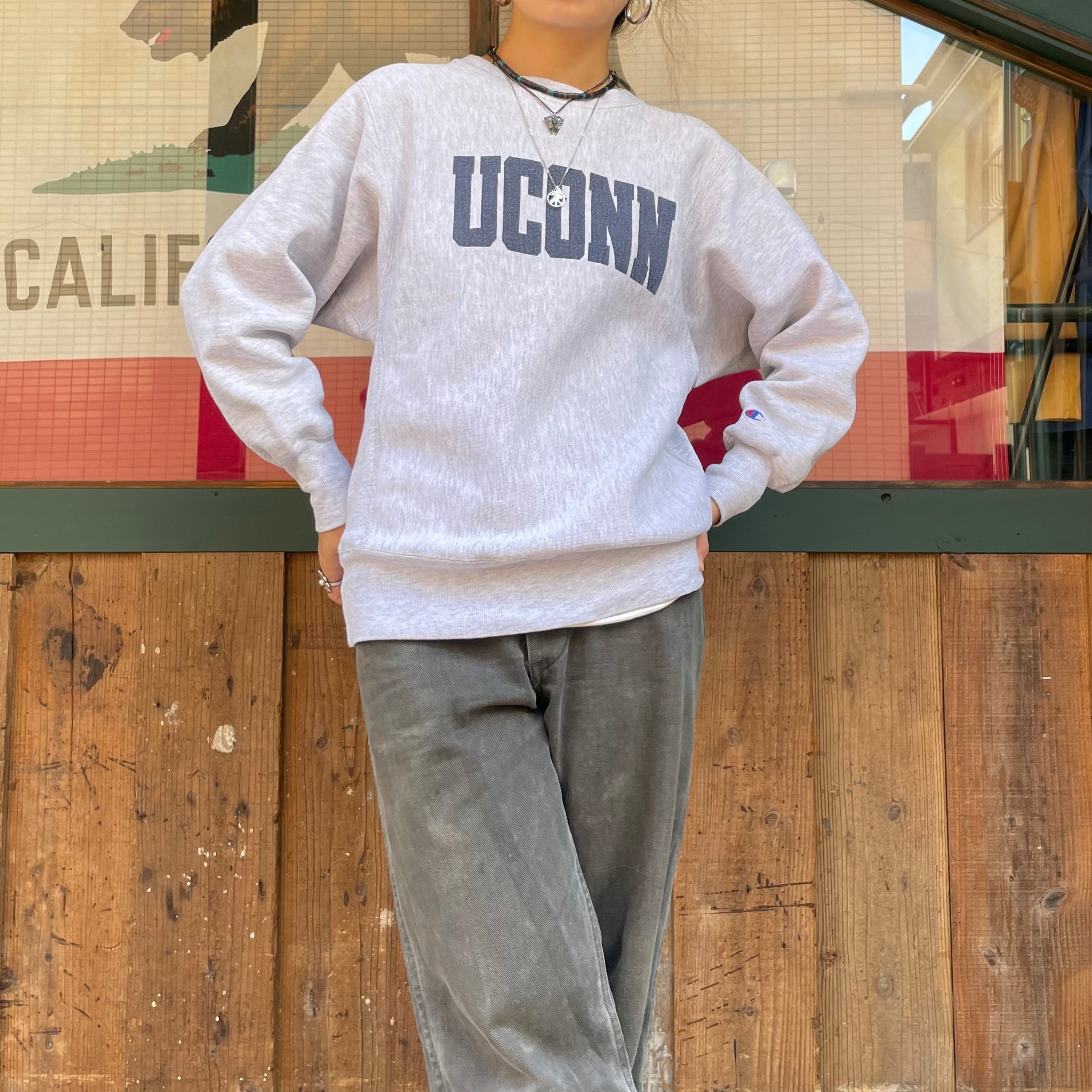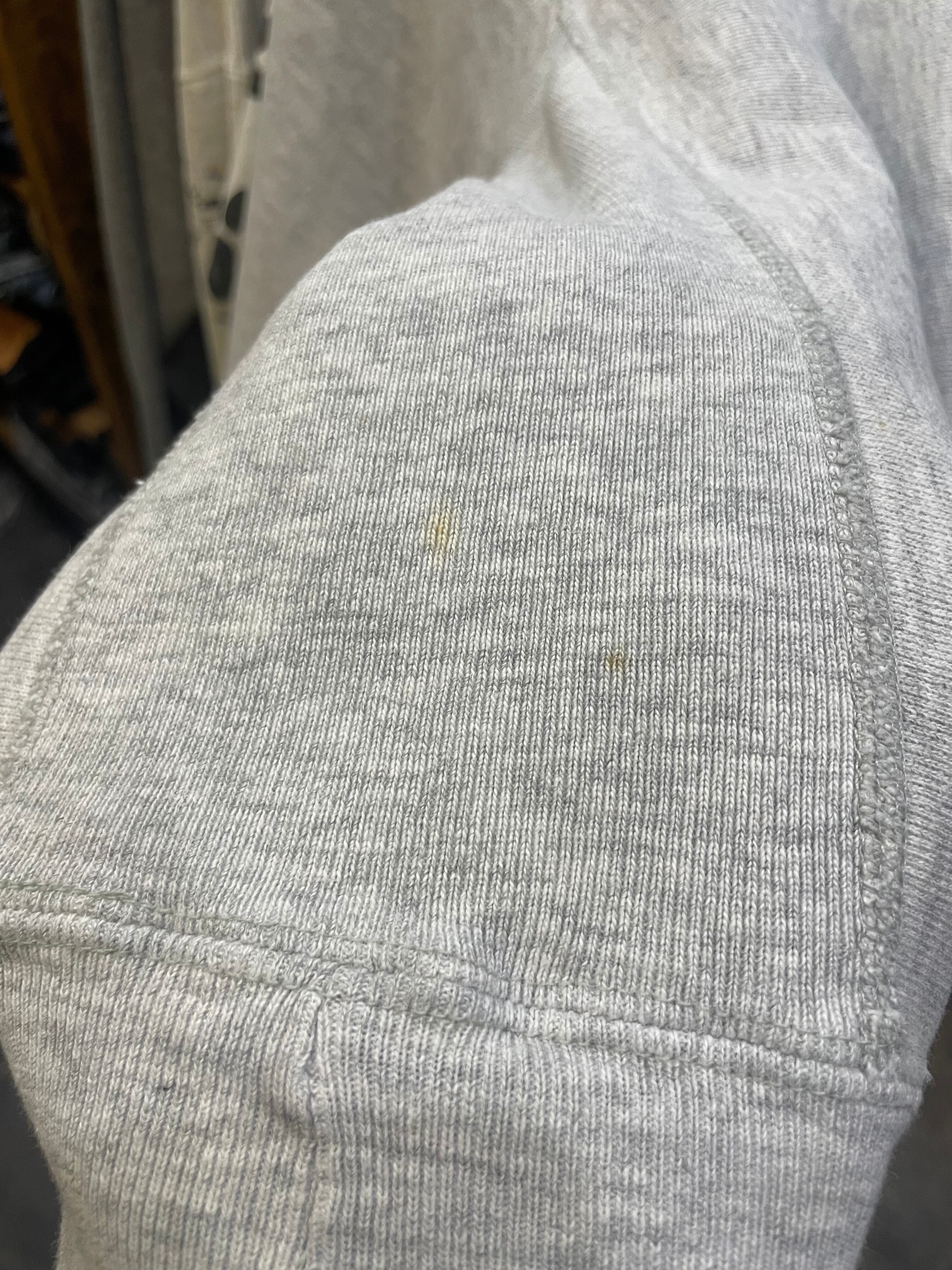 90年代USA製Championのリバースウィーブです。グレーボディにネイビーのプリントがシンプルで使いやすそうな一枚です。