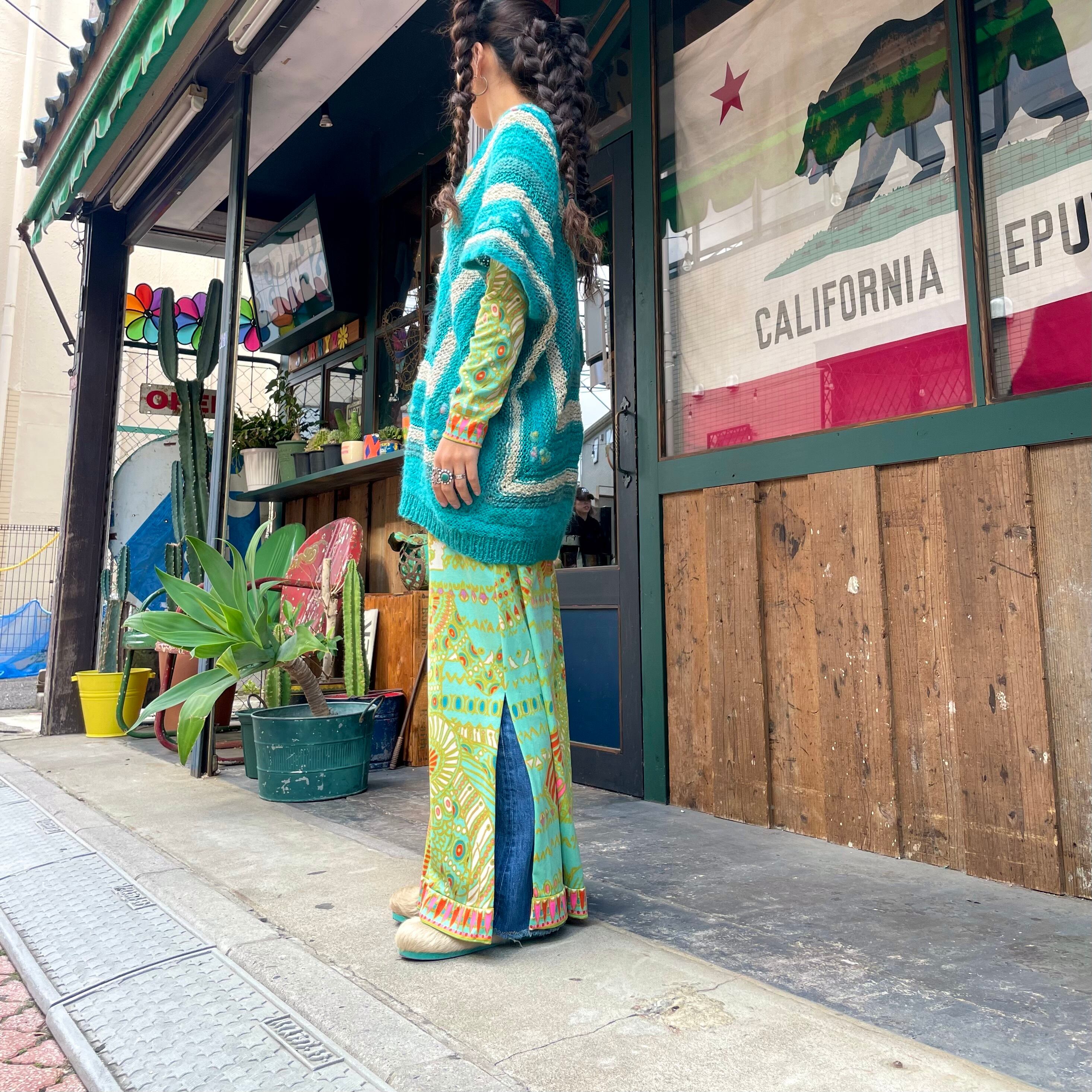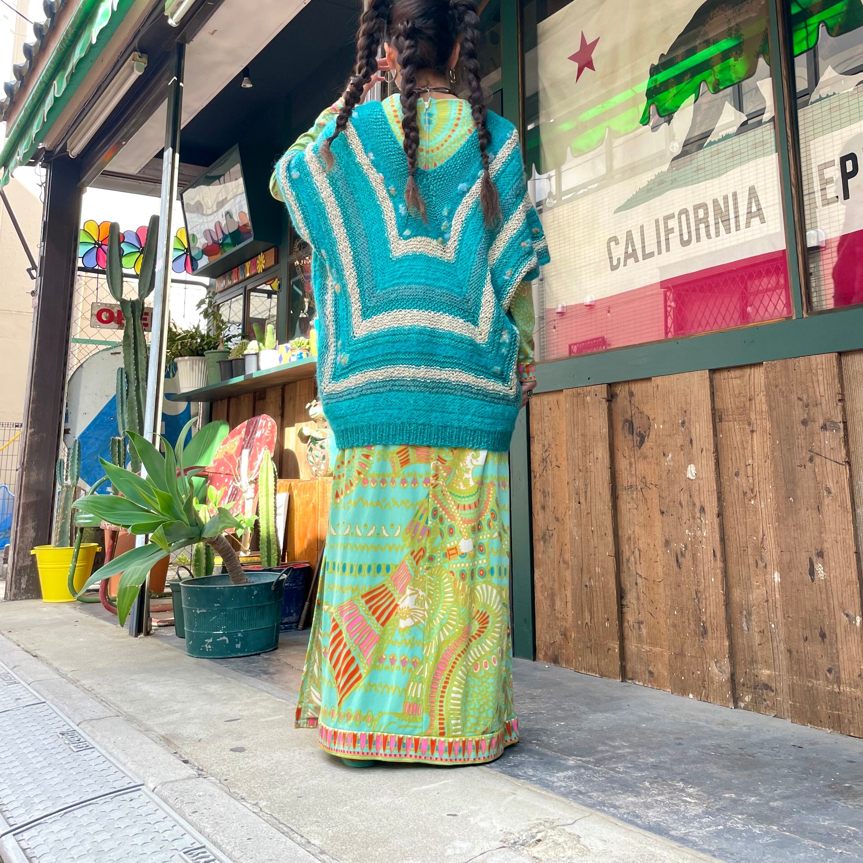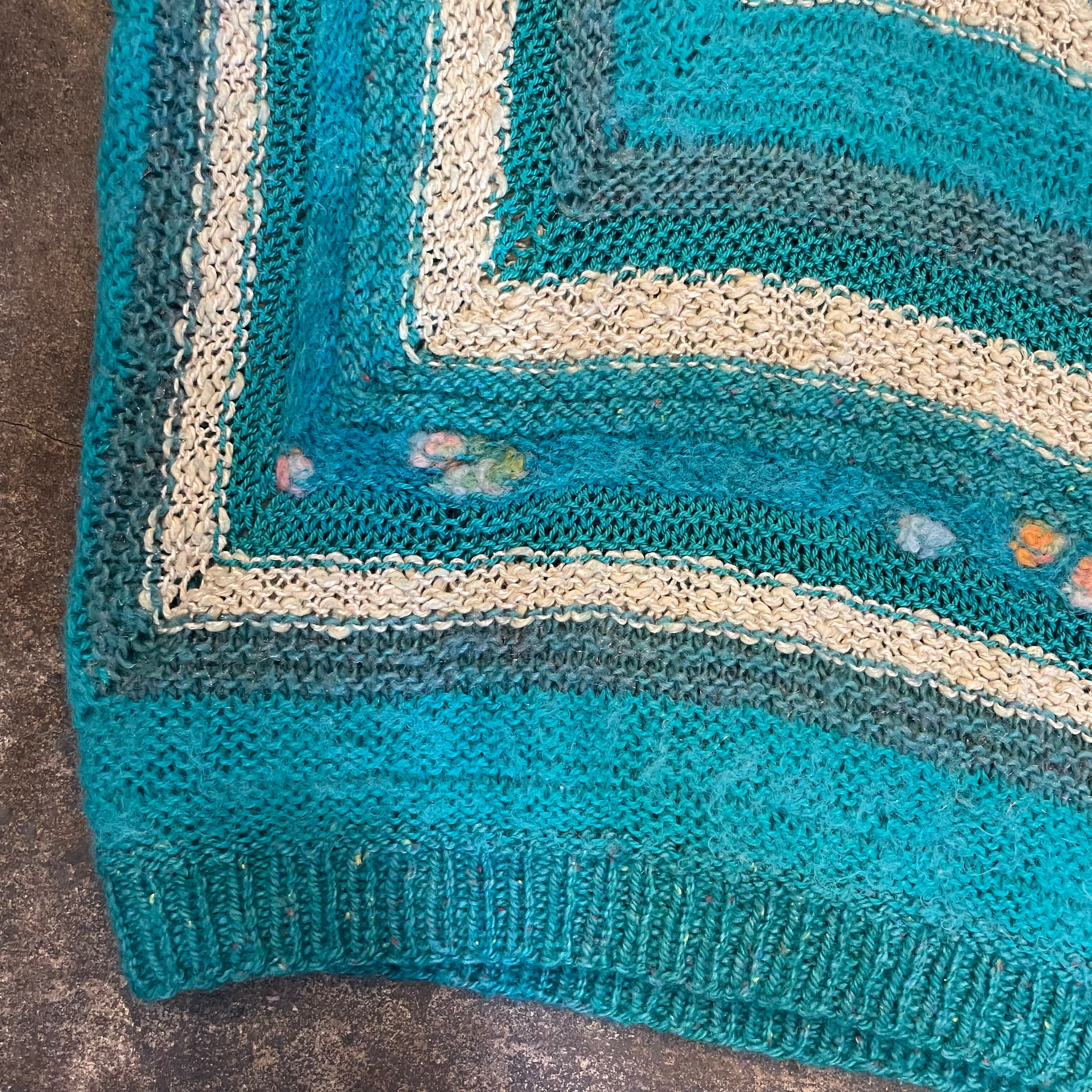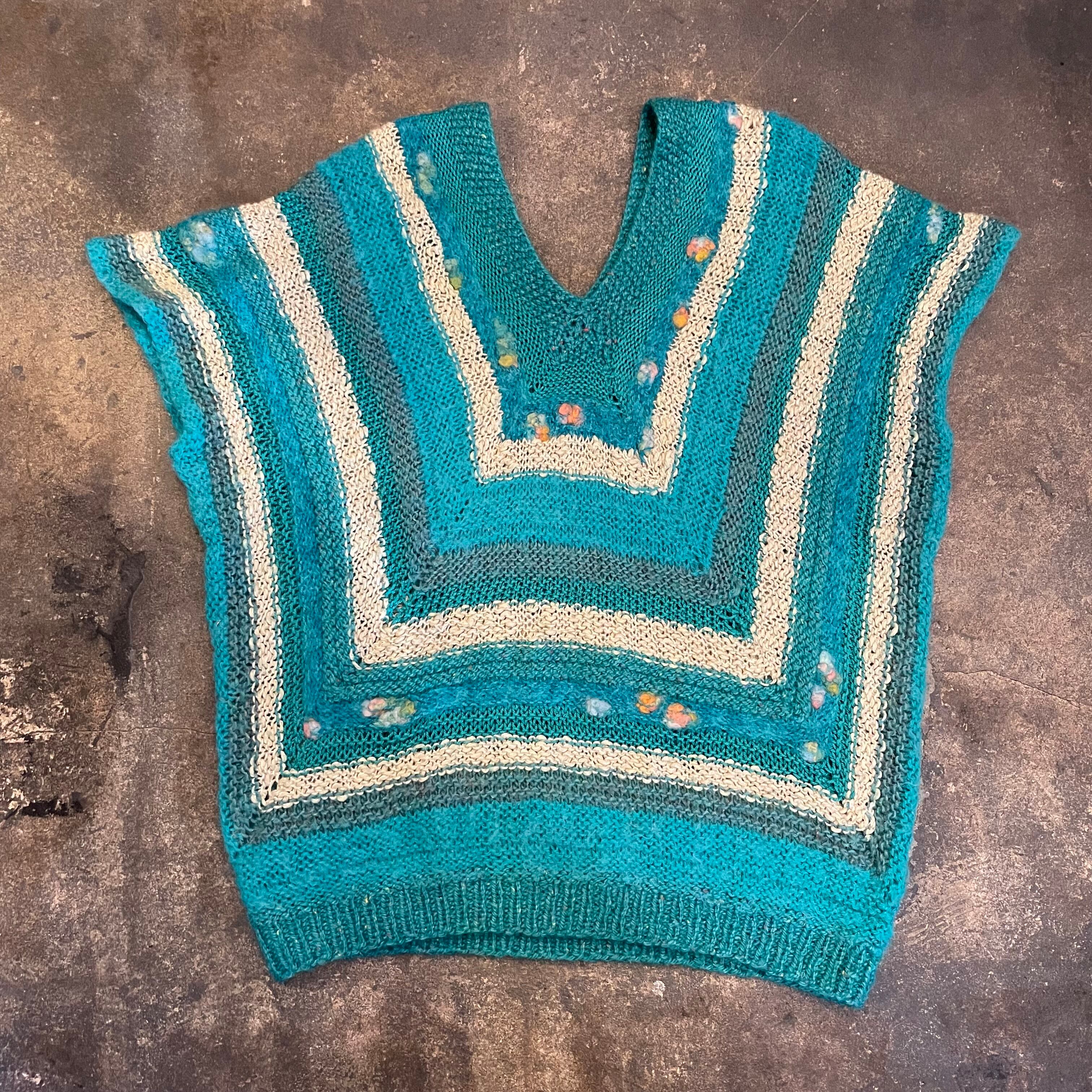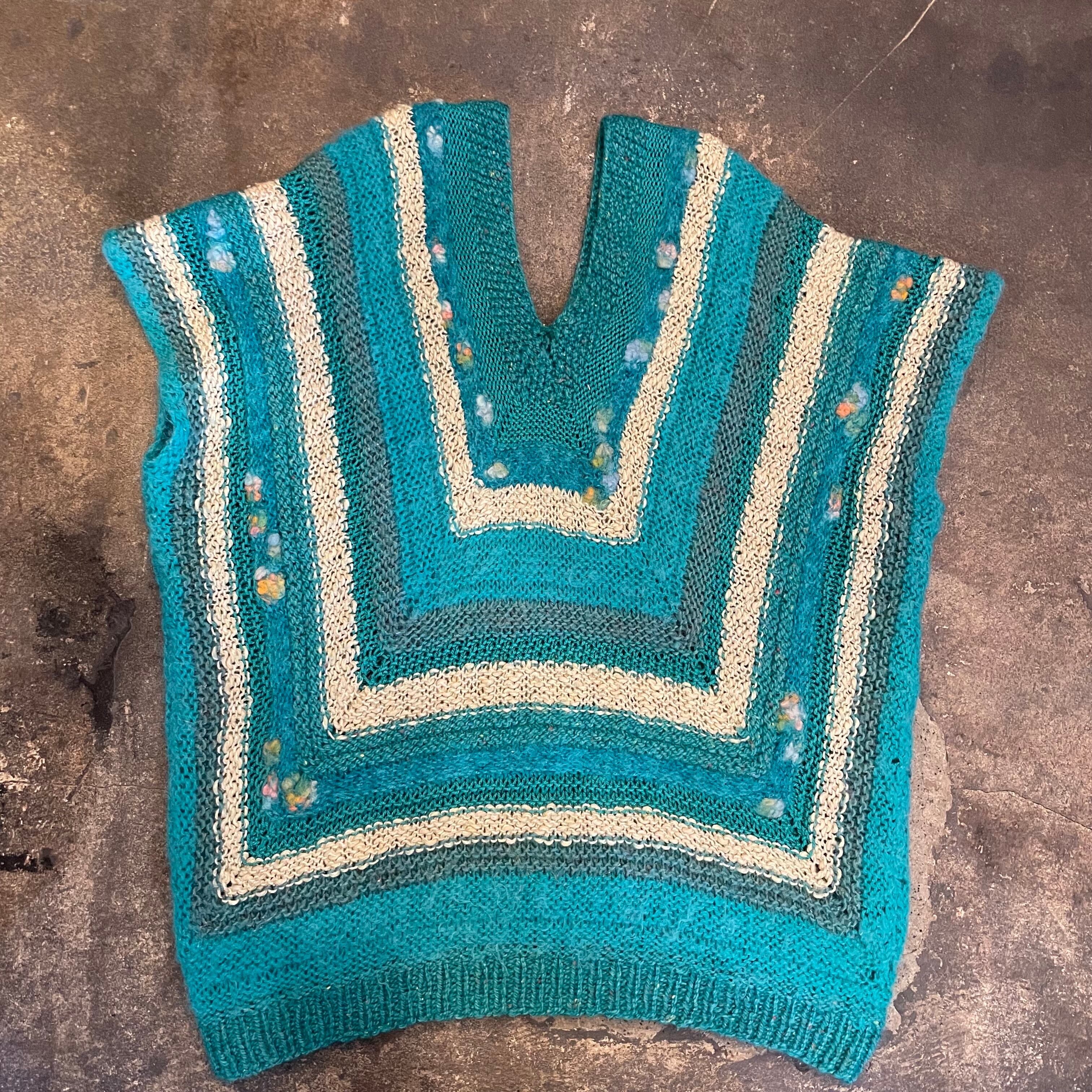 きれいな水色ベースのいろんな毛糸が使われていてかわいい手編みのベストです。