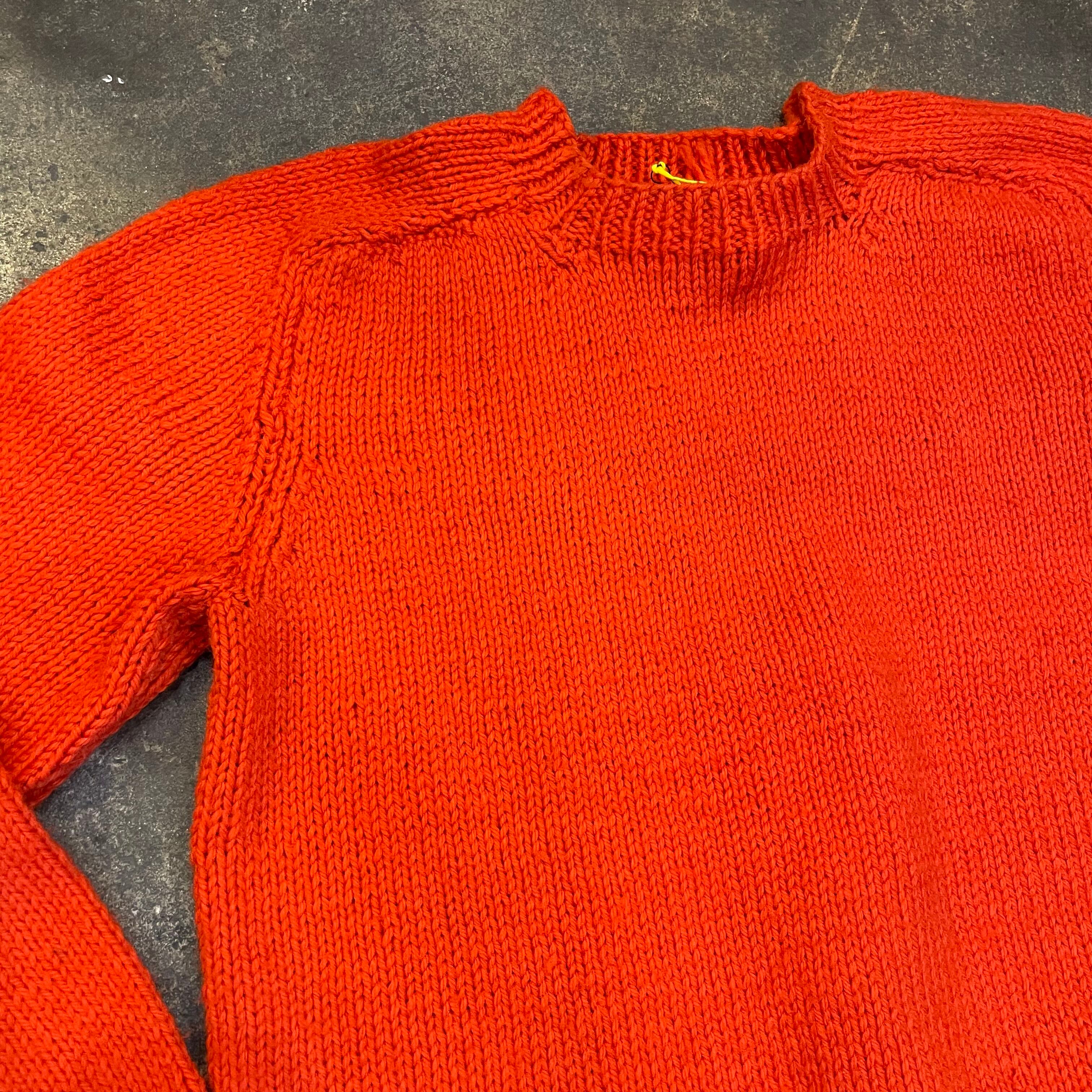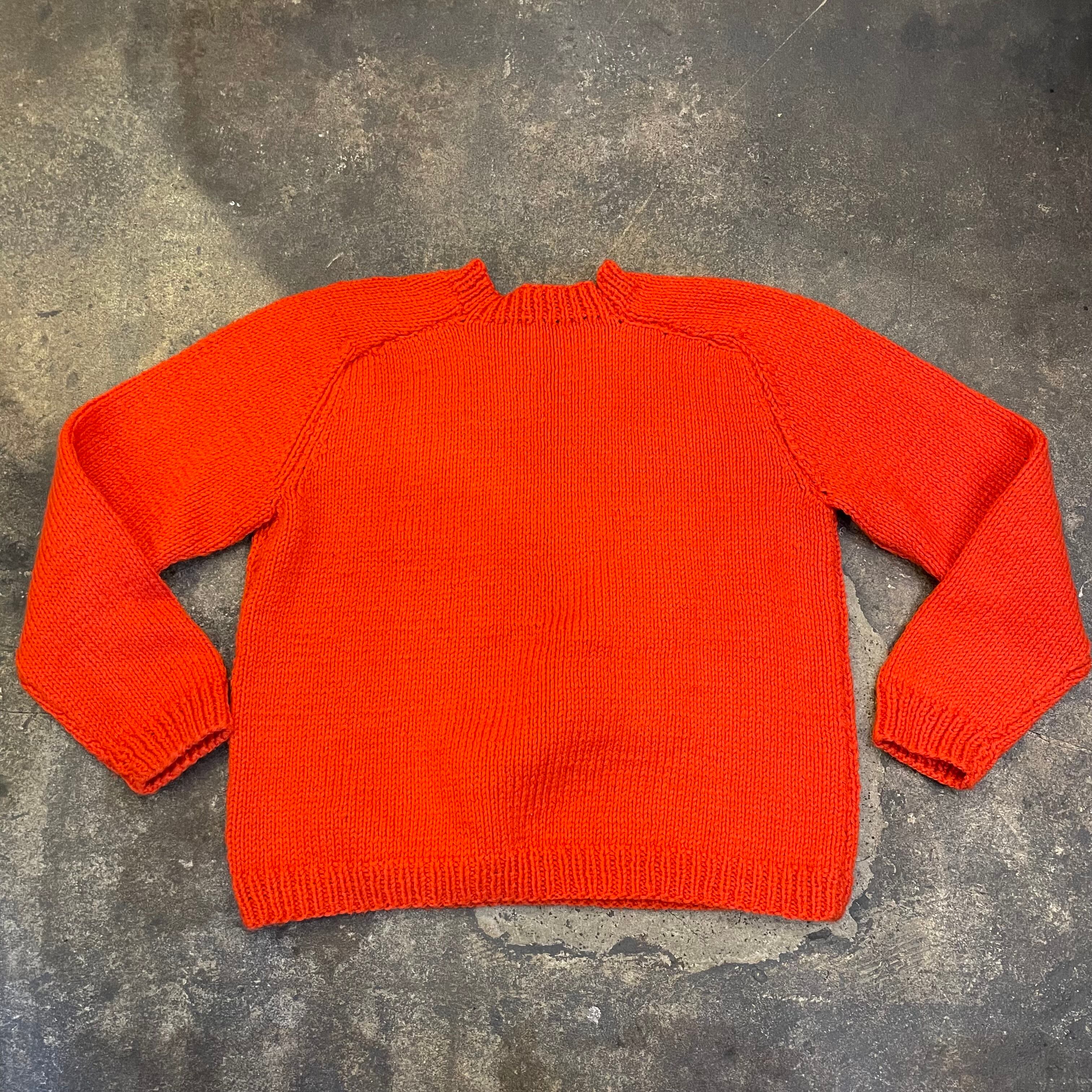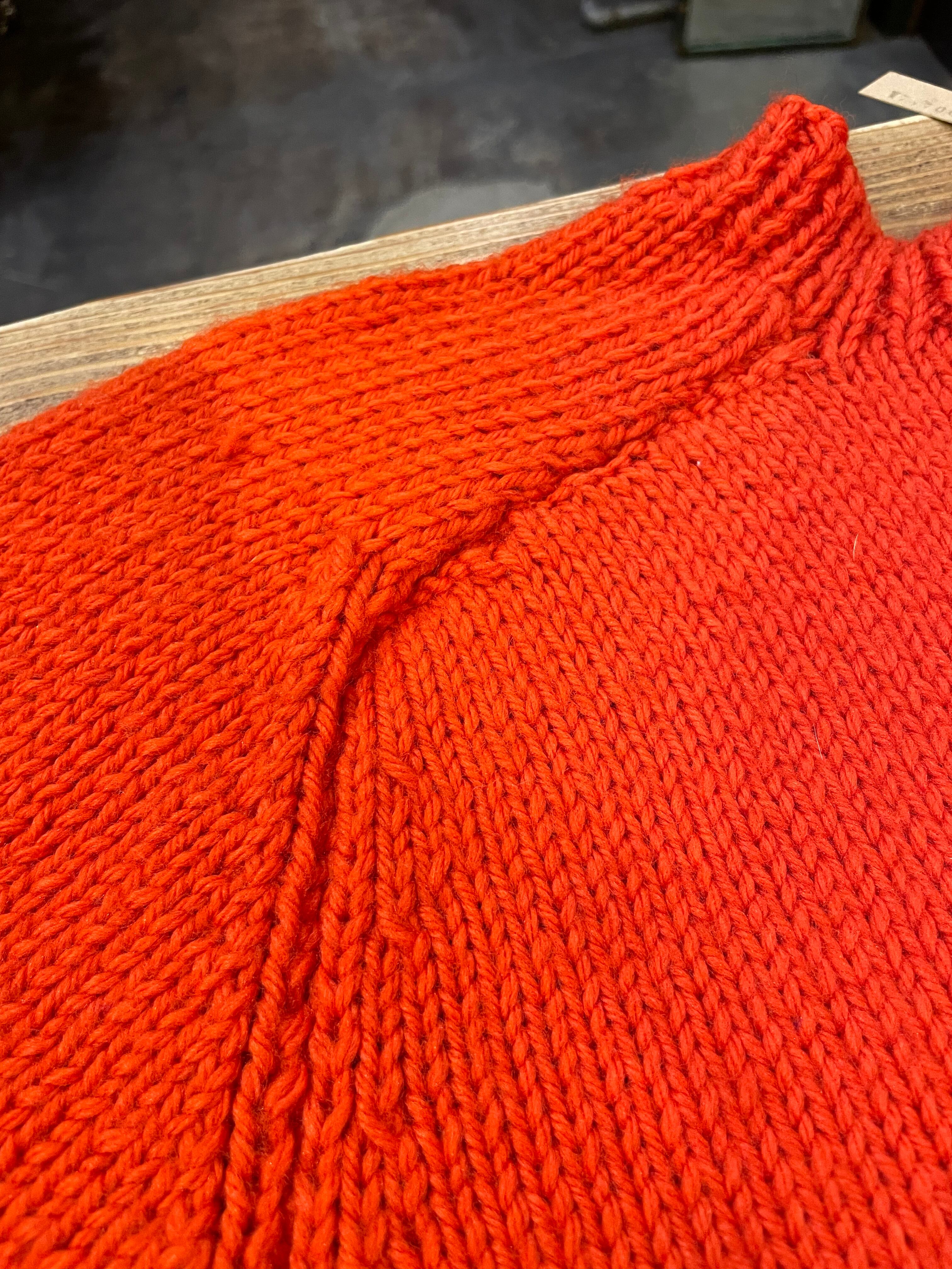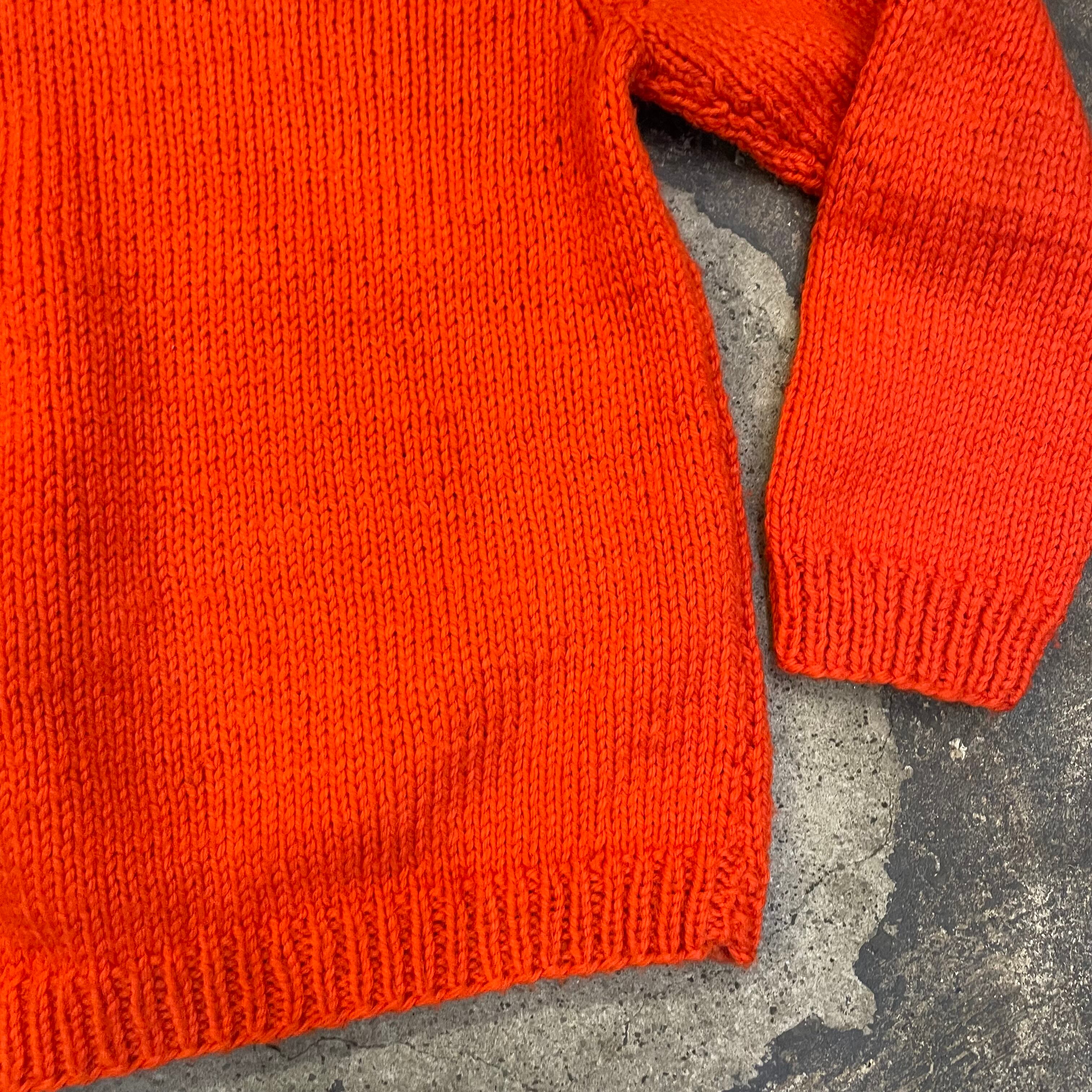 鮮やかなオレンジ色がかわいい手編みのセーターです。