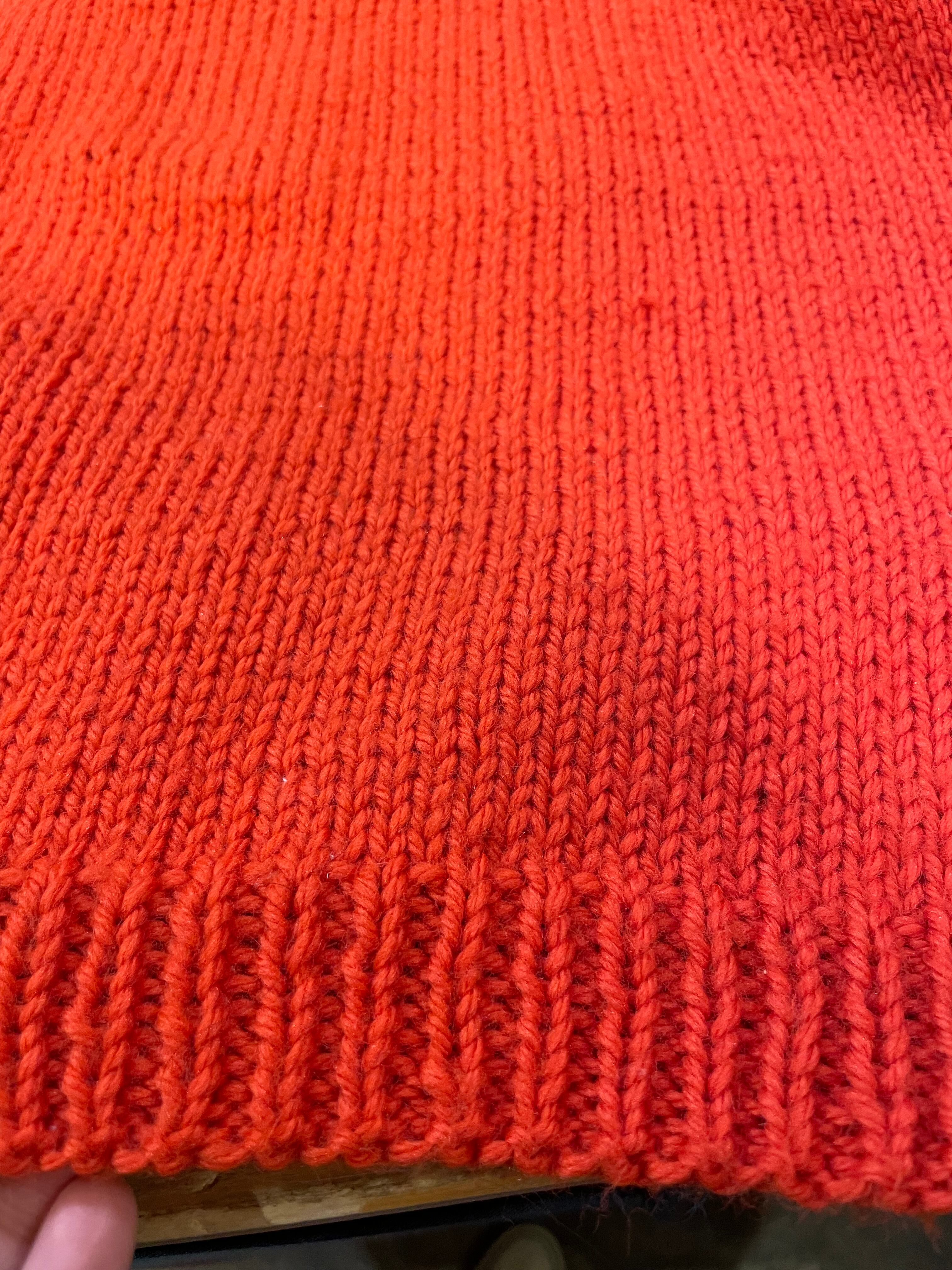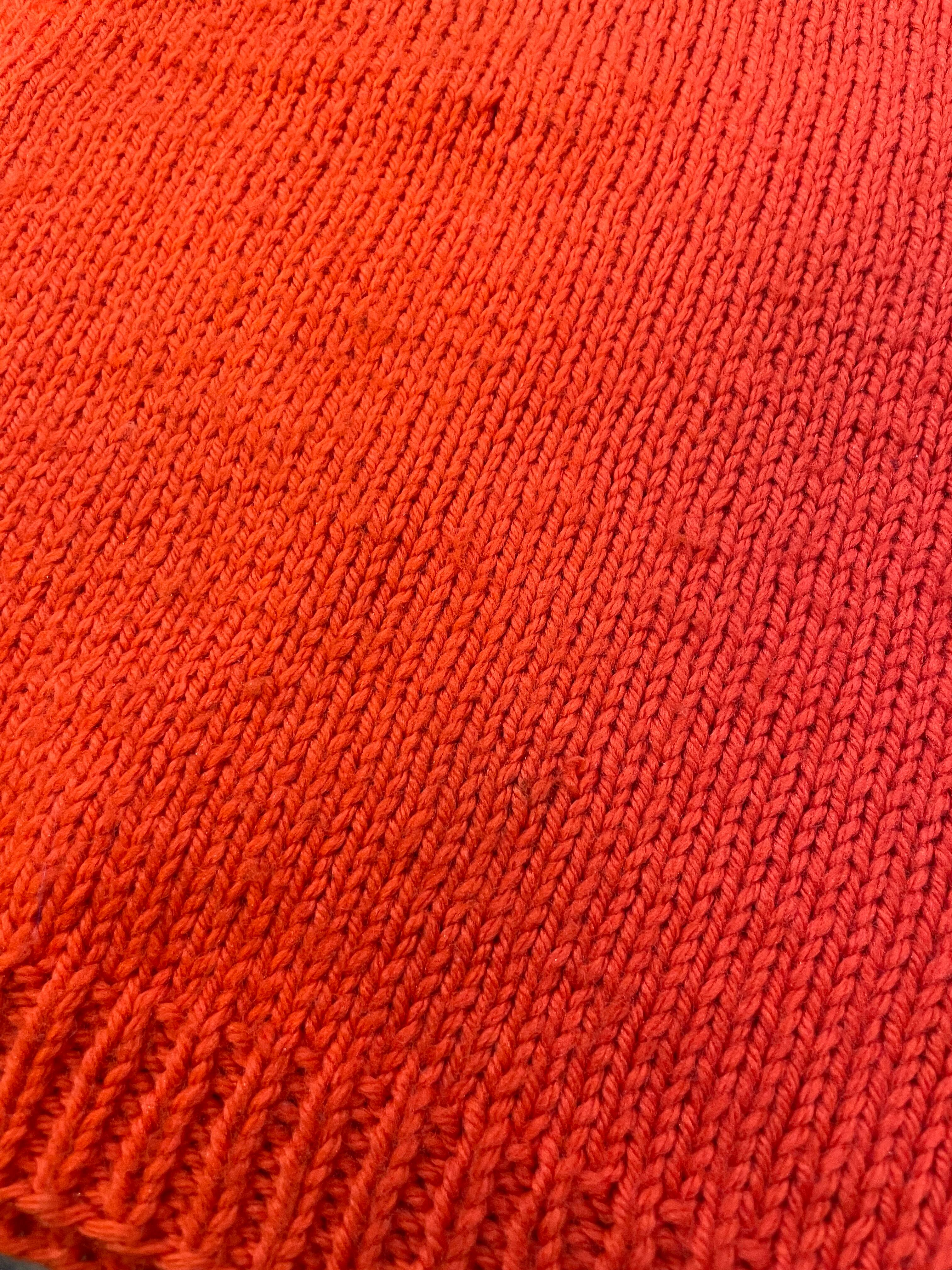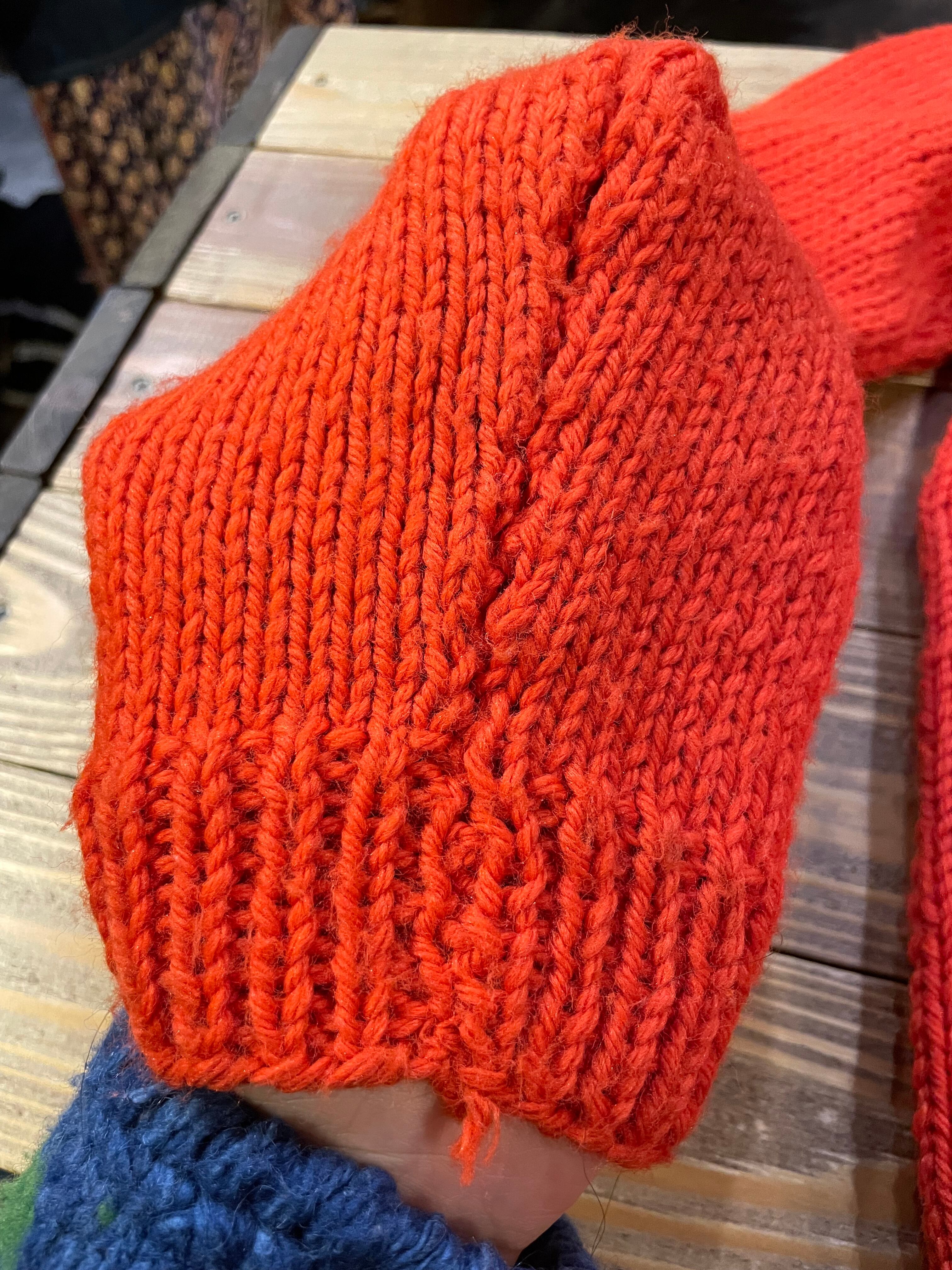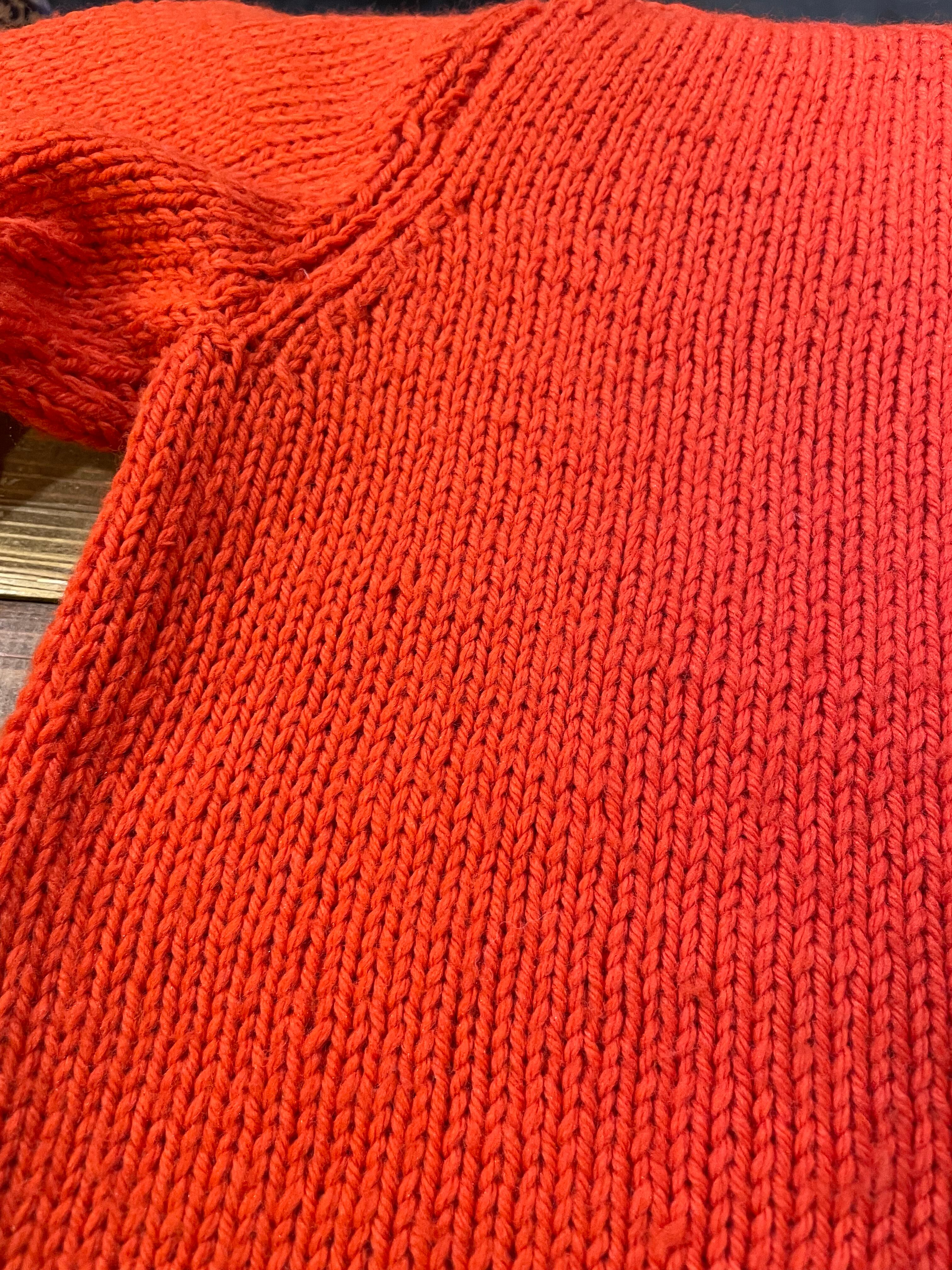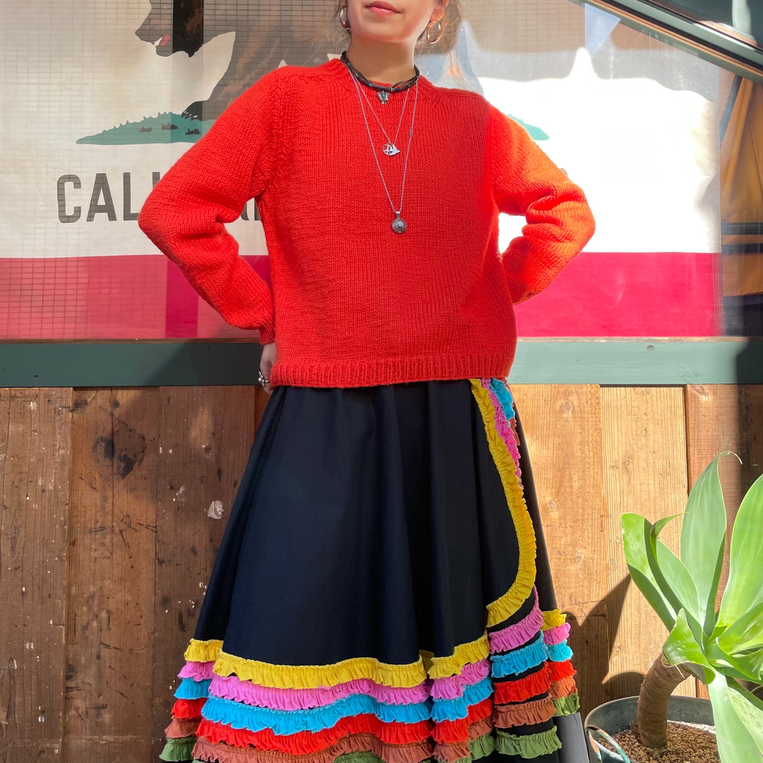 鮮やかなオレンジ色がかわいい手編みのセーターです。