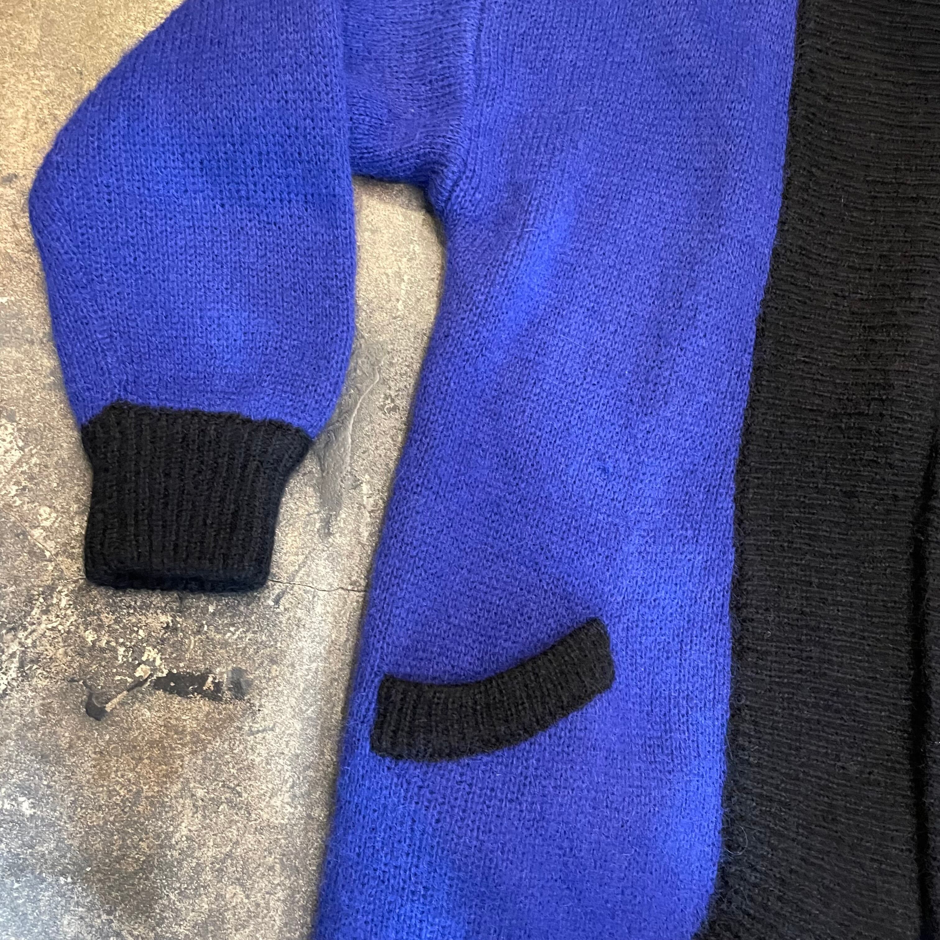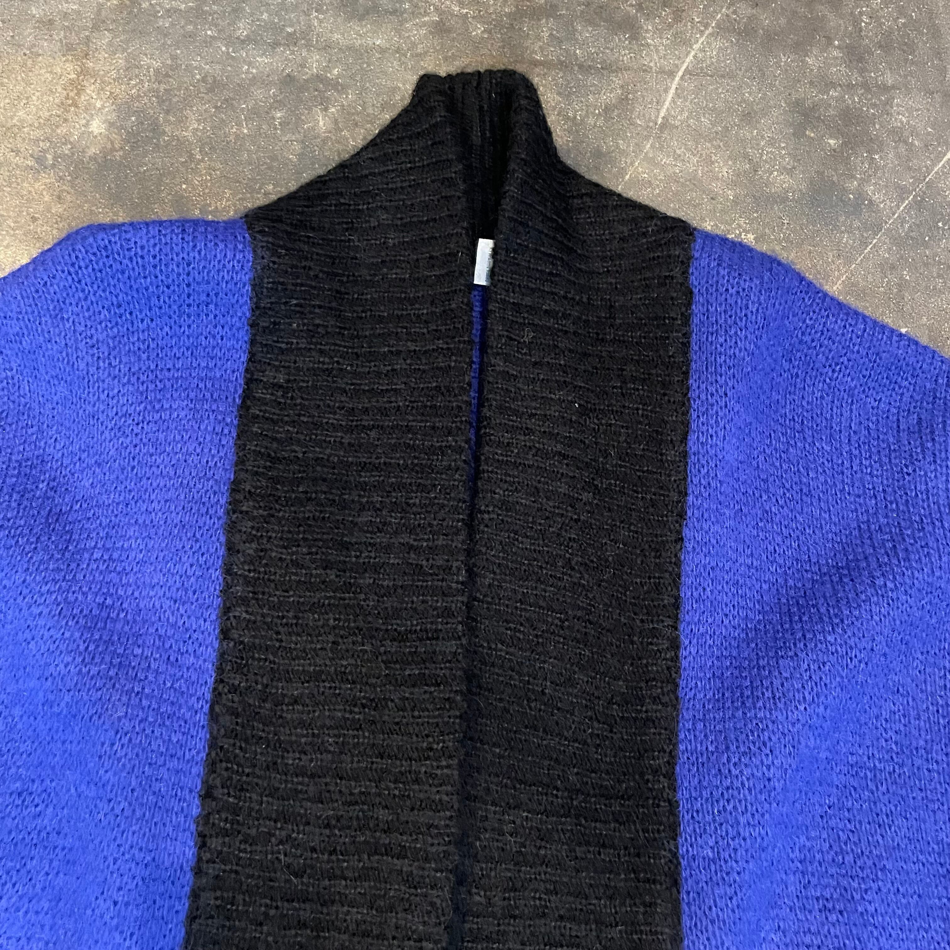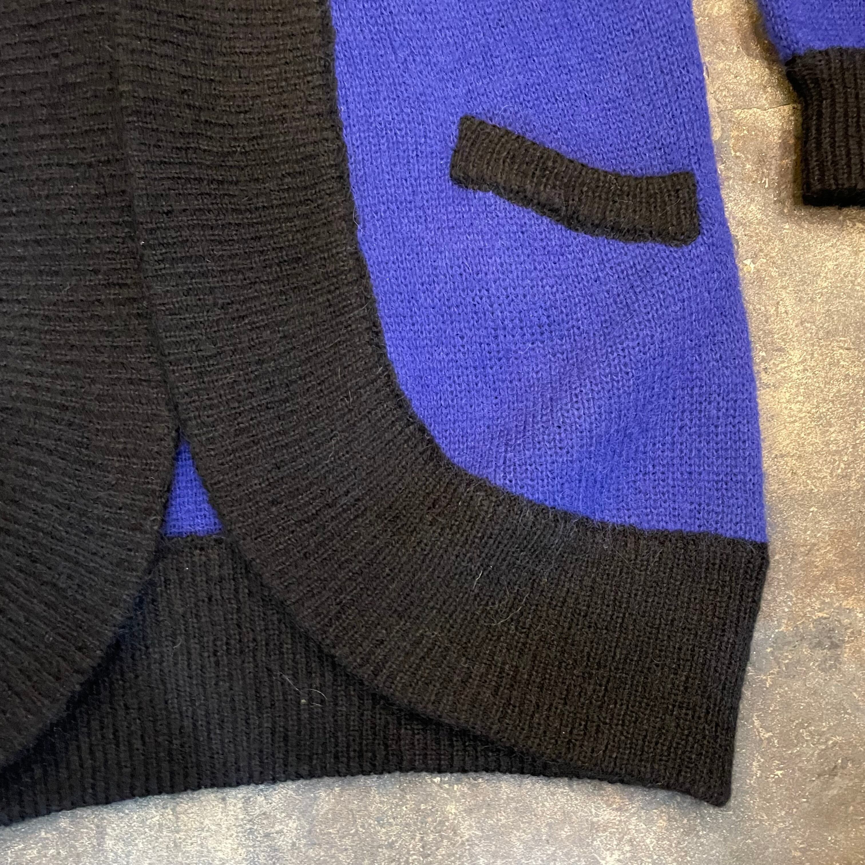 モヘアアクリルでふわっと毛足のある素材感が大人っぽい雰囲気ですね。全ての縁取りを黒のリブでデザインされているおかげで、グッと引き締まって合わせやすい一着かと思います。