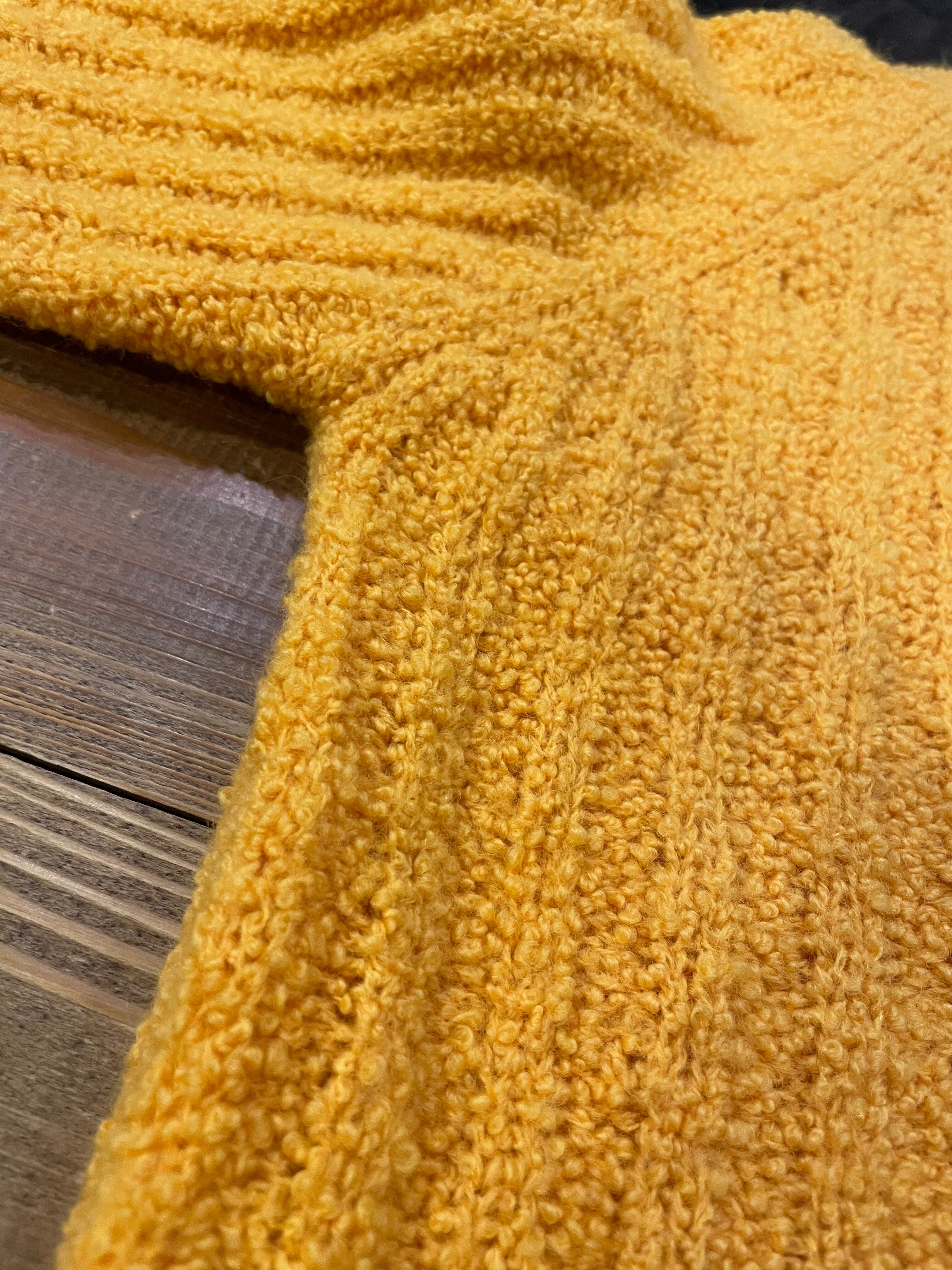 鮮やかな黄色ともこもこ遊びのある毛糸がかわいいカーディガンです。