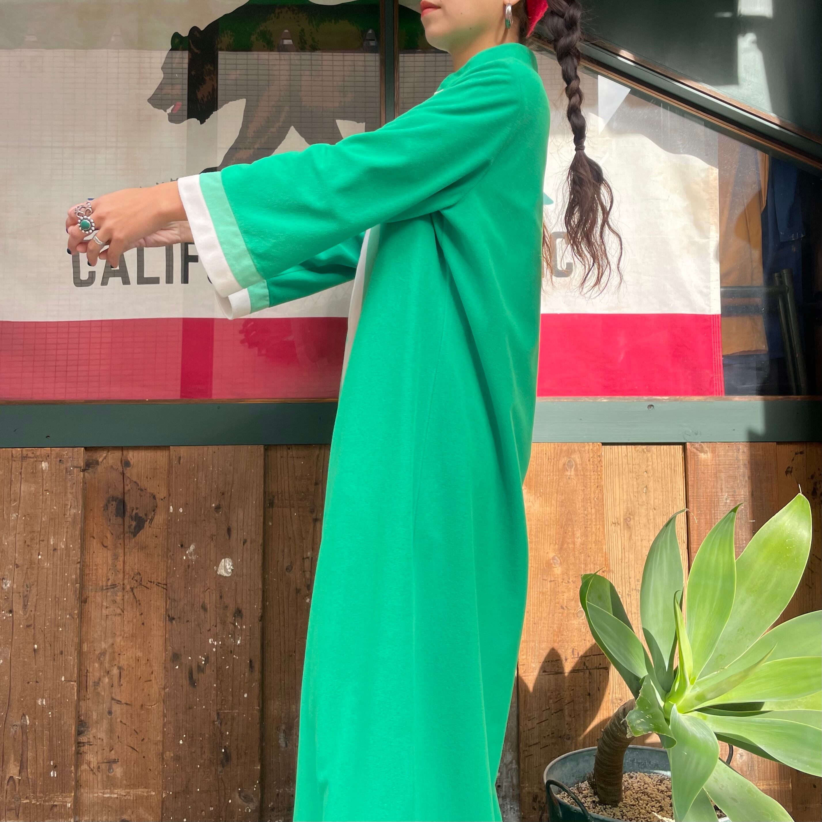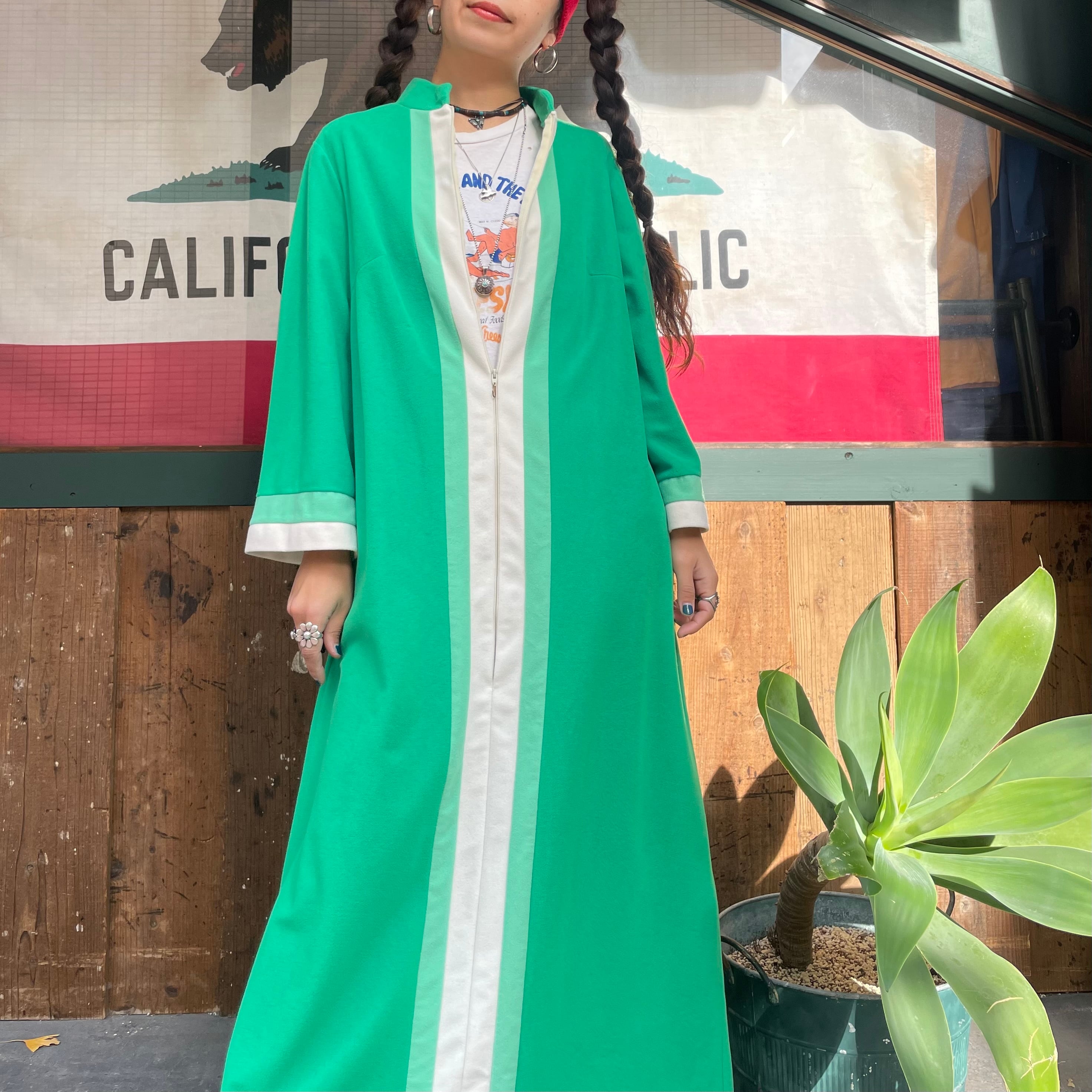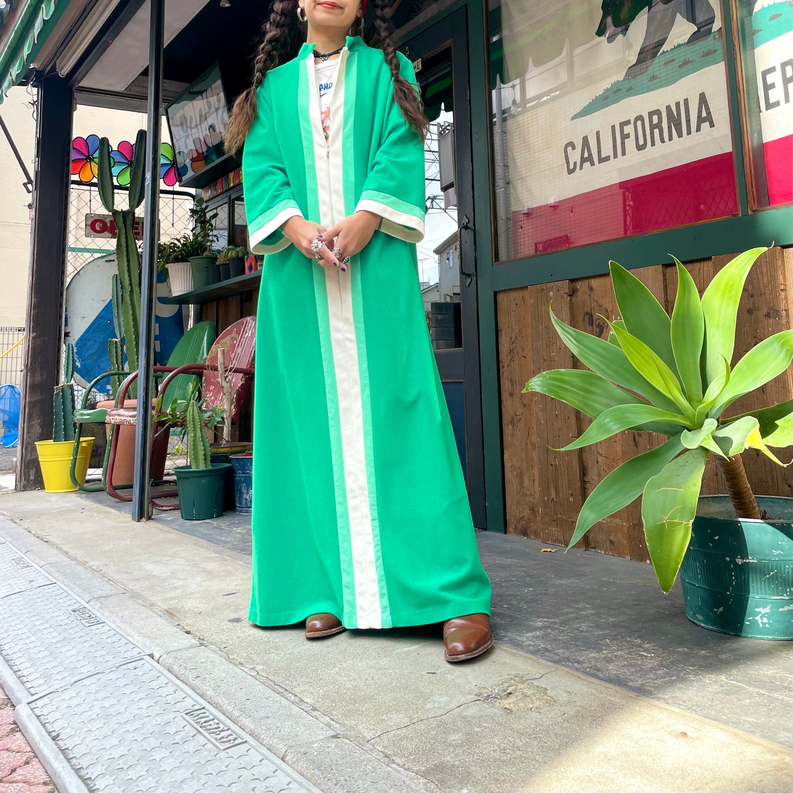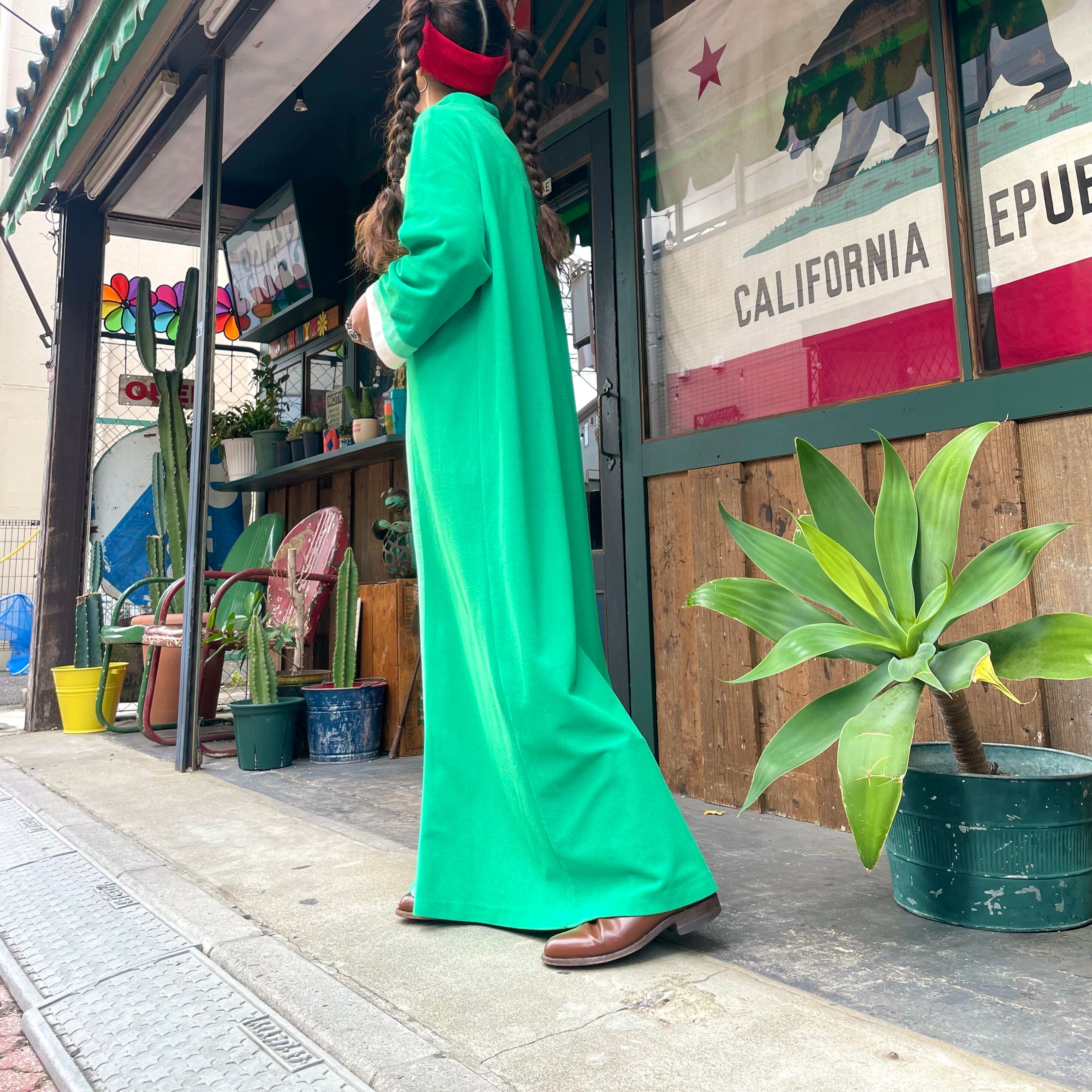 きれいなキミドリ色がかわいい70年代頃のフリースワンピースです。グラデーションになっている切り替えがこの年代らしくポップでかわいいですね。