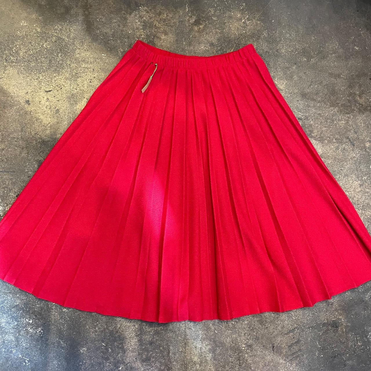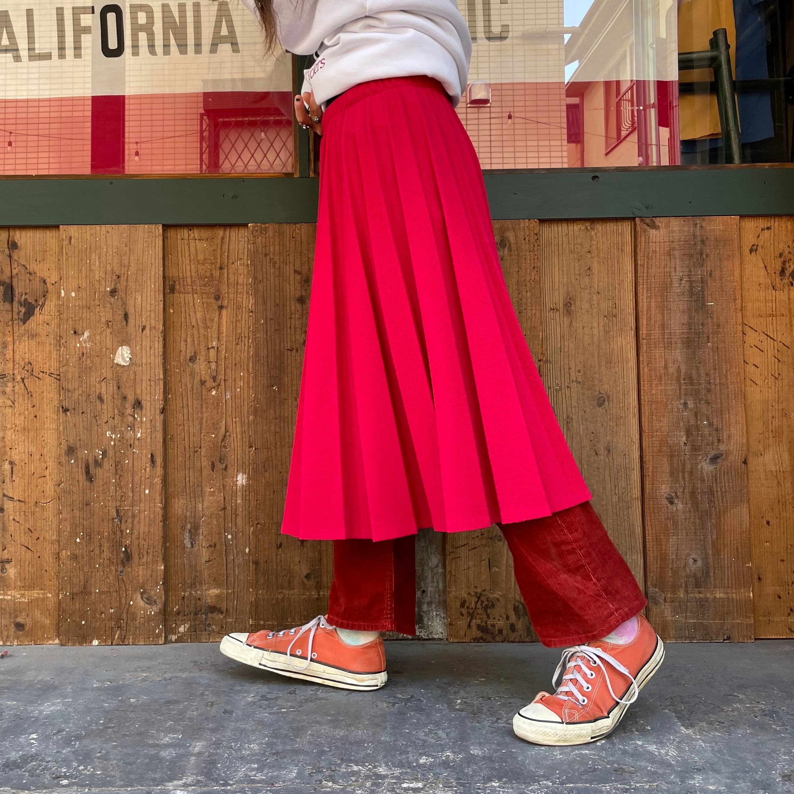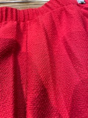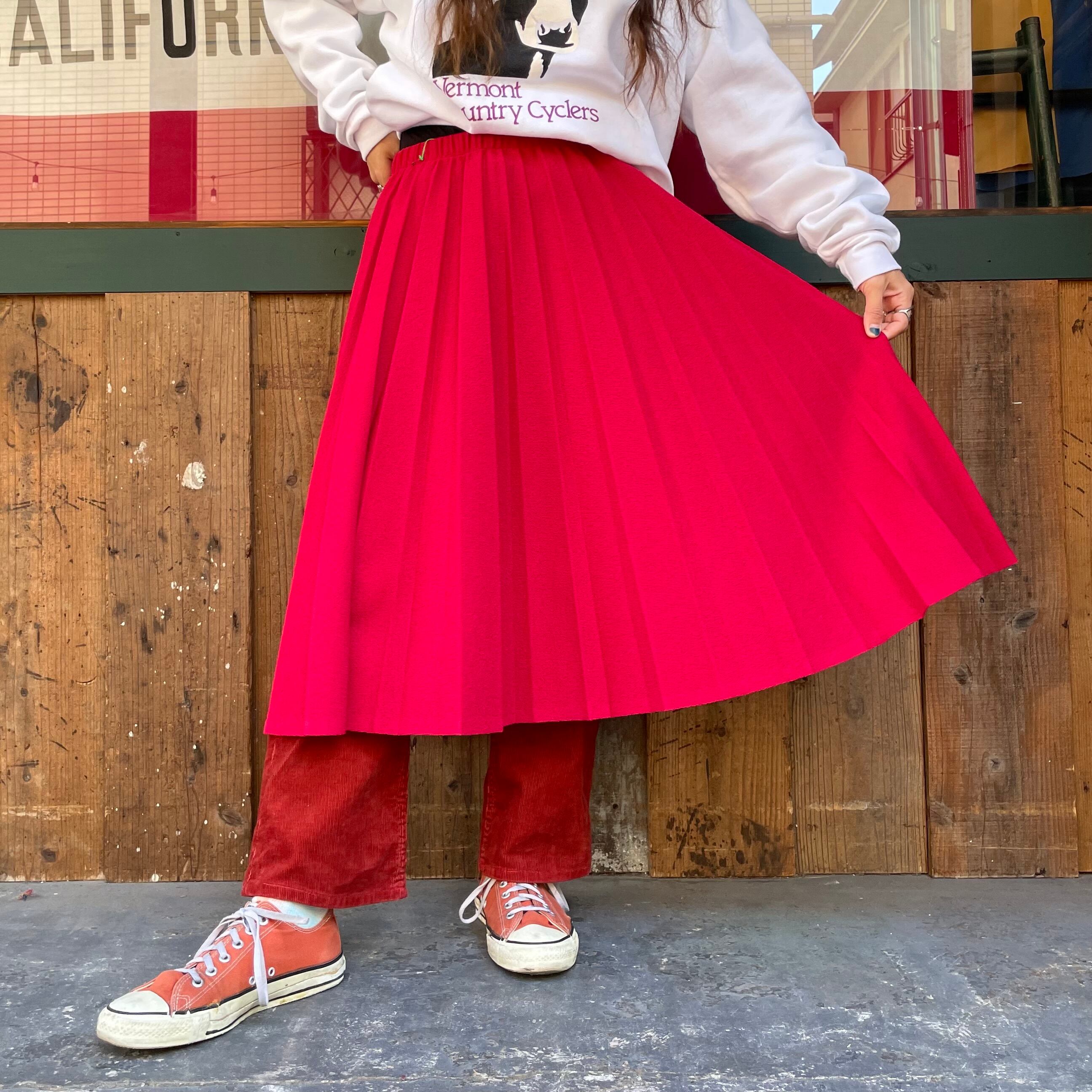 チェリーレッドな色味がかわいいプリーツスカートです。プリーツスカートってかっちりしているイメージですが、こちらはプリーツもピシッとなっていないですし、素材もニットのように見える雰囲気のある生地感ですし、ウエストもゴムという事でカジュアルに着られる一枚だと思います。