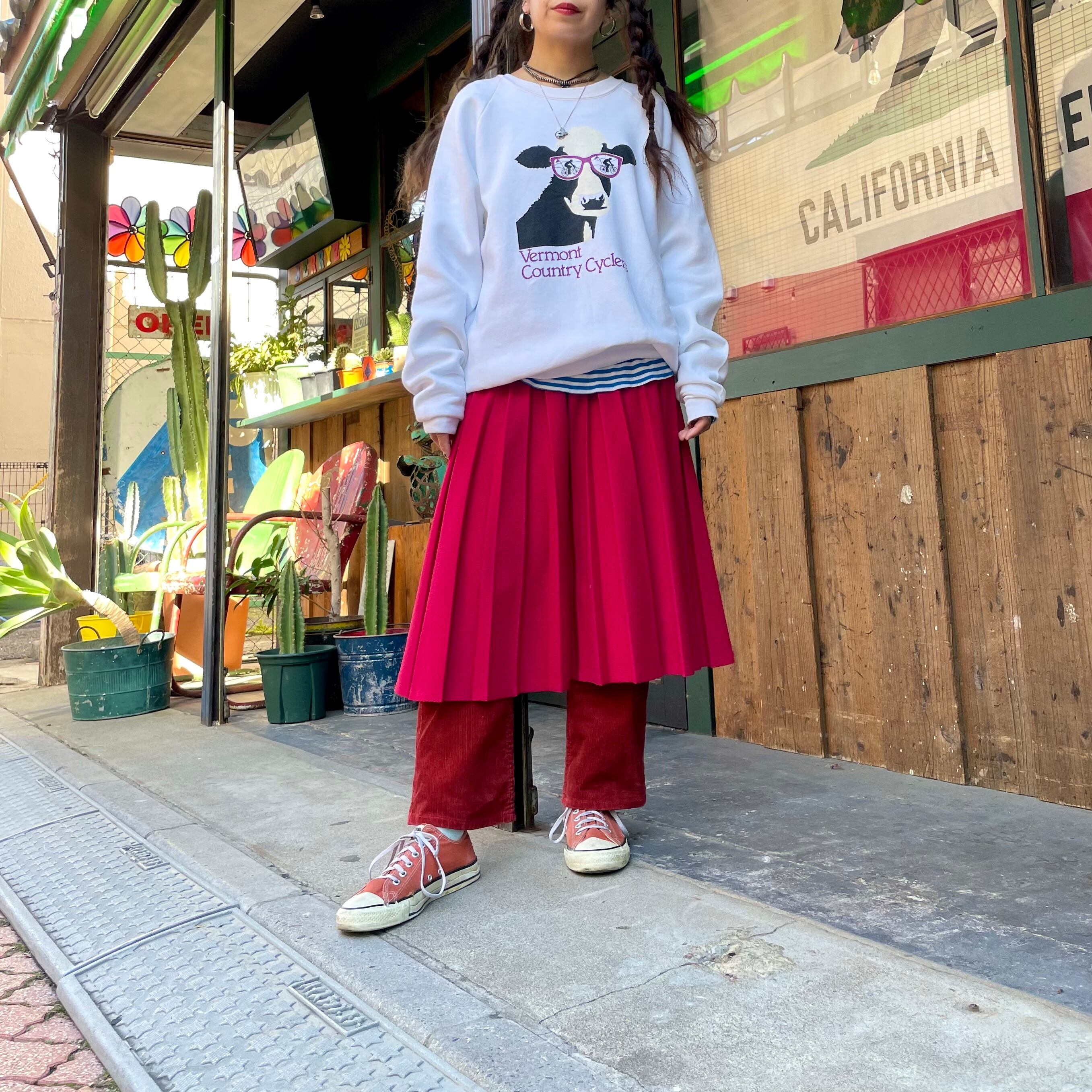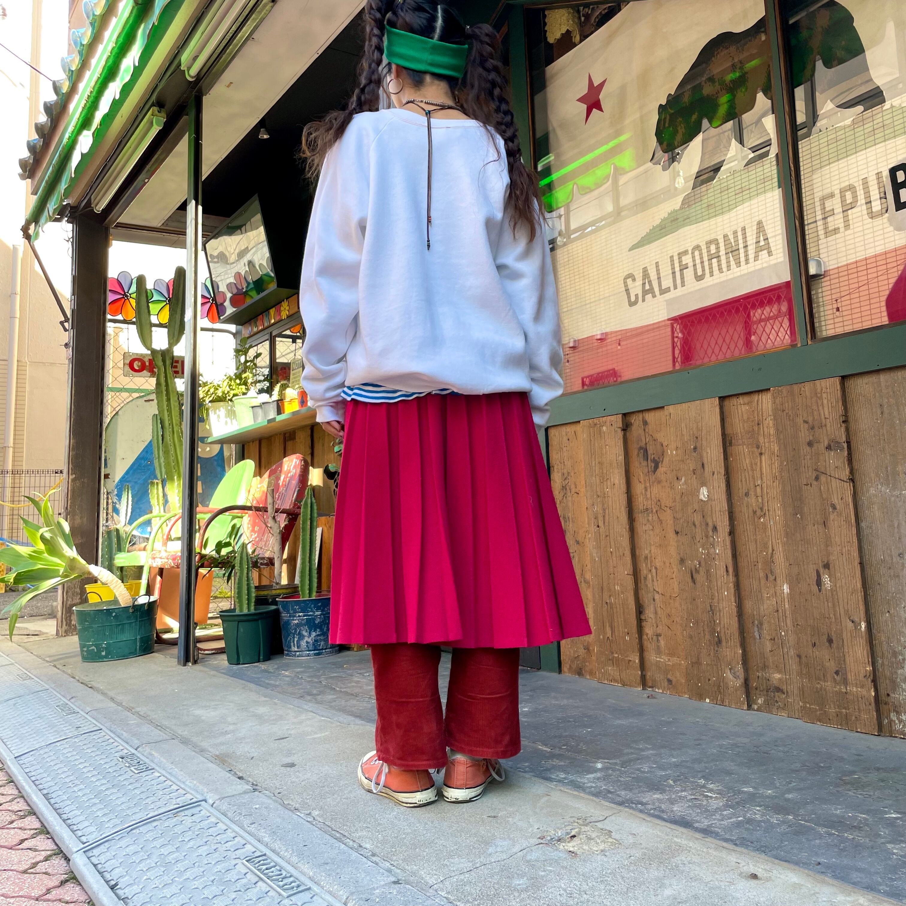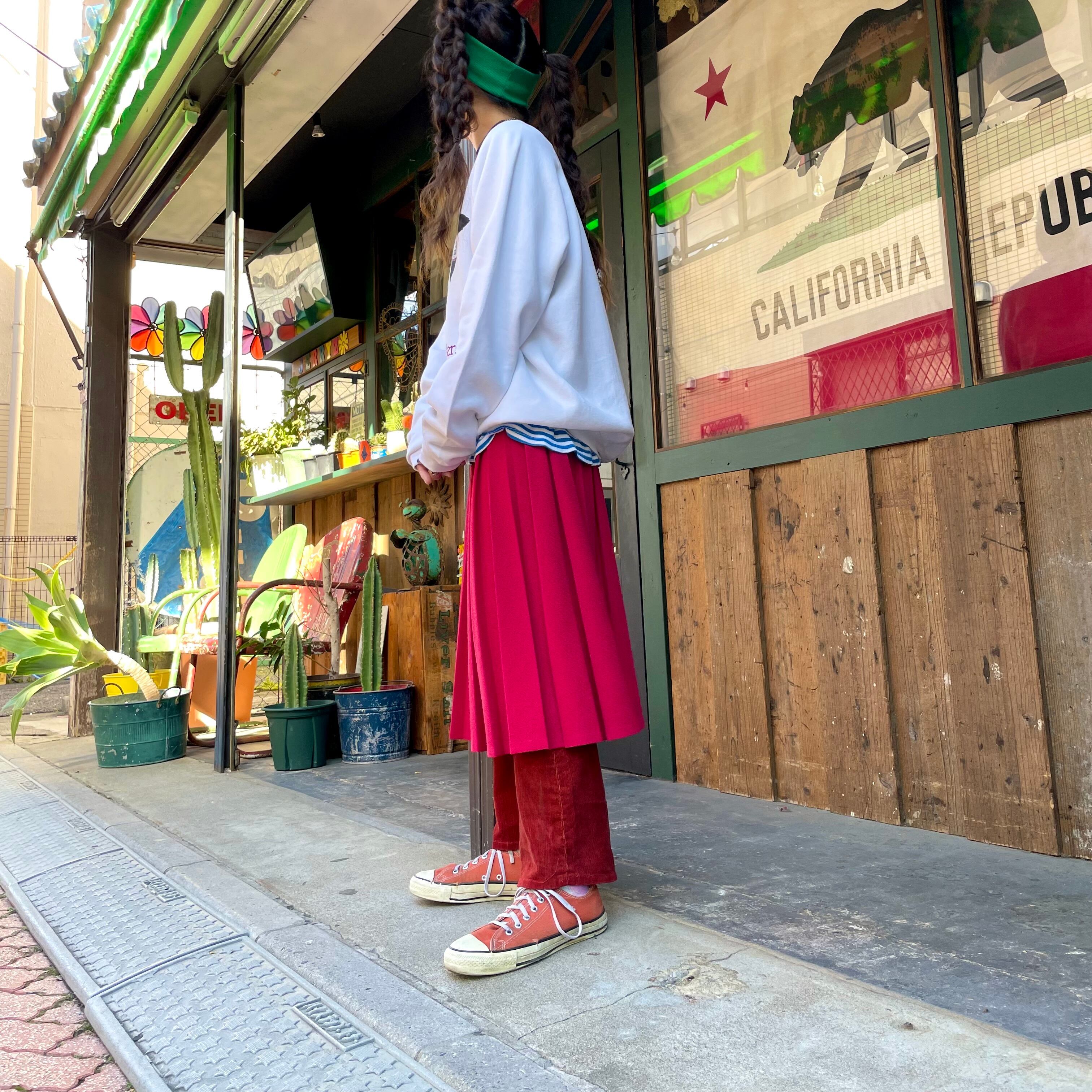 チェリーレッドな色味がかわいいプリーツスカートです。プリーツスカートってかっちりしているイメージですが、こちらはプリーツもピシッとなっていないですし、素材もニットのように見える雰囲気のある生地感ですし、ウエストもゴムという事でカジュアルに着られる一枚だと思います。
