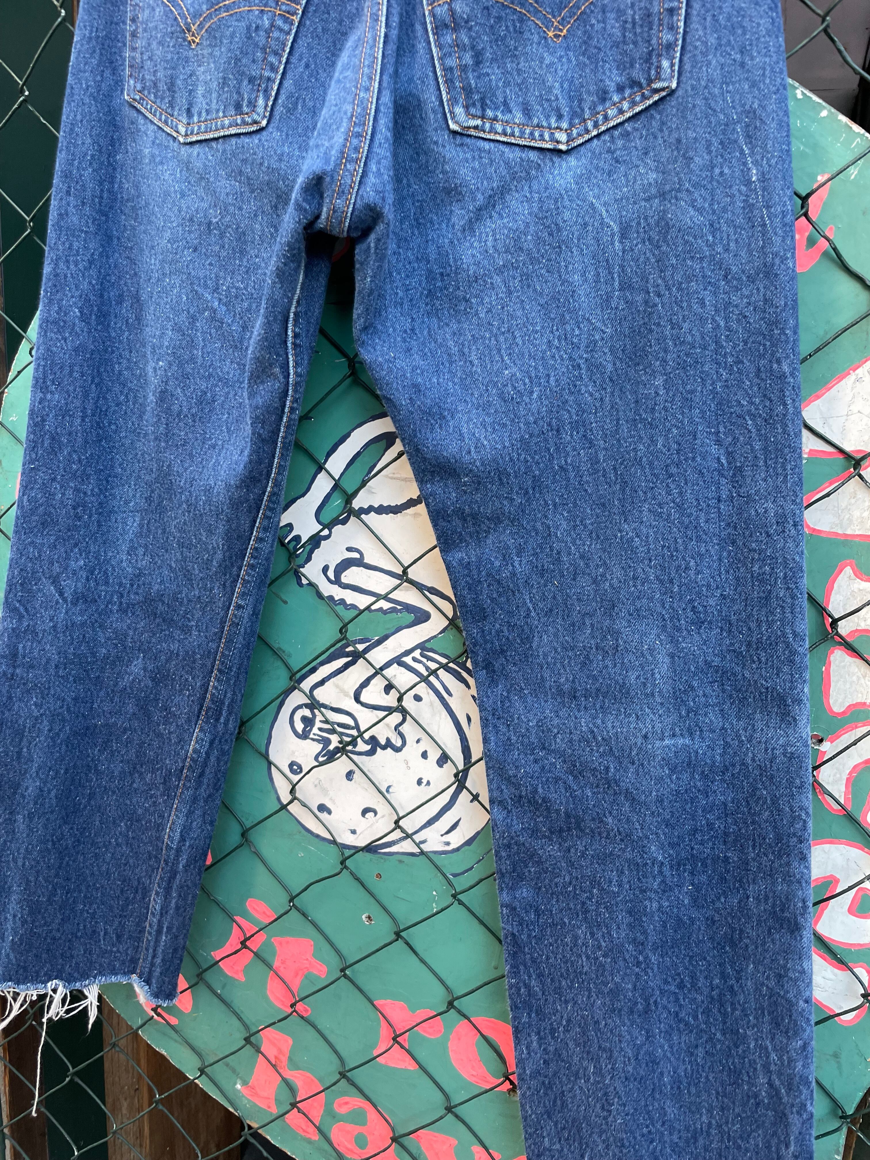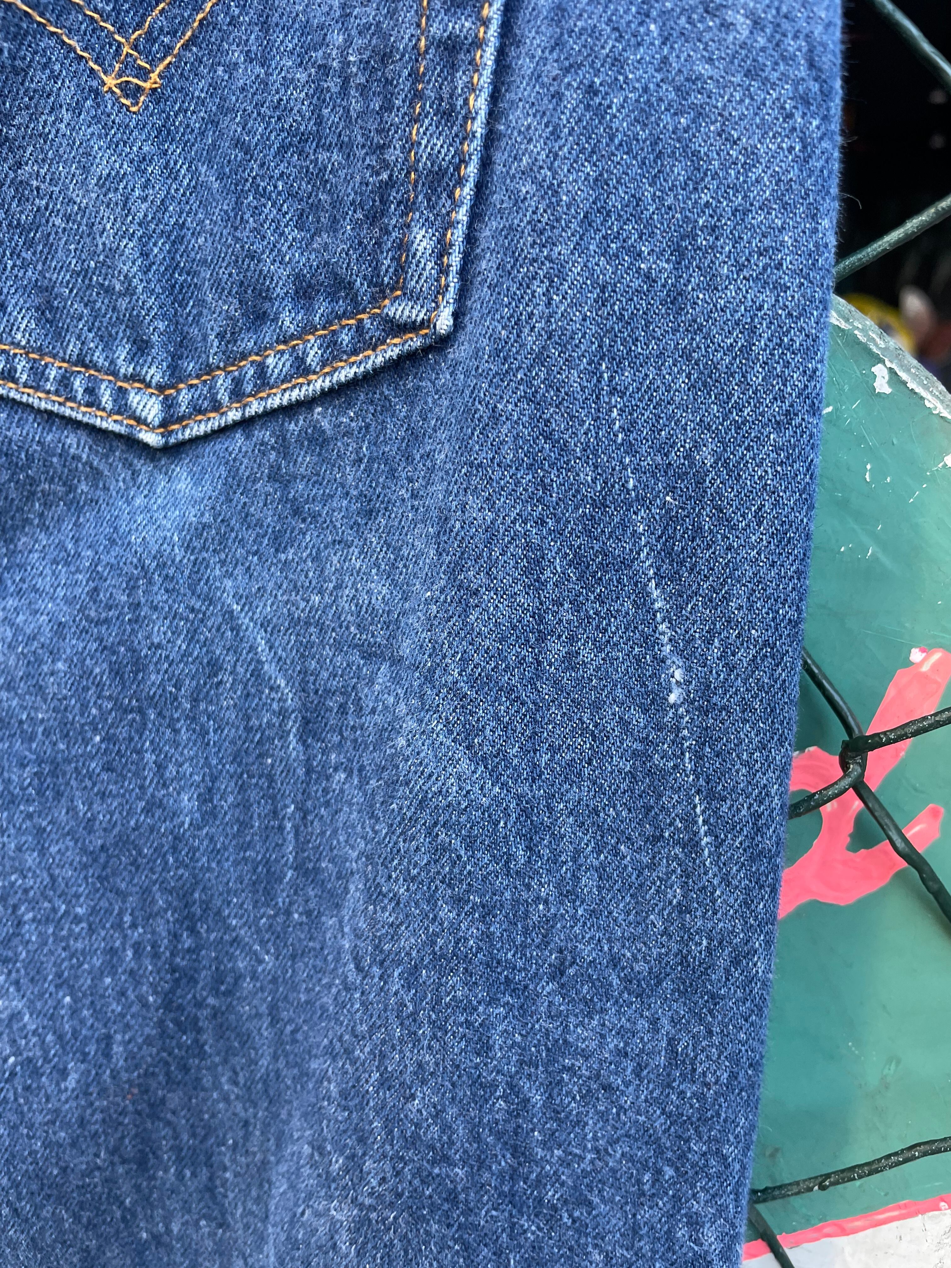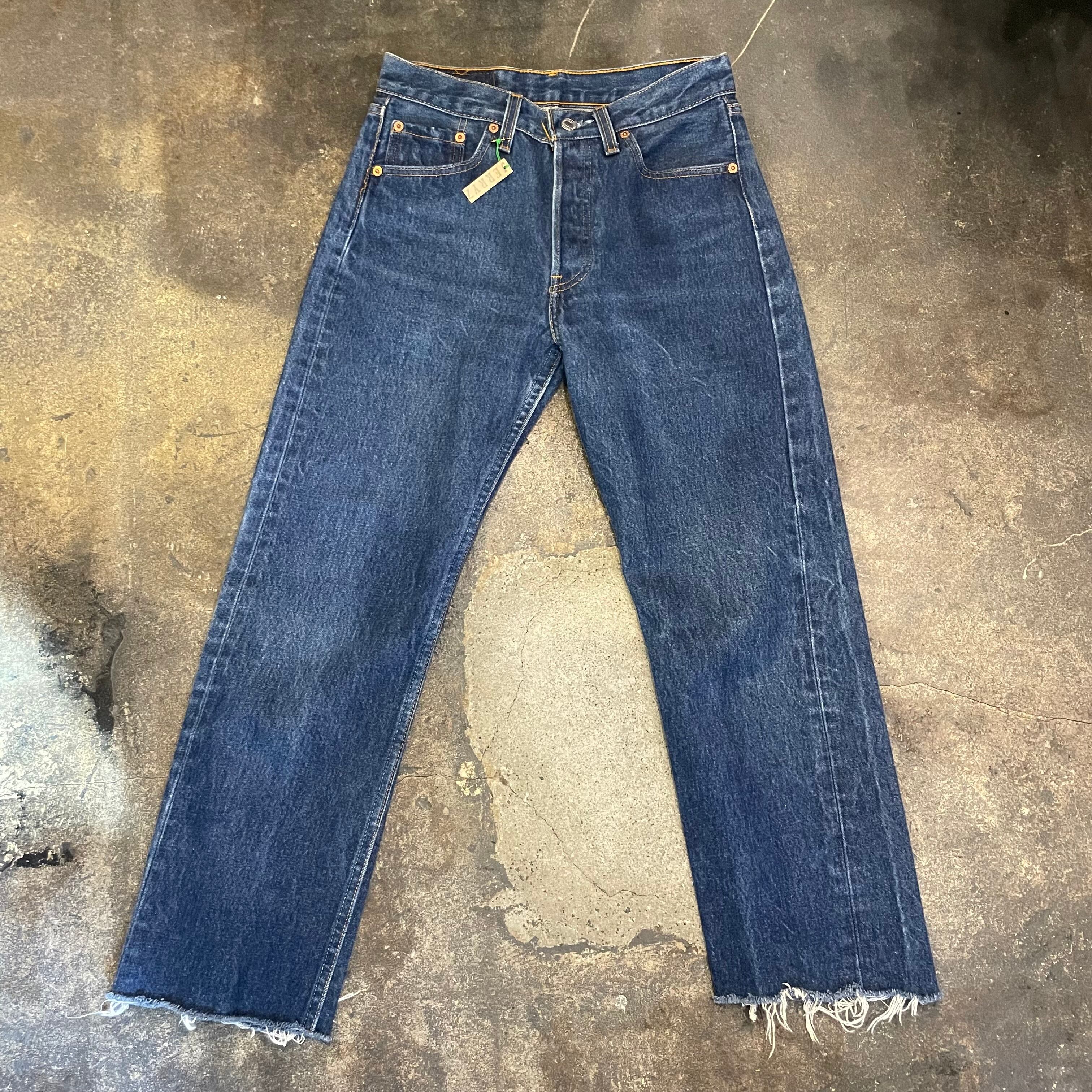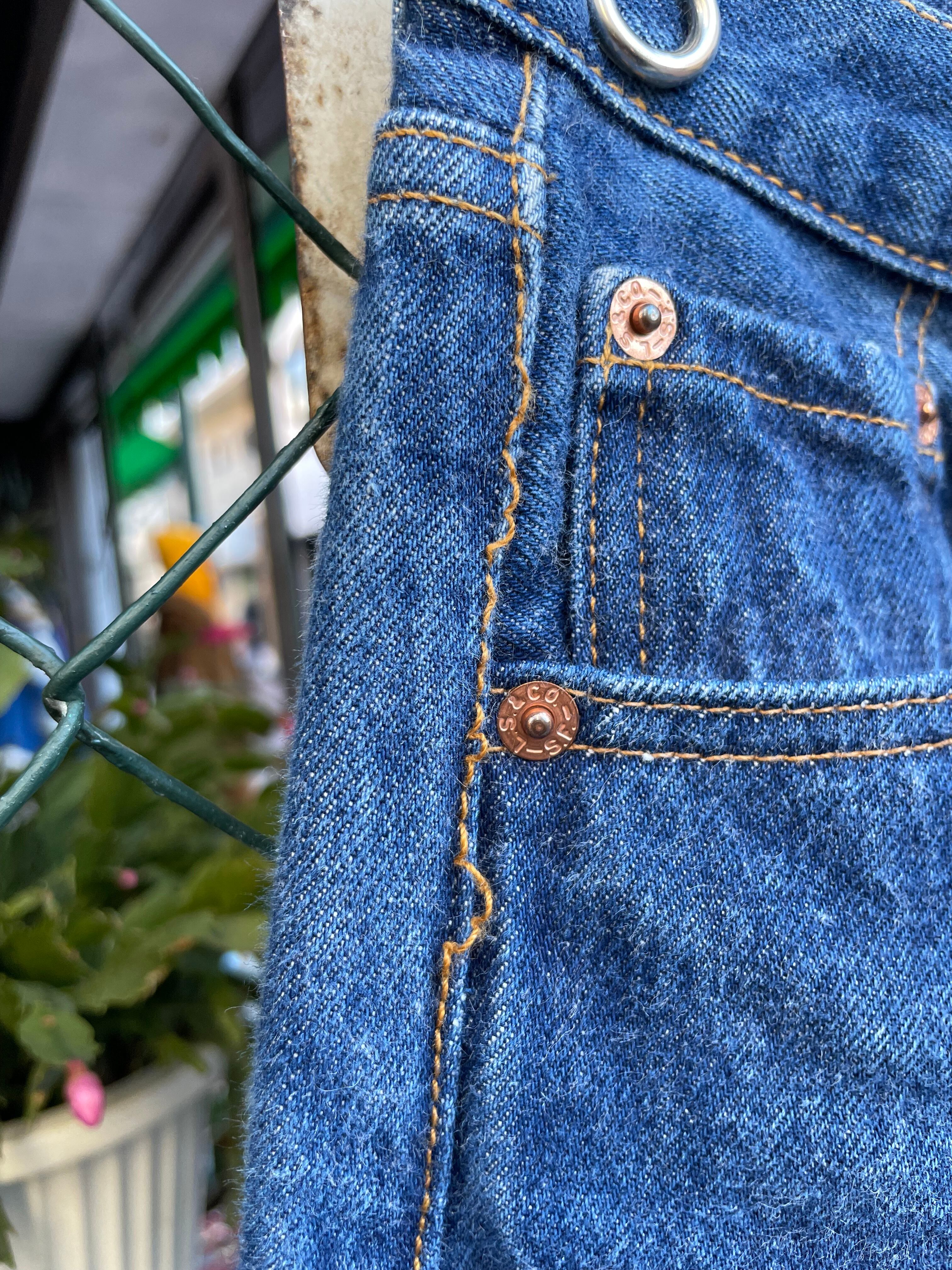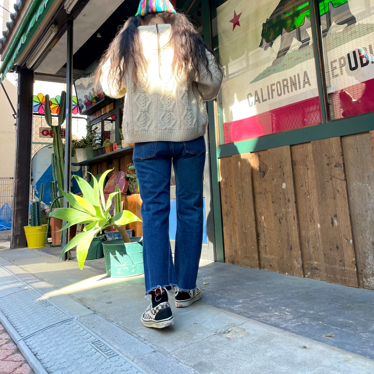 まあまあ濃いめの色が残っていて良い雰囲気です。裾がカットされてしまっていますが、程良く短めで裾の切りっぱなし感もかわいいですし、普通の501とはまた違う雰囲気で履いて頂けそうな一本です。
