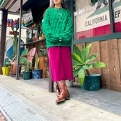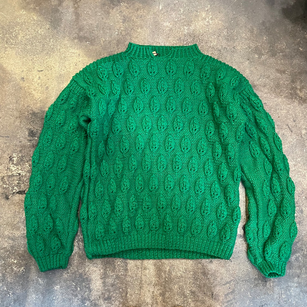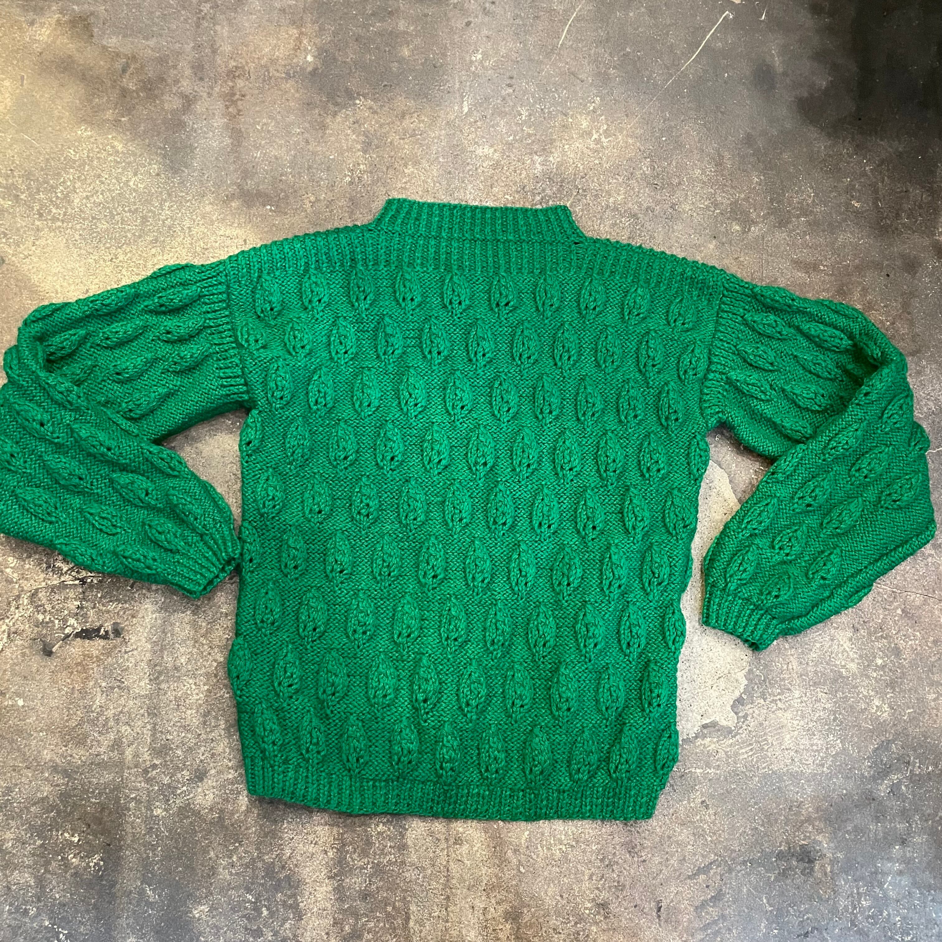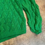 鮮やかで元気なグリーンがかわいいセーターです。立体的な葉っぱのような模様たちがぼこぼこ規則的に並んでいてポップですね。
