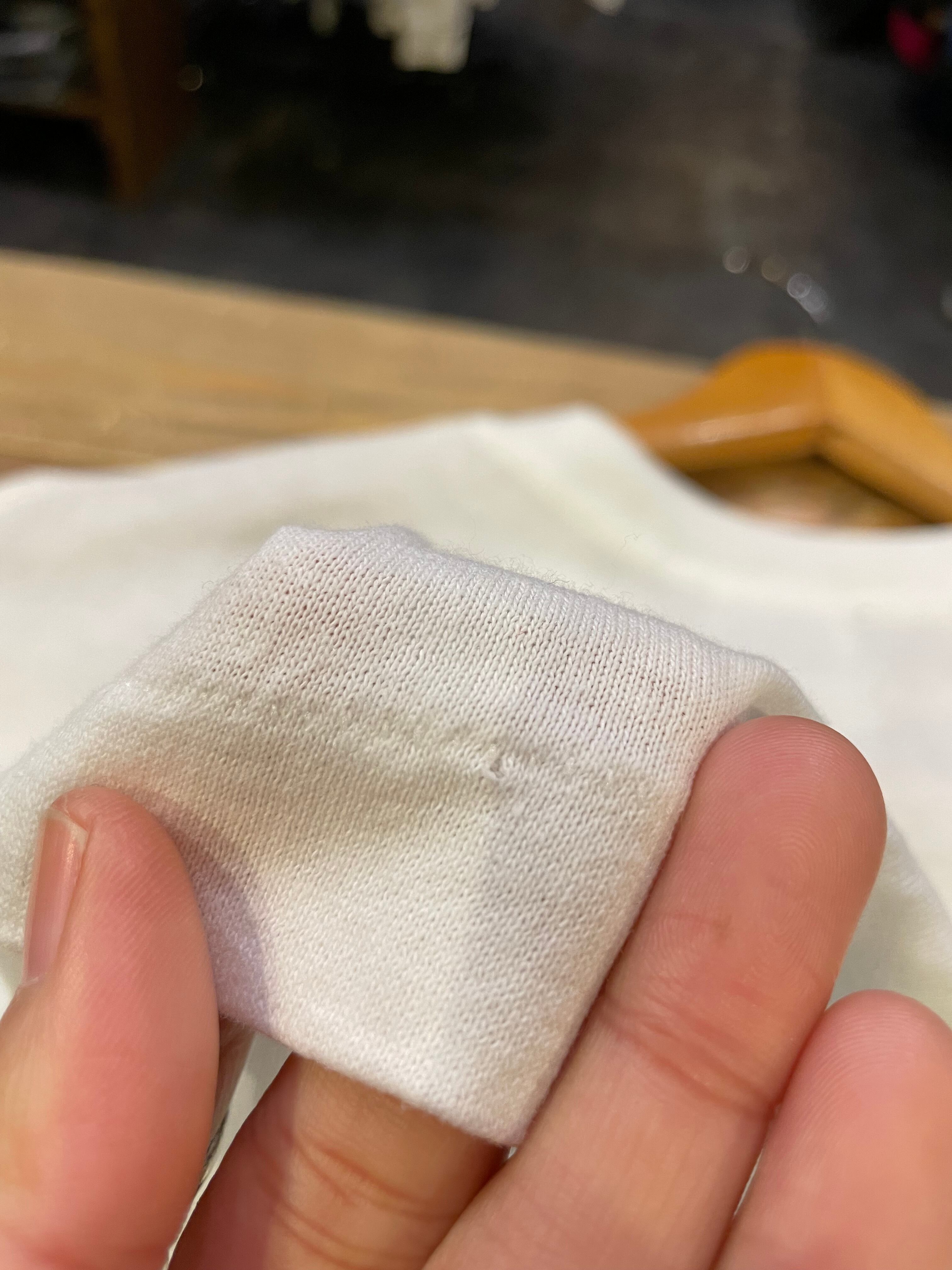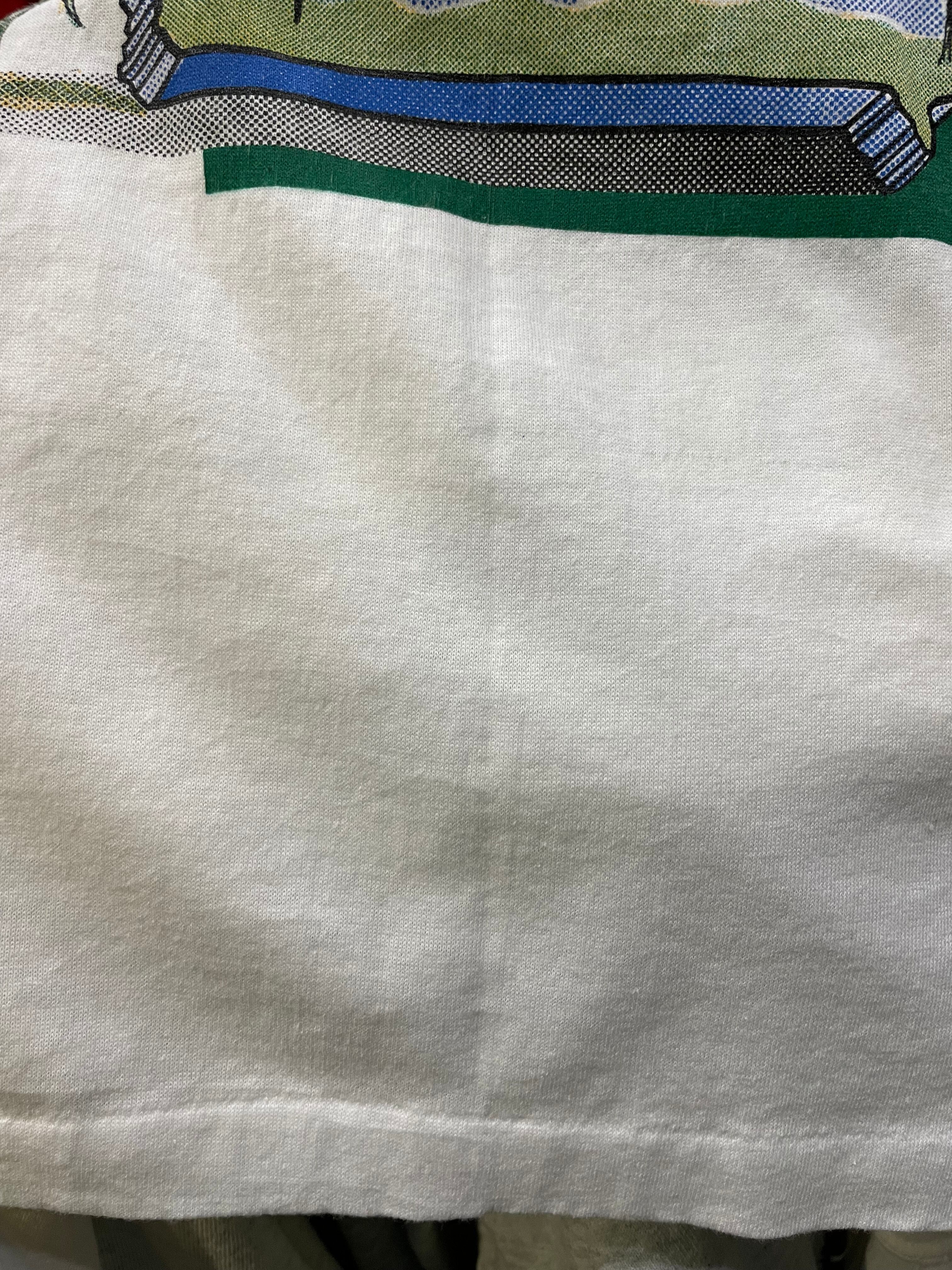 プリントの版の跡のような色移りというか汚れのような箇所や前後中心縦に折り目のようなラインがございます。小さいキズ等使用感のある商品ですので古着にご理解のある方のご購入をお願い致します。