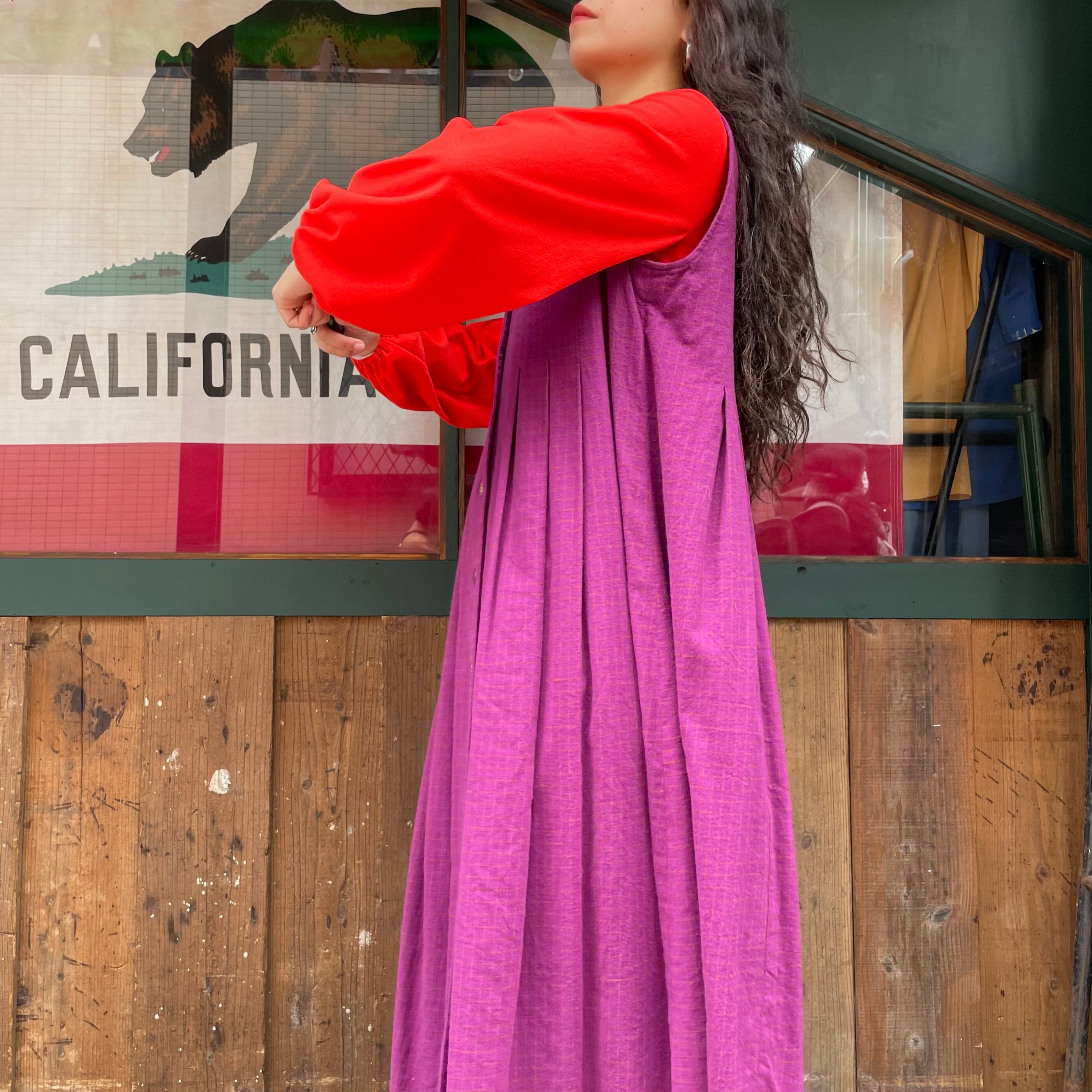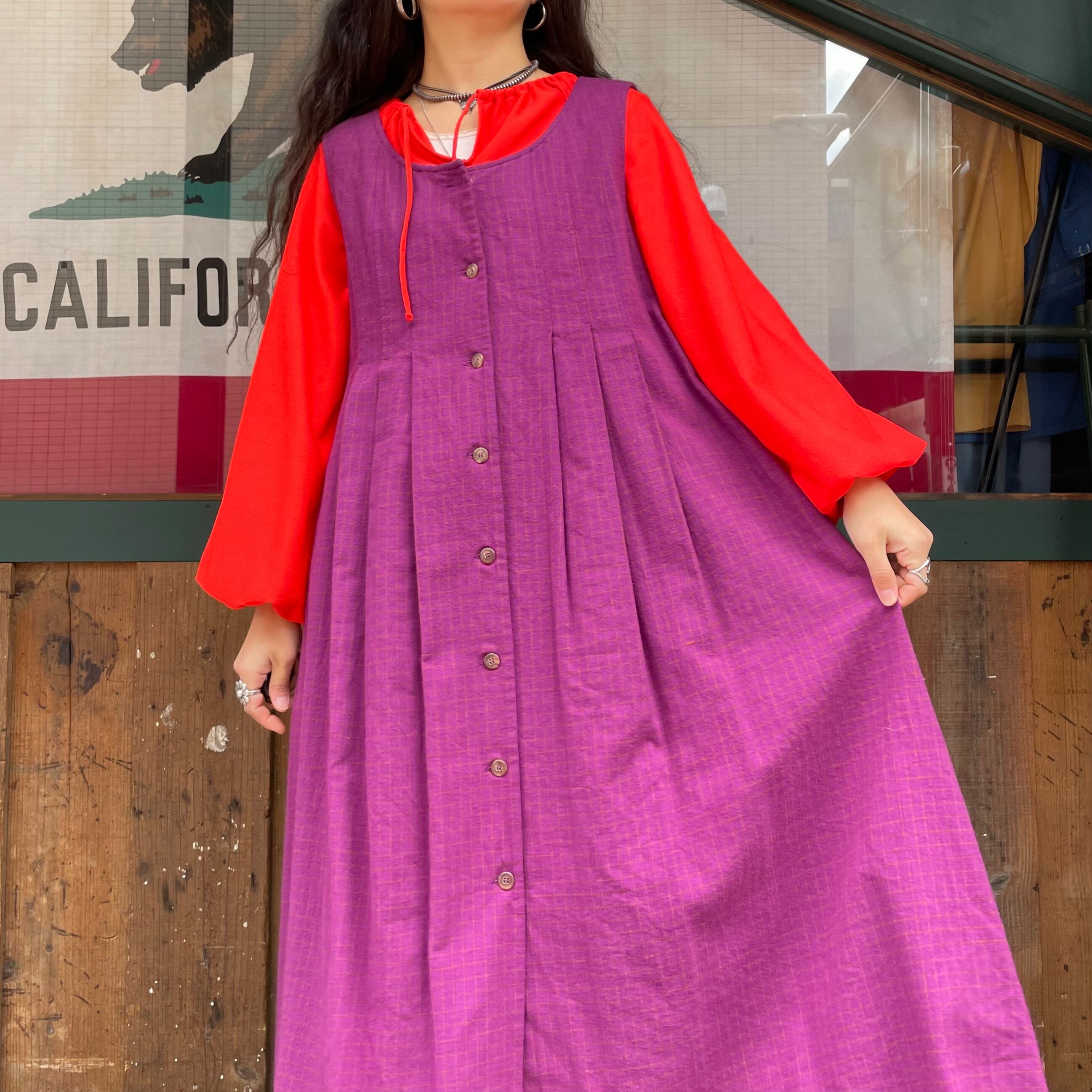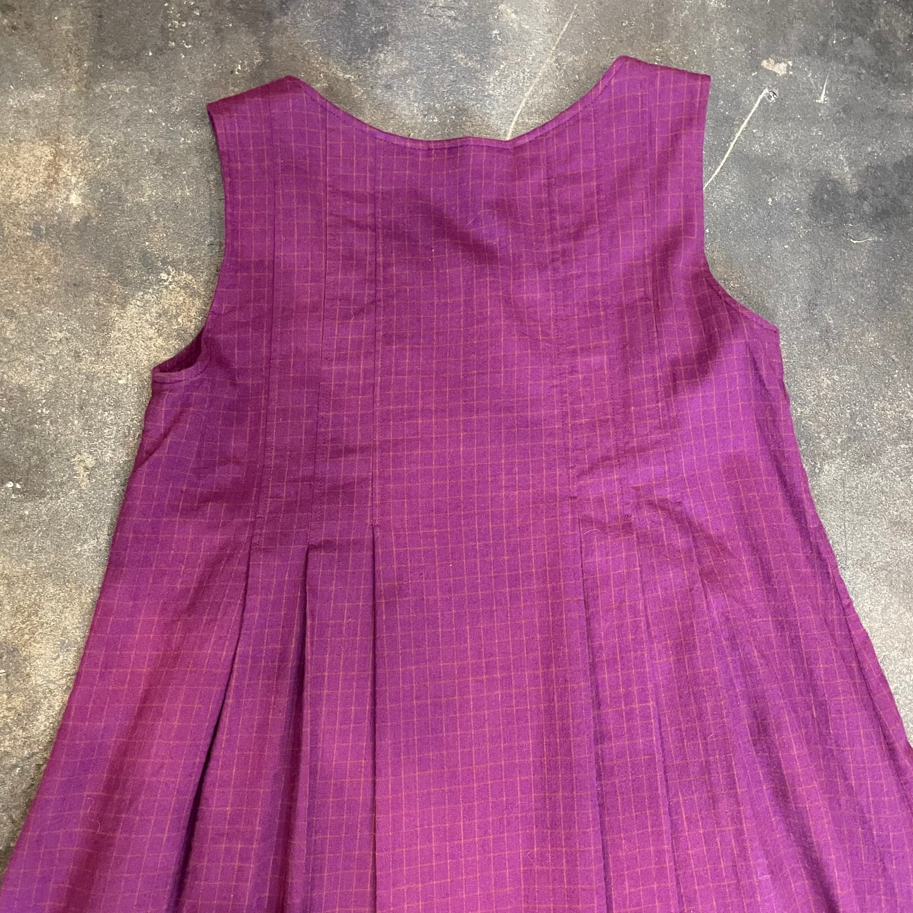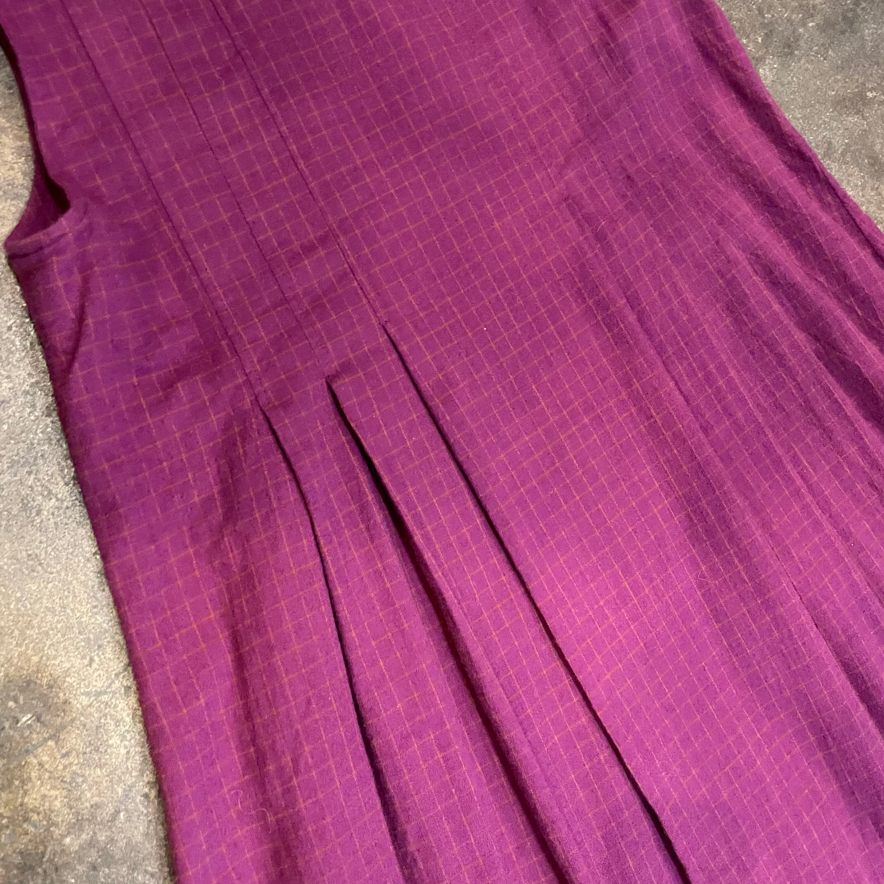 パープルにうっすらオレンジのチェックの生地がかわいいノースリーブのワンピースです。