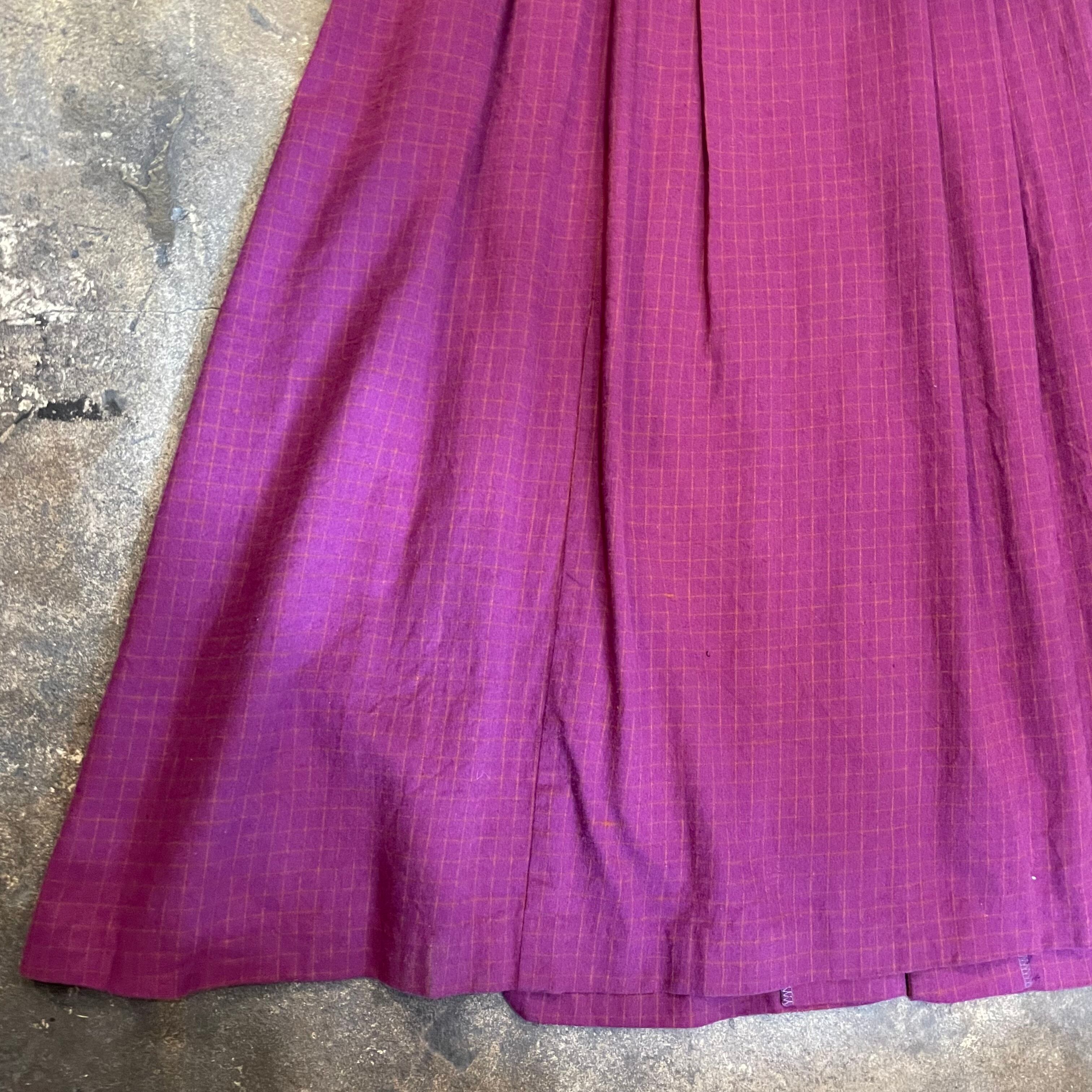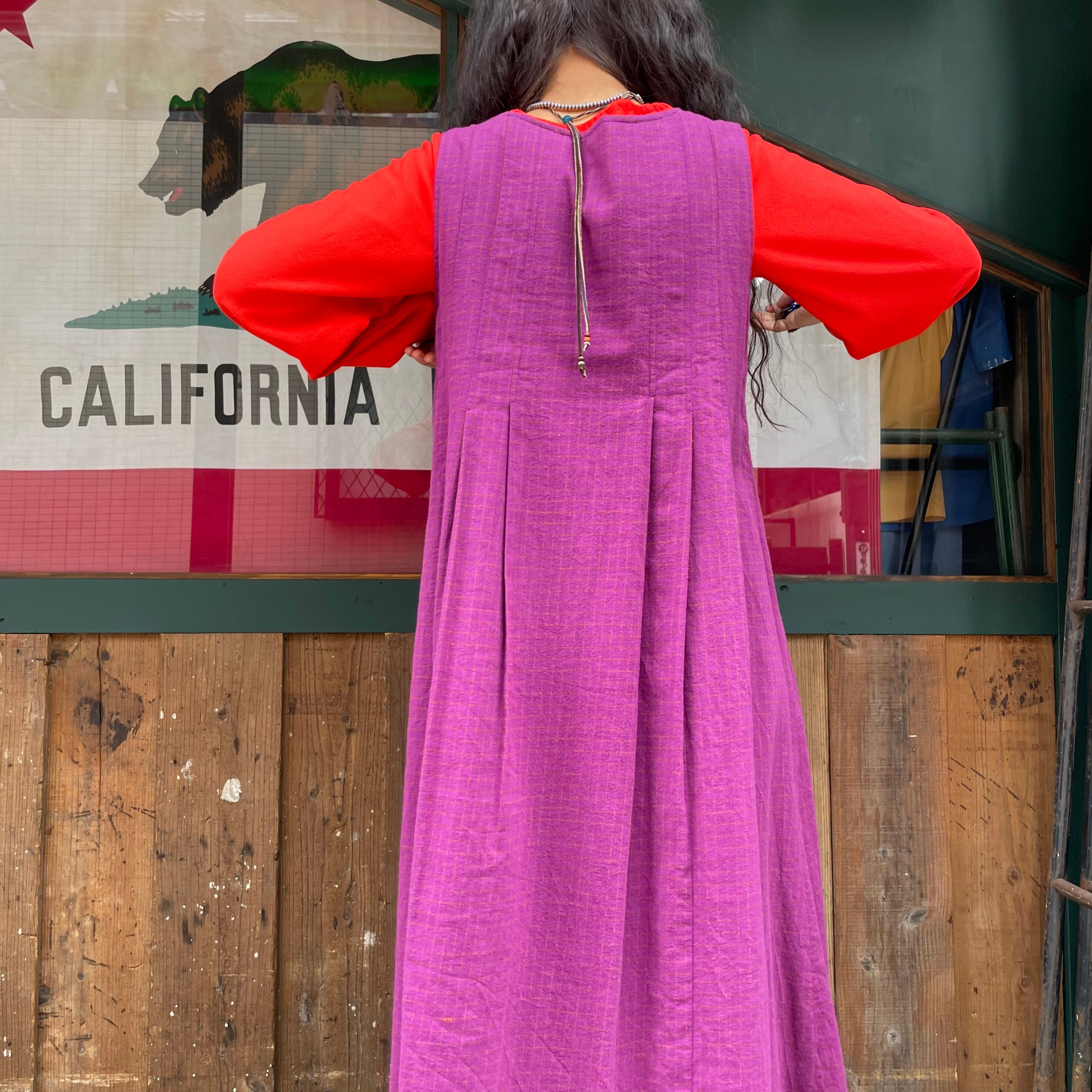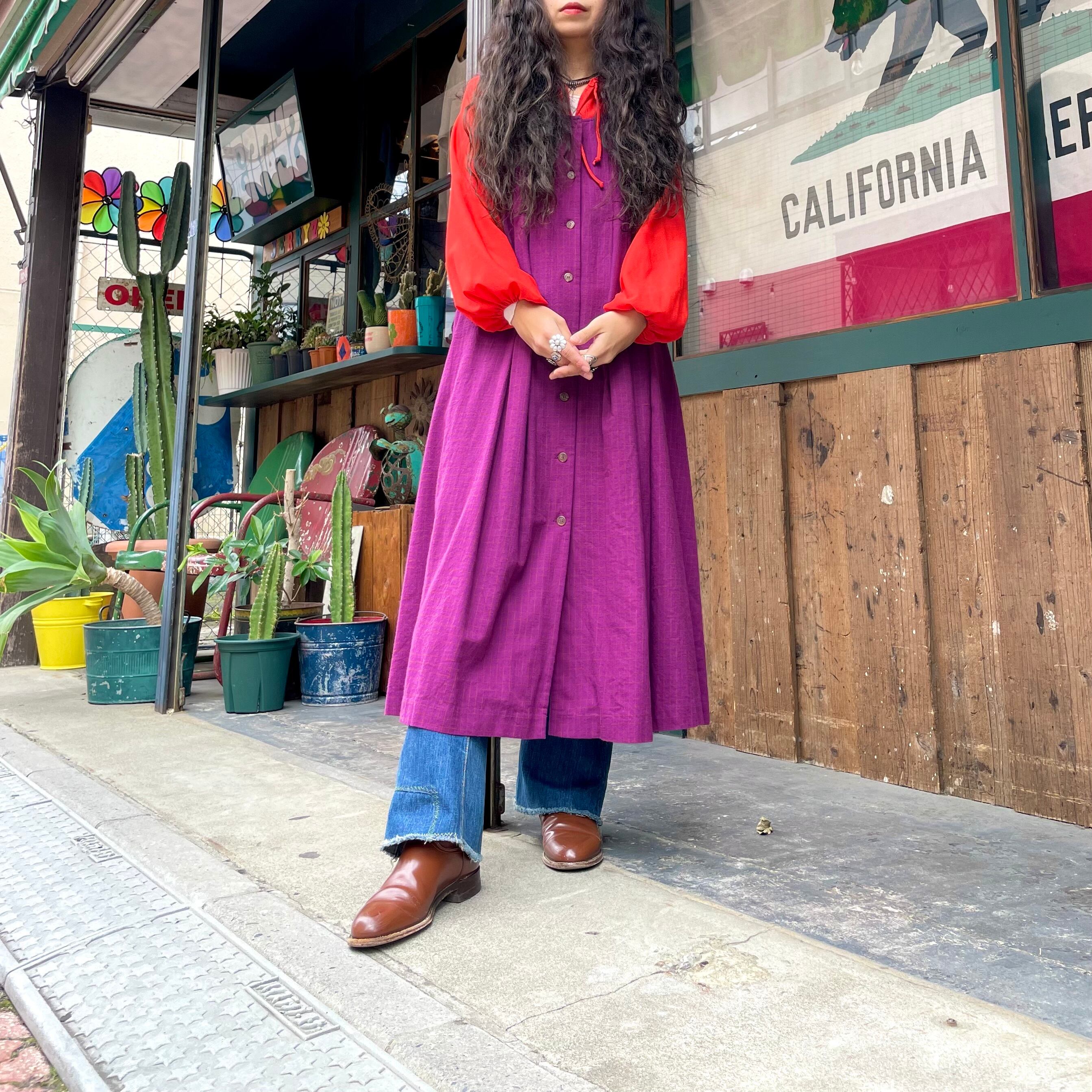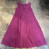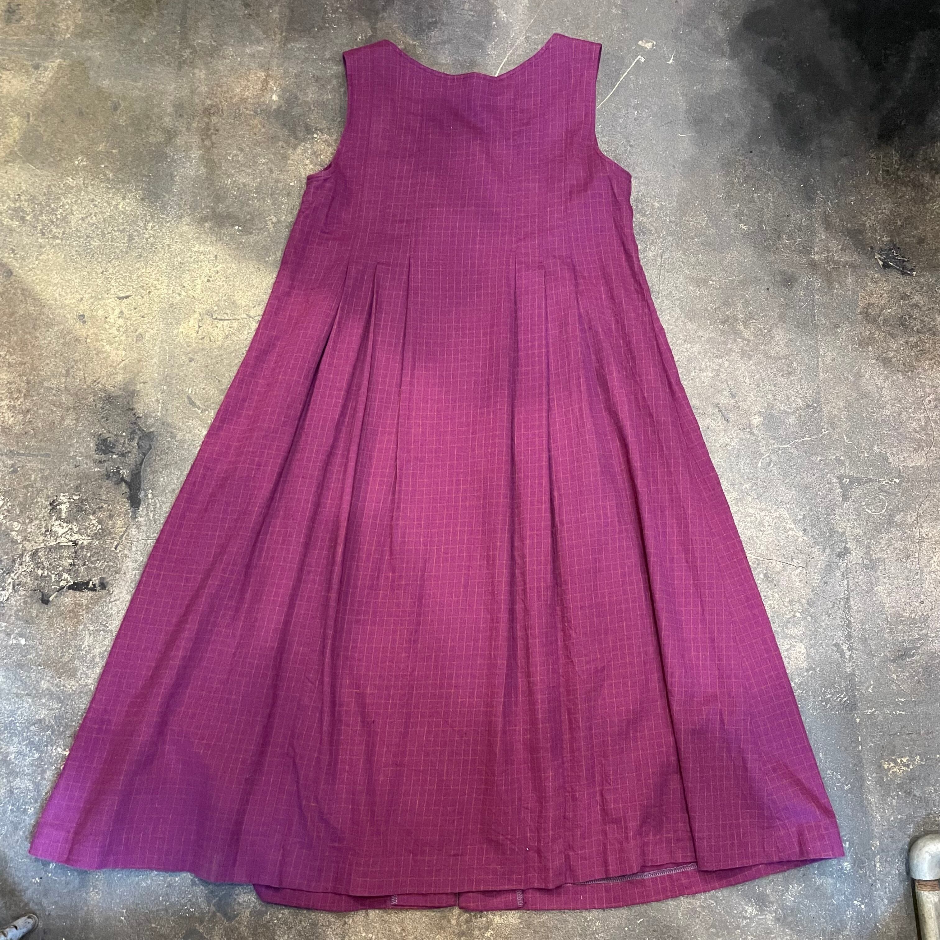 パープルにうっすらオレンジのチェックの生地がかわいいノースリーブのワンピースです。