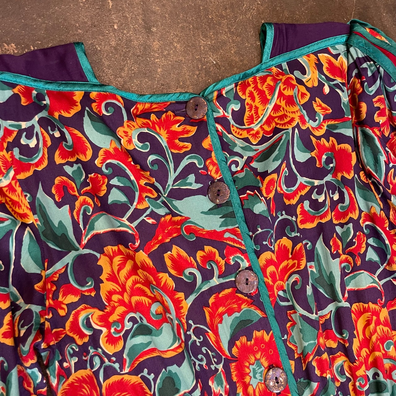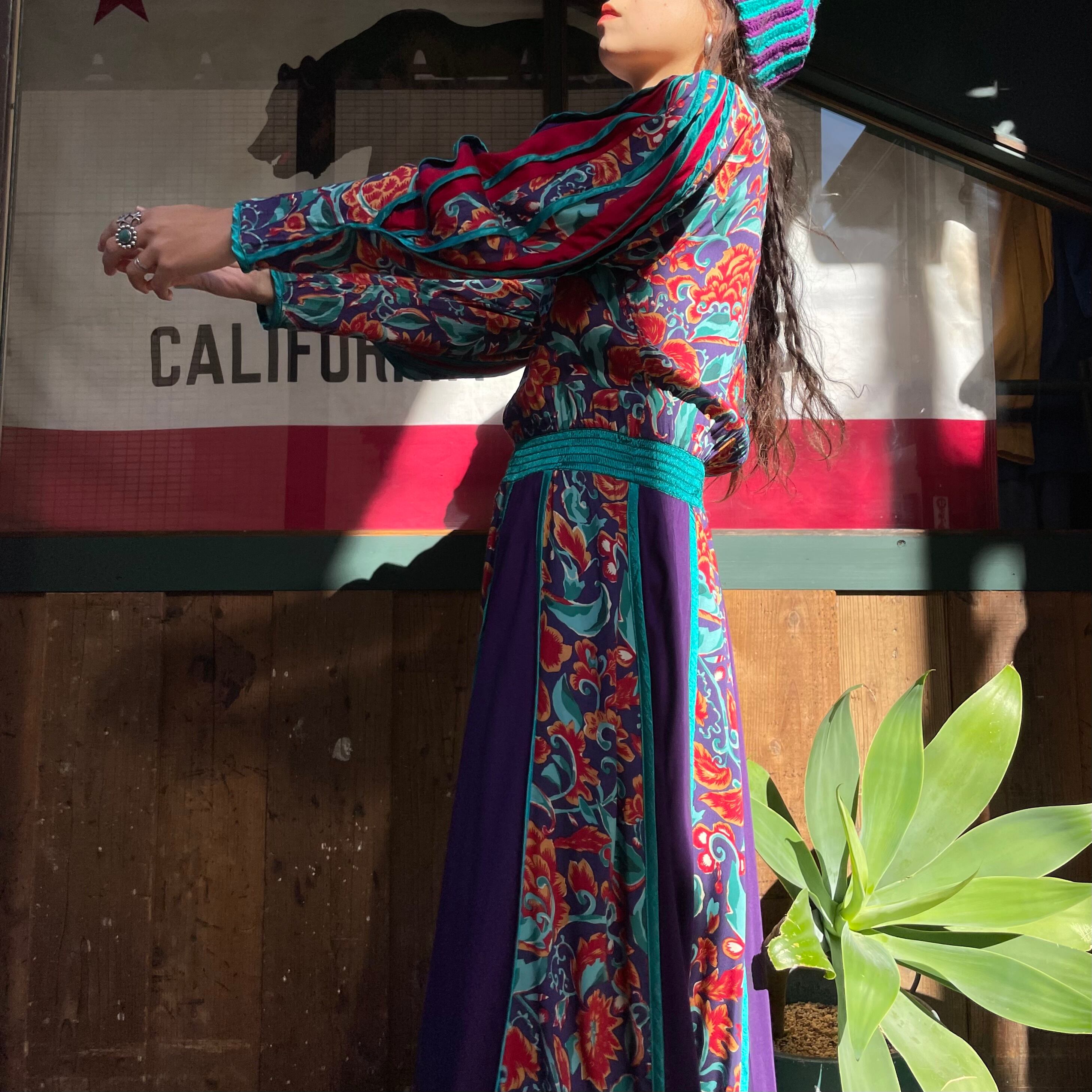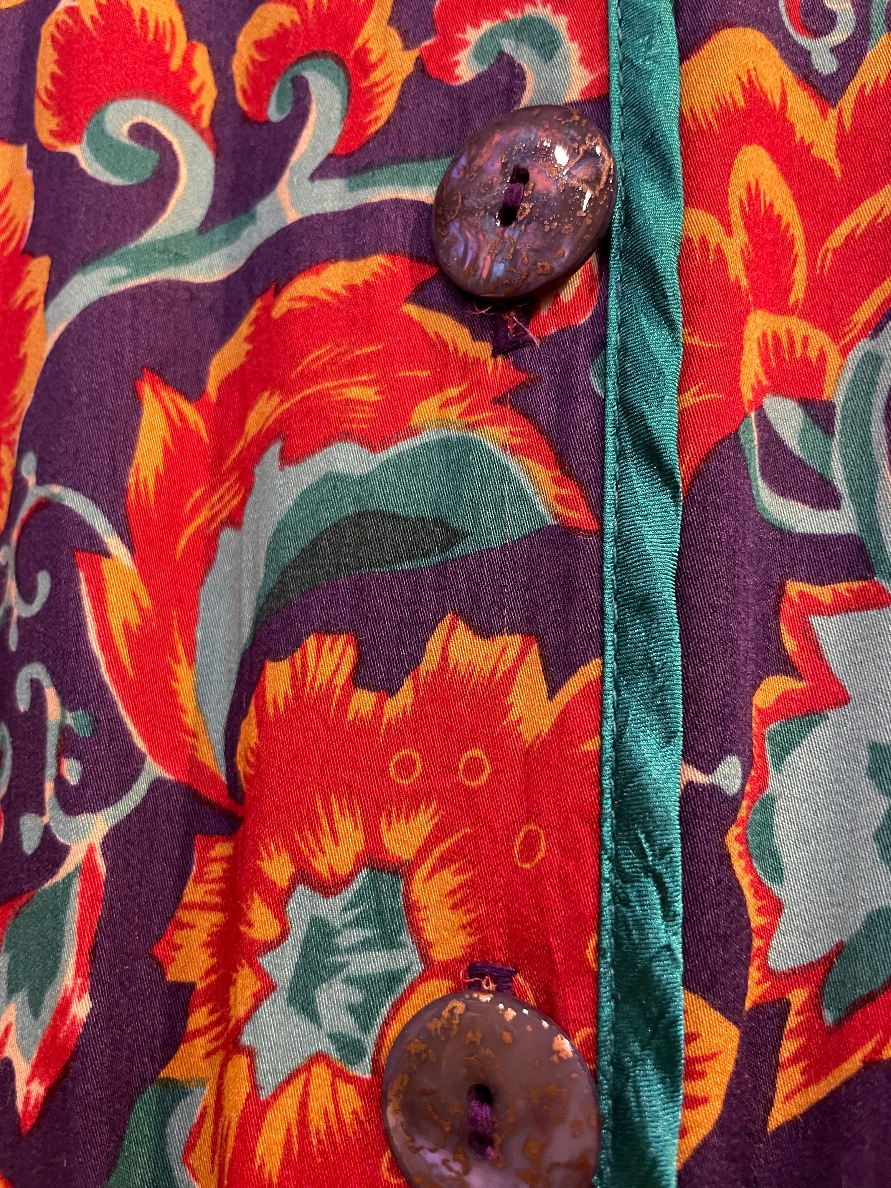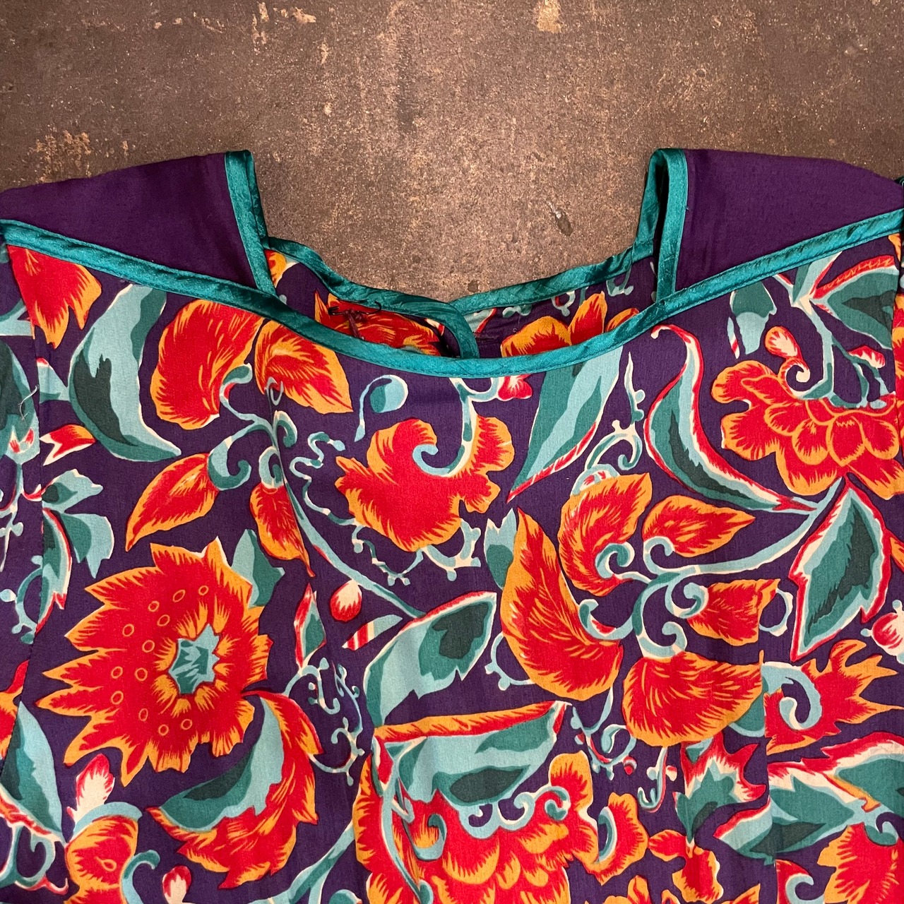 上品な花柄と紫の切り替えにターコイズブルーのパイピング、とても素敵な一着です。