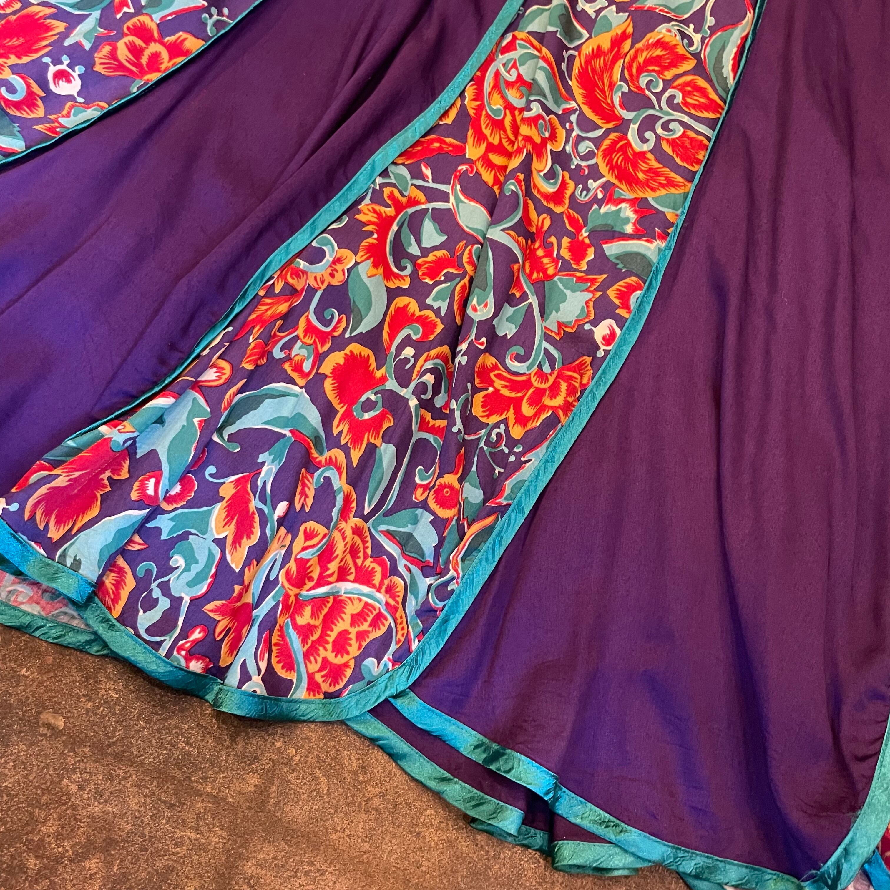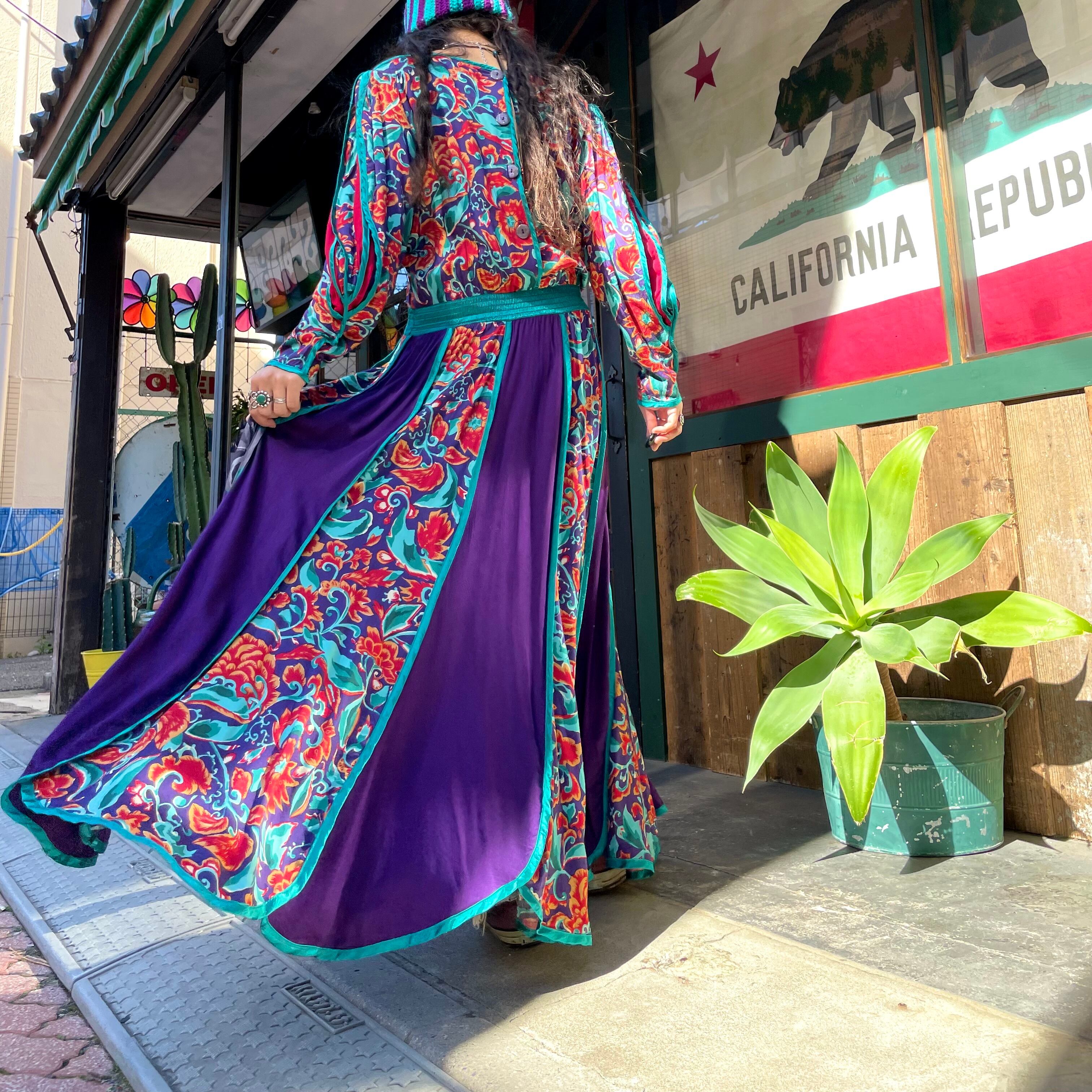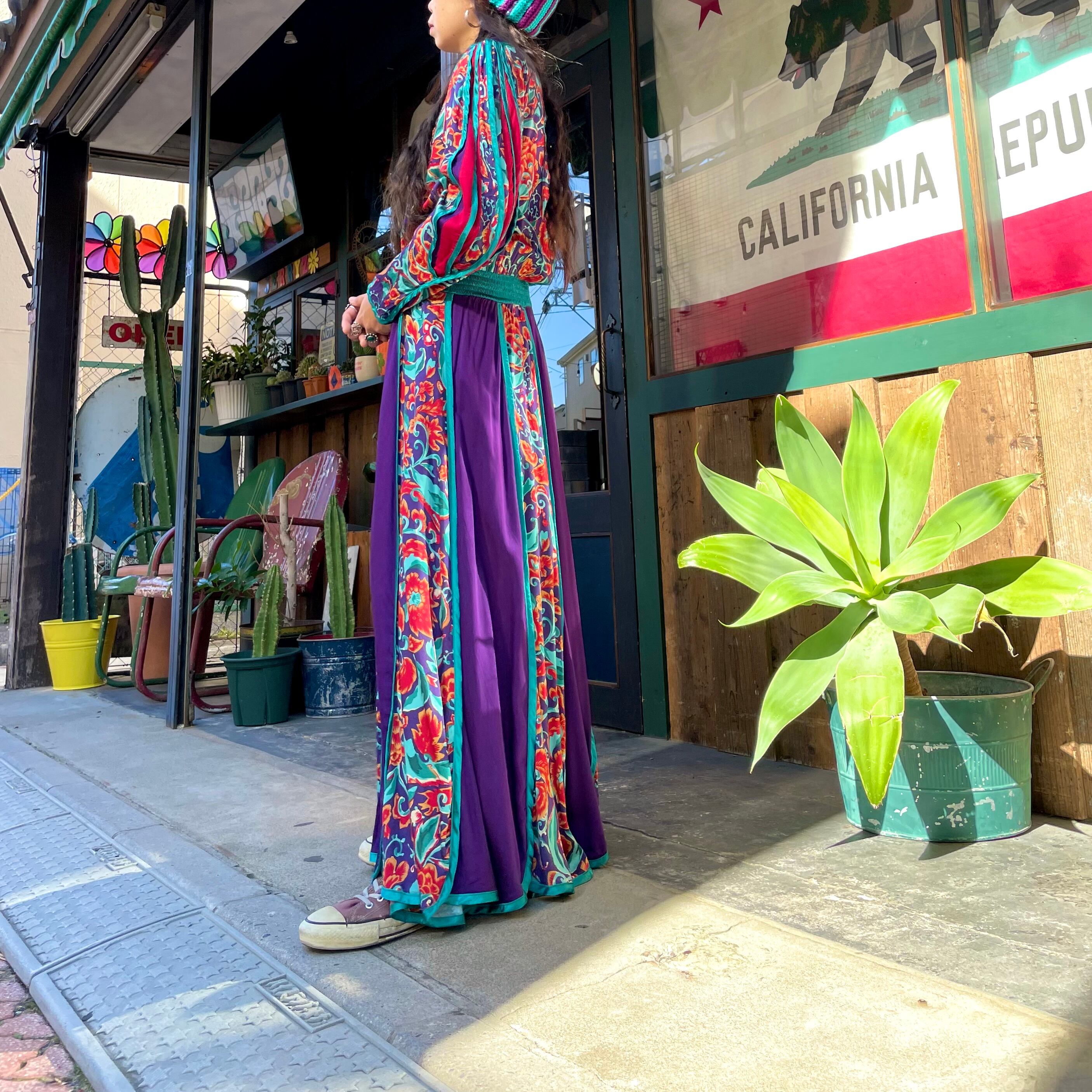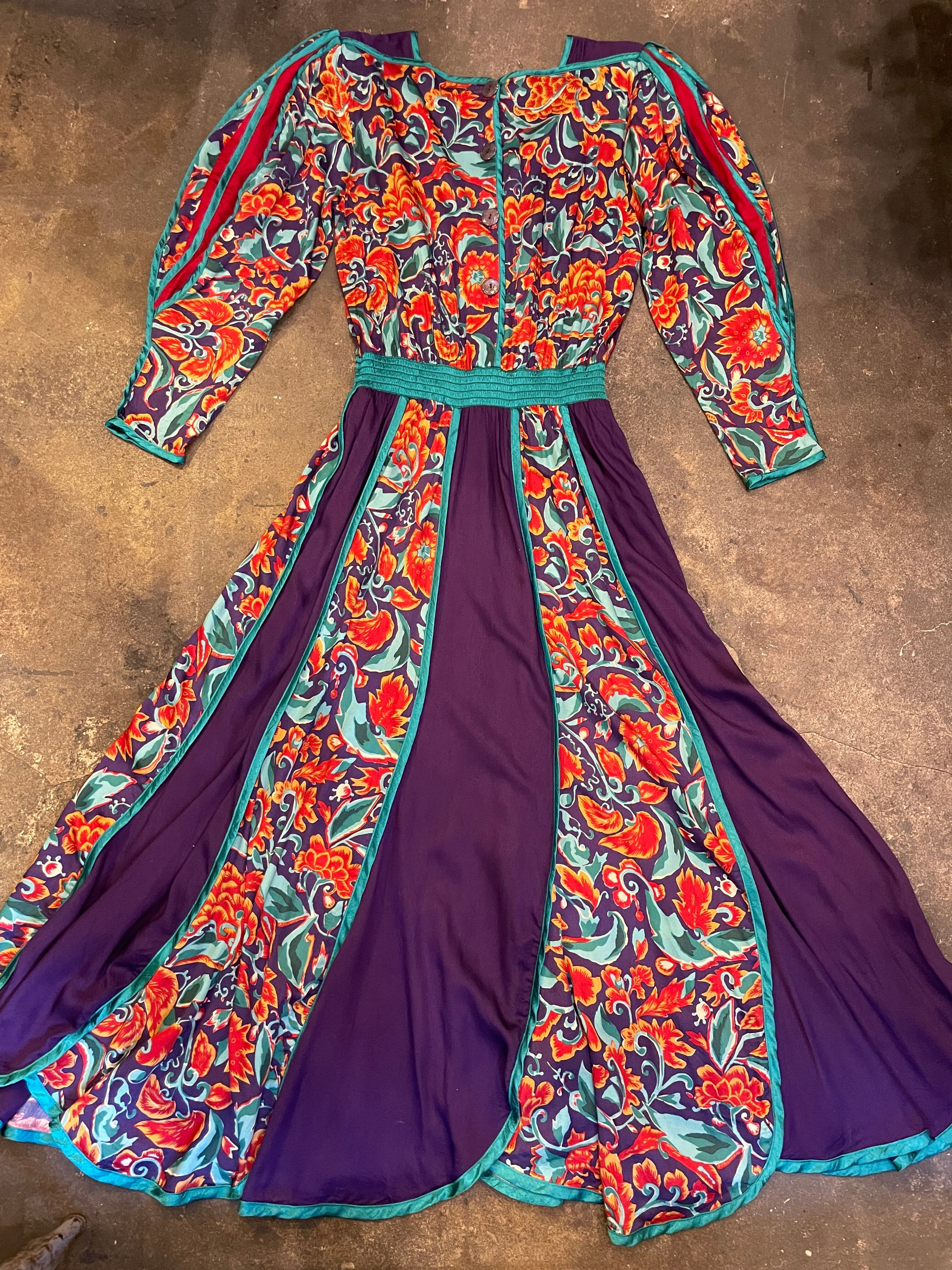 上品な花柄と紫の切り替えにターコイズブルーのパイピング、とても素敵な一着です。