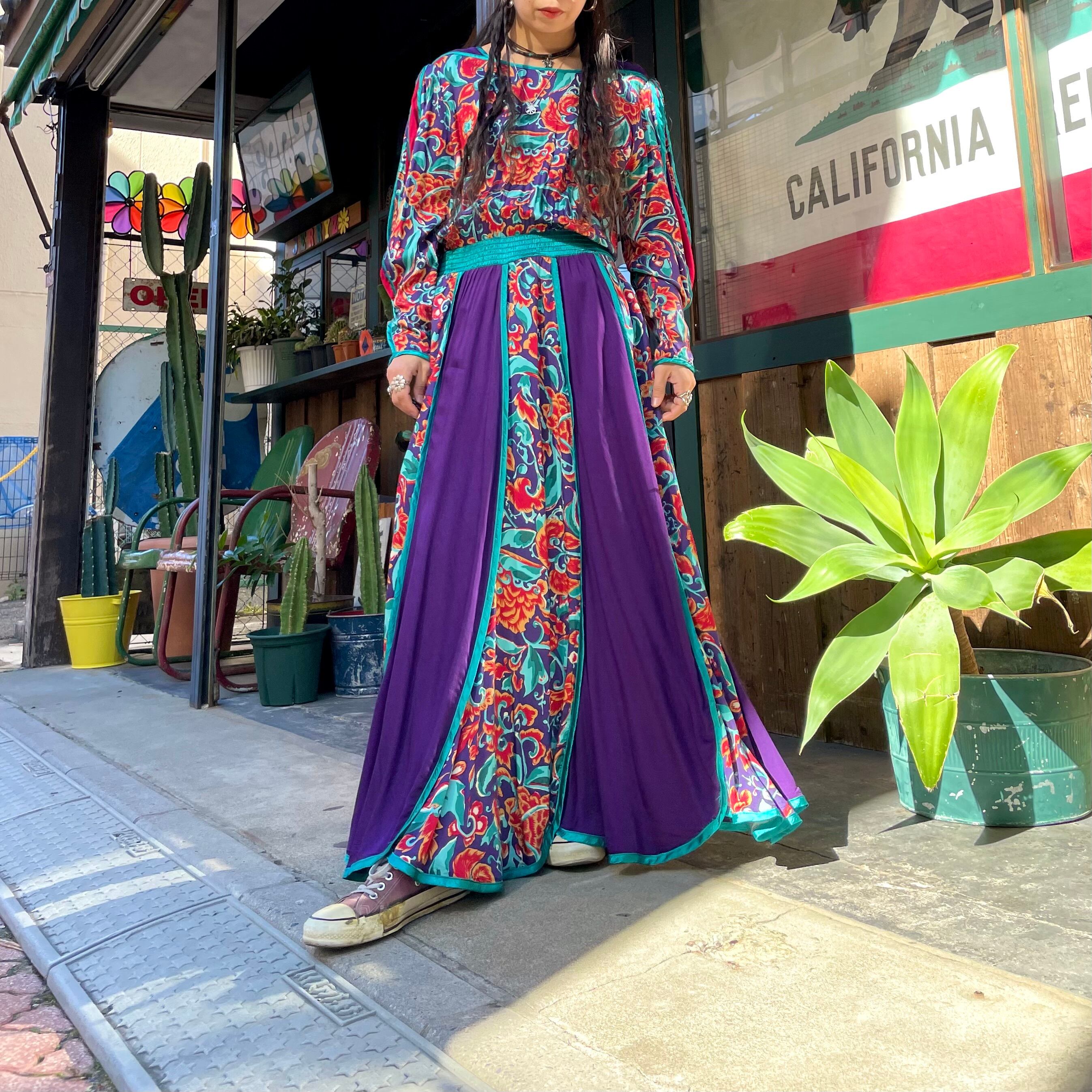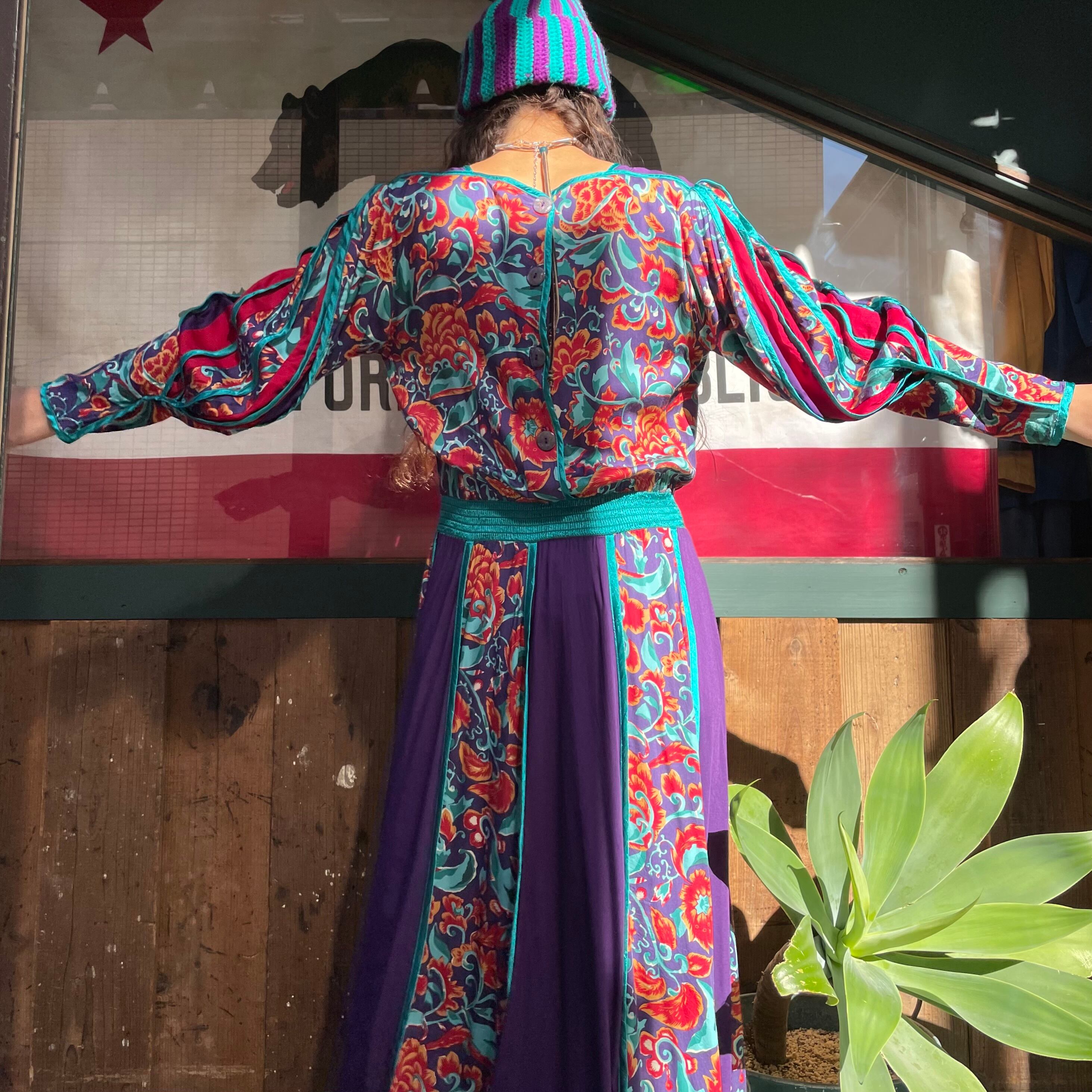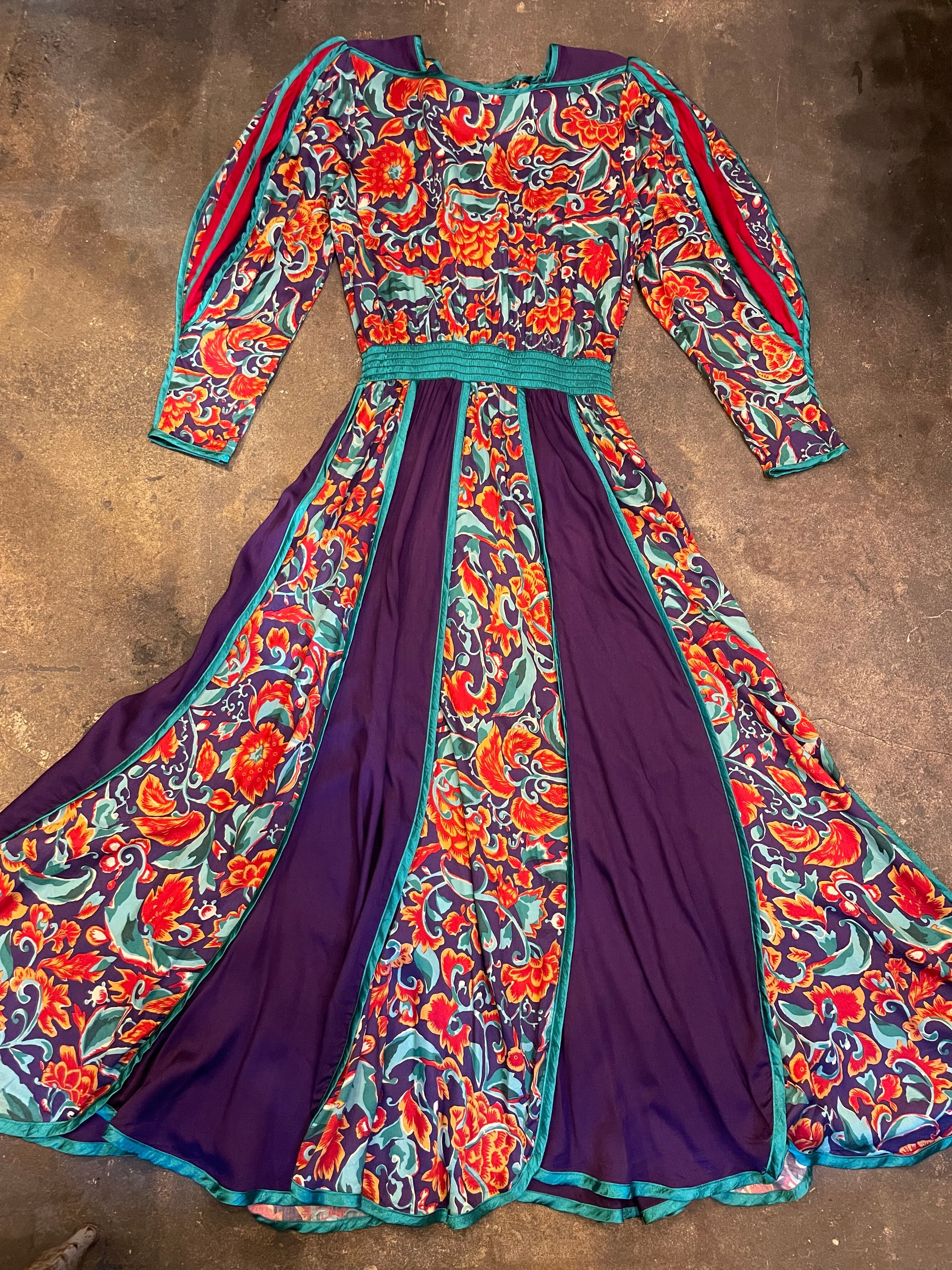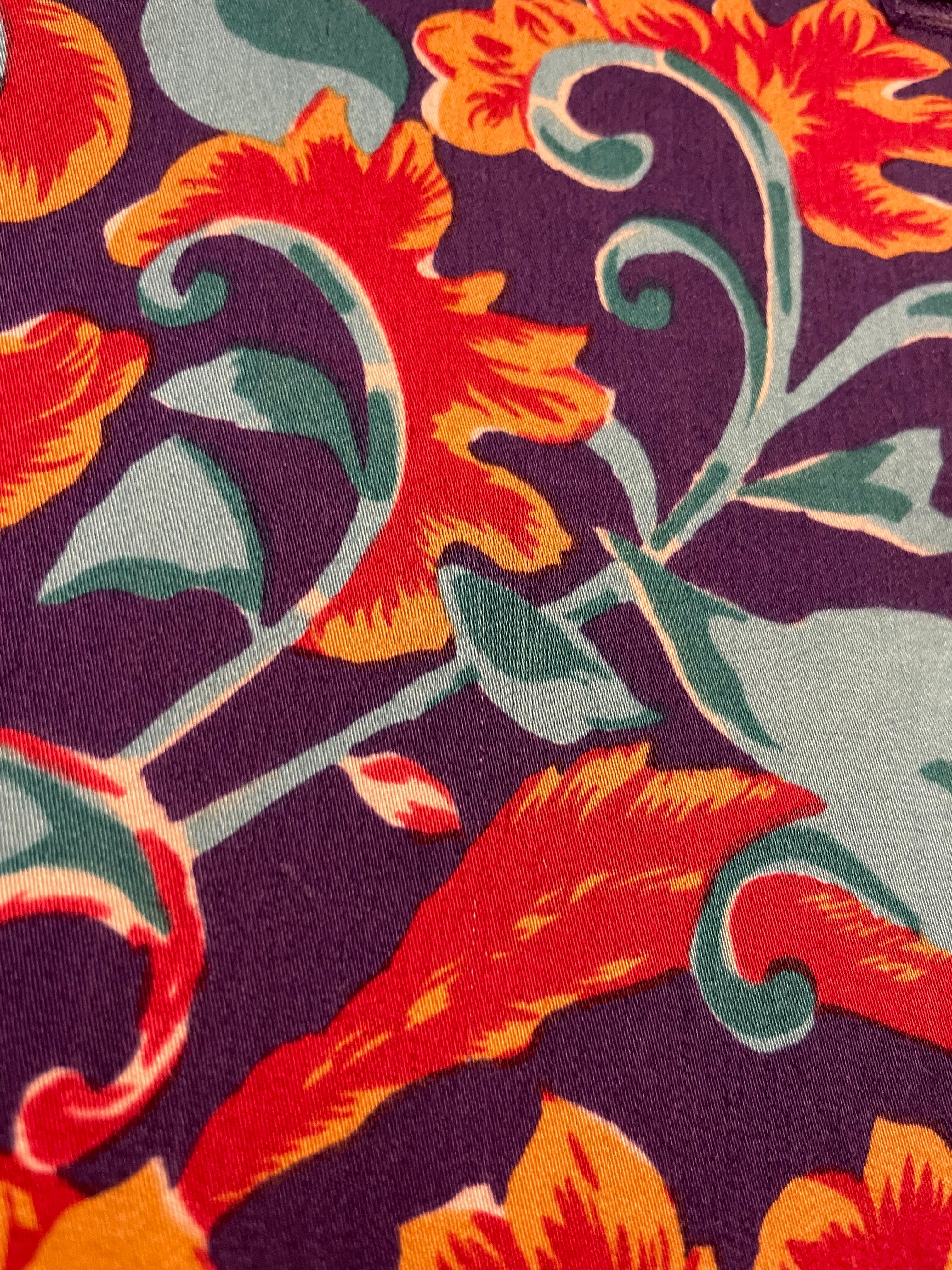 上品な花柄と紫の切り替えにターコイズブルーのパイピング、とても素敵な一着です。