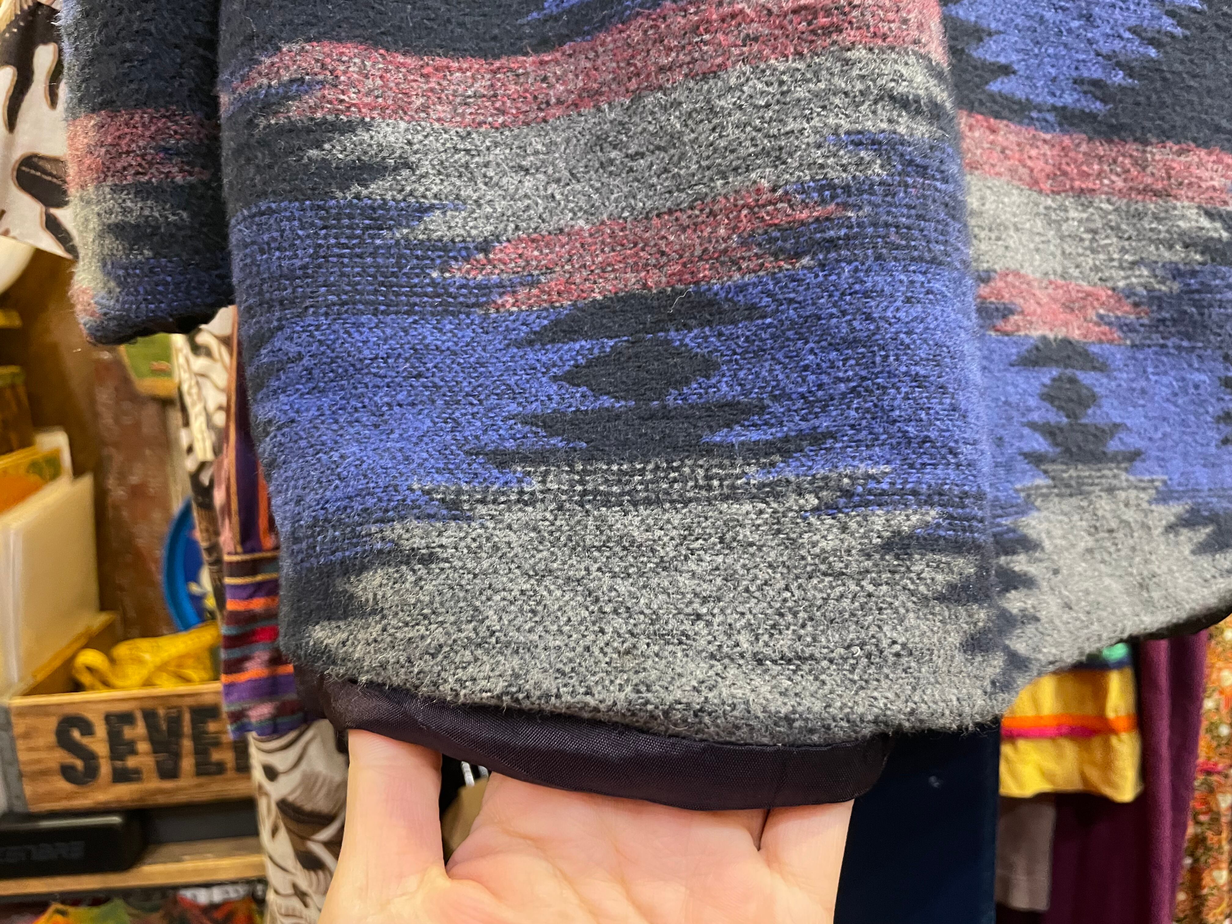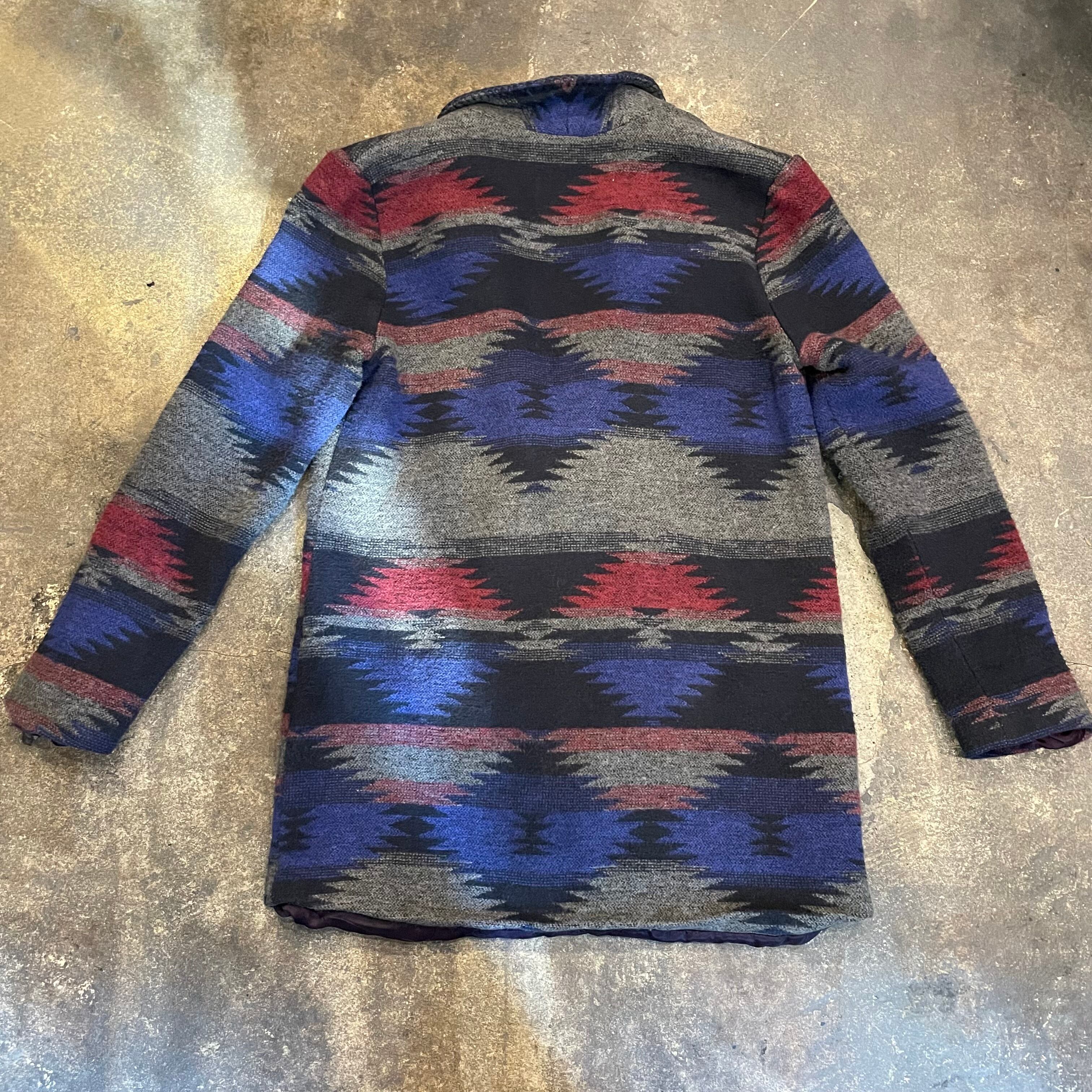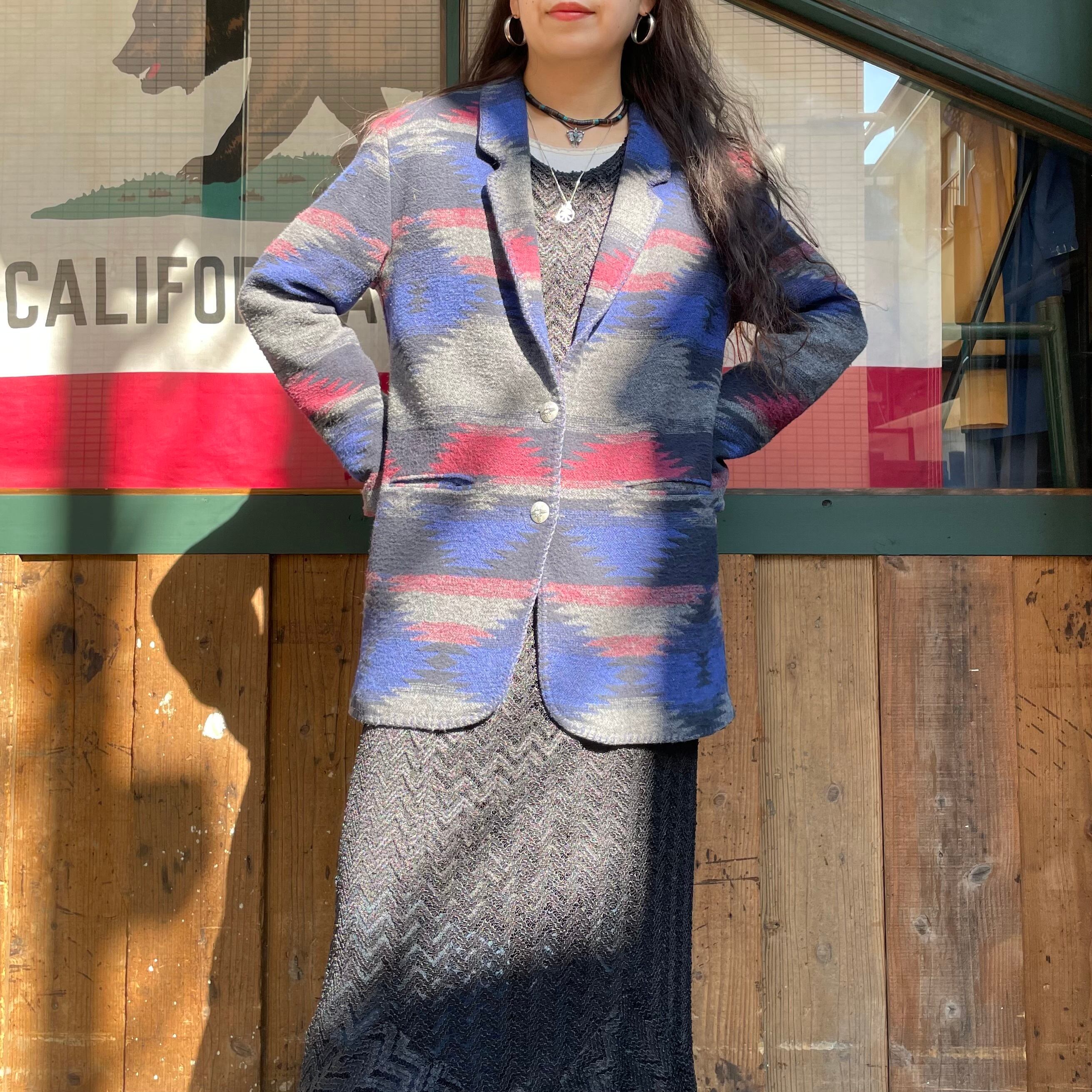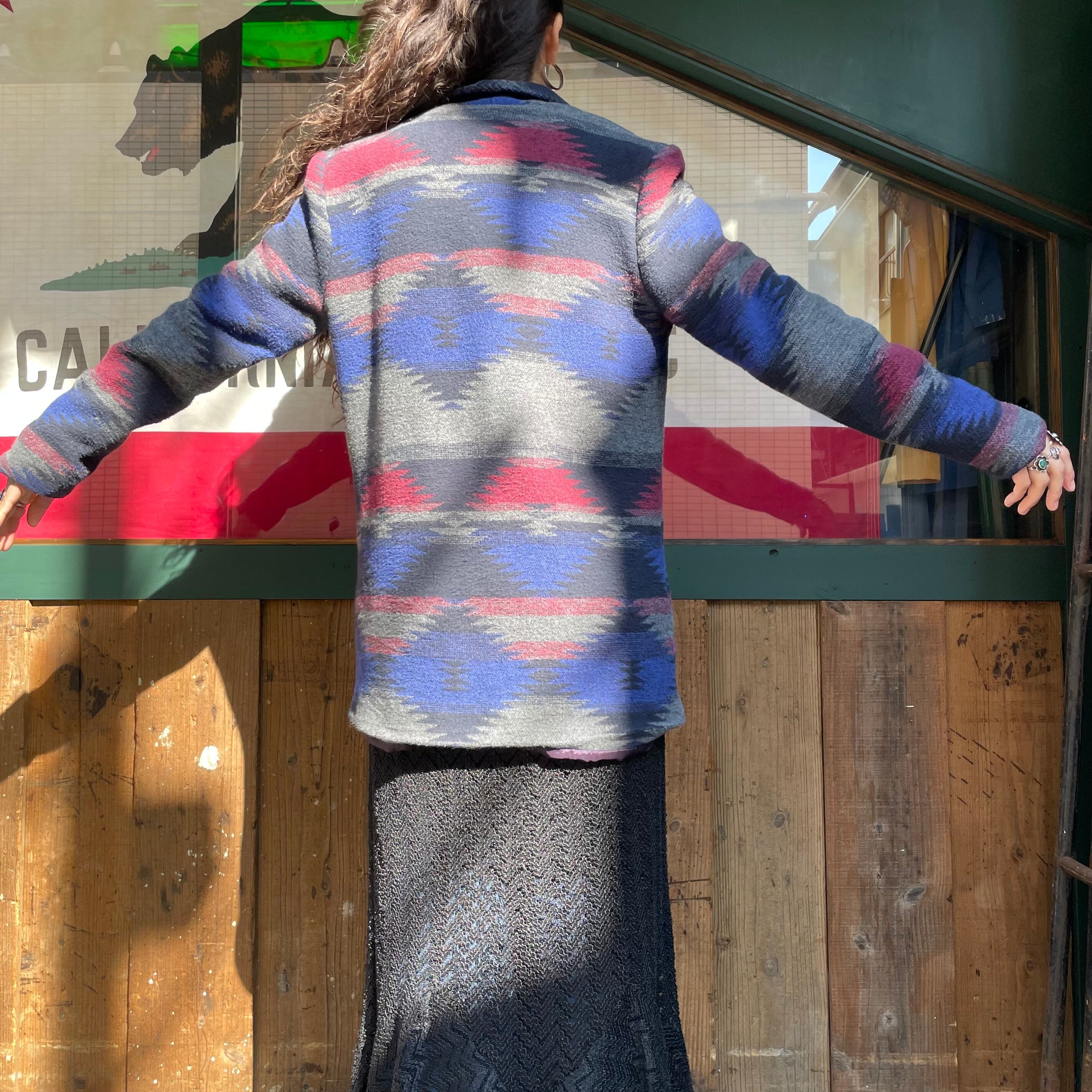 青グレーベースで雰囲気のあるネイティブ柄がかっこいいジャケットです。