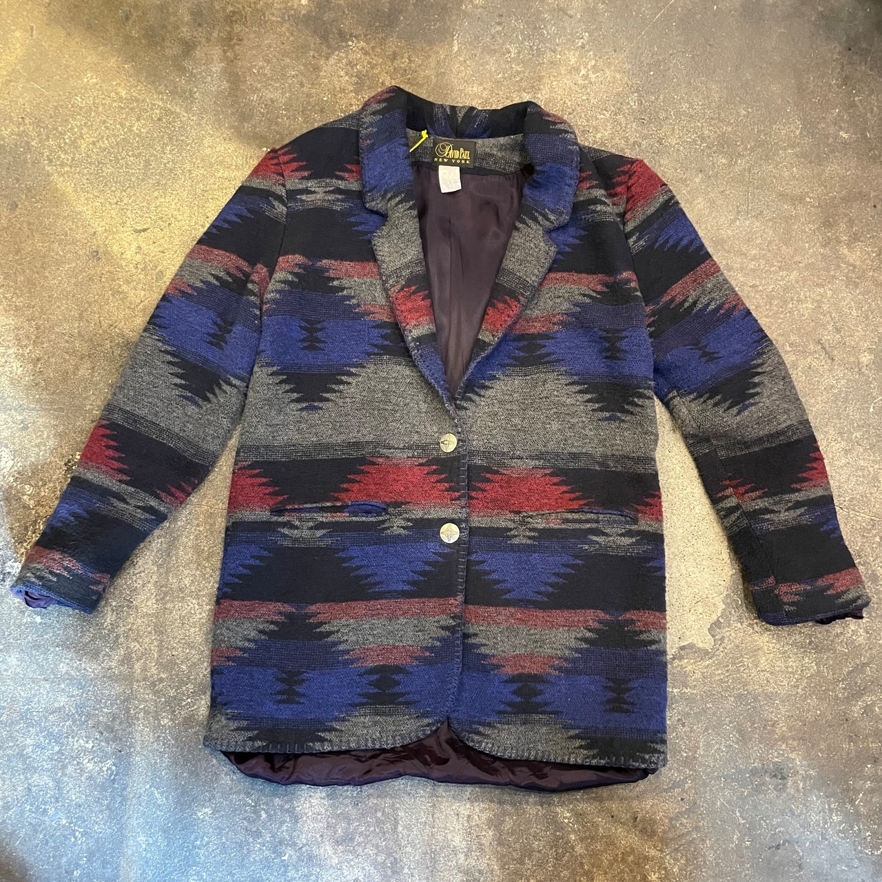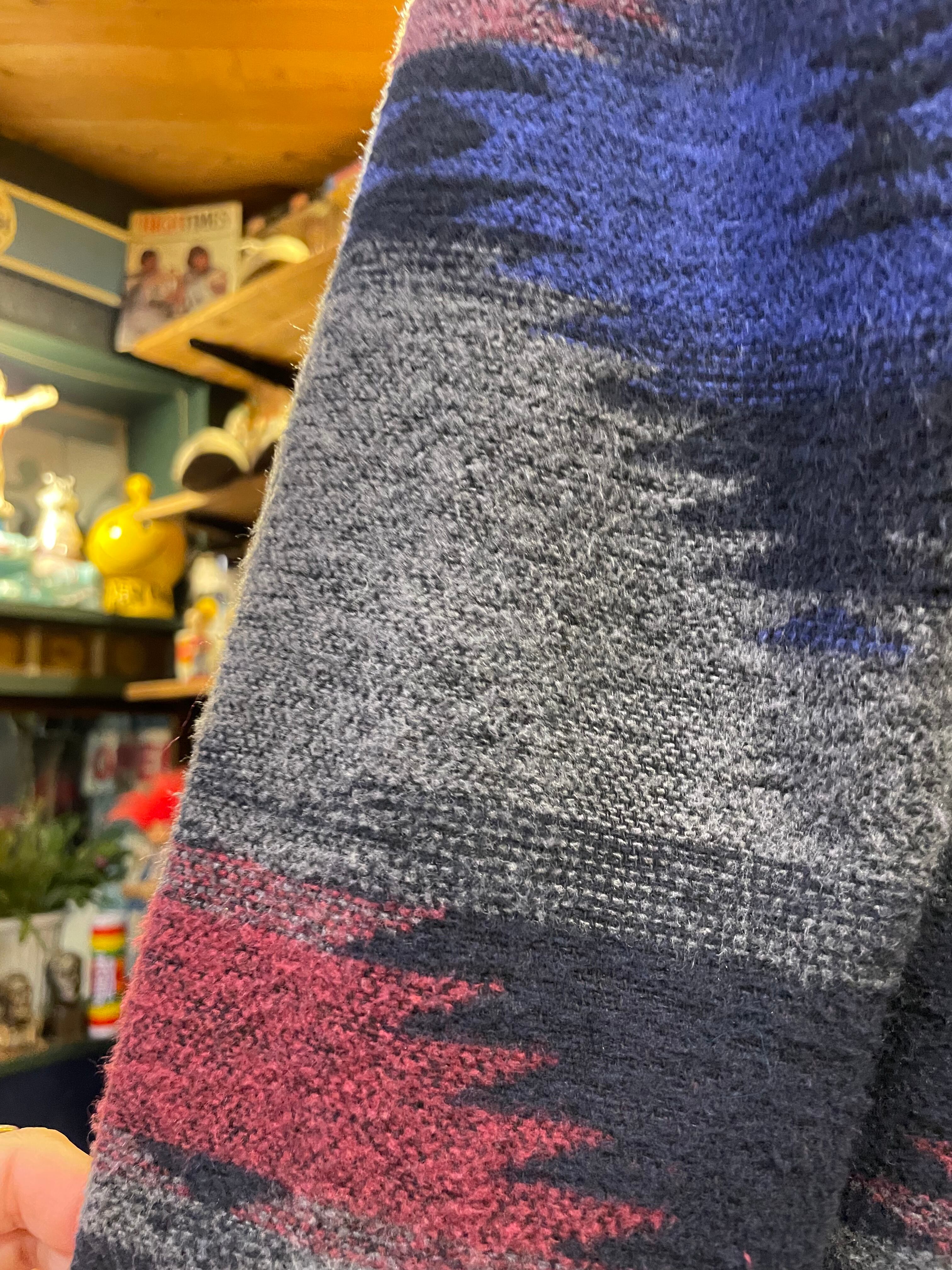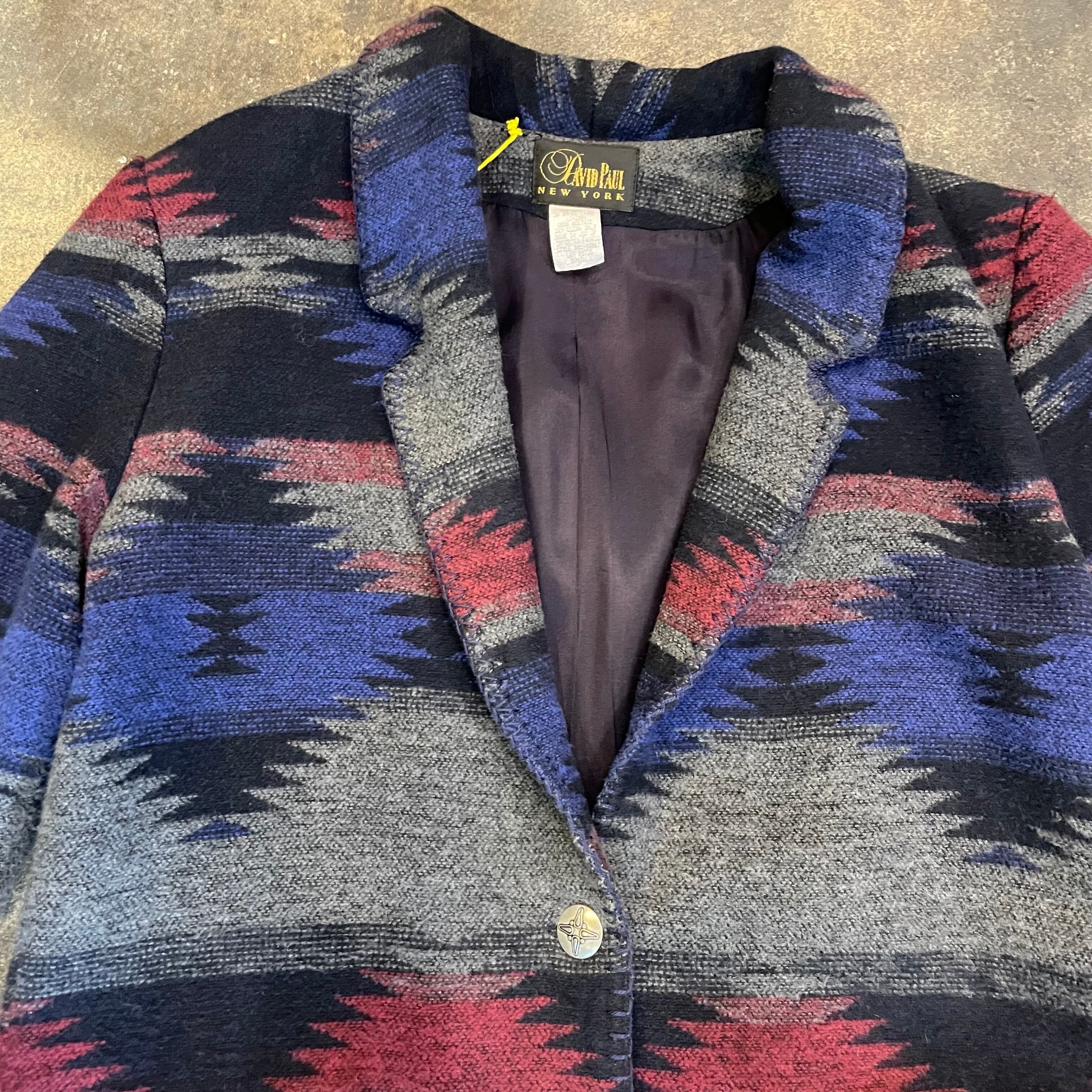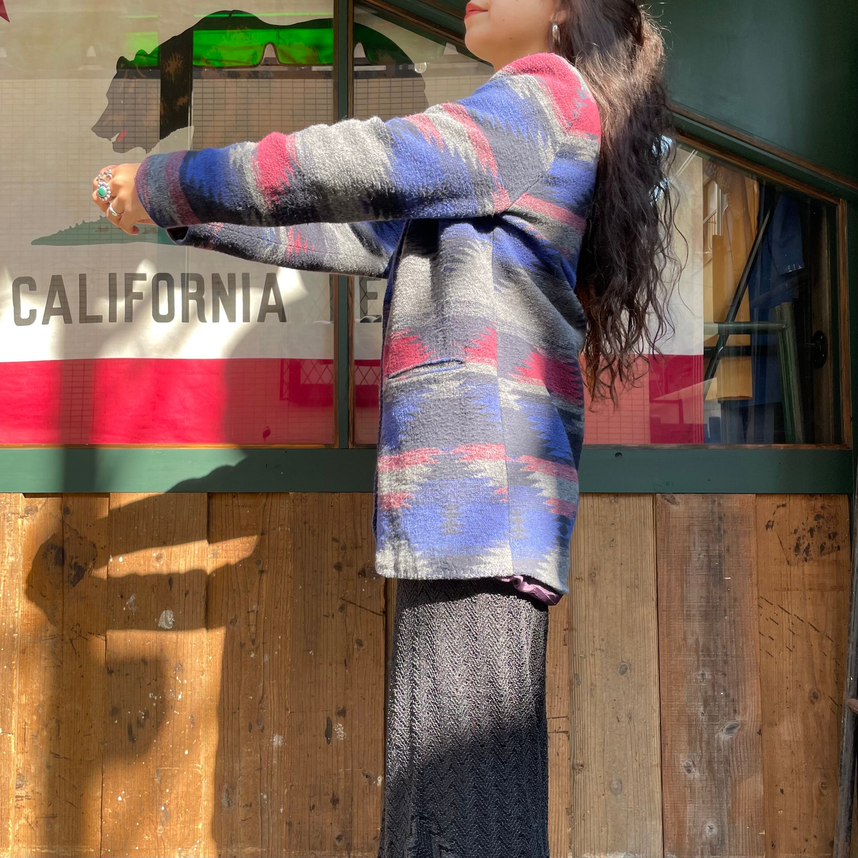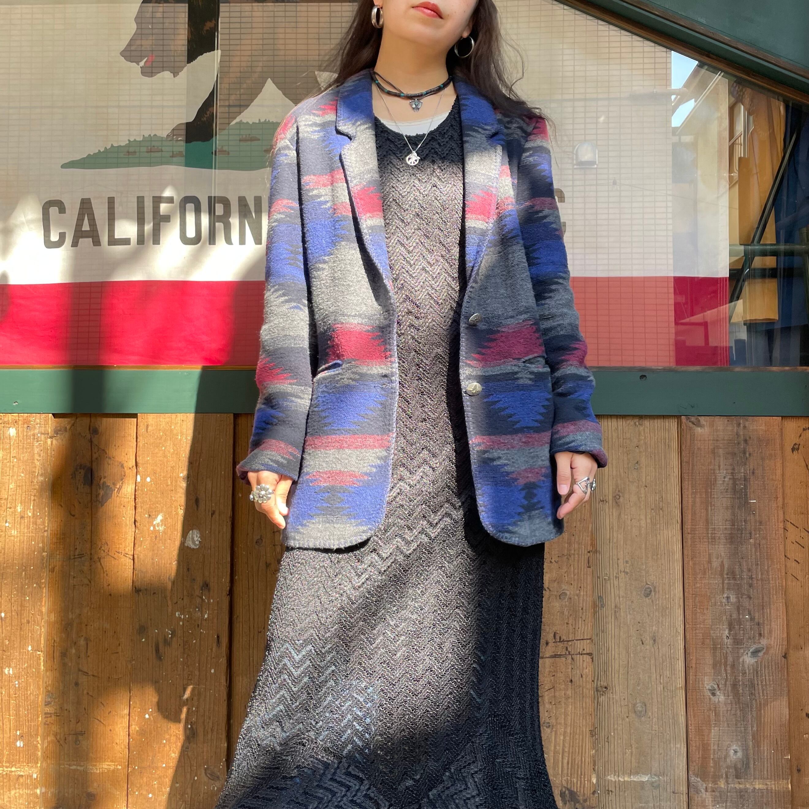 青グレーベースで雰囲気のあるネイティブ柄がかっこいいジャケットです。