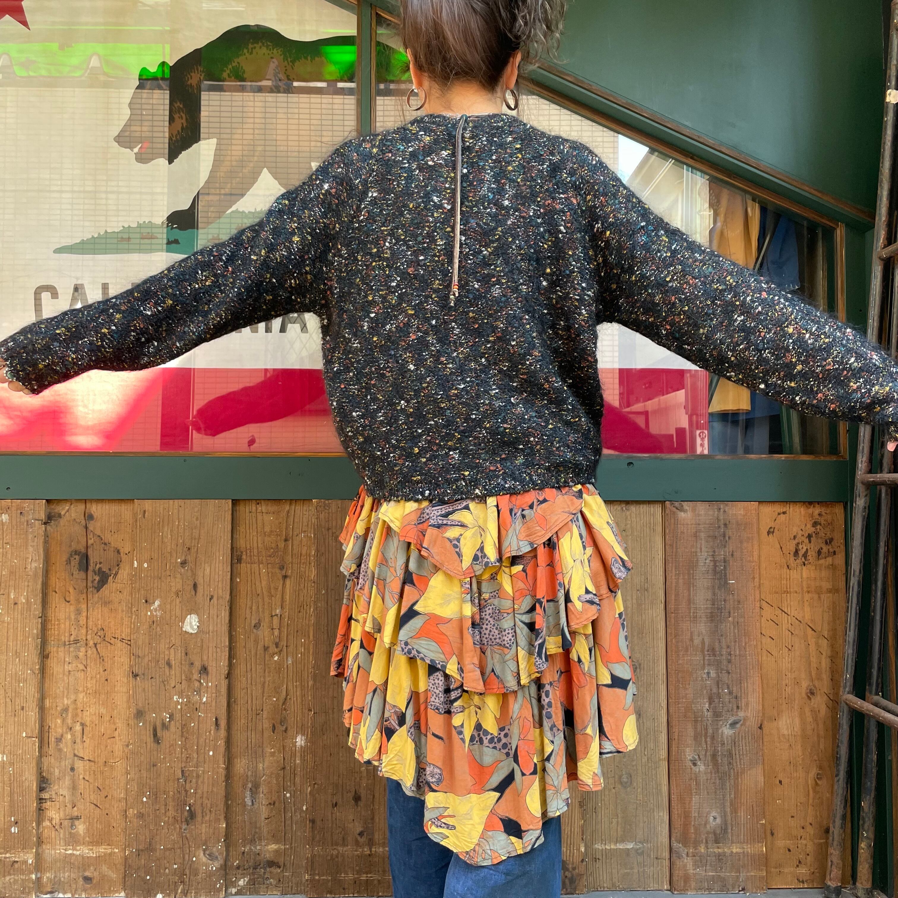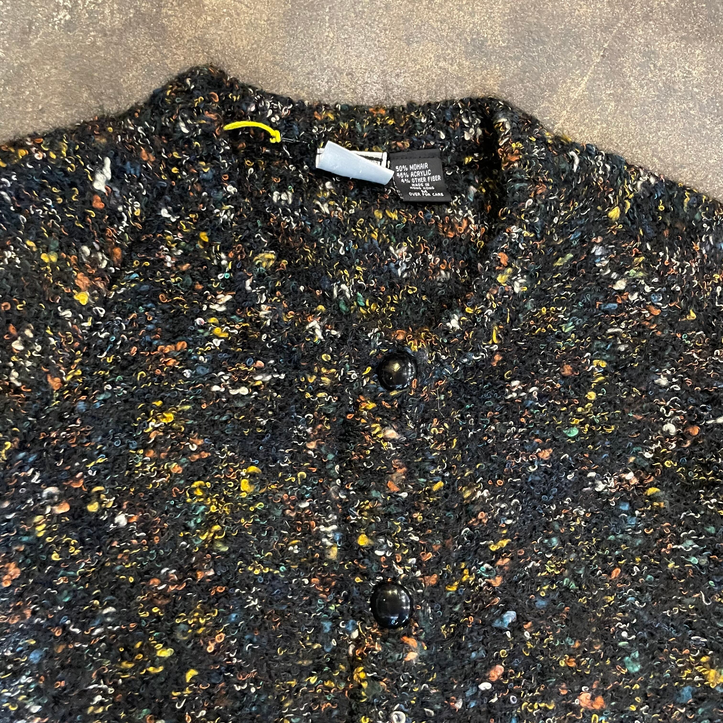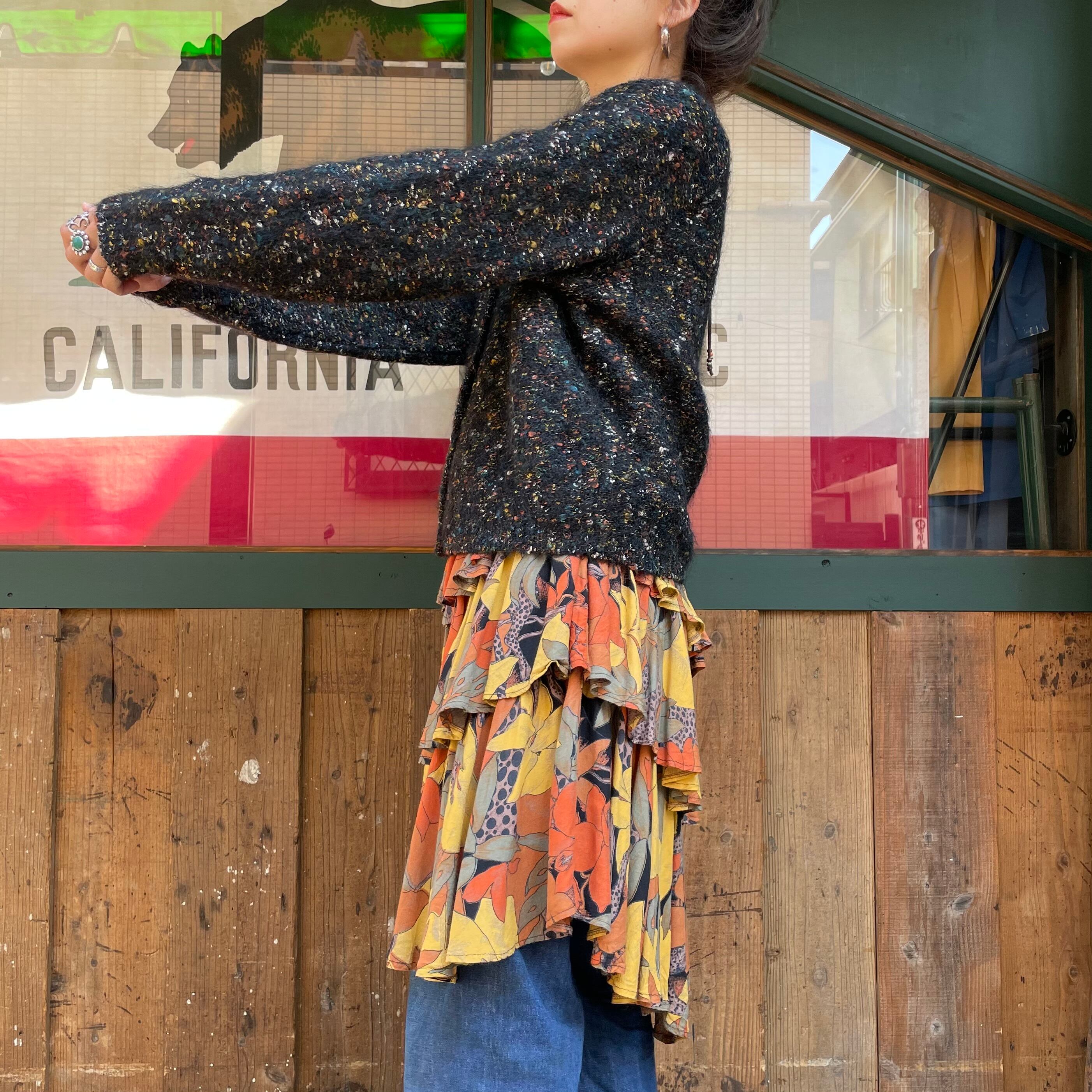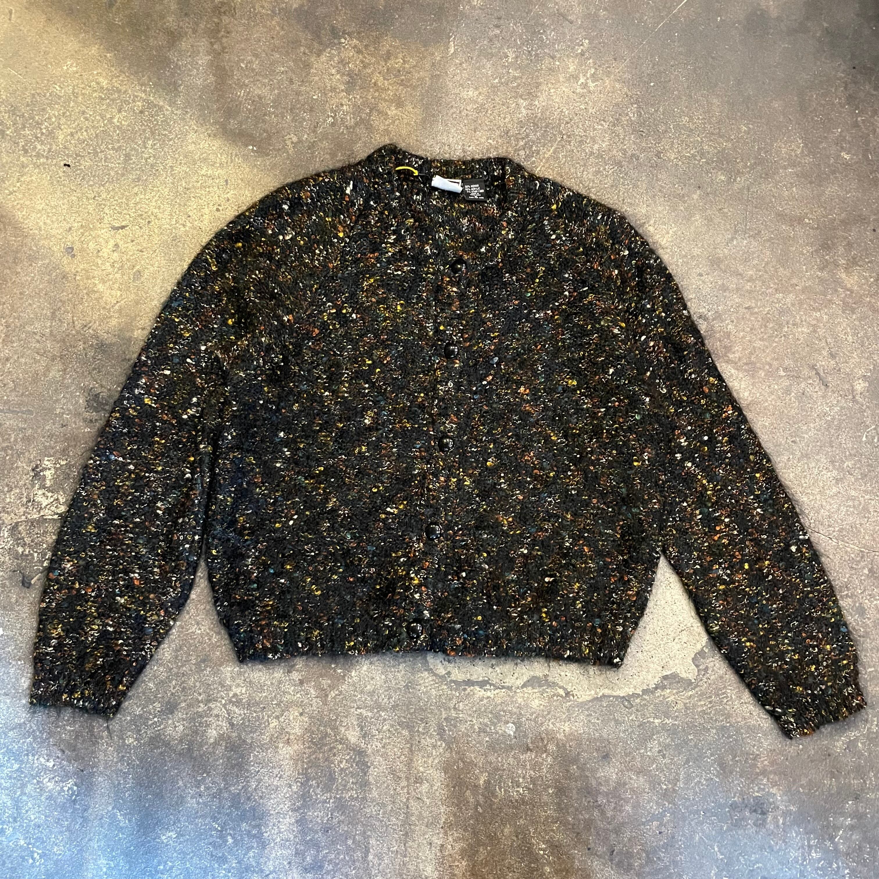 黒ベースに青や黄色オレンジ、白などのミックスカラーがかわいいニットカーディガンです。