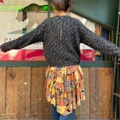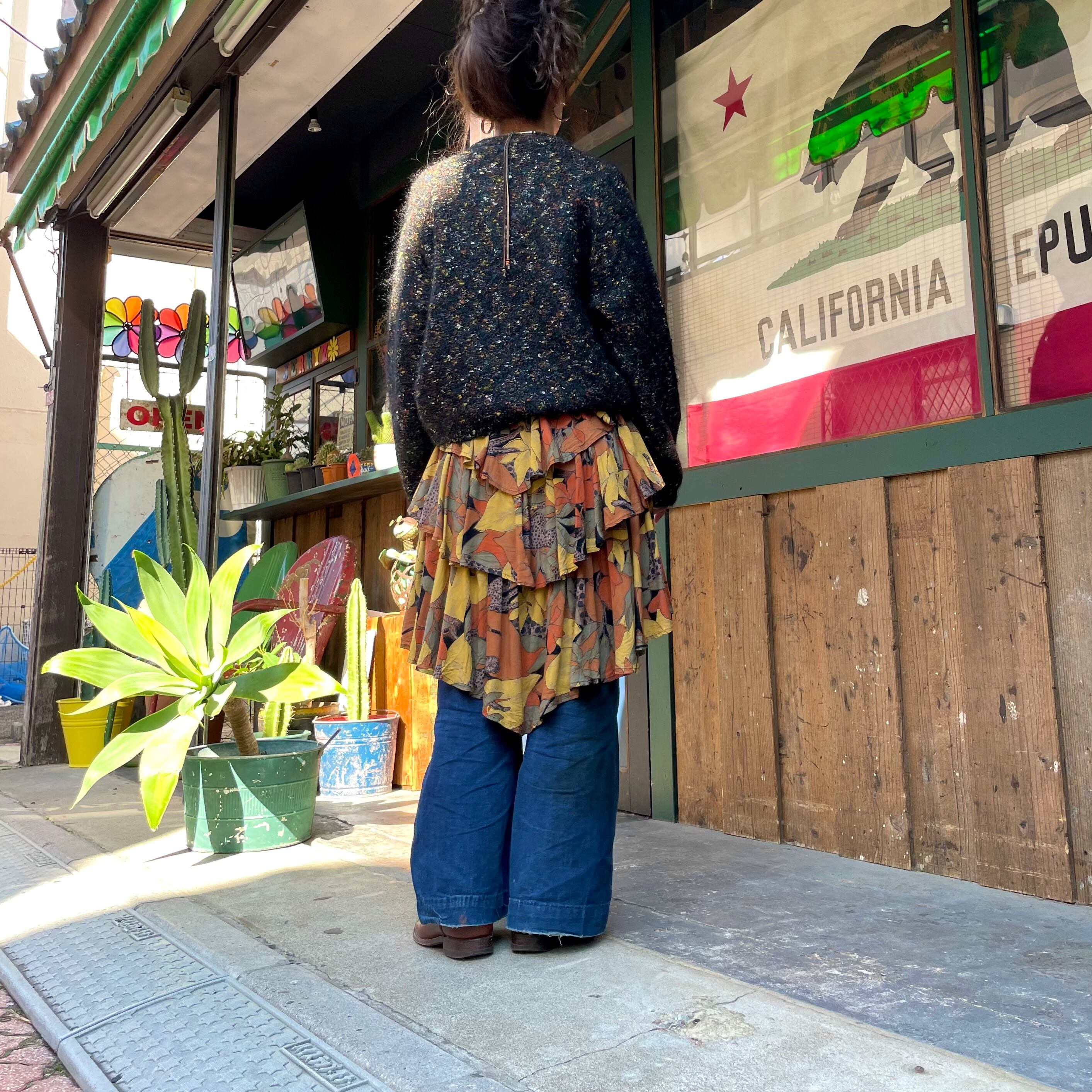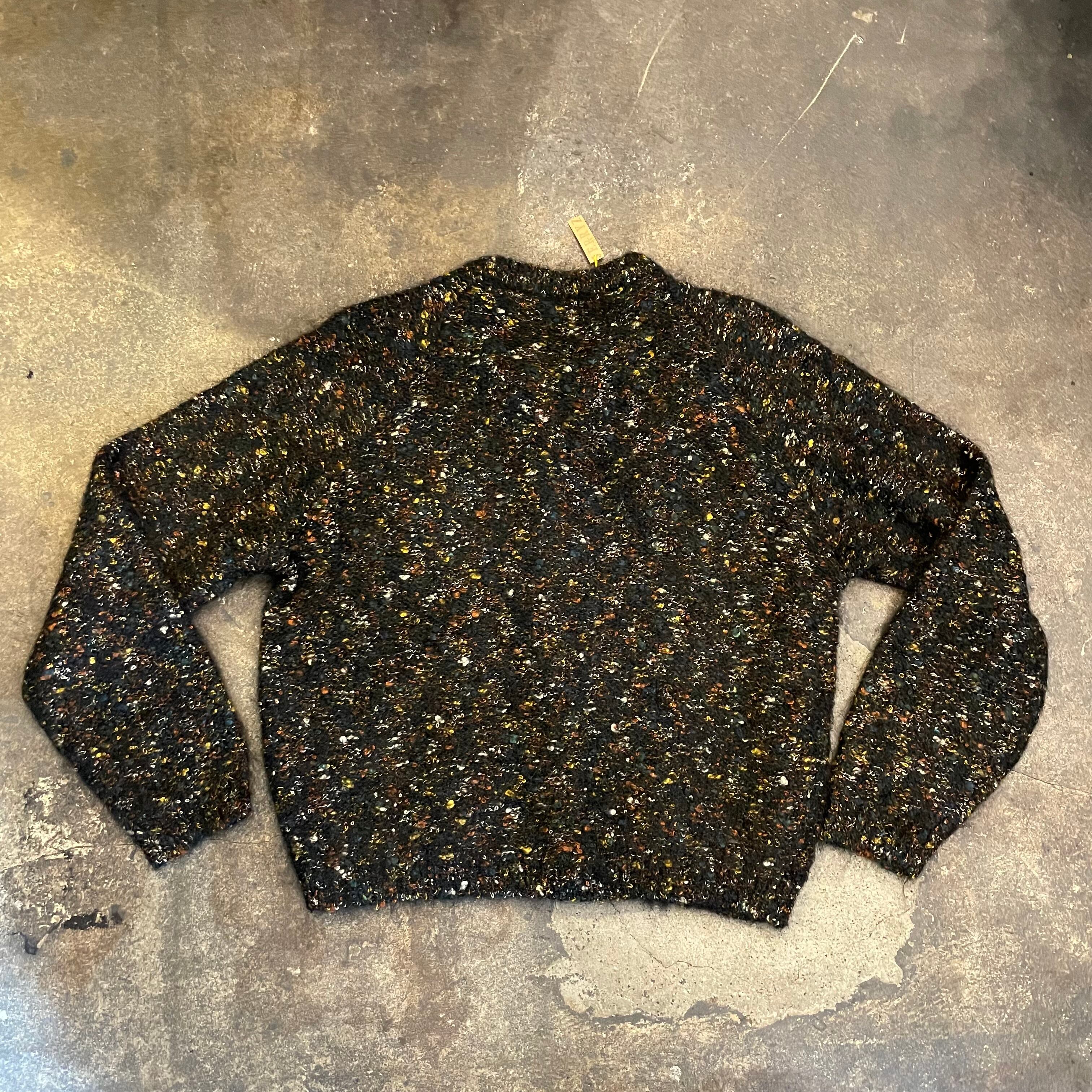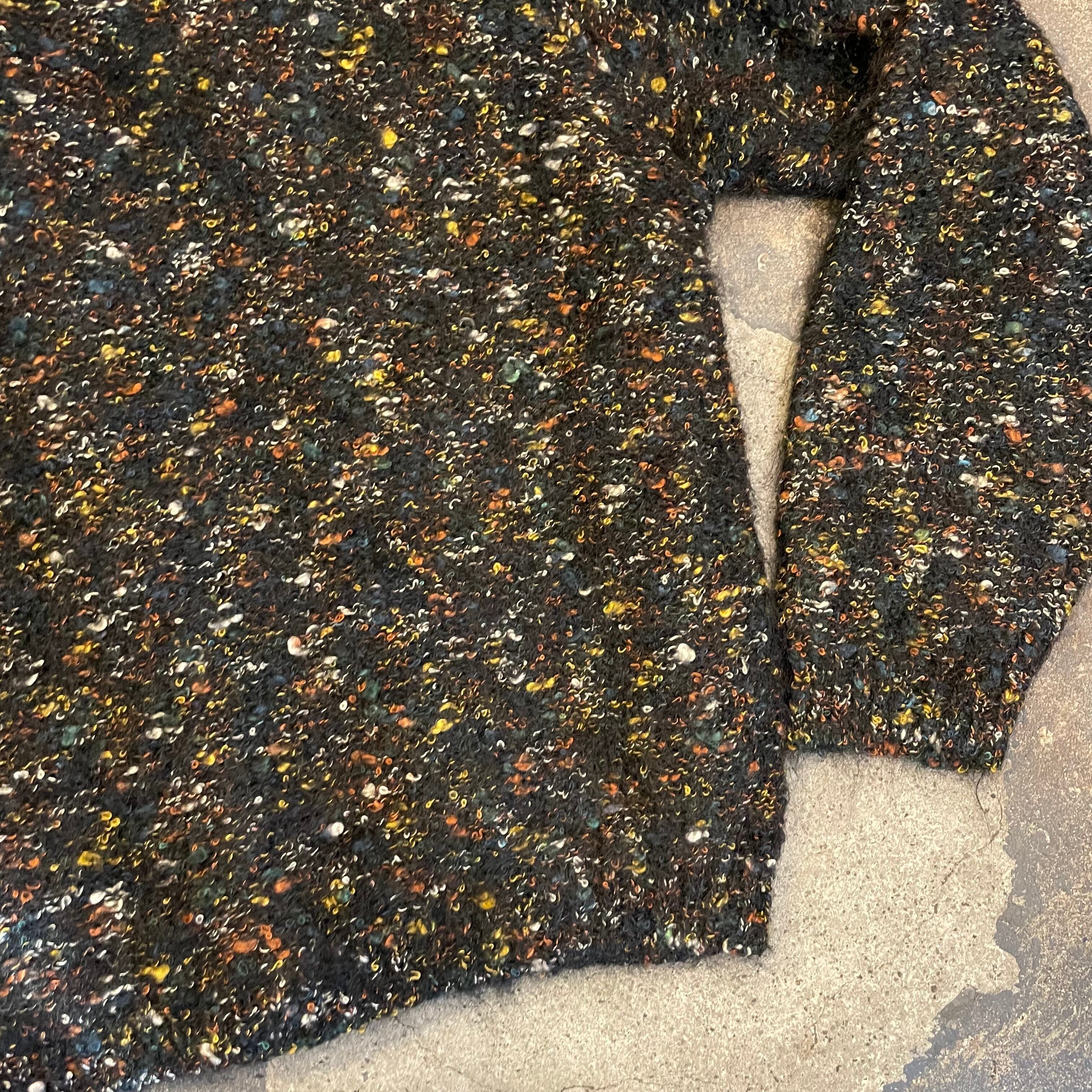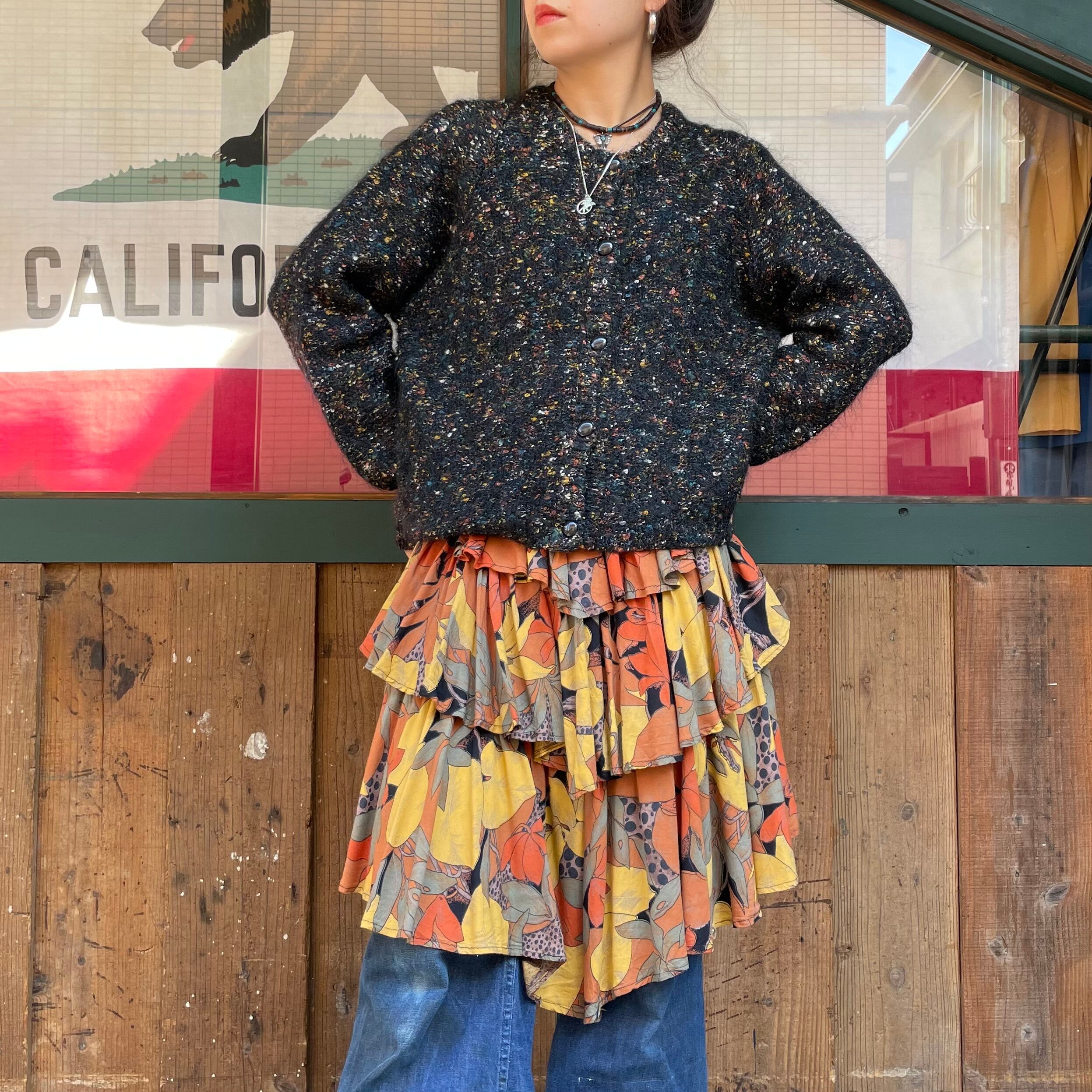 黒ベースに青や黄色オレンジ、白などのミックスカラーがかわいいニットカーディガンです。