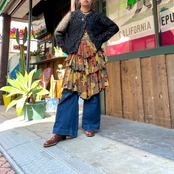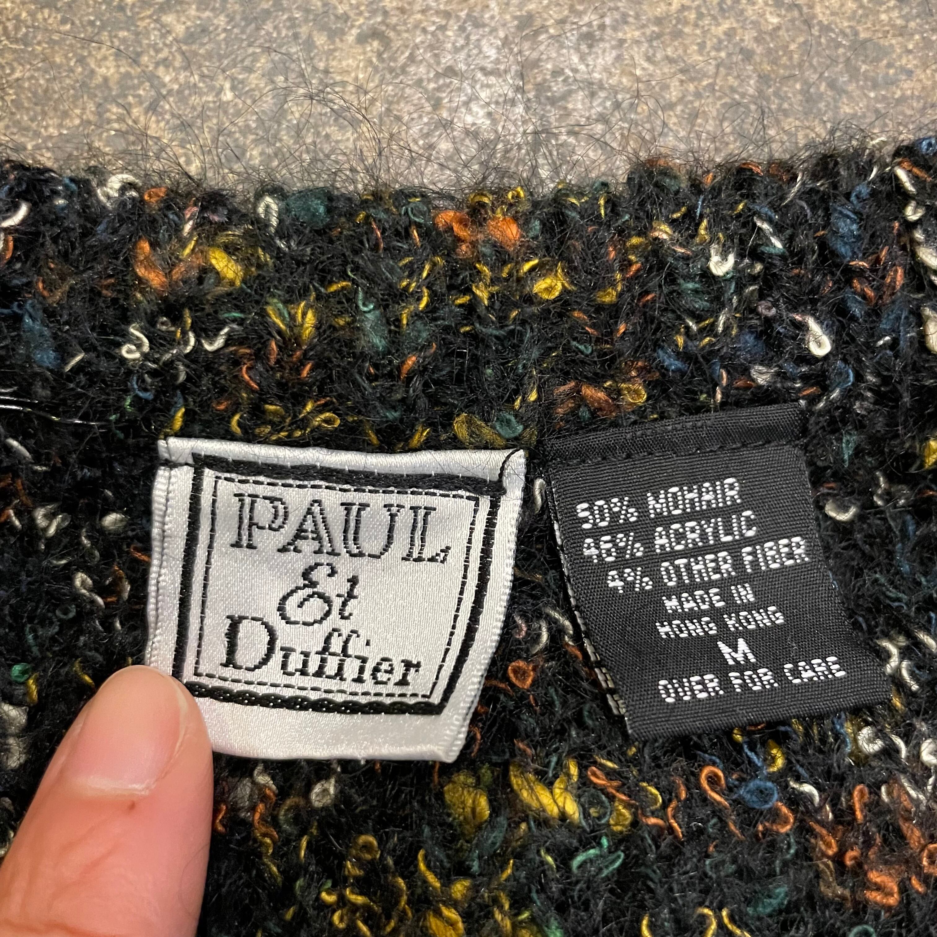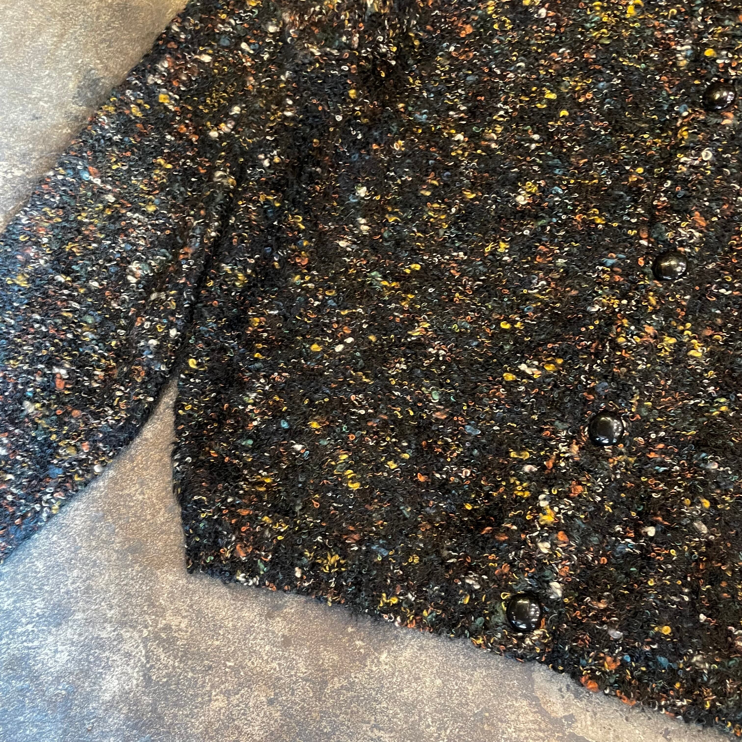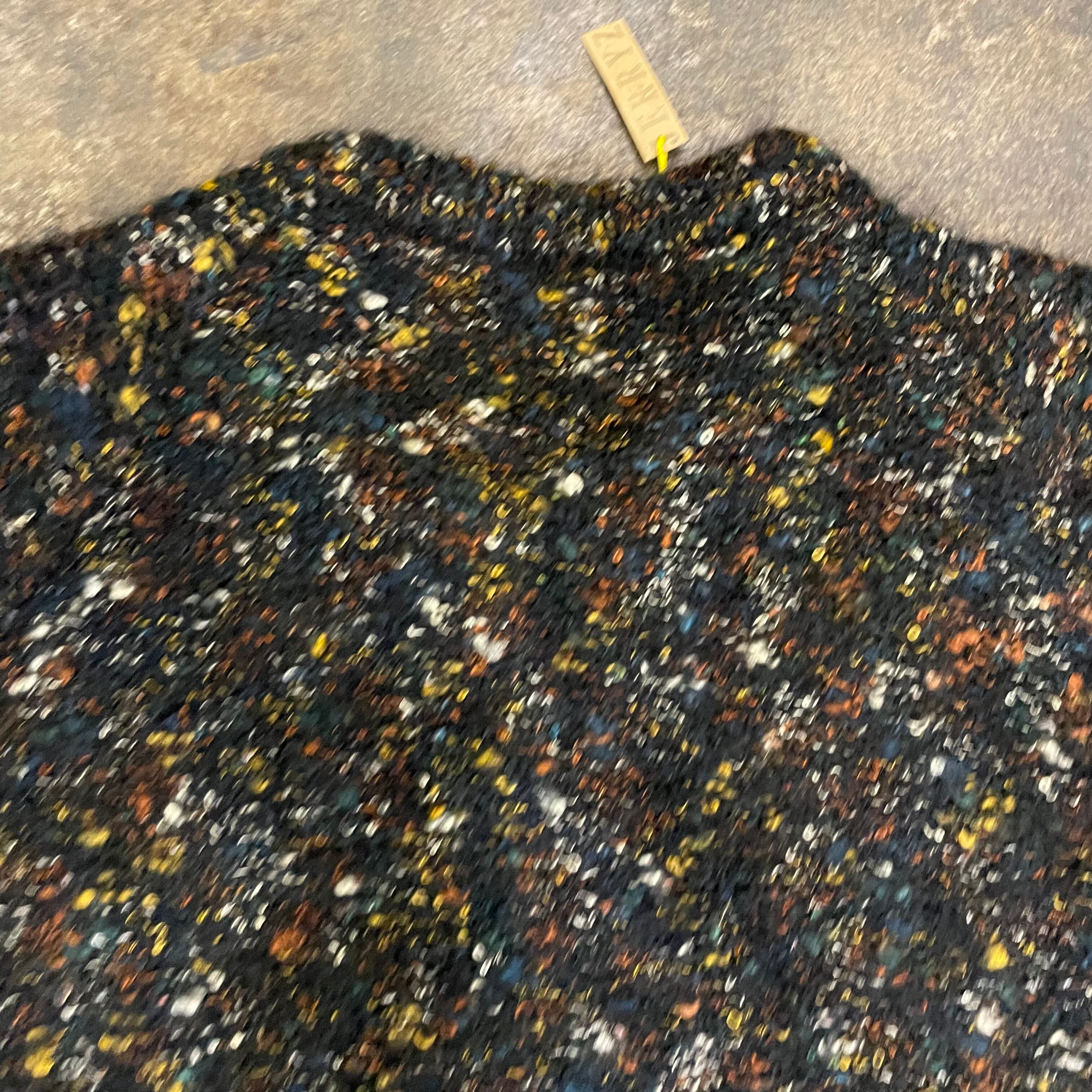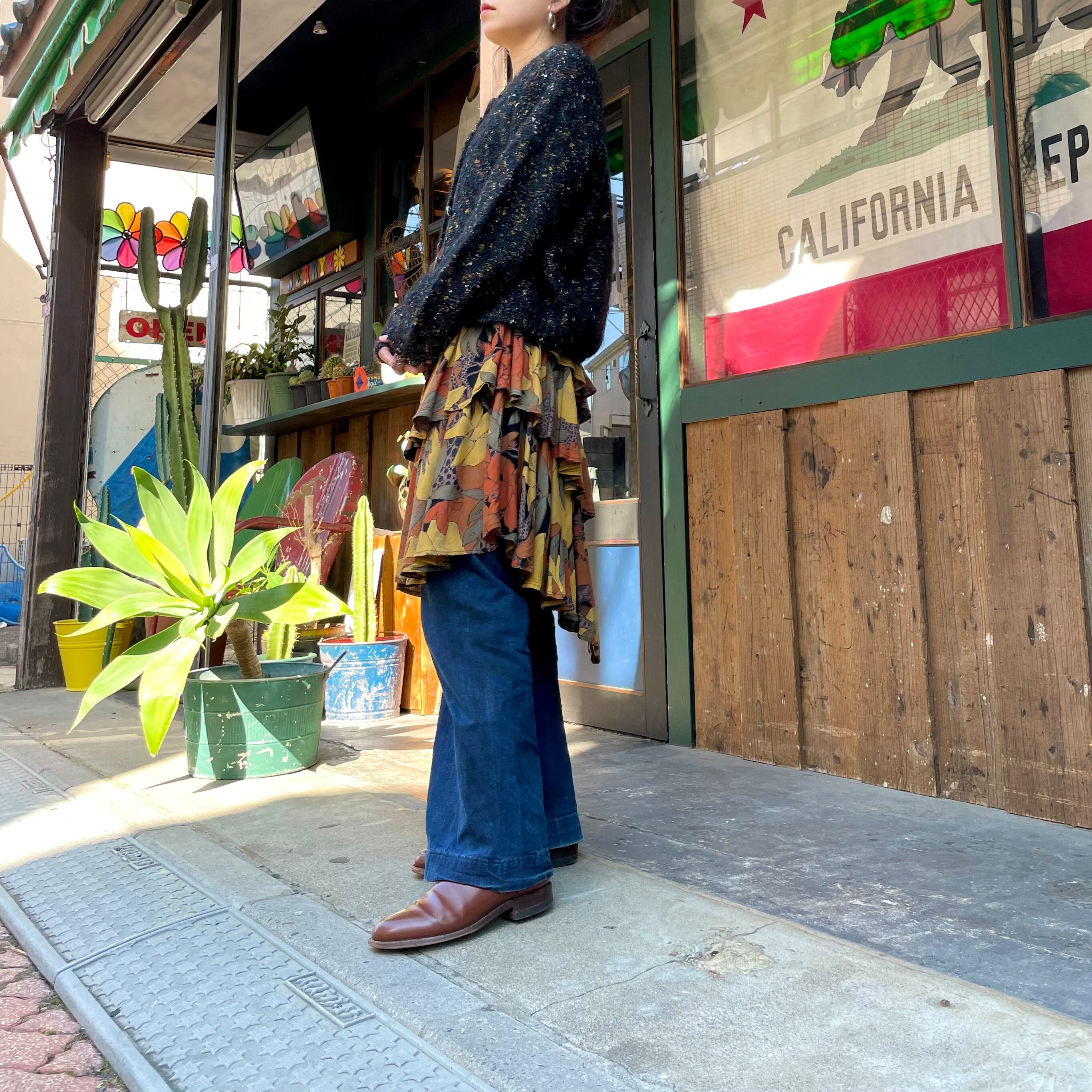黒ベースに青や黄色オレンジ、白などのミックスカラーがかわいいニットカーディガンです。