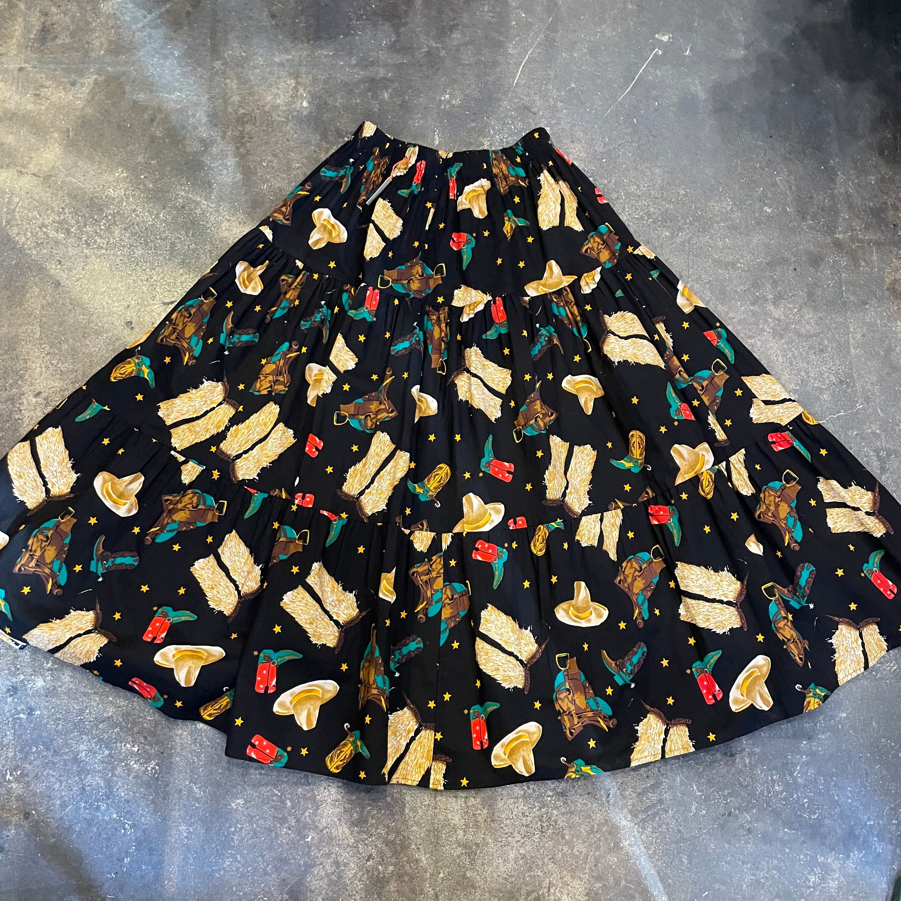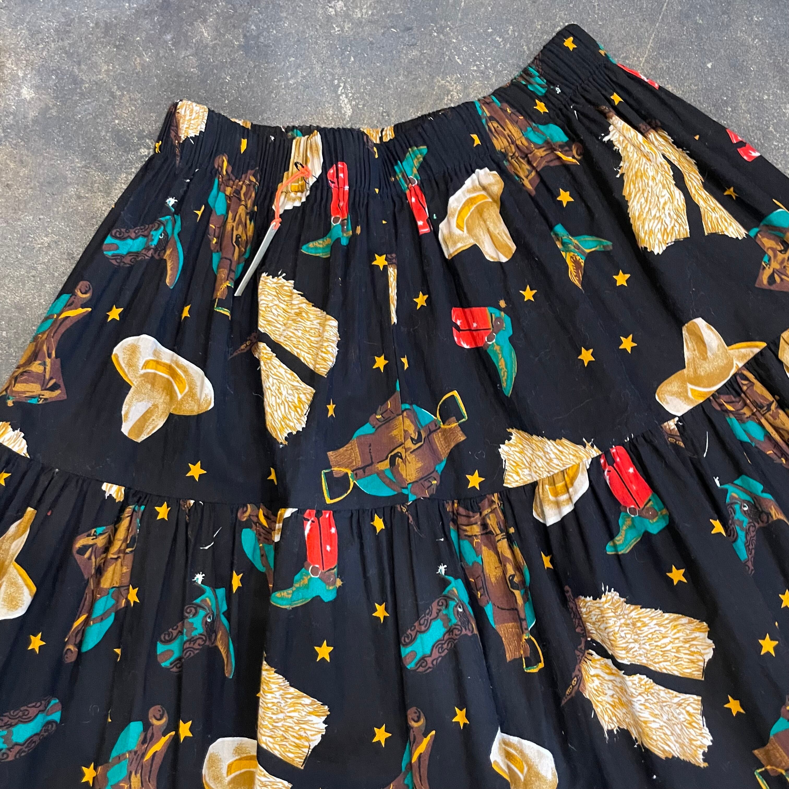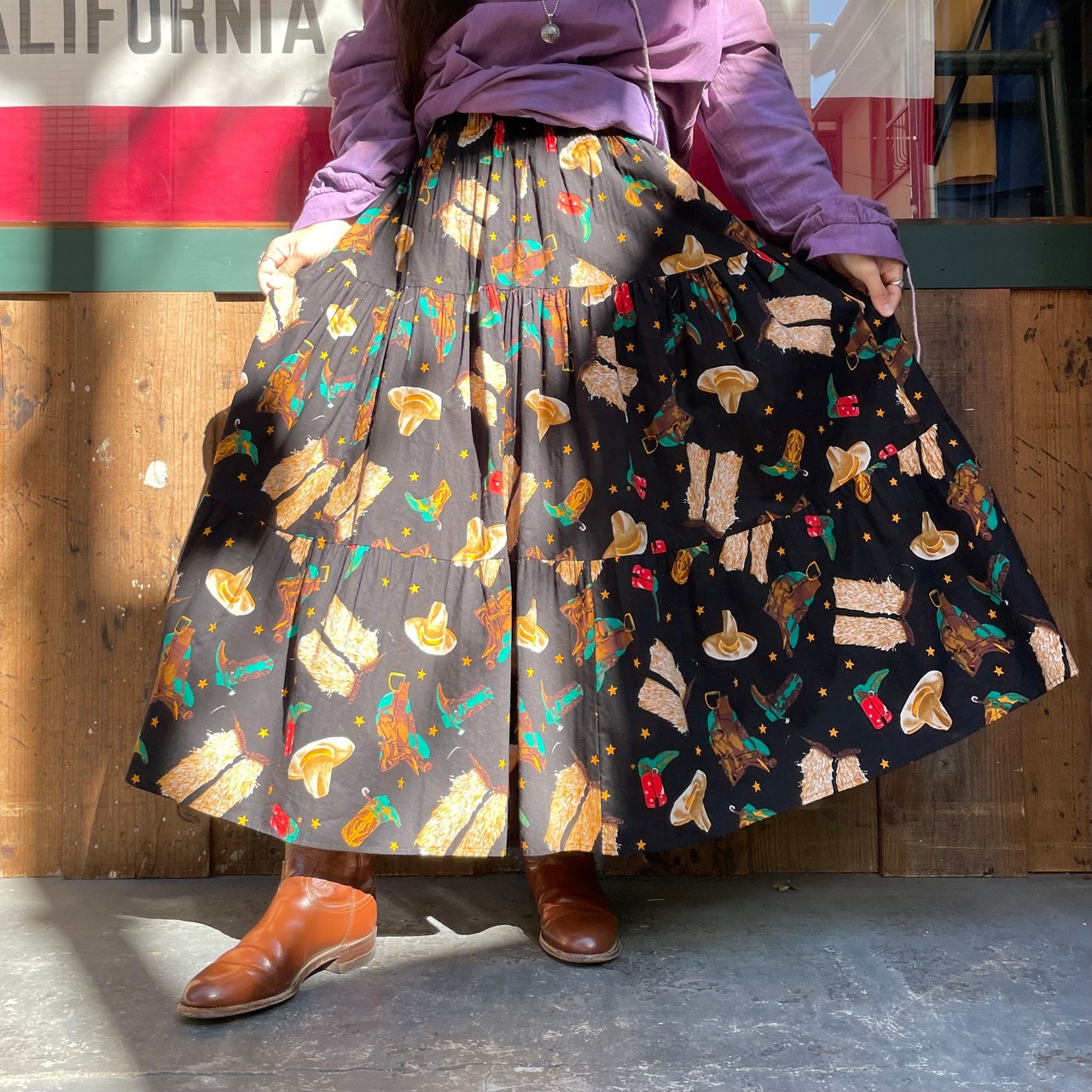 黒地にウエスタンなアイテムたちの柄と小さい星がたくさんプリントされていてかわいい、ティアードのロングスカートです。