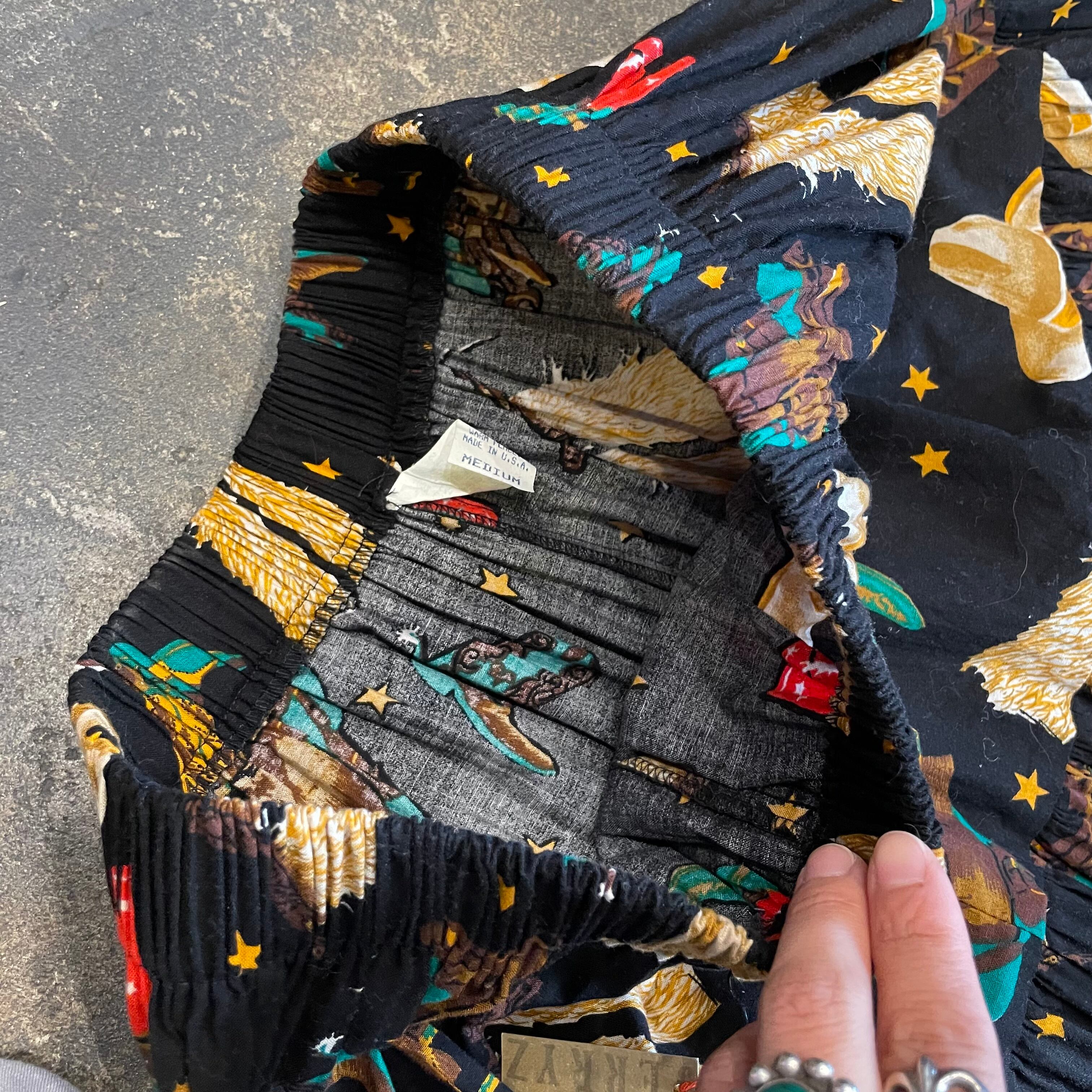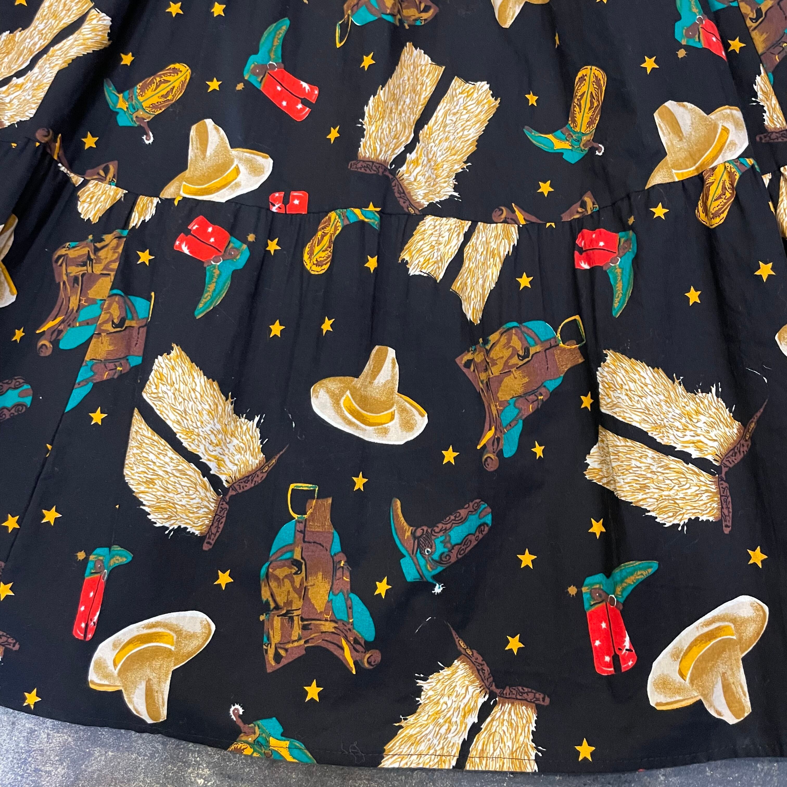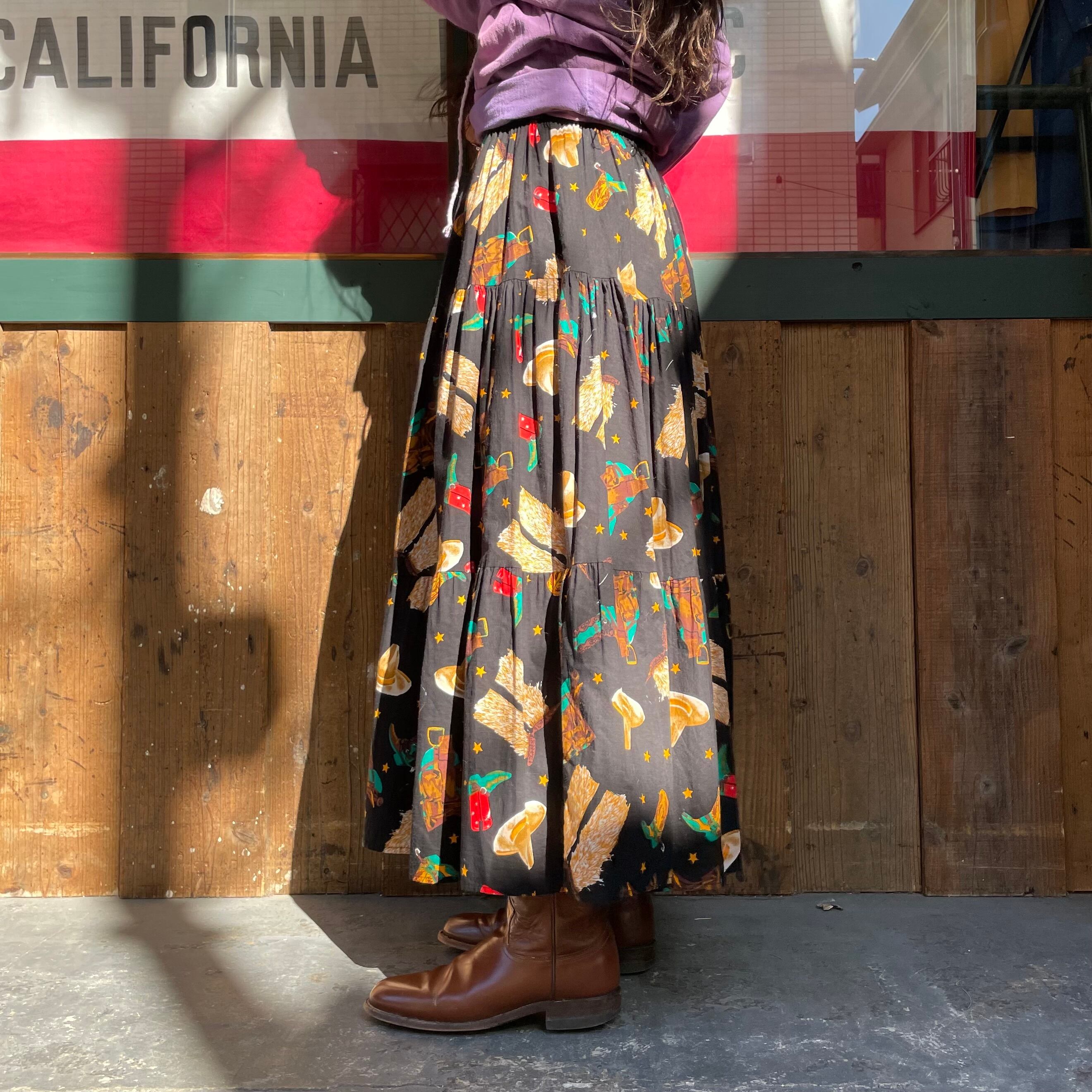 黒地にウエスタンなアイテムたちの柄と小さい星がたくさんプリントされていてかわいい、ティアードのロングスカートです。