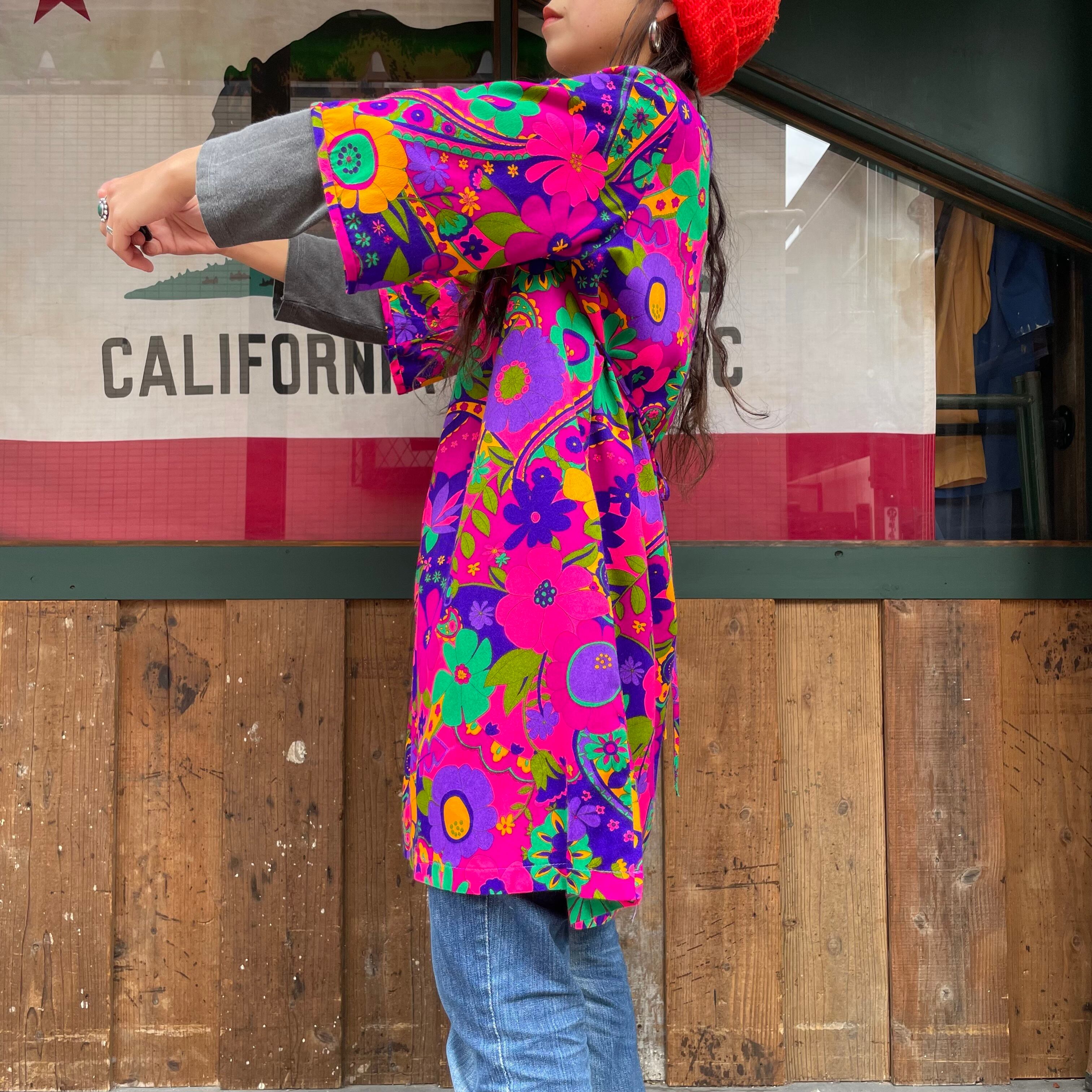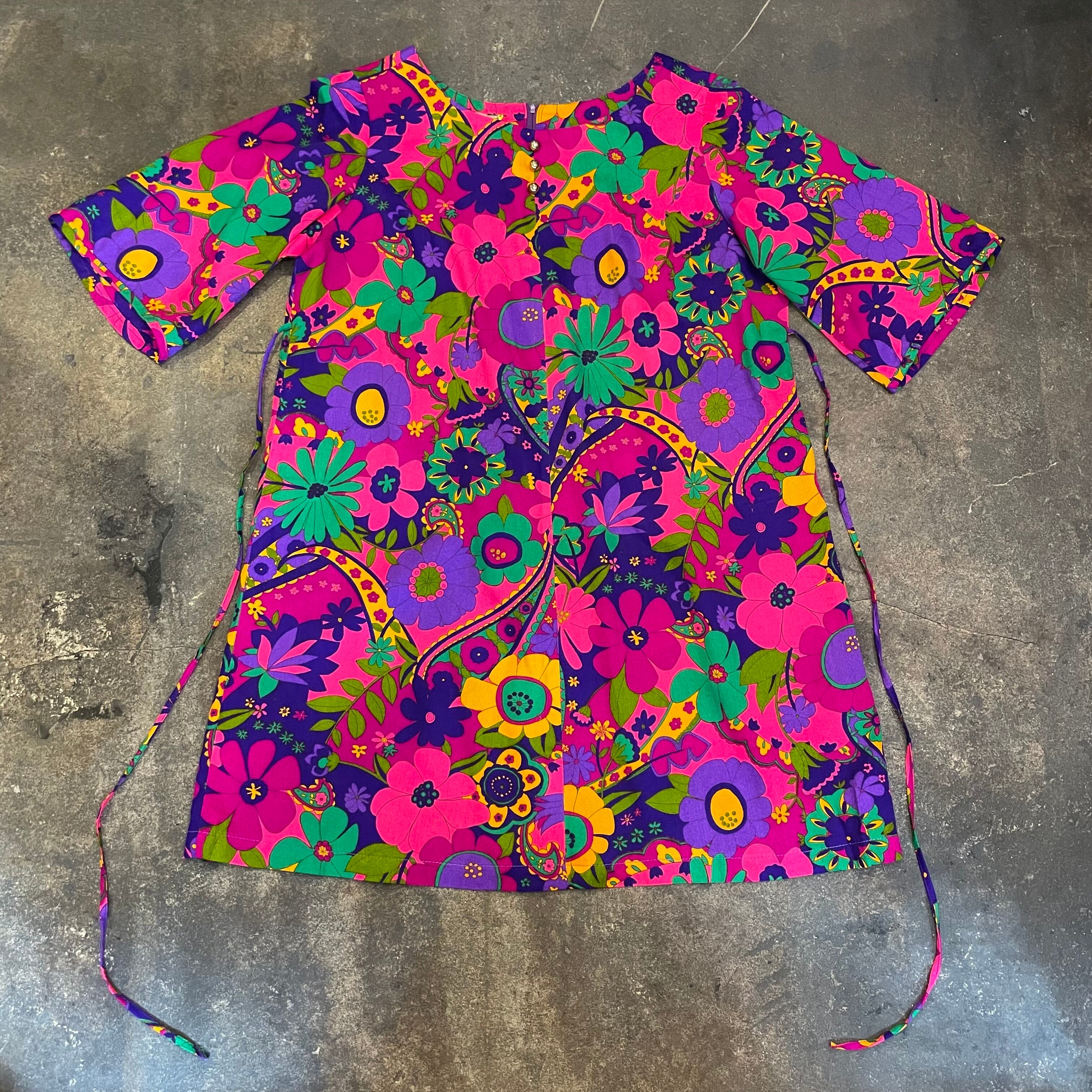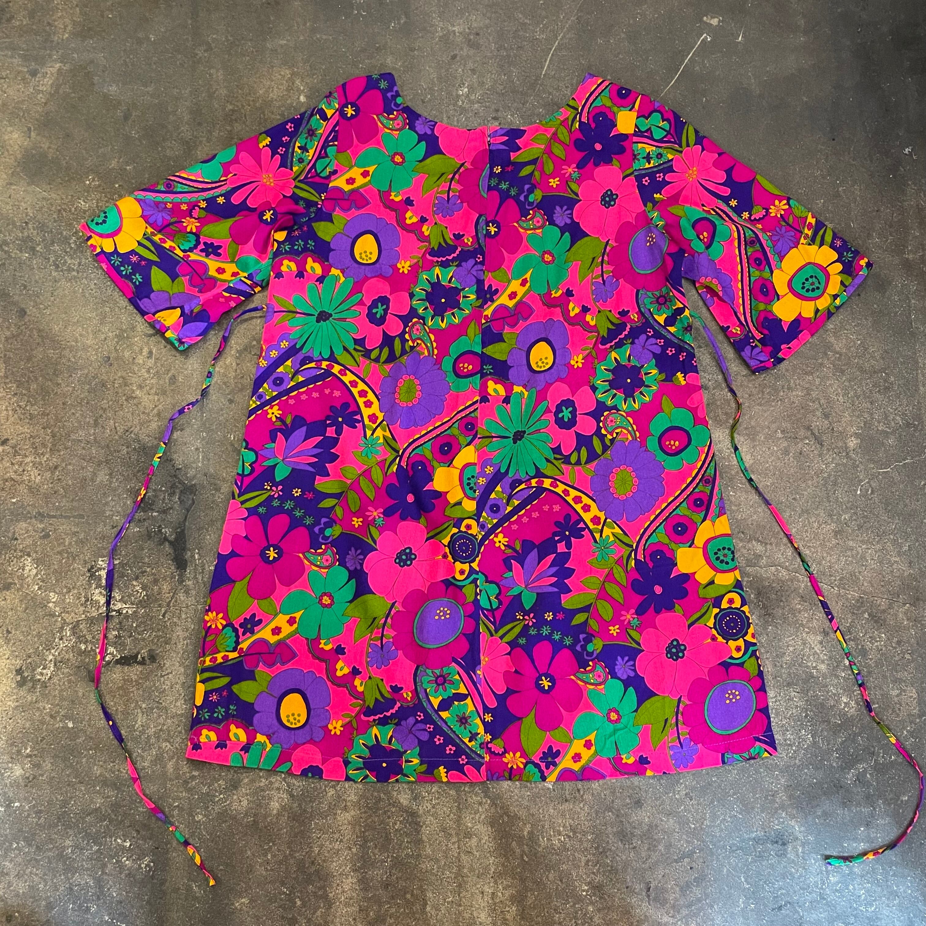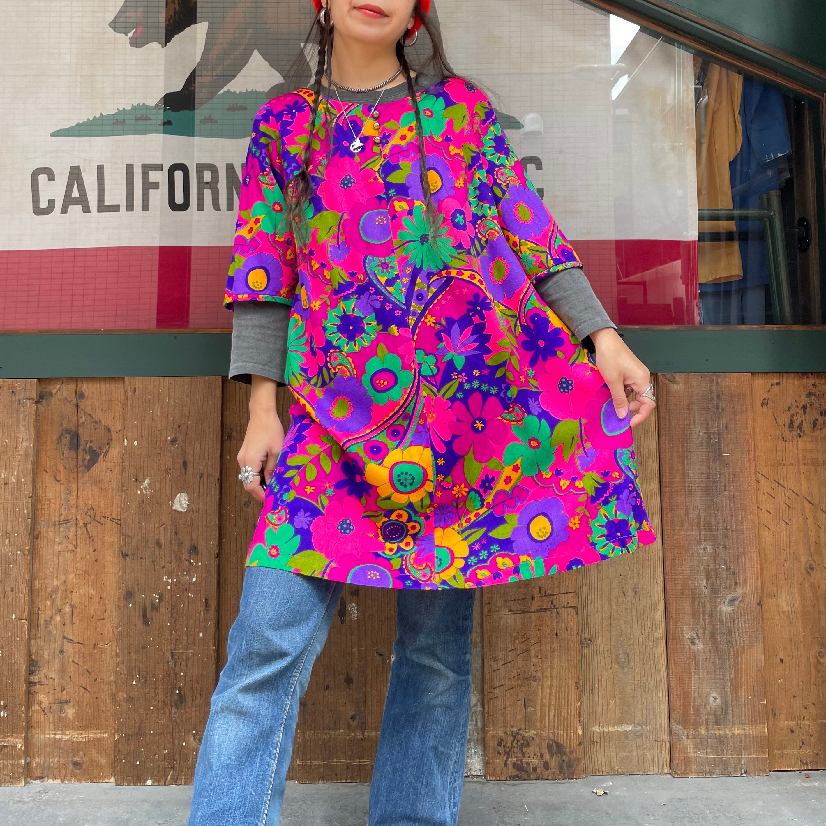 ハッピーでサイケデリックな花柄がとてもかわいい、70年代のハワイ製のワンピースです。