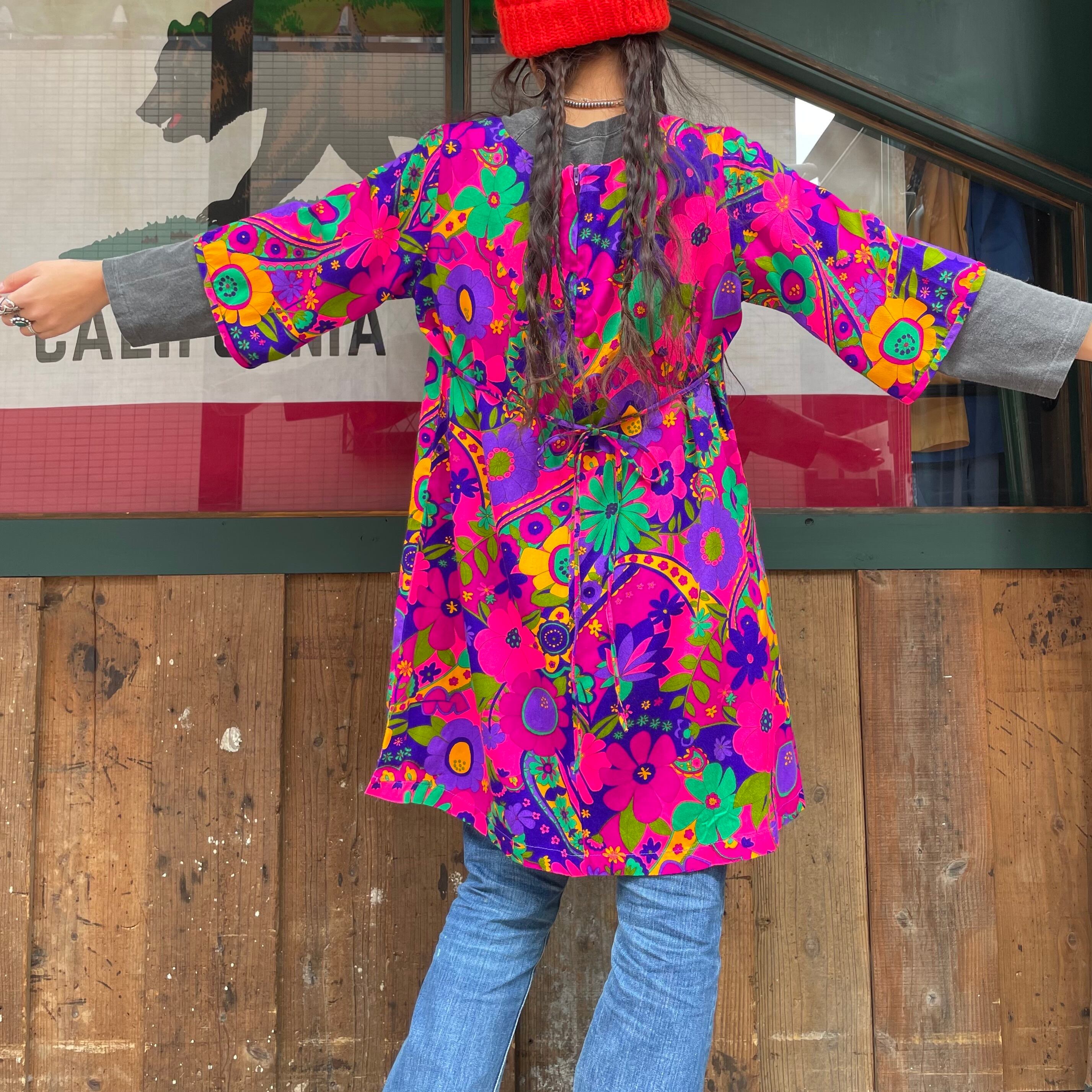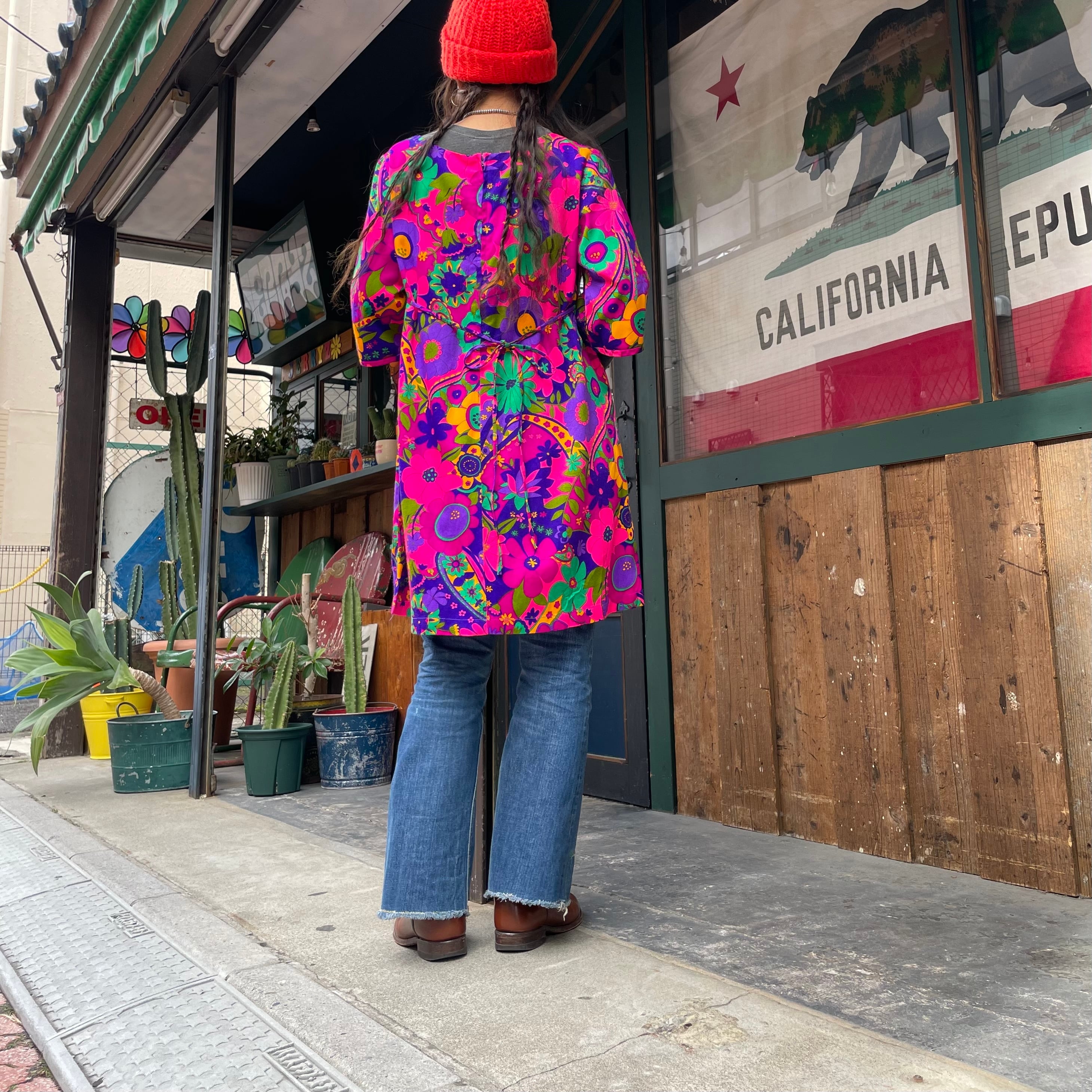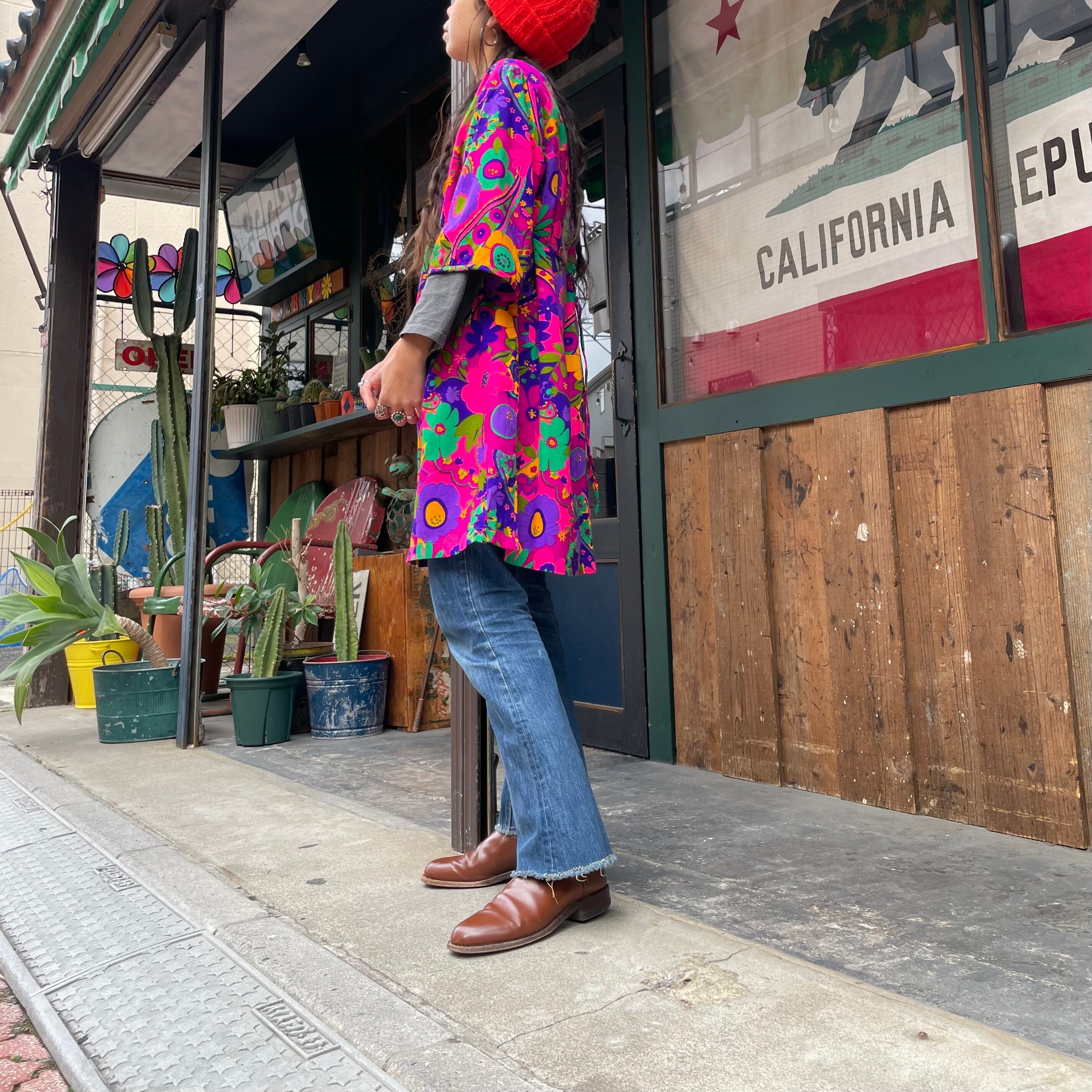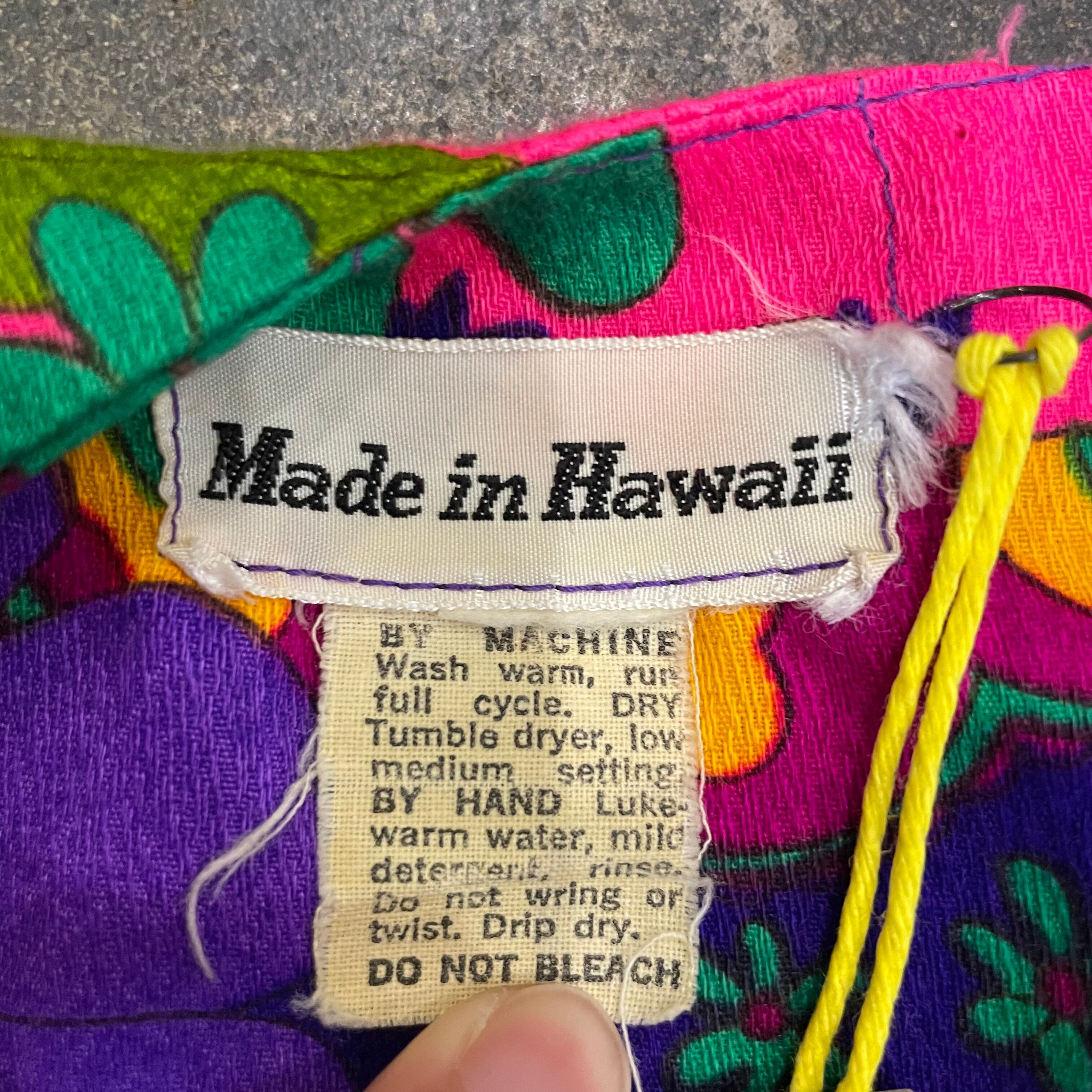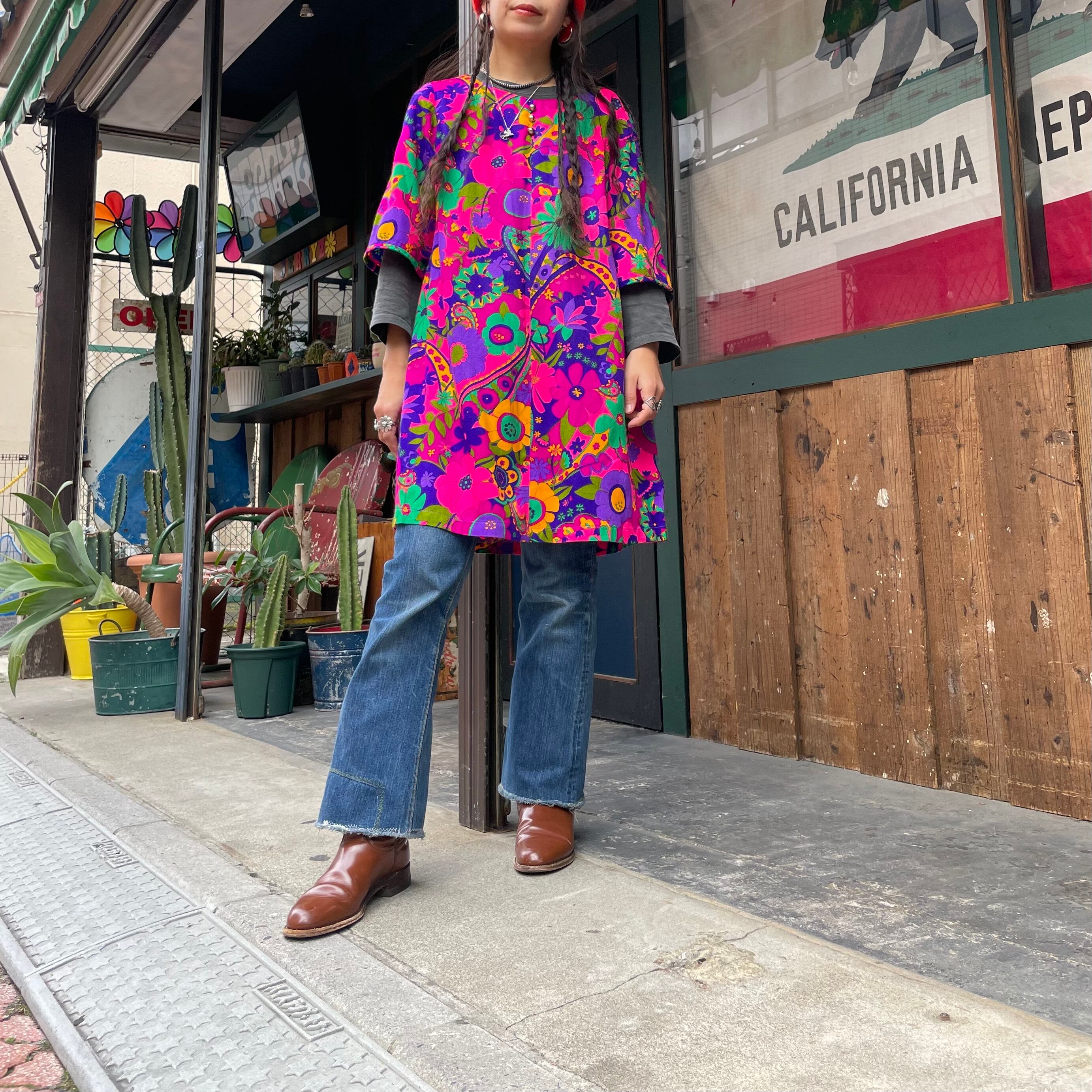ハッピーでサイケデリックな花柄がとてもかわいい、70年代のハワイ製のワンピースです。