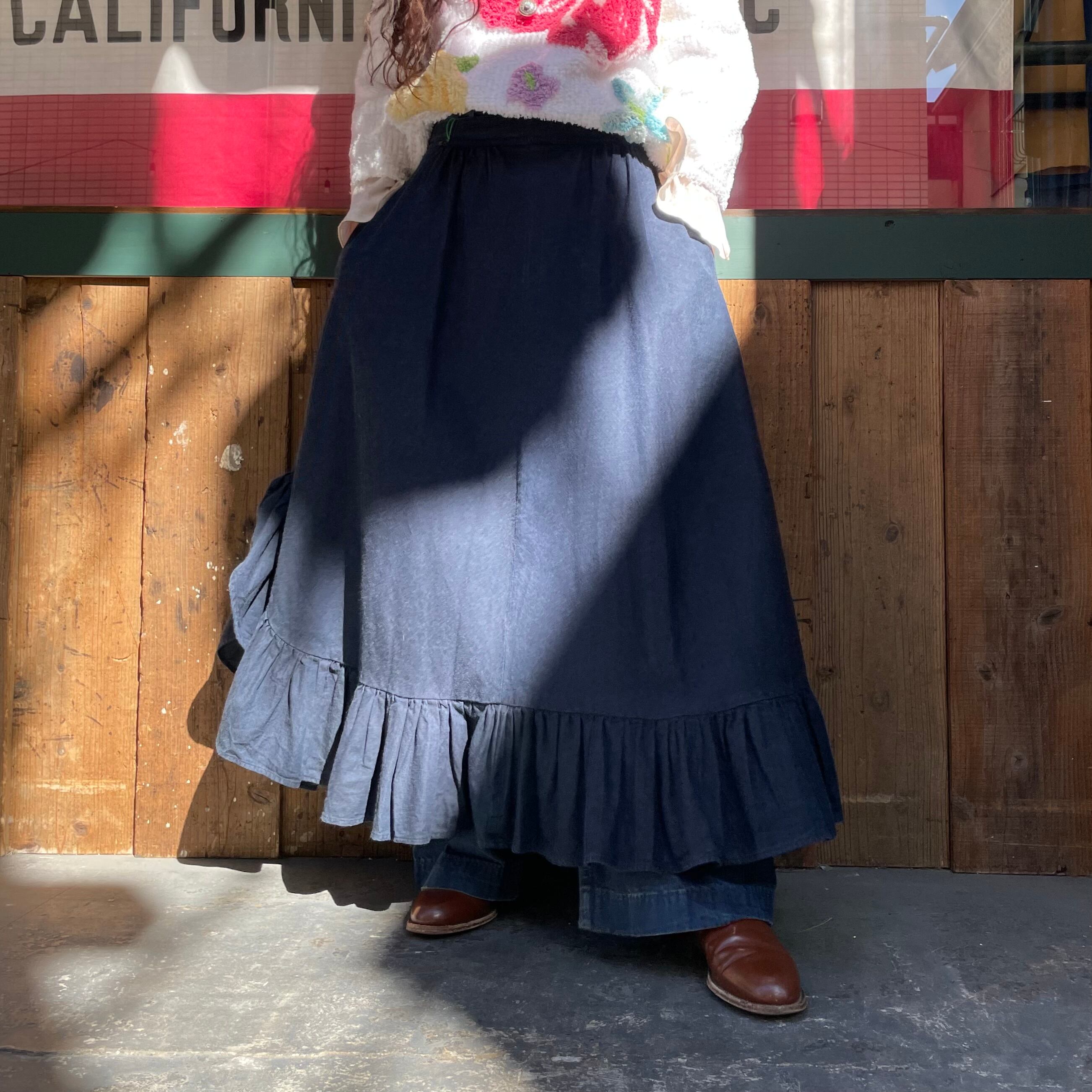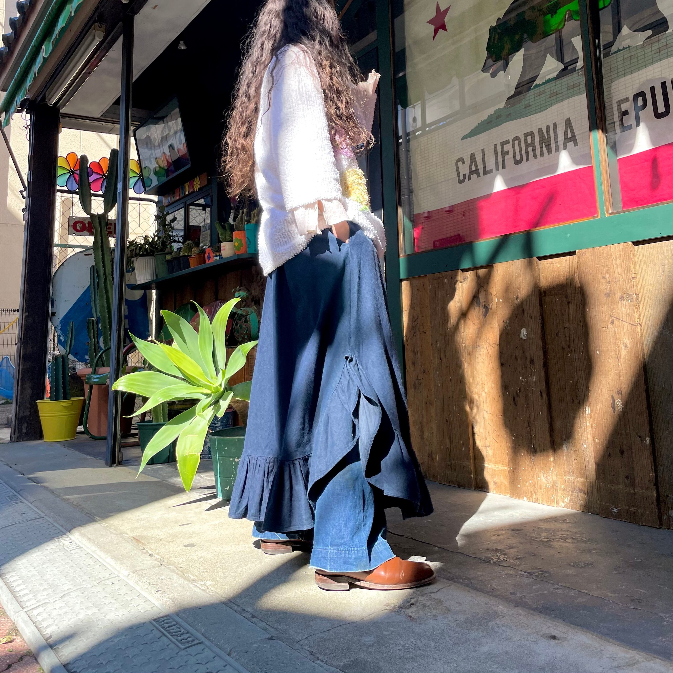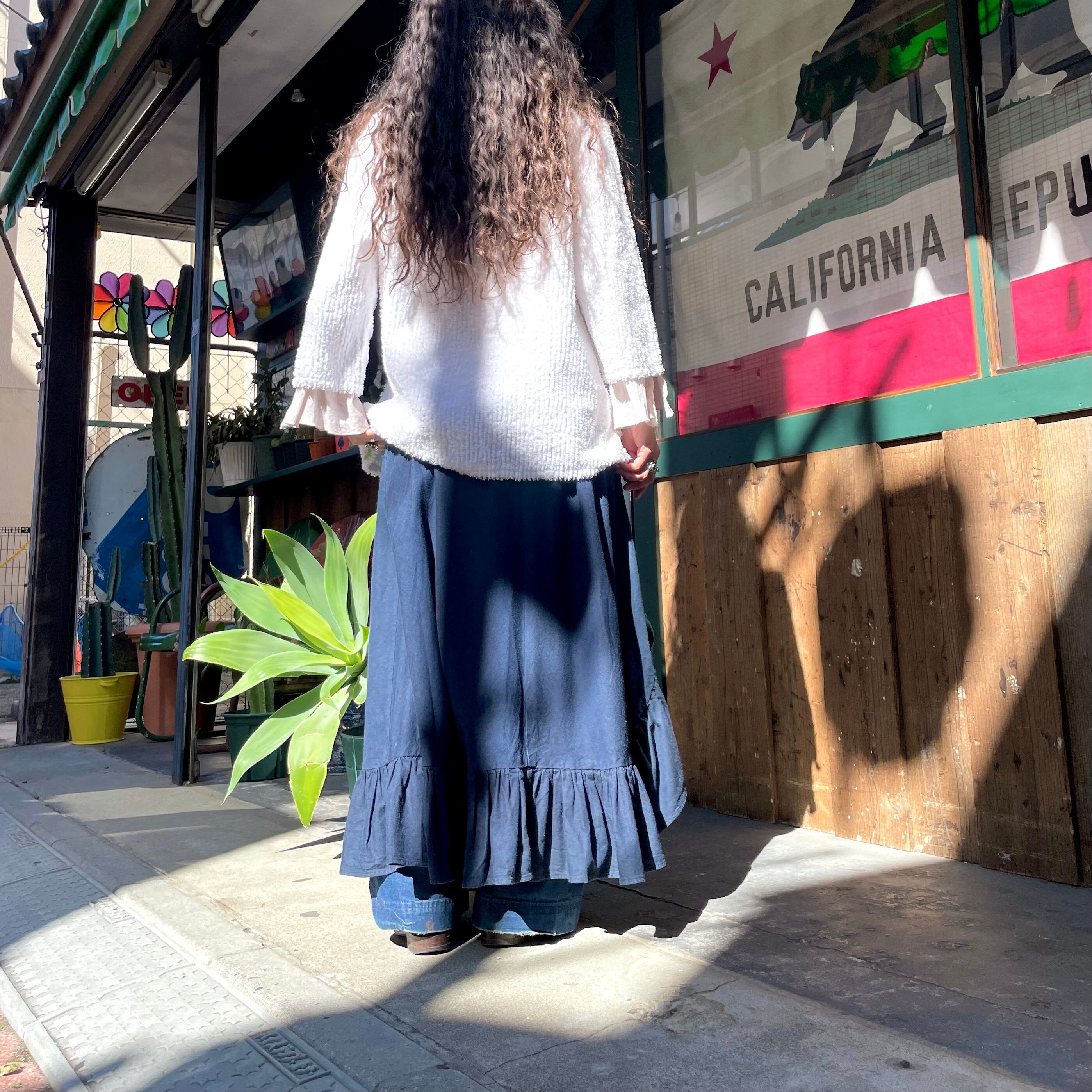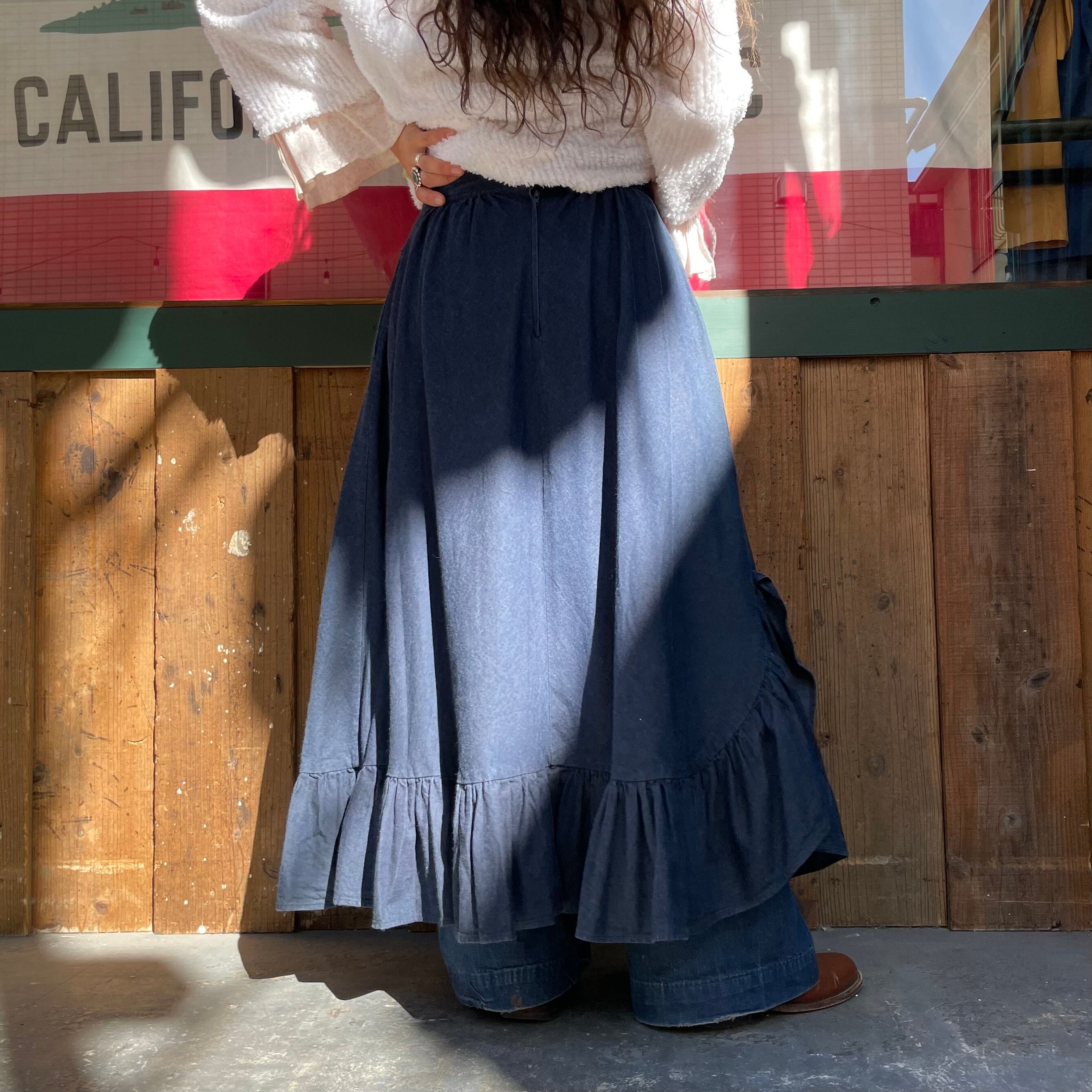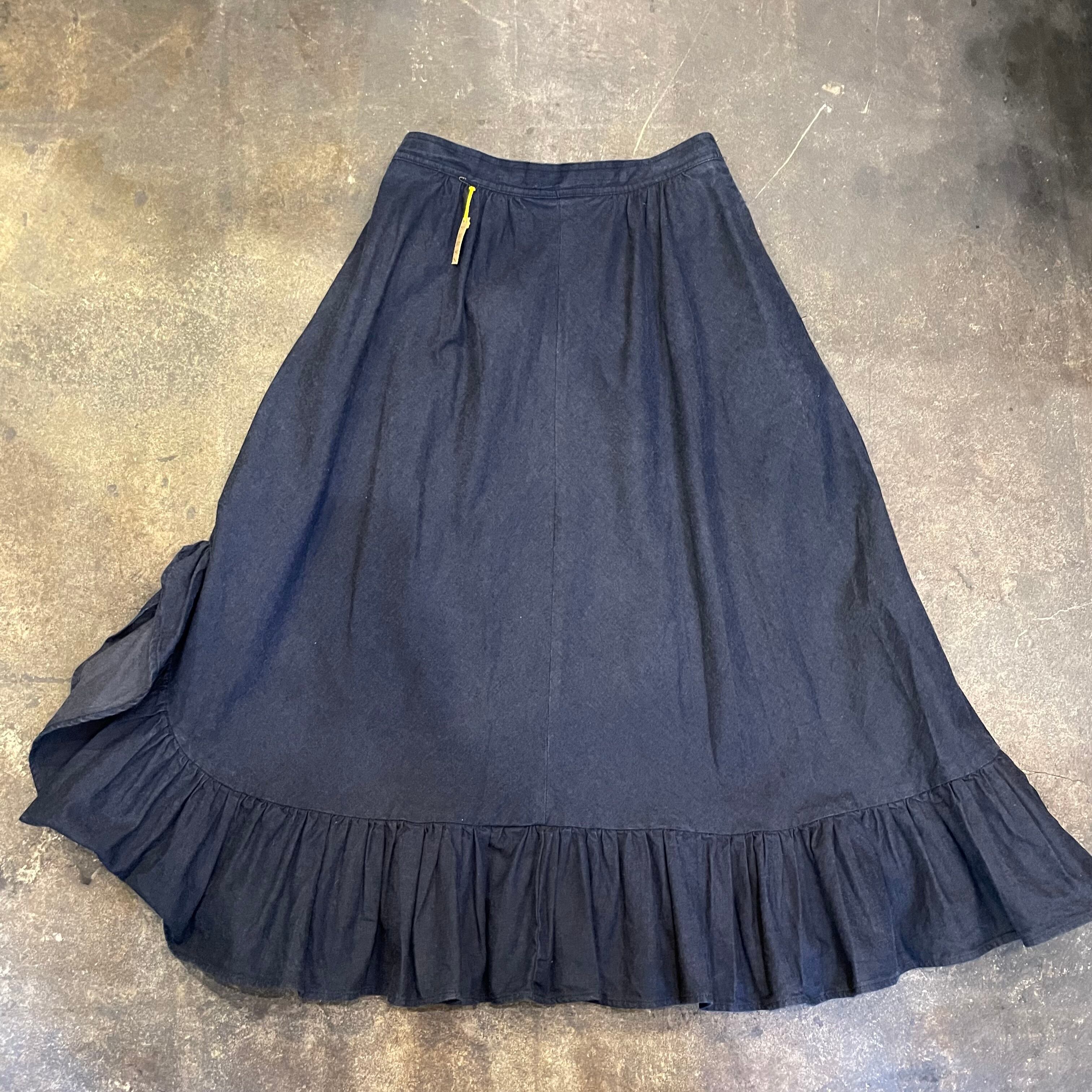 裾のフリルがアシンメトリーでかわいいデニムスカートです。濃いめの色が上品で良いですね。