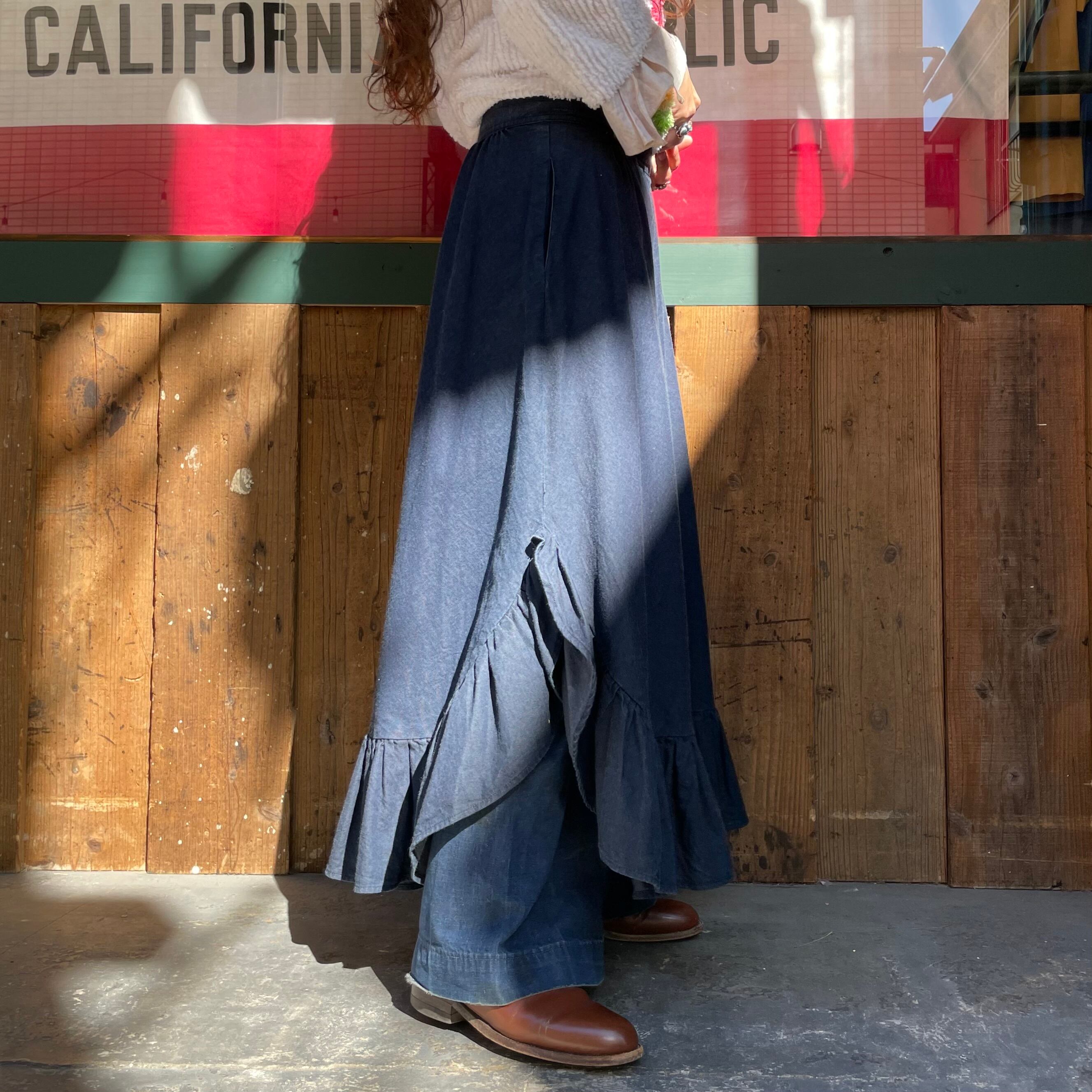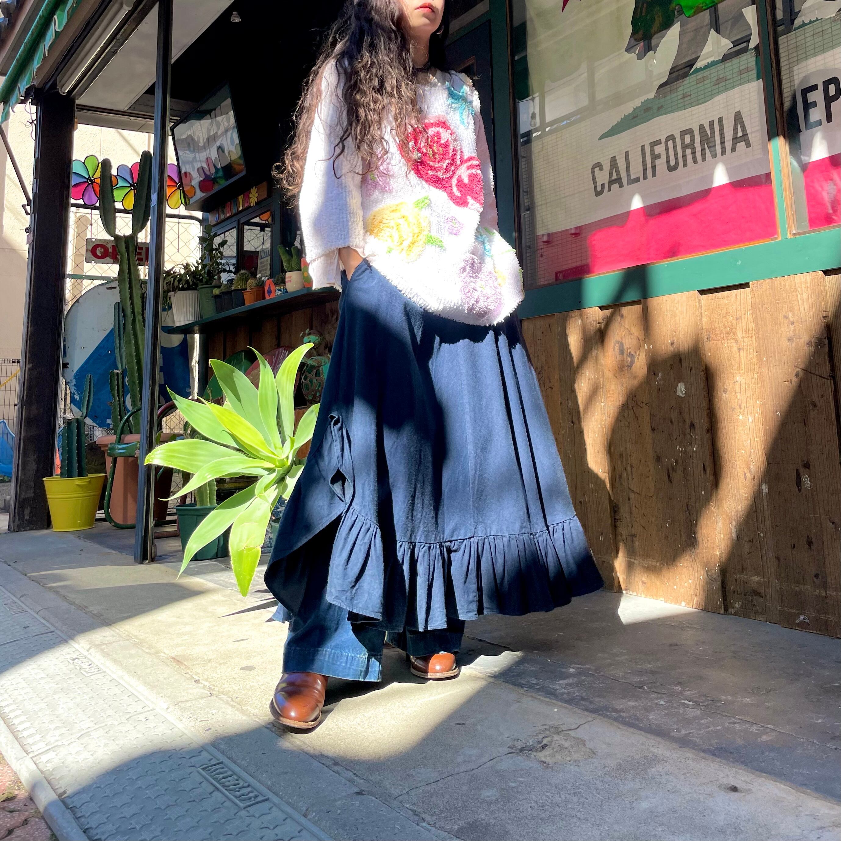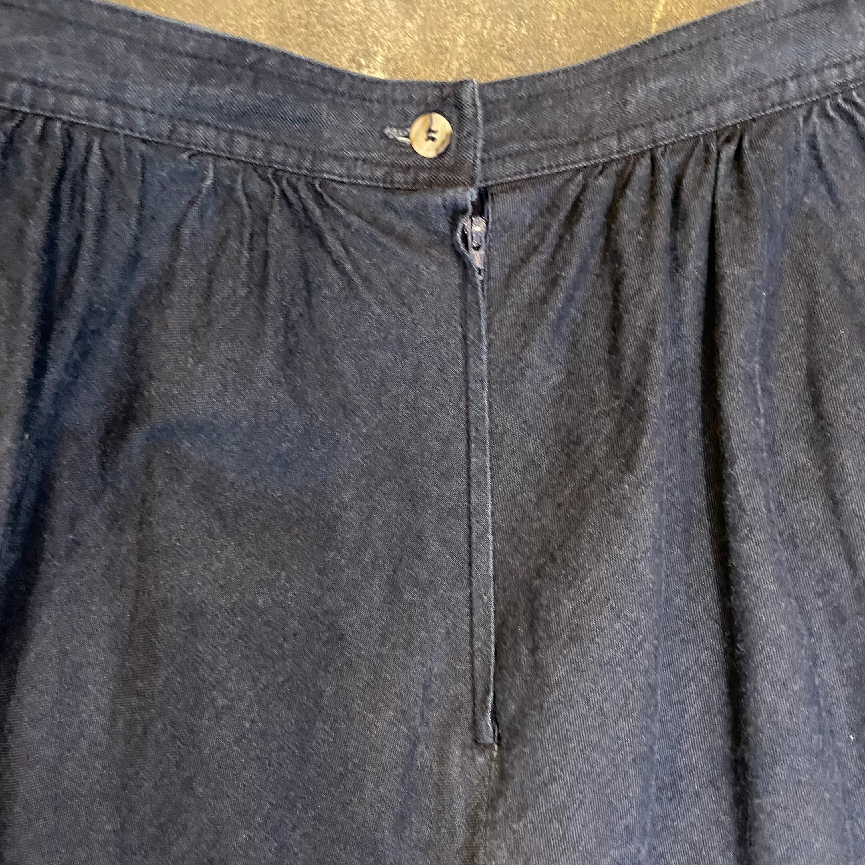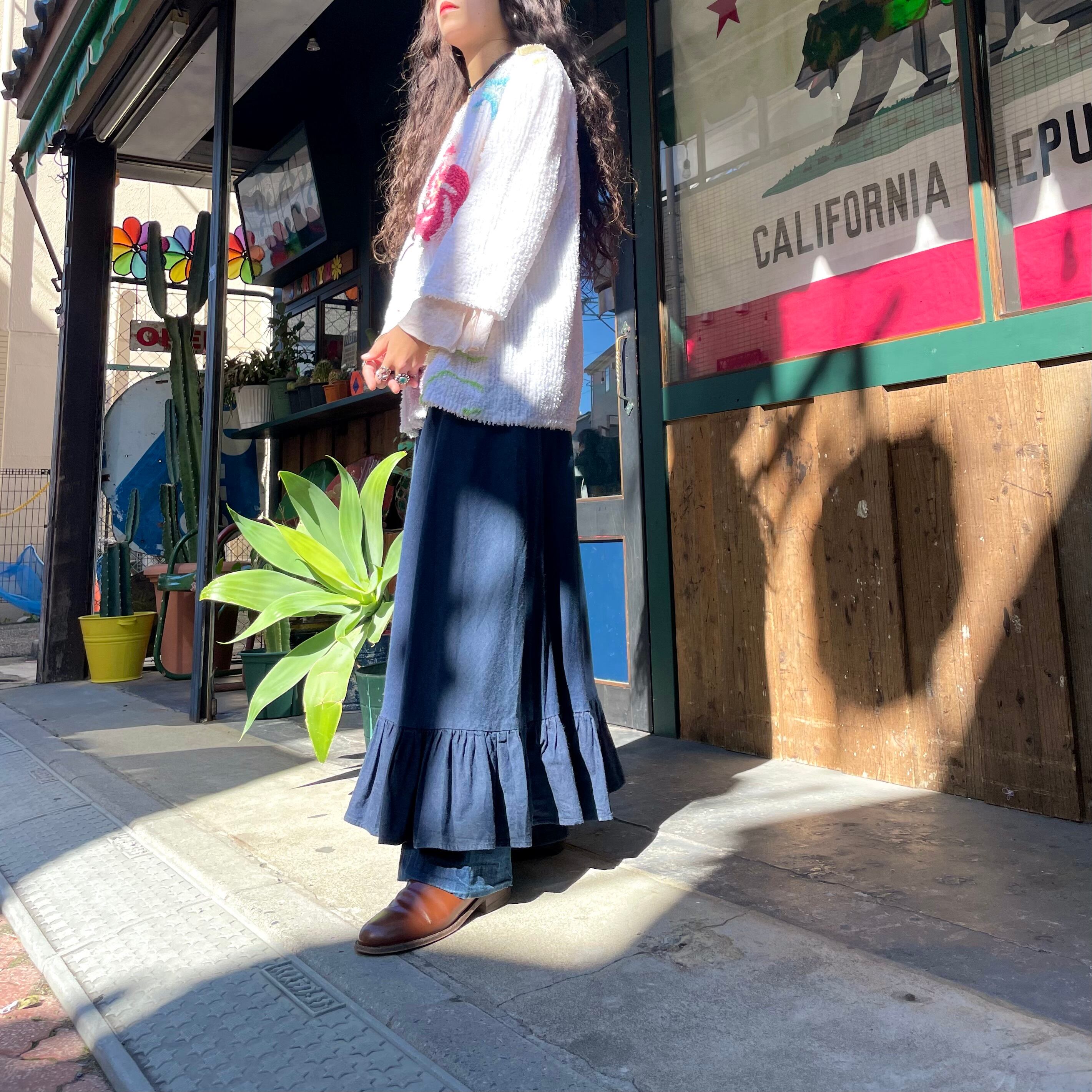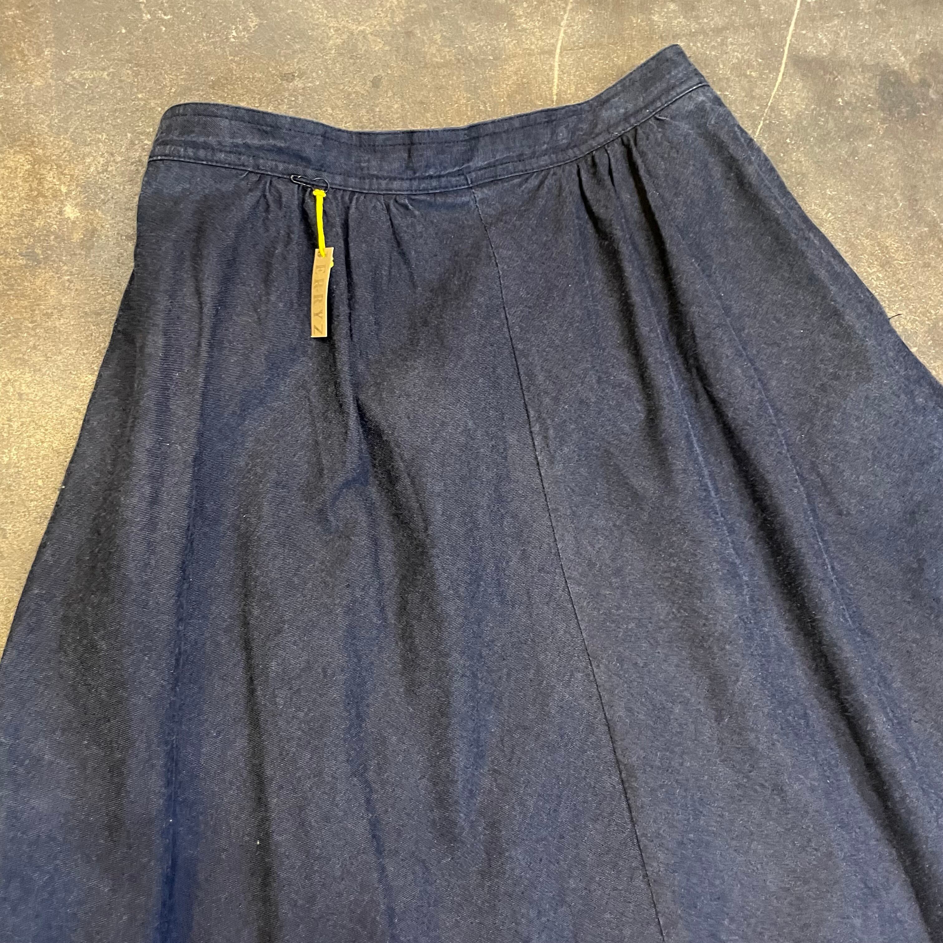 裾のフリルがアシンメトリーでかわいいデニムスカートです。濃いめの色が上品で良いですね。