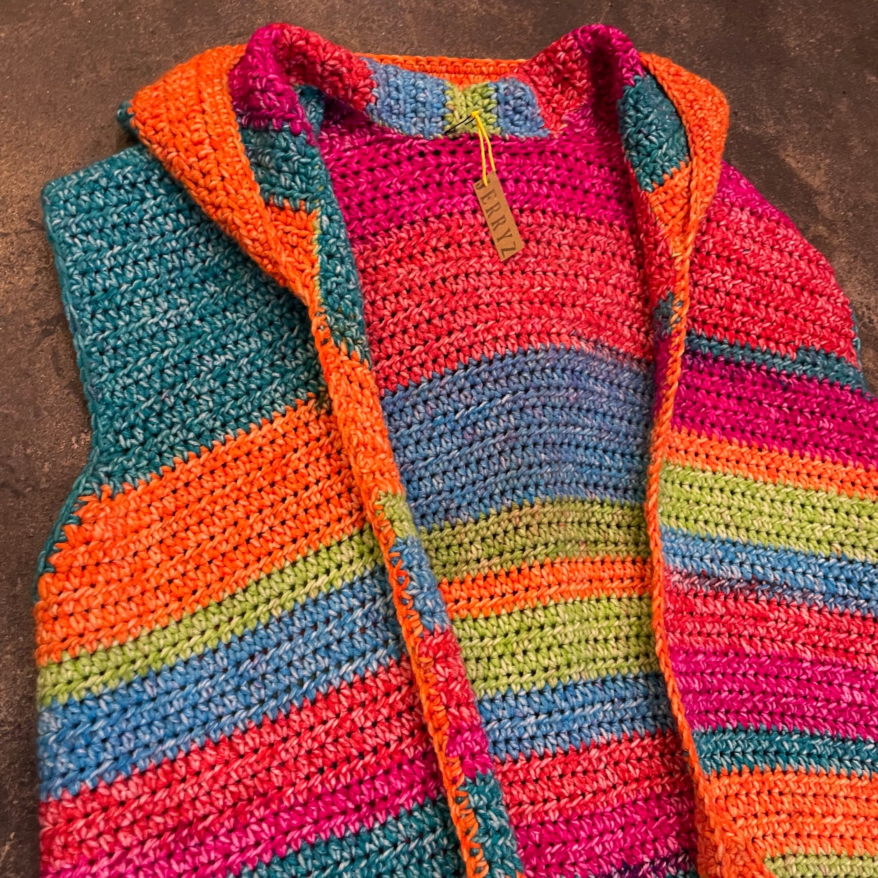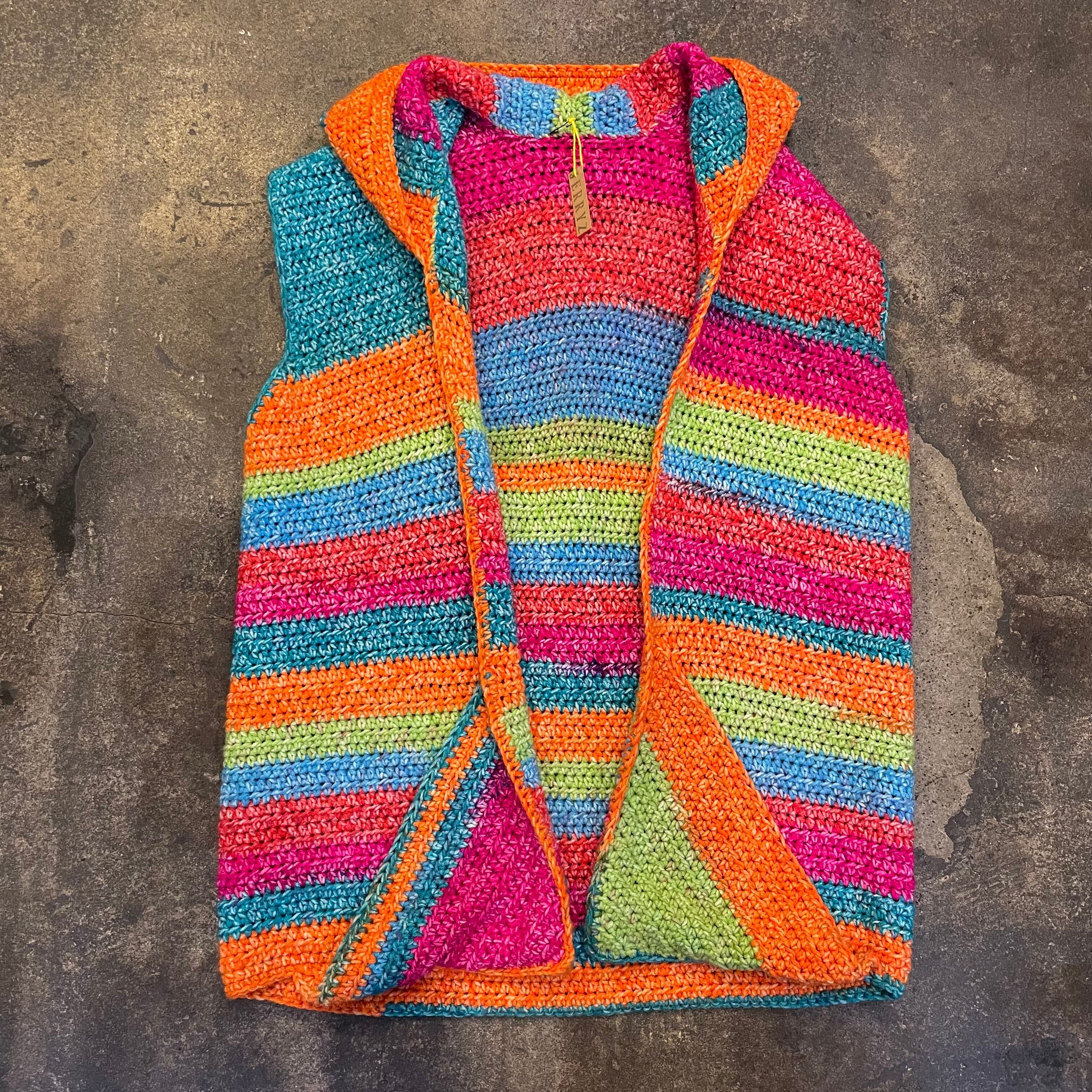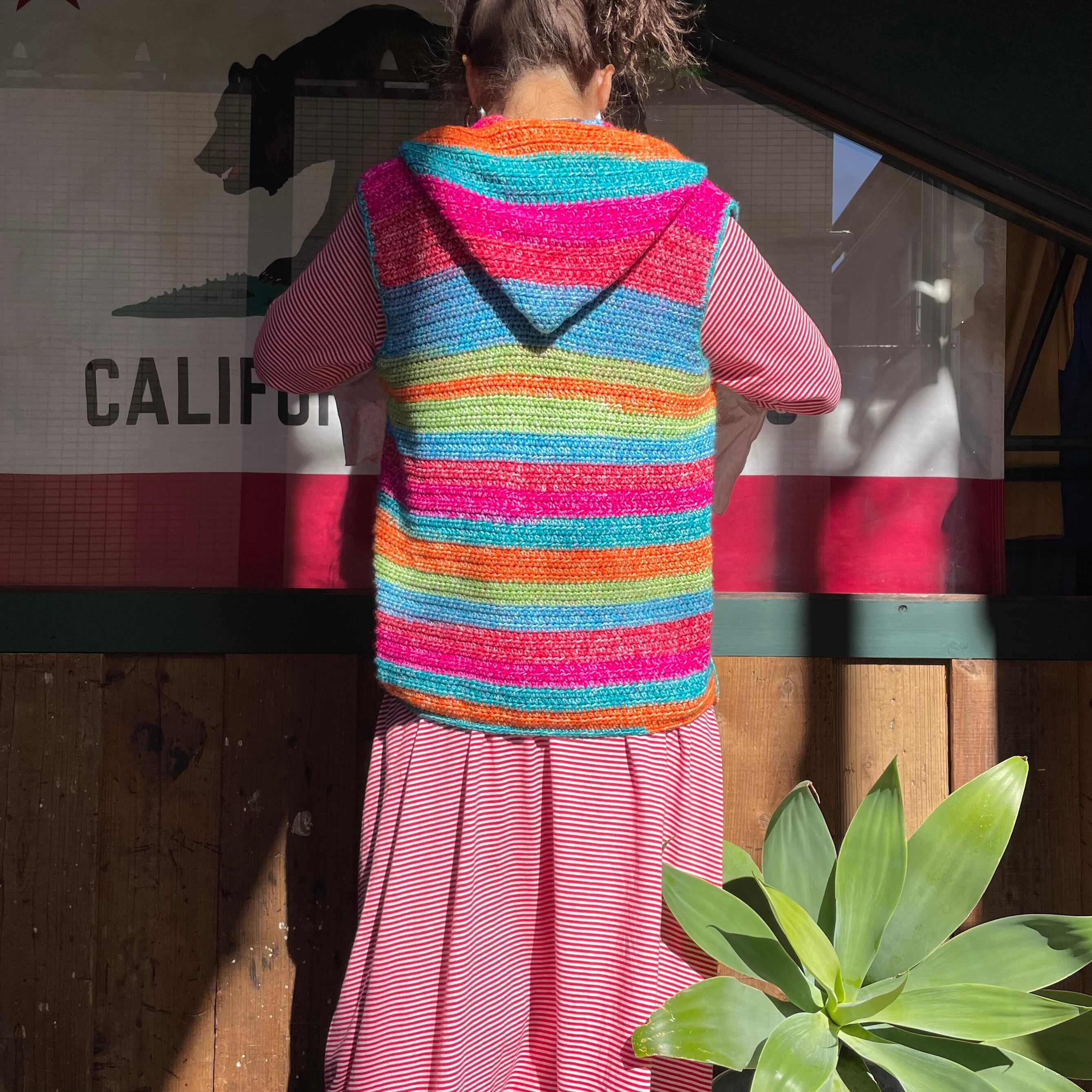 カラフルなボーダーとしっかりかぶれるサイズのフードがかわいい手編みのベストです。