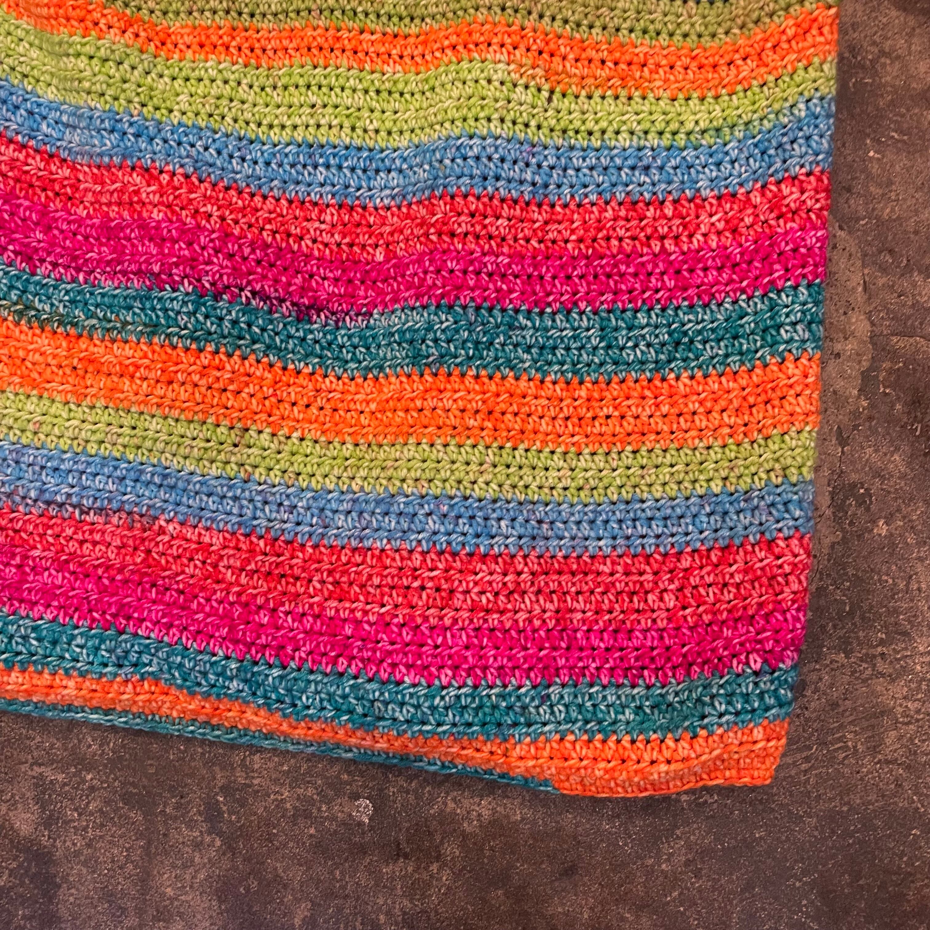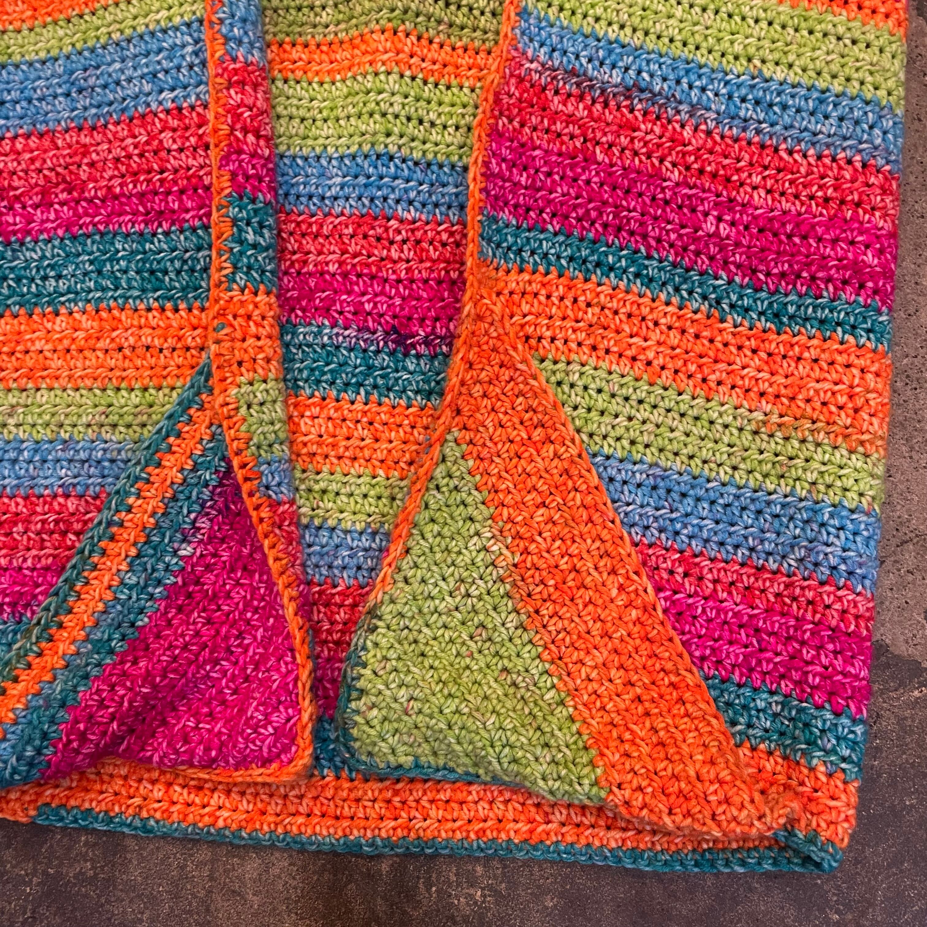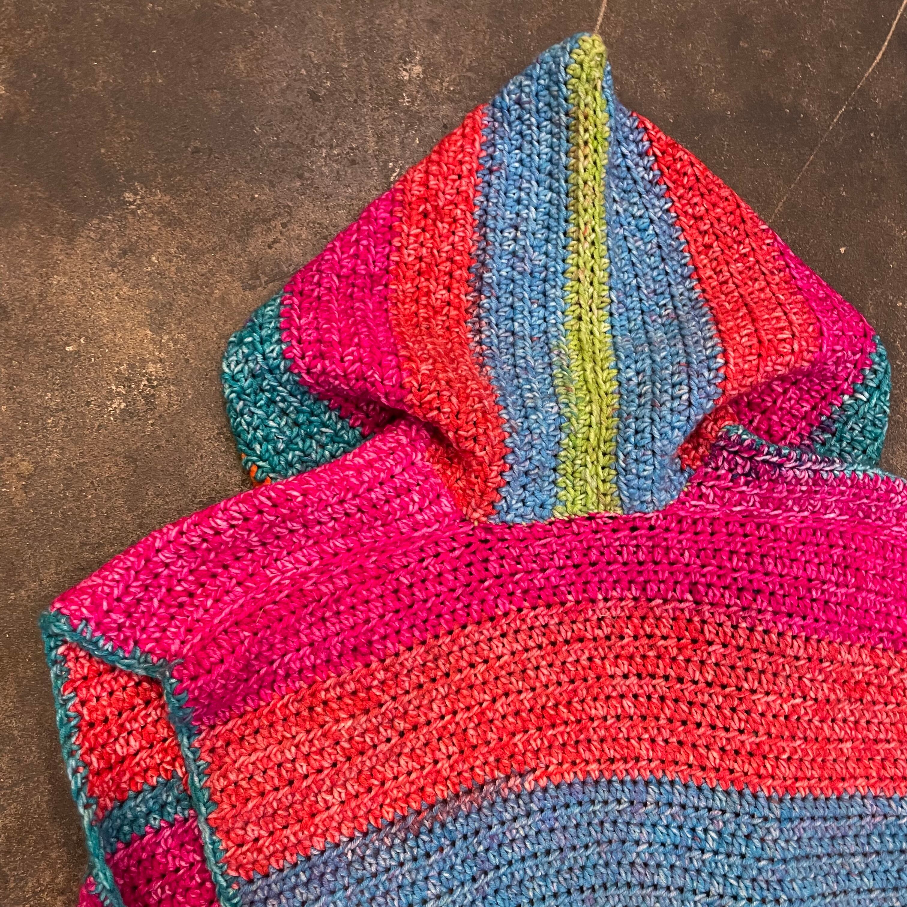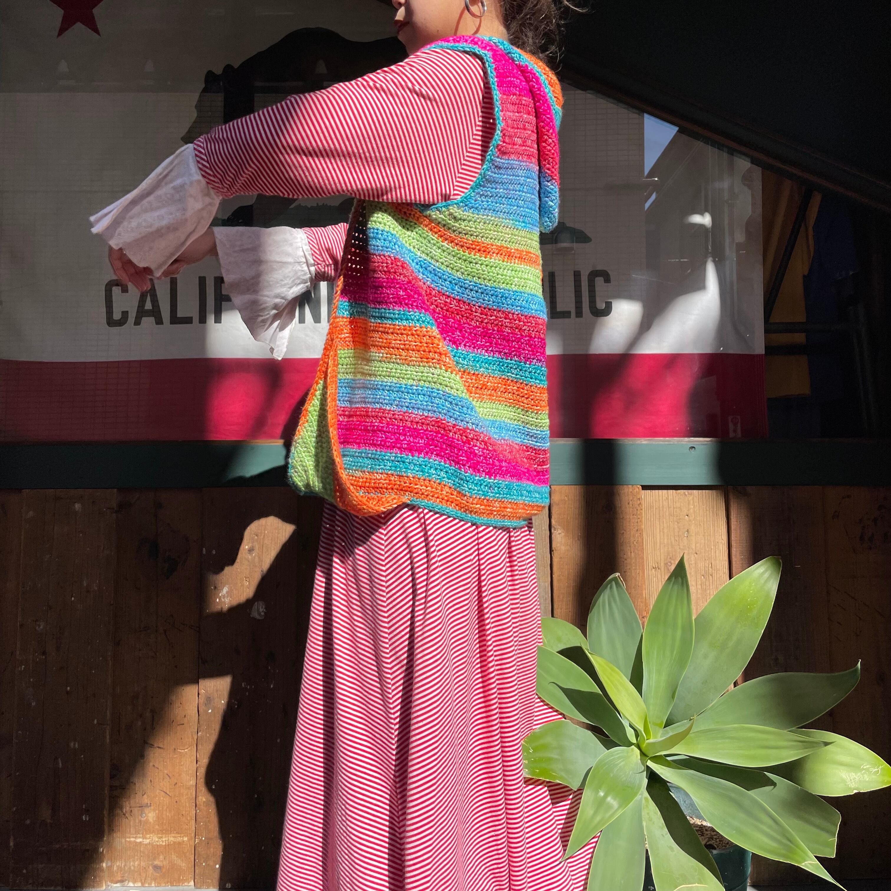 カラフルなボーダーとしっかりかぶれるサイズのフードがかわいい手編みのベストです。