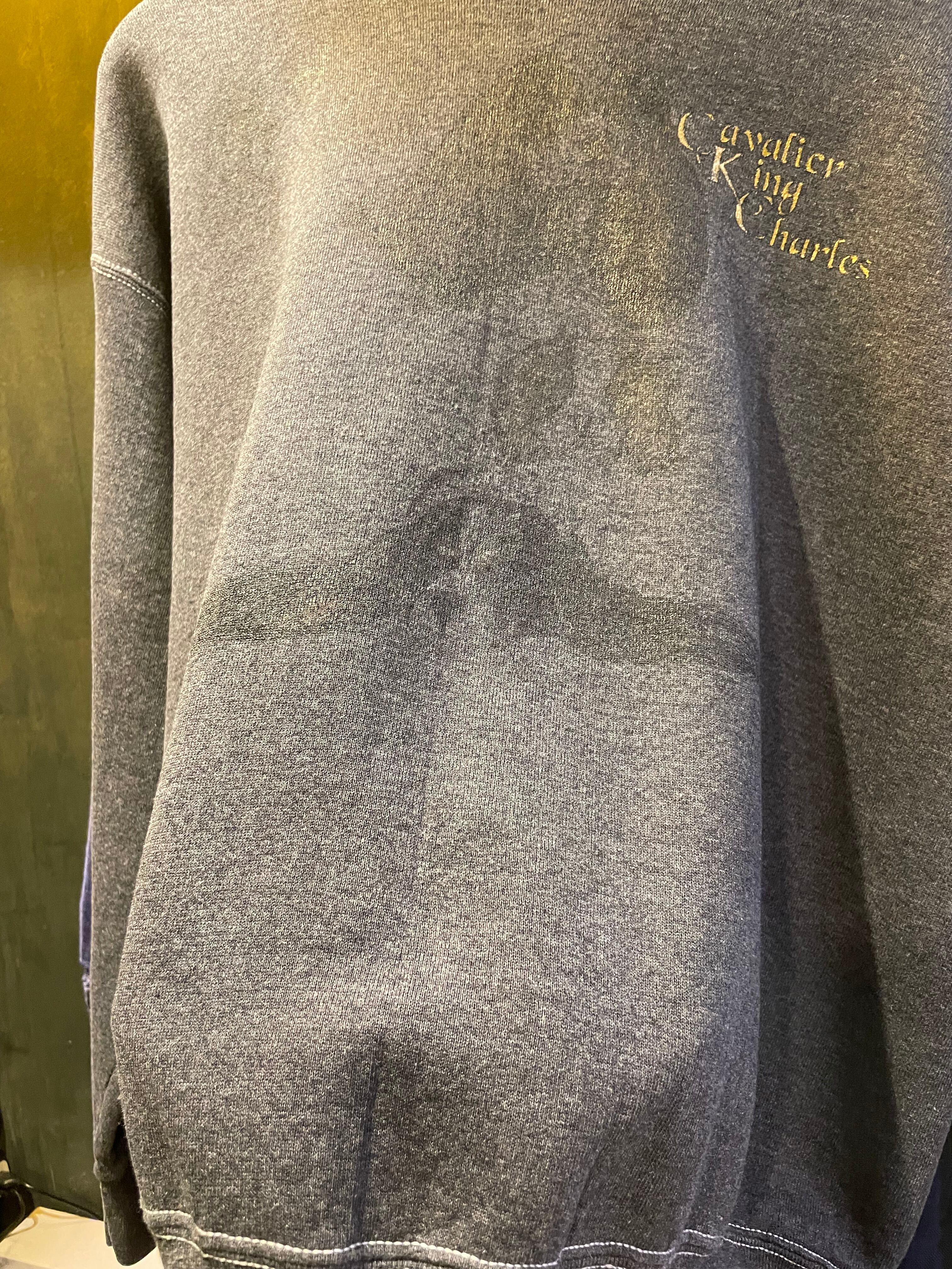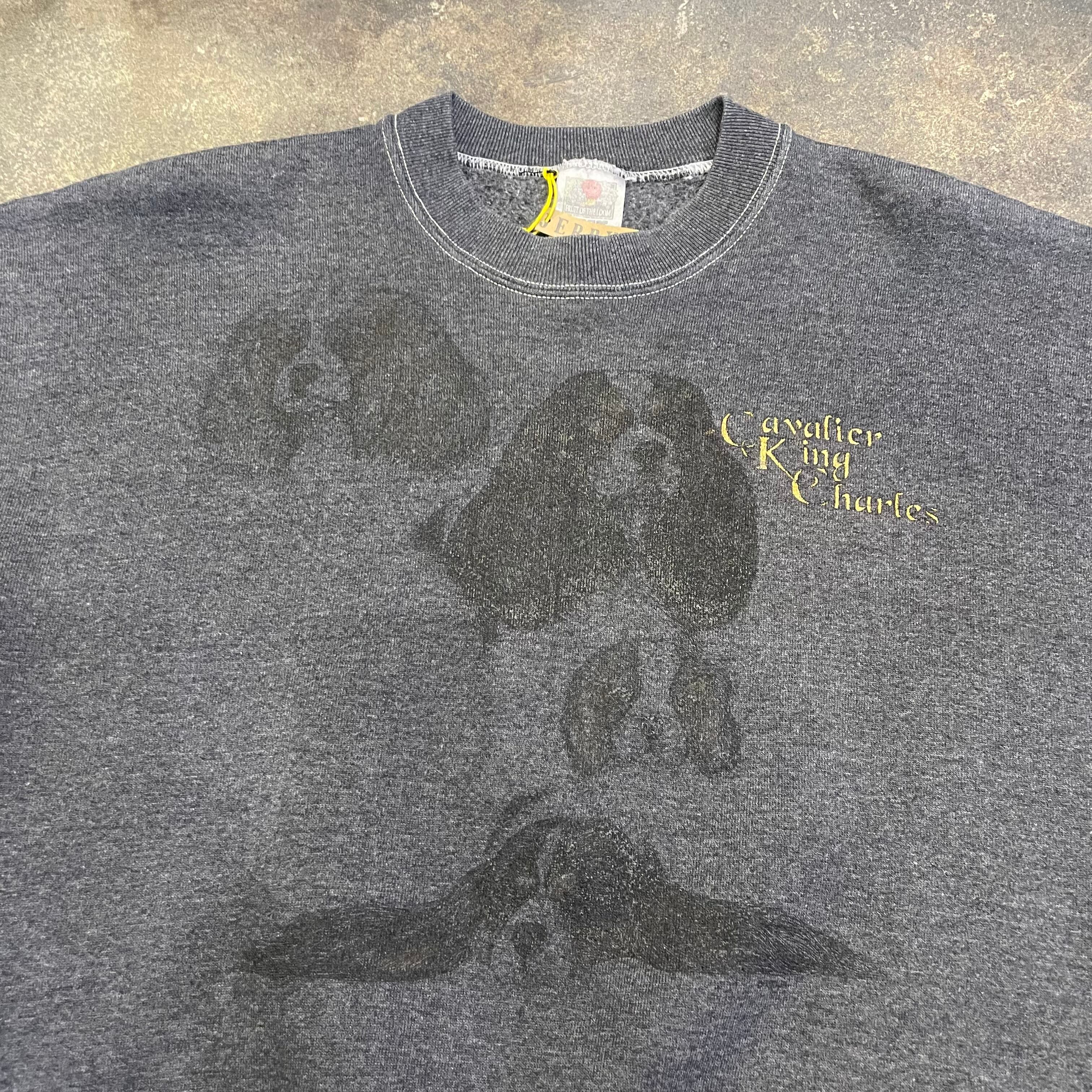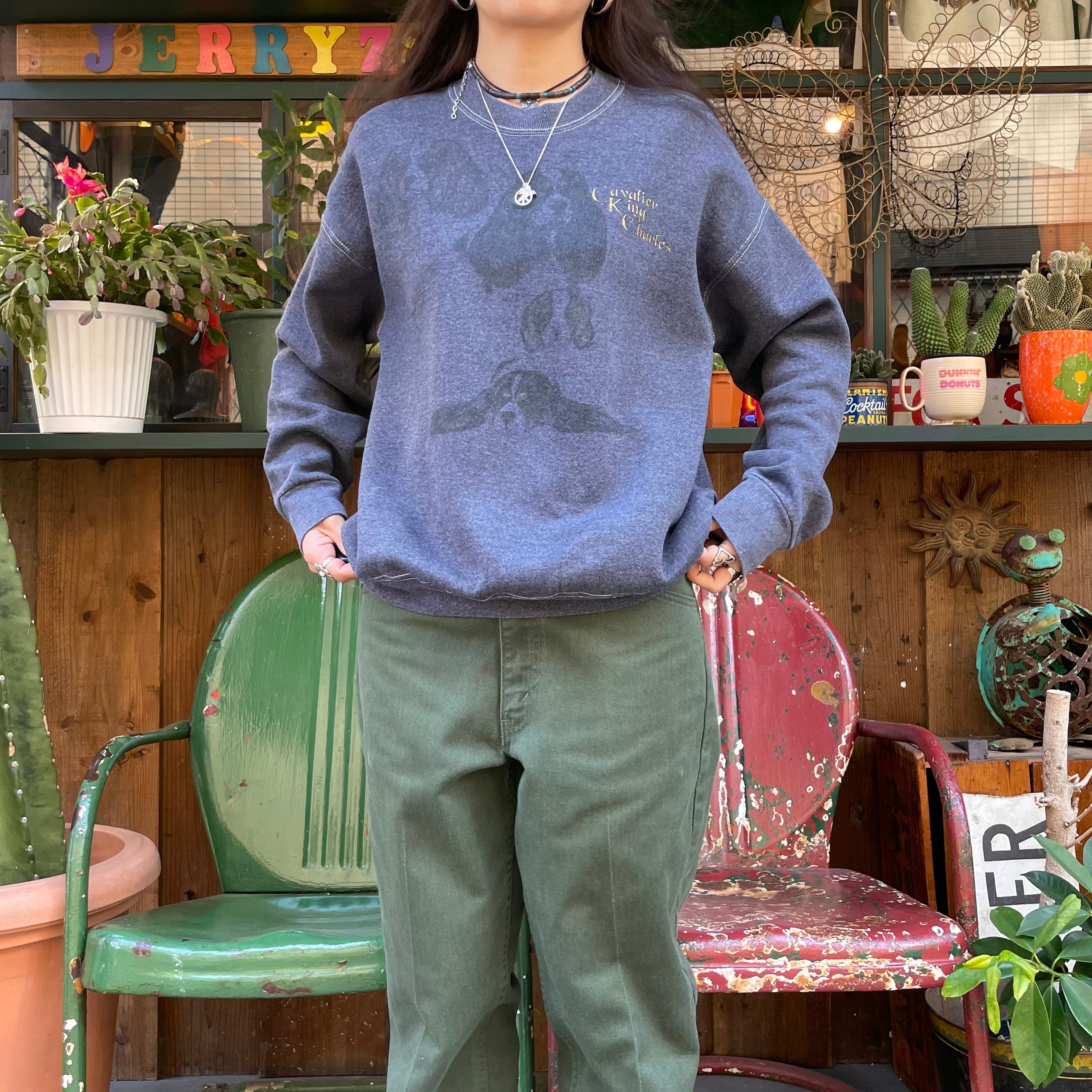 キャバリアのプリントがかわいいプリントスウェットです。後染めのグレーでプリントがうっすらしか見えない感じや糸が染まらず白いステッチになっていて雰囲気があってかわいいですね。